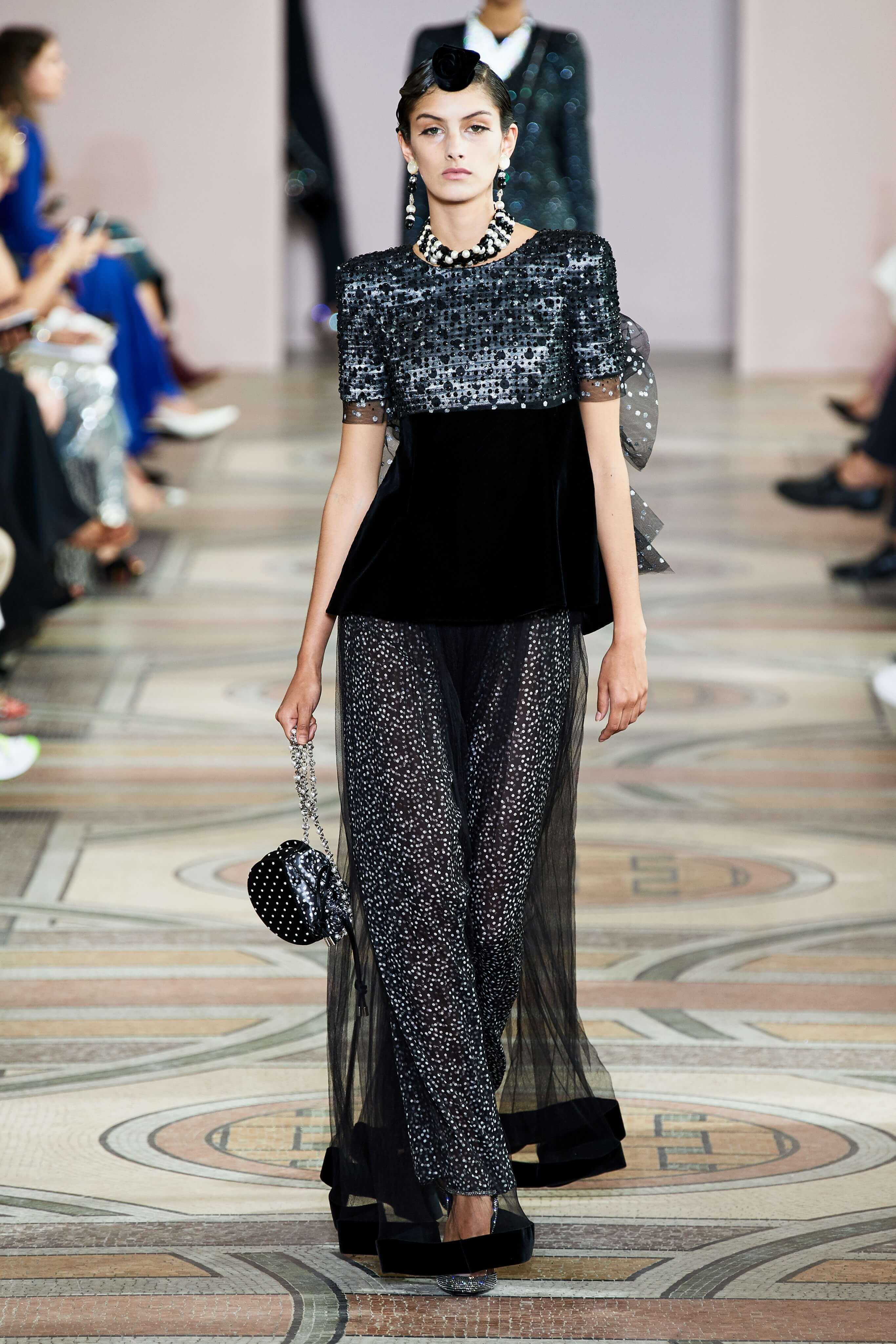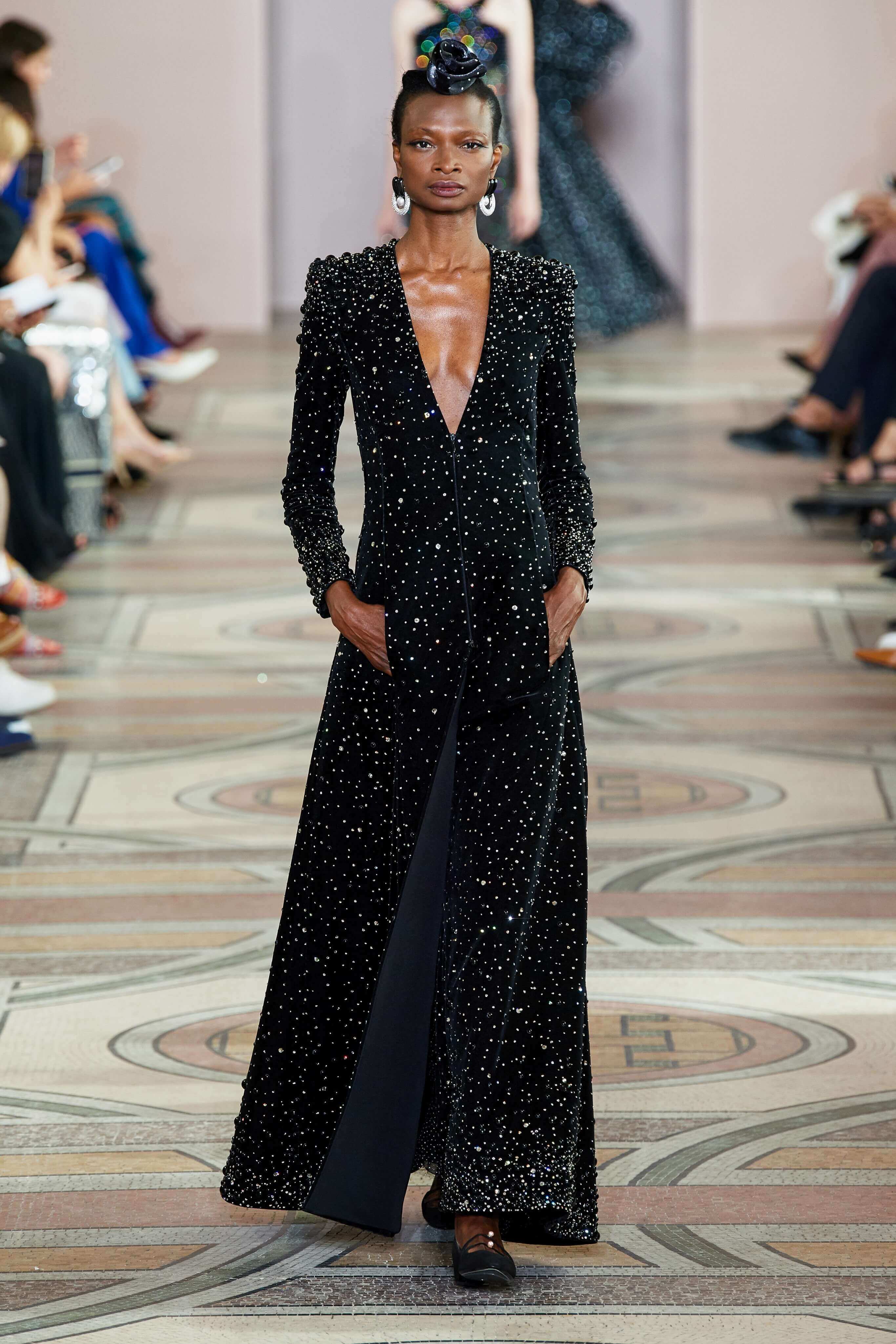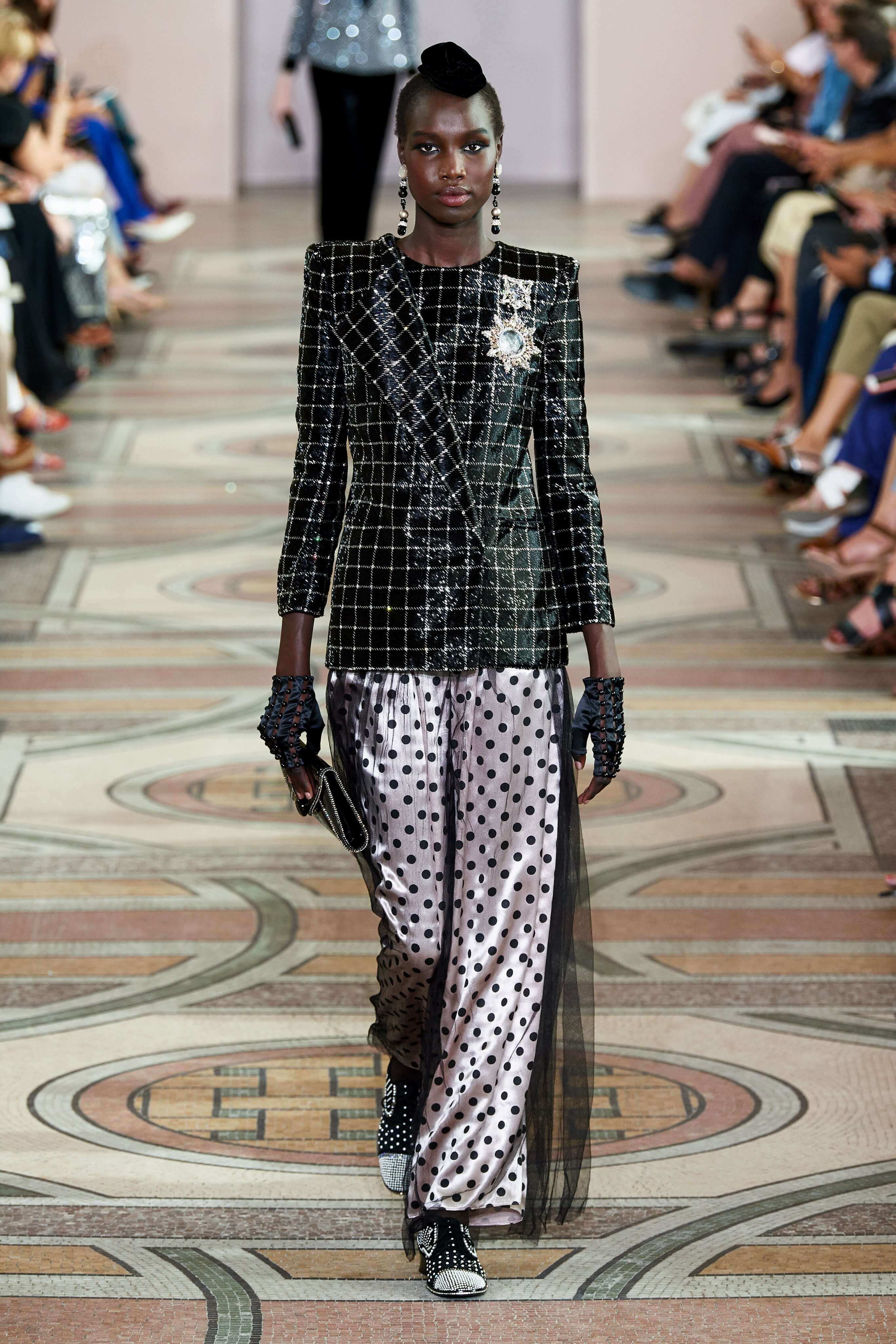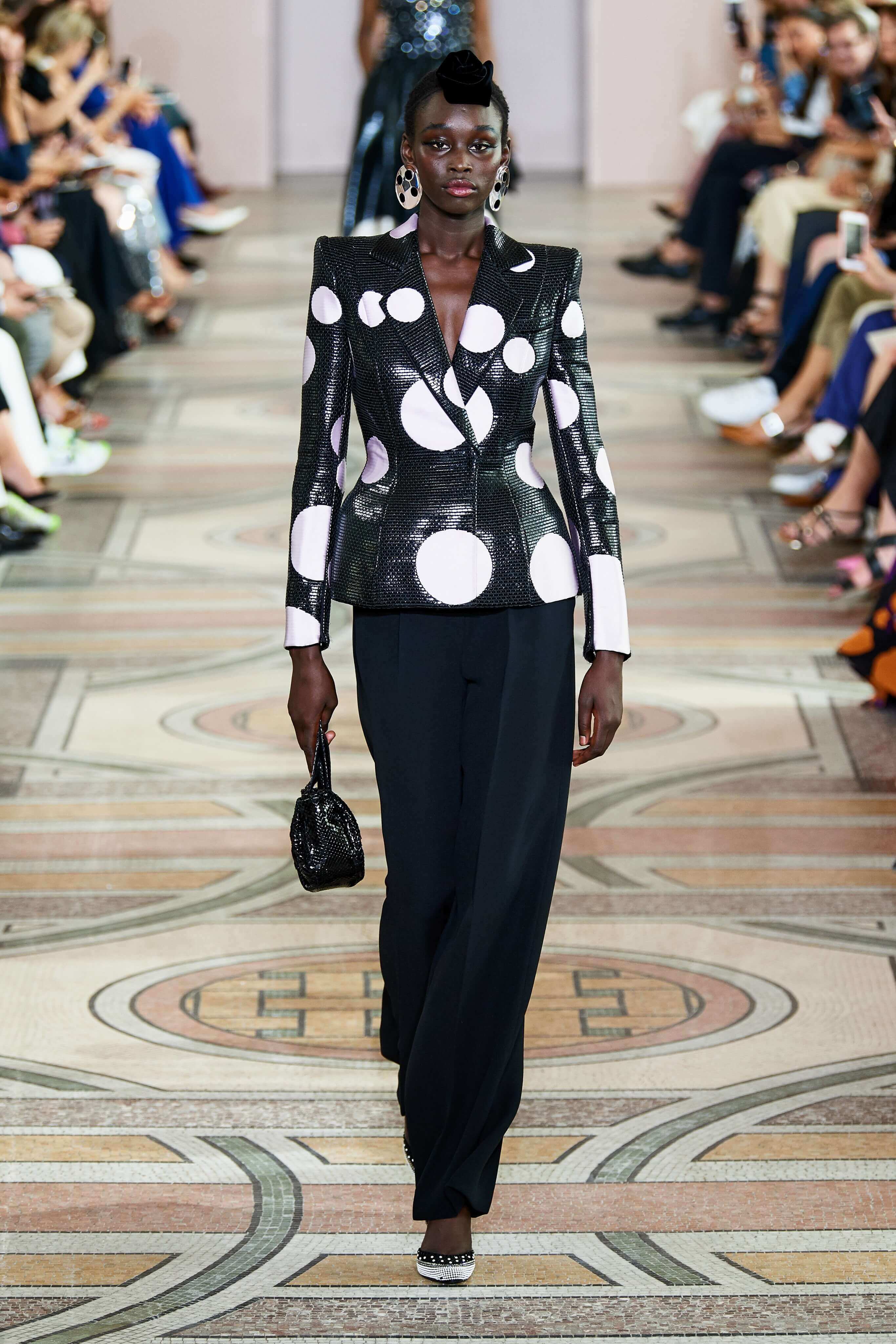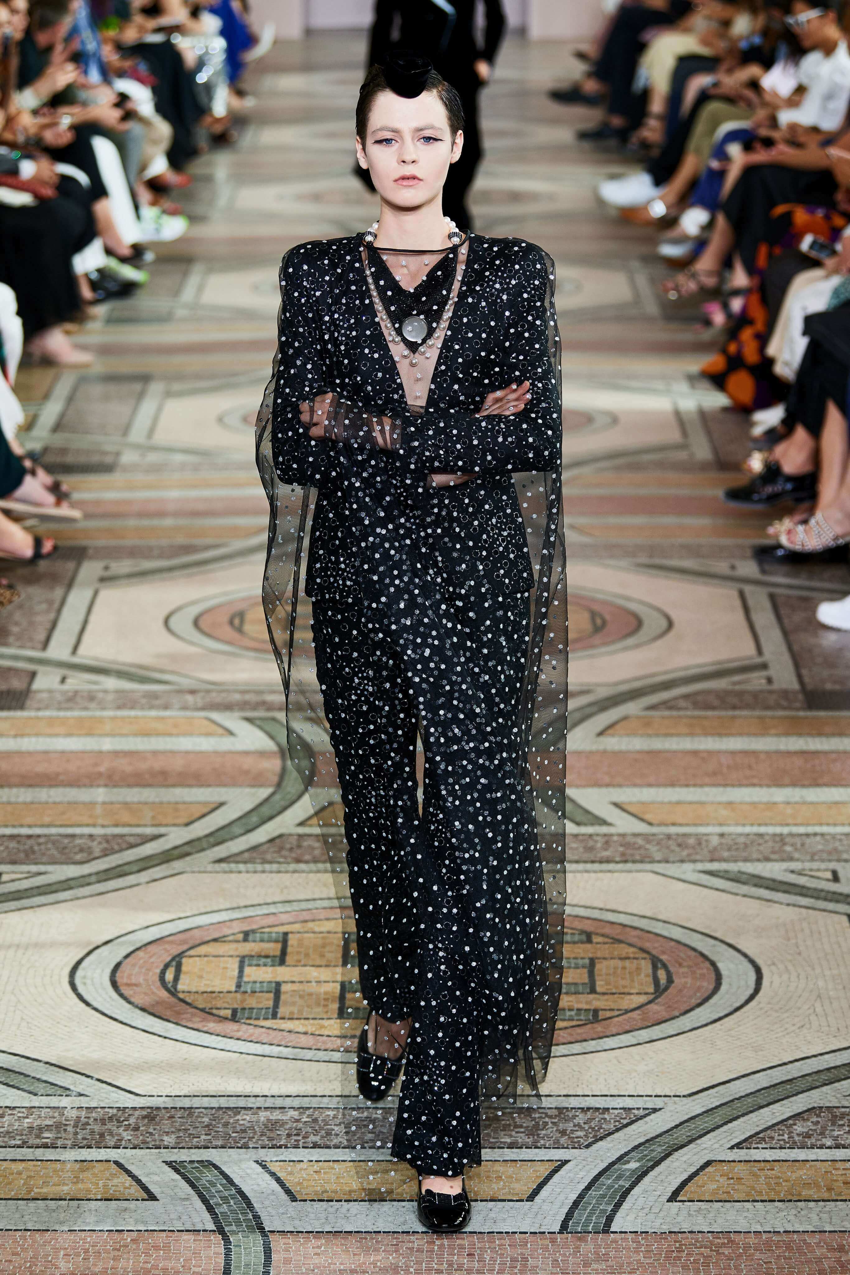 Идеальная формула роскоши от Armani Privé — структурированный жакет полуприлегающего кроя, струящиеся пижамные брюки и маленькая шляпка. На этот раз в качестве аксессуара на укладках моделей располагались миниатюрные текстильные узелки в форме розы, прикрепленные к волосам.
