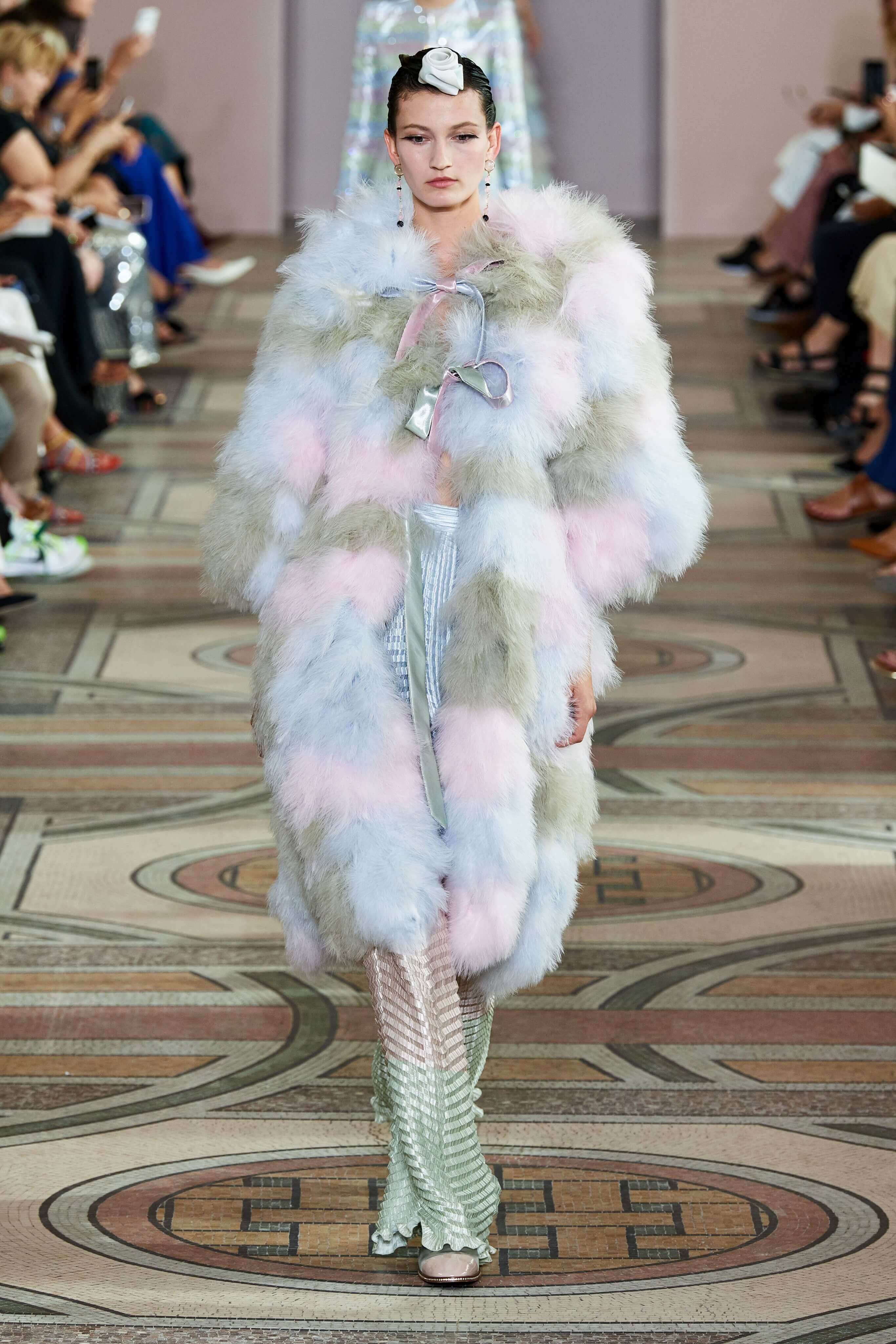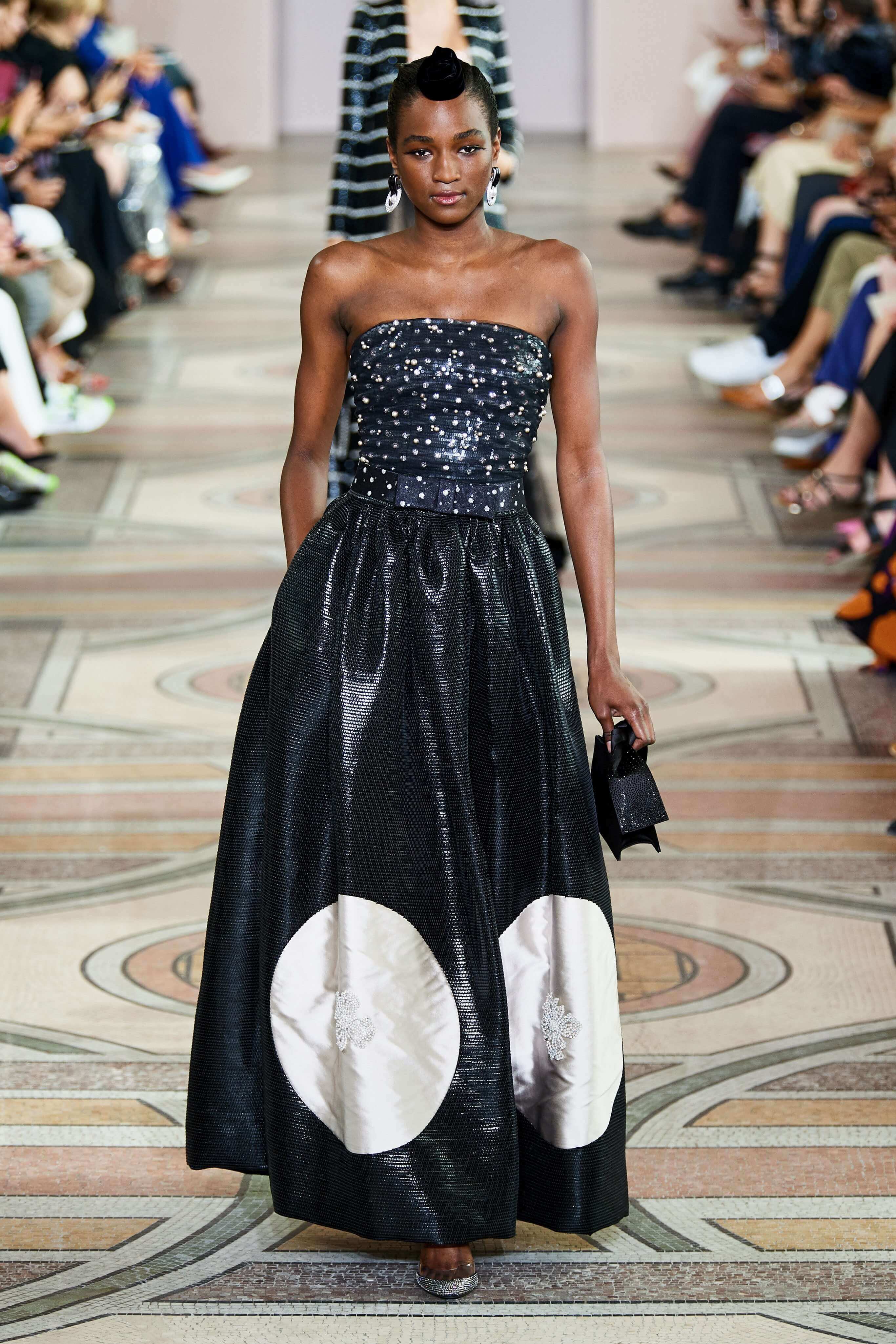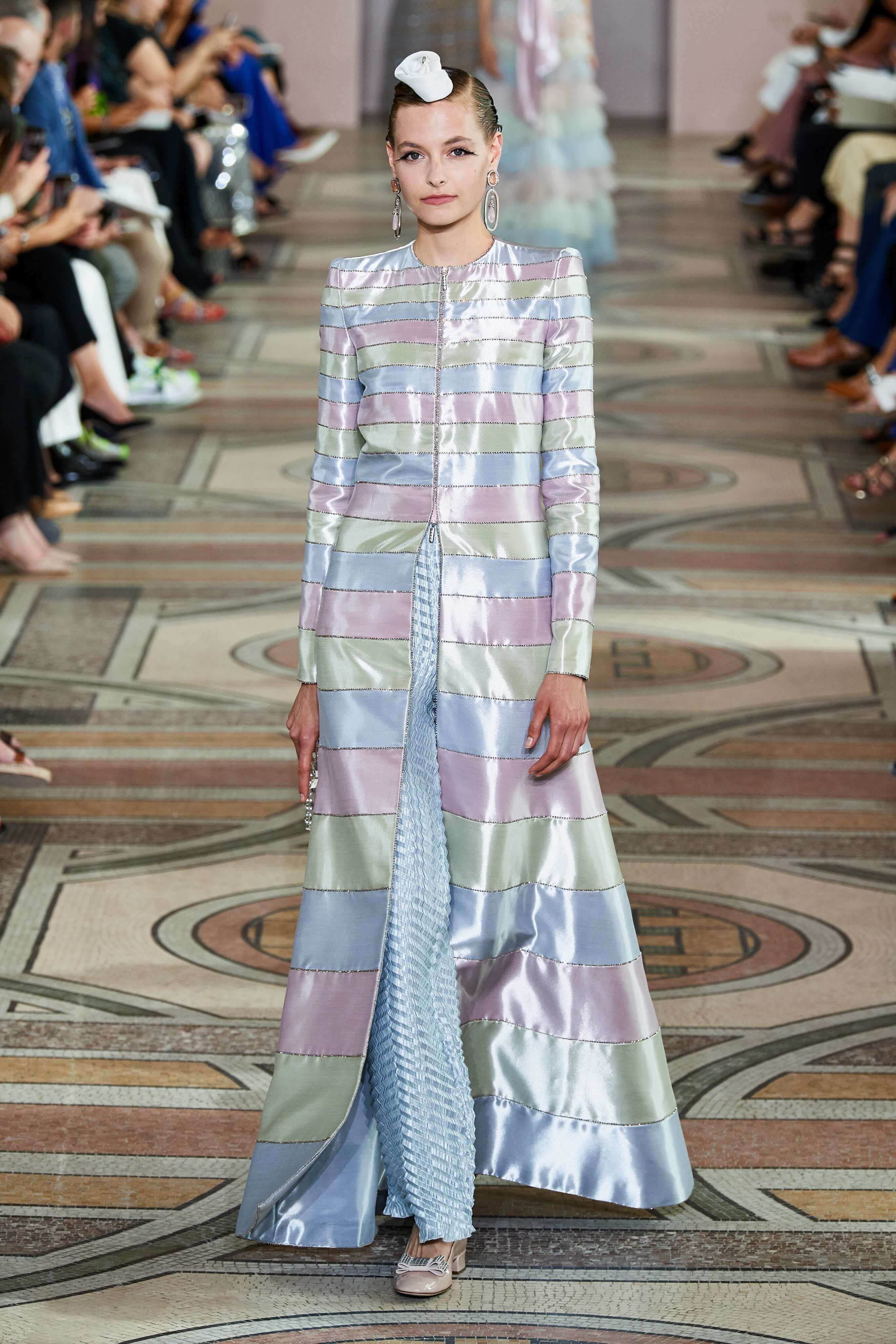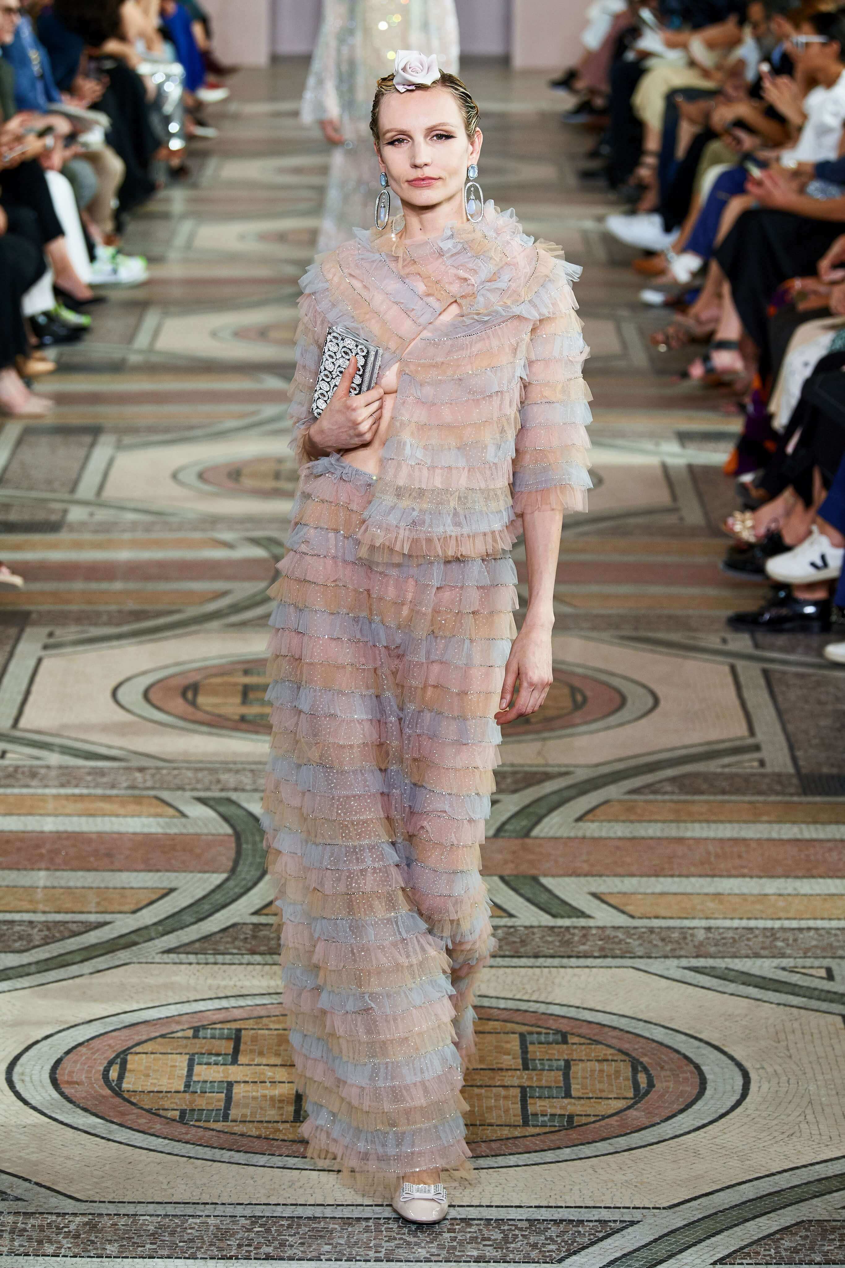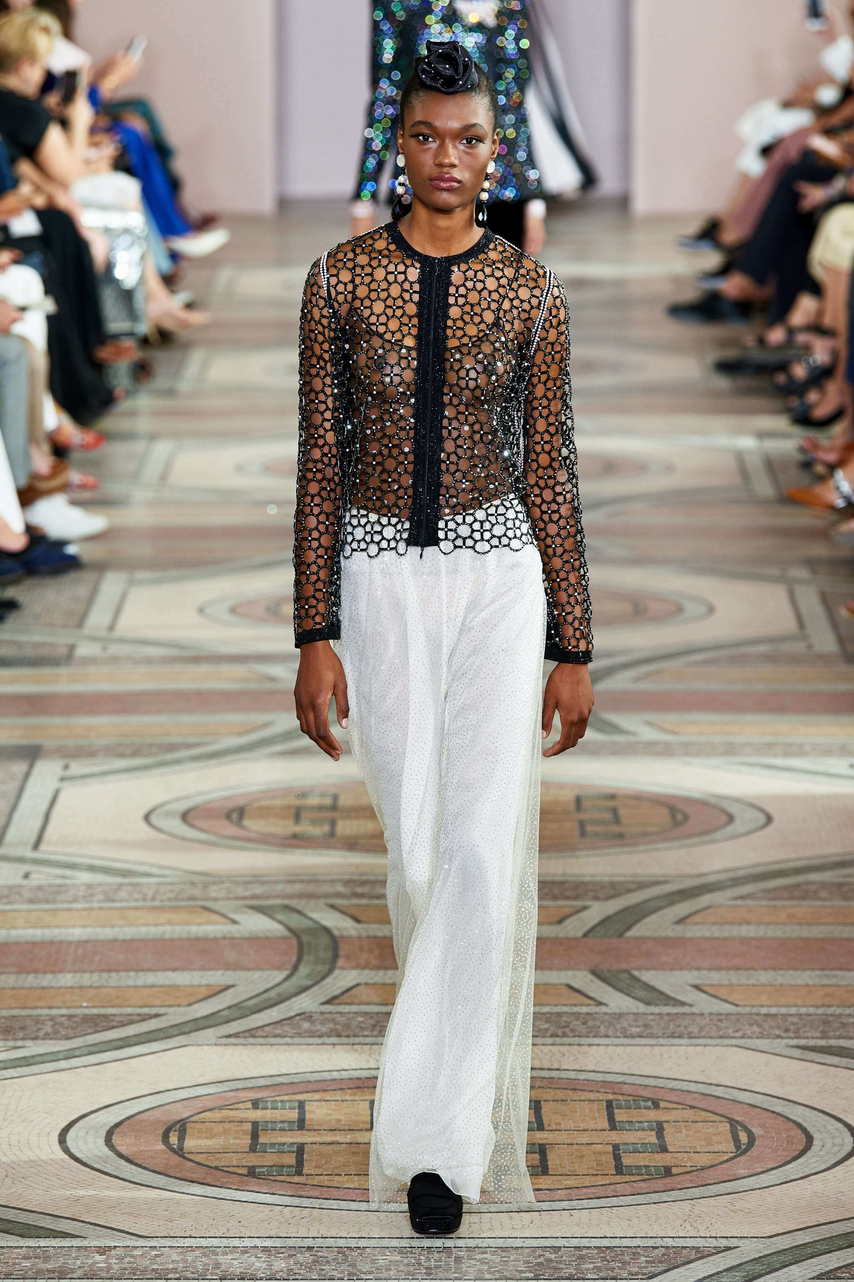 Идеальная формула роскоши от Armani Privé — структурированный жакет полуприлегающего кроя, струящиеся пижамные брюки и маленькая шляпка. На этот раз в качестве аксессуара на укладках моделей располагались миниатюрные текстильные узелки в форме розы, прикрепленные к волосам.