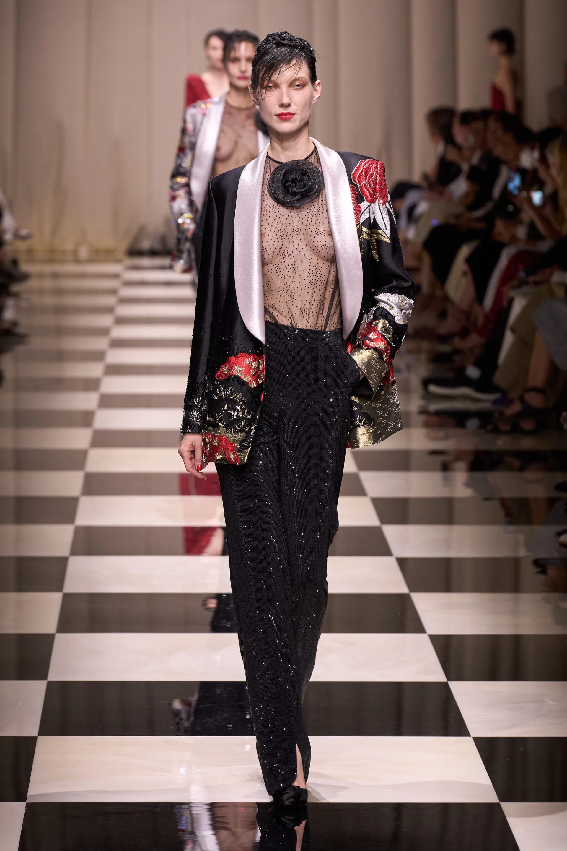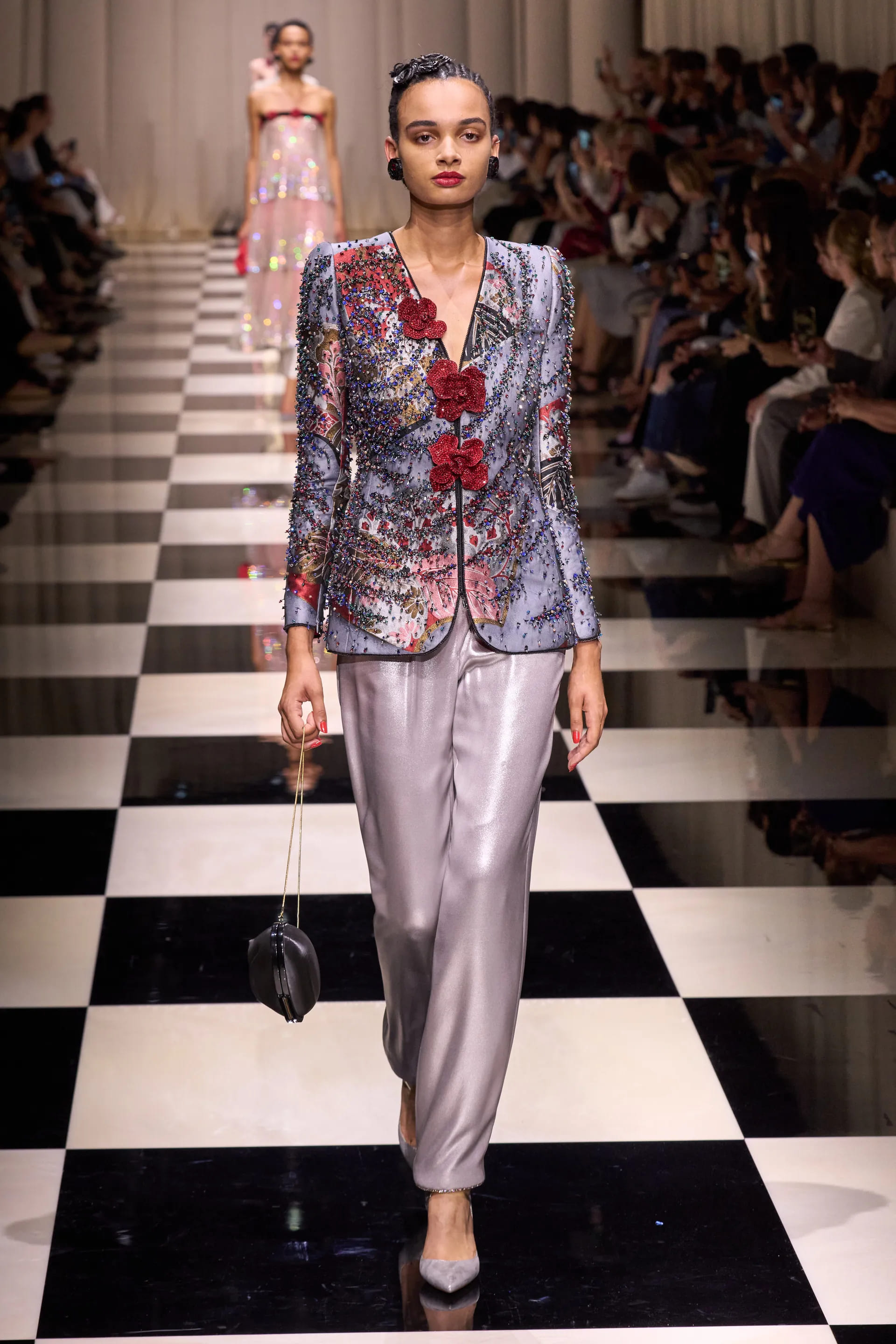 Речі в колекції Armani Prive fall — 2023 балансують між стриманістю та сексуальністю. Напівпрозорі сукні в стилі бурхливих 20-х зустрічаються на подіумі поруч з елегантними максісукнями бального крою, а строгі костюми — поруч з комбінаціями жакардових брюк, прозорих блуз та принтованих жакетів. У кольоровій гаммі колекції переважали драматичні кольори — чорний, золотий і червоний.