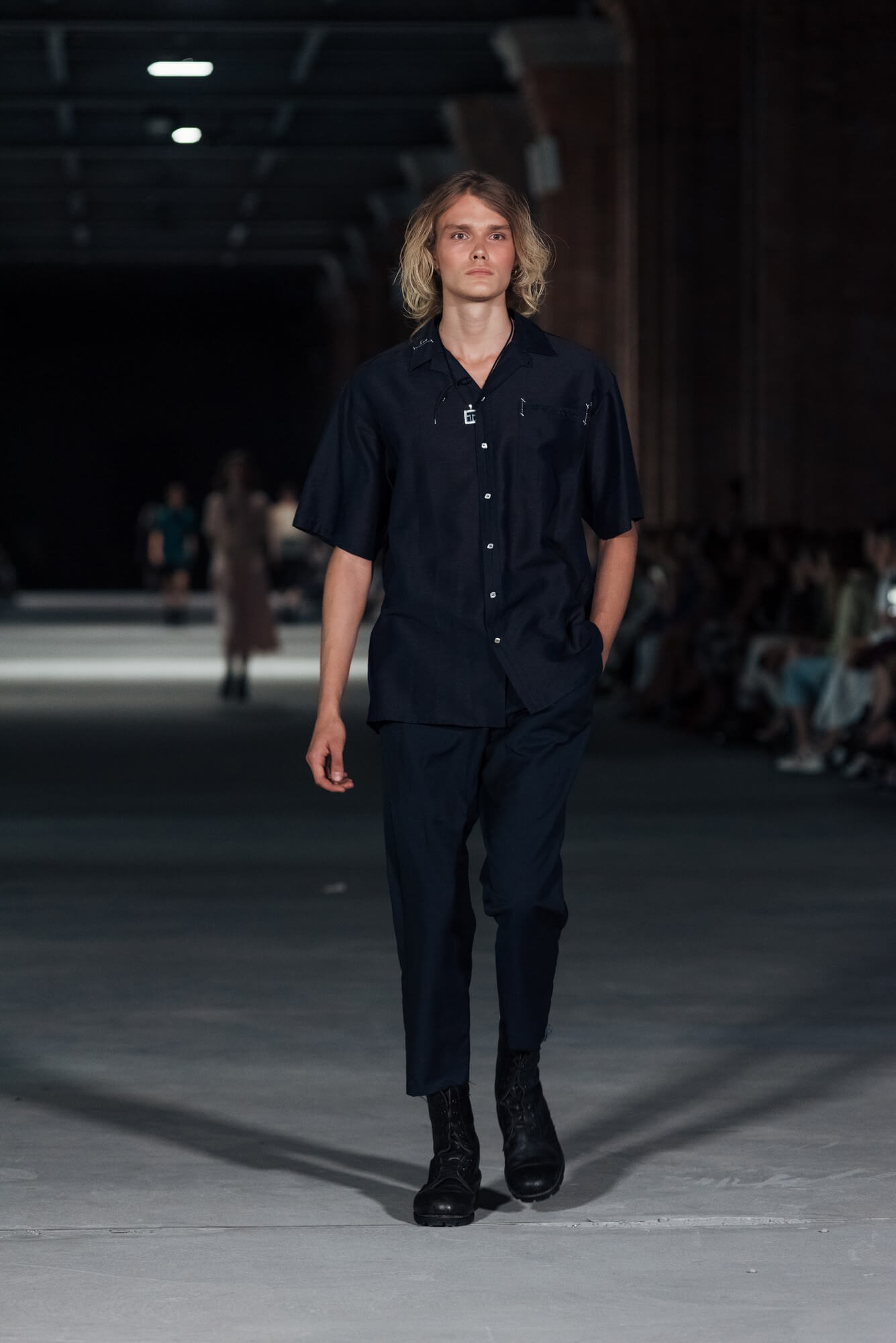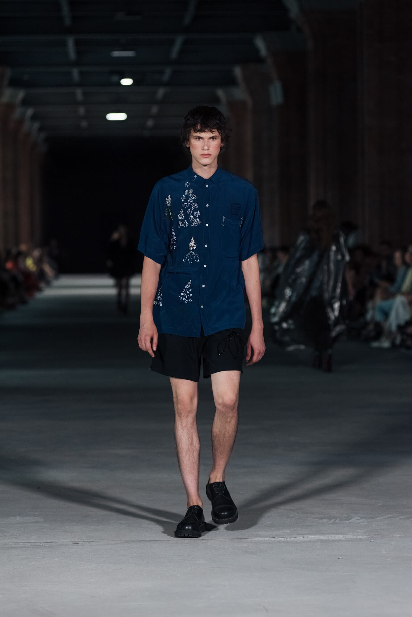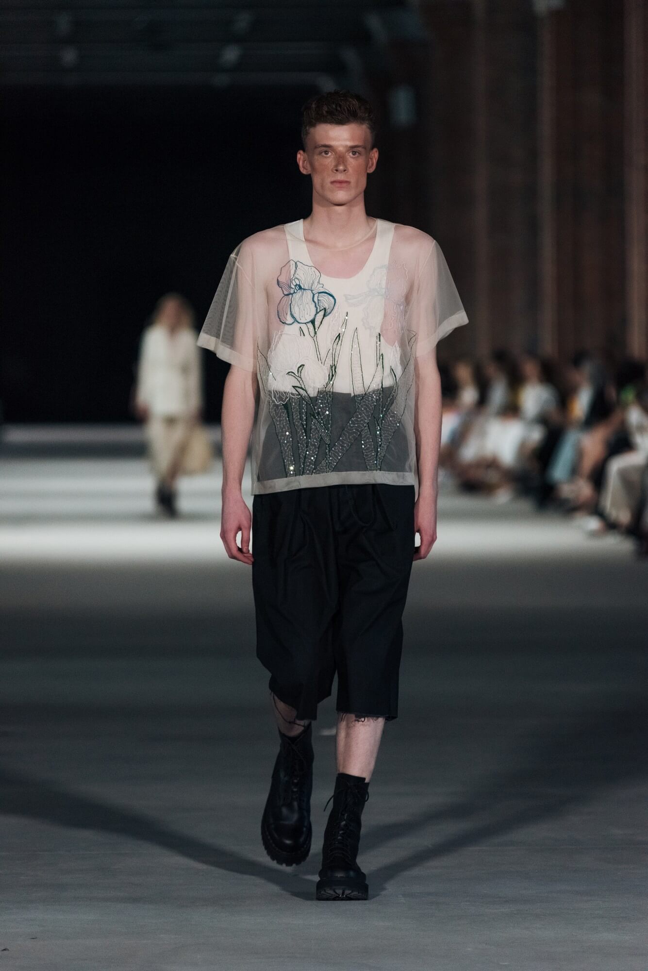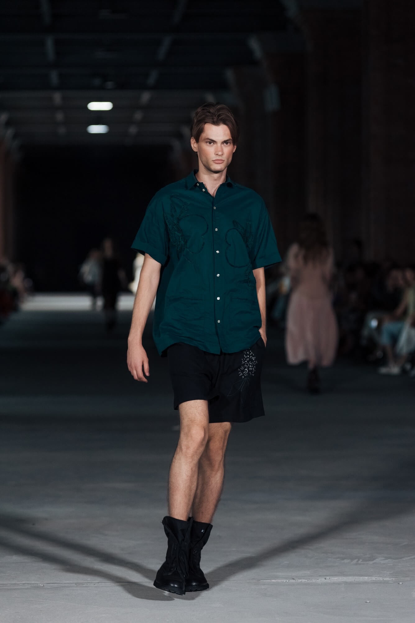 В продолжение некоторых тем прошлой коллекции - юности, любви, города и искусства, дизайнер традиционно "расцветил" блузы, мужские сорочки и полупрозрачные платья нежными букетами садовых цветов и цветов каштана. Модели выходили на подиум в нарядах, расшитых хрустальным стеклярусом, объёмной нитью, и с нарочито необработанными подолами юбок. Одним из самых эффектных стал выход модели в сверкающем серебристом платье-кейпе. Мужская часть коллекции состоит из силуэтных комбинезонов со строгими планками на пуговицах, прозрачных сорочек и футболок, напоминающих главную униформу рейверов 2000-х, и остроумных шорт с завышенной талией.