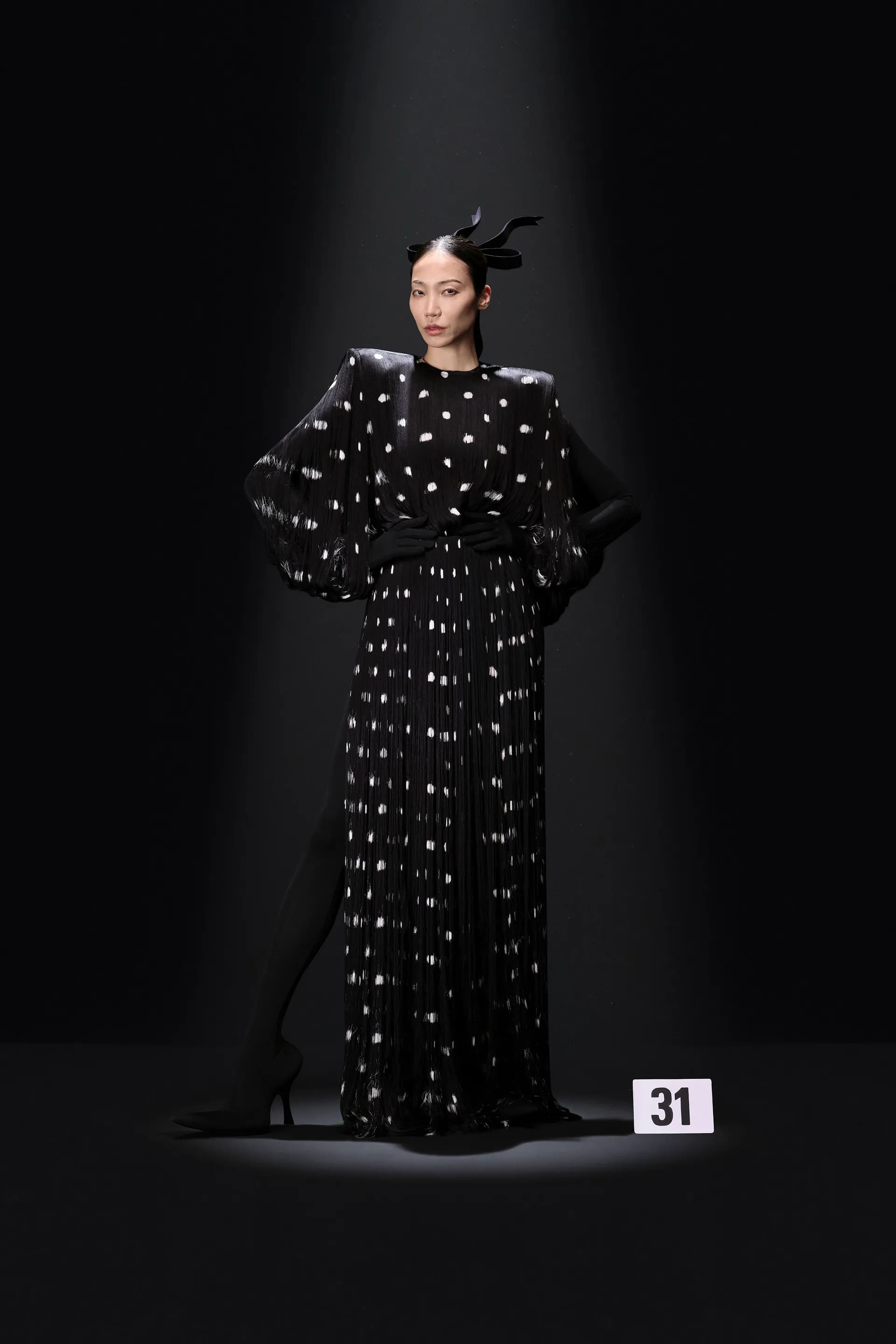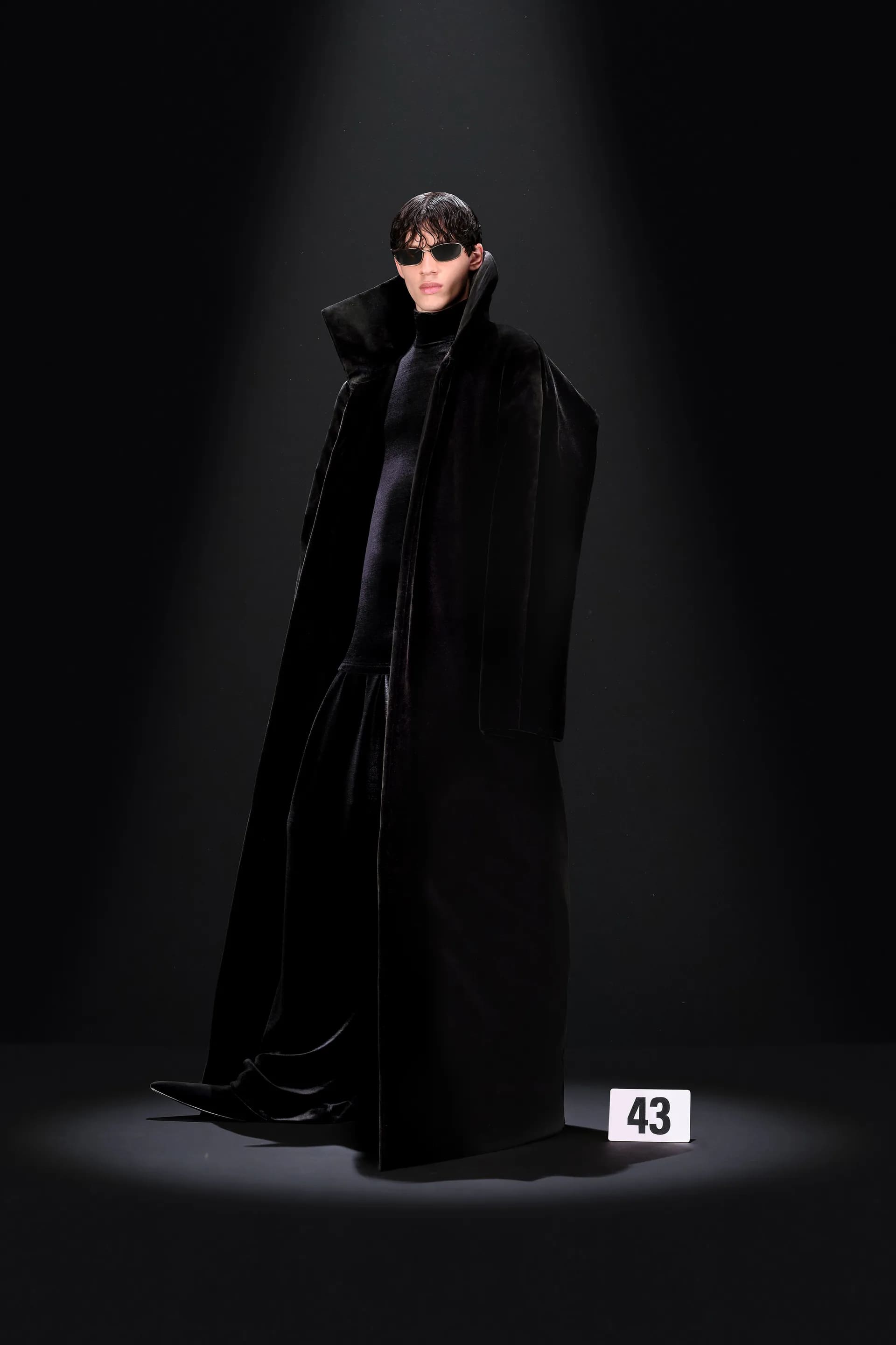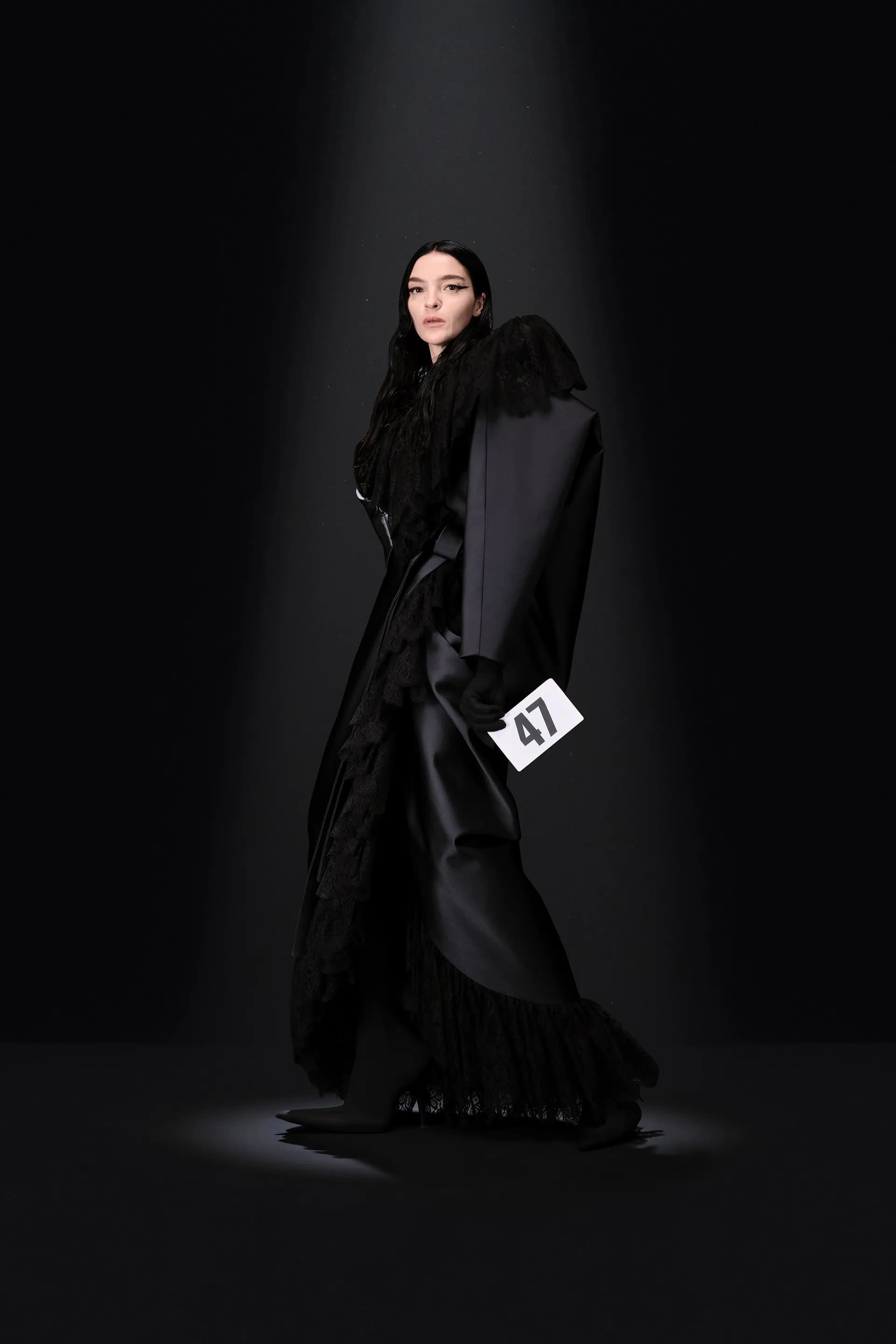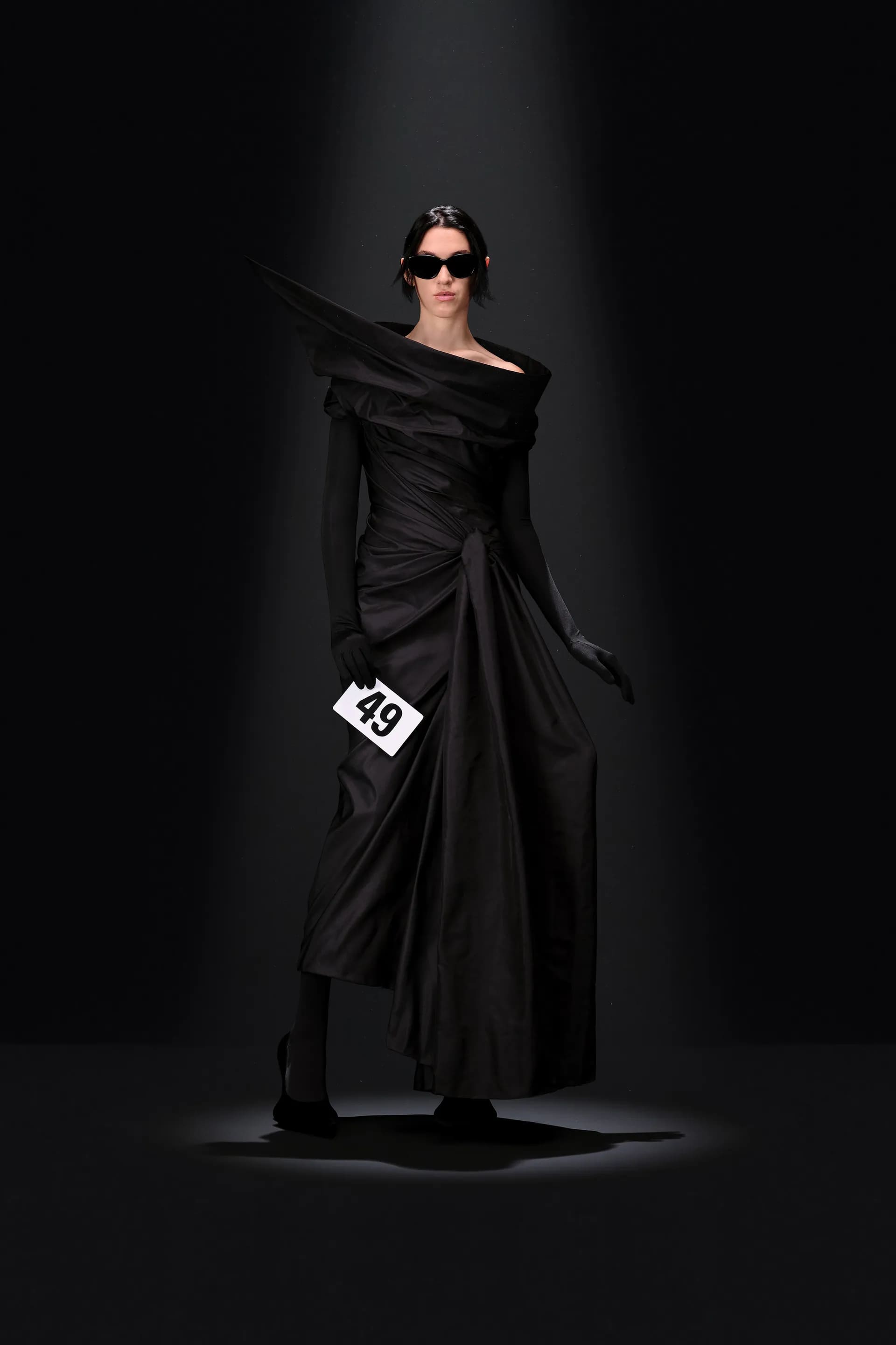 52-гу кутюрну колекцію Balanciaga відкриває чорна оксамитова сукня в комбінації з перловим намистом і білими рукавичками. Наступні кілька образів відображають зв’язок зі спадщиною Крістобаля, і згодом ця данина переходить в гіперболізовані об’ємні плечі луків.