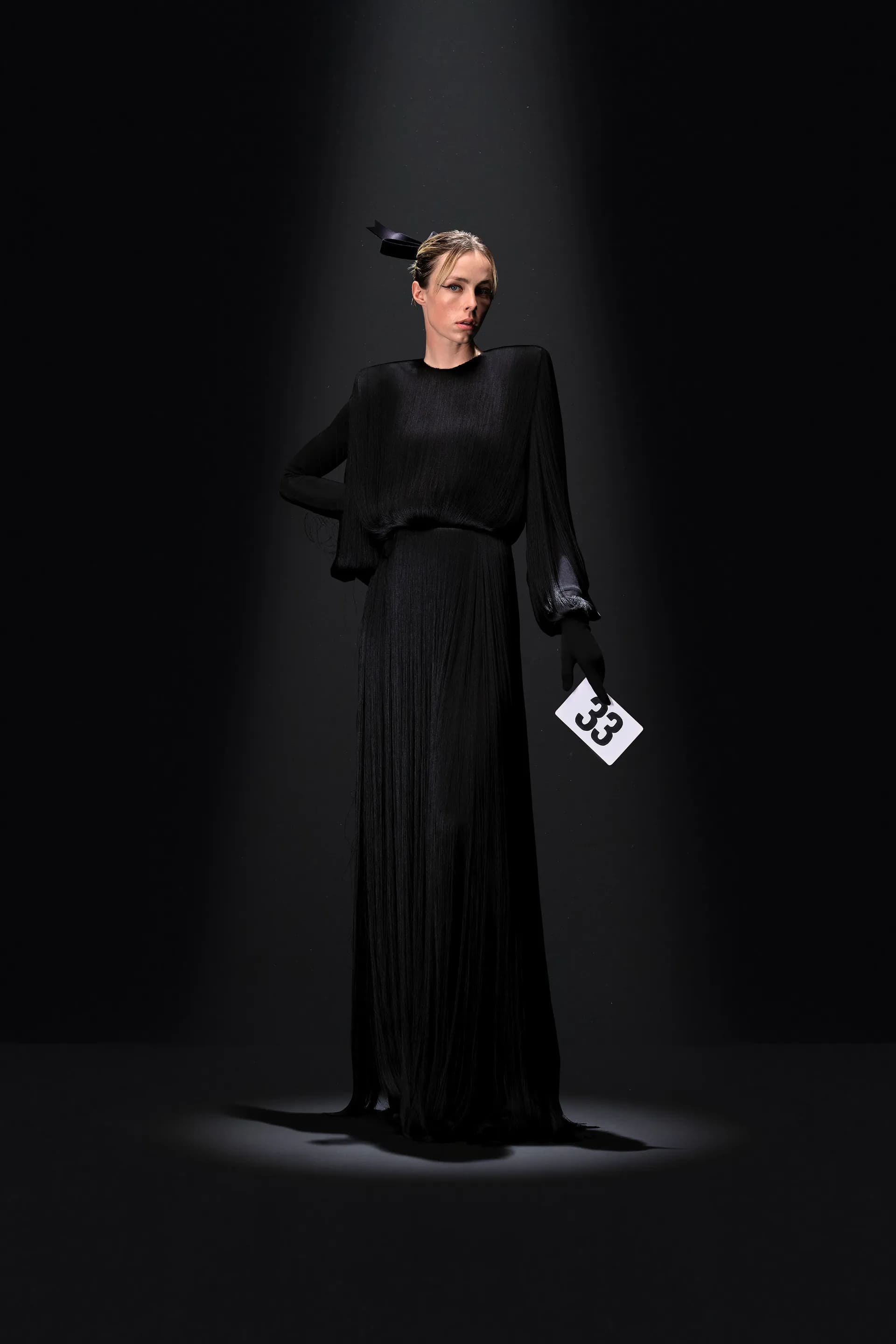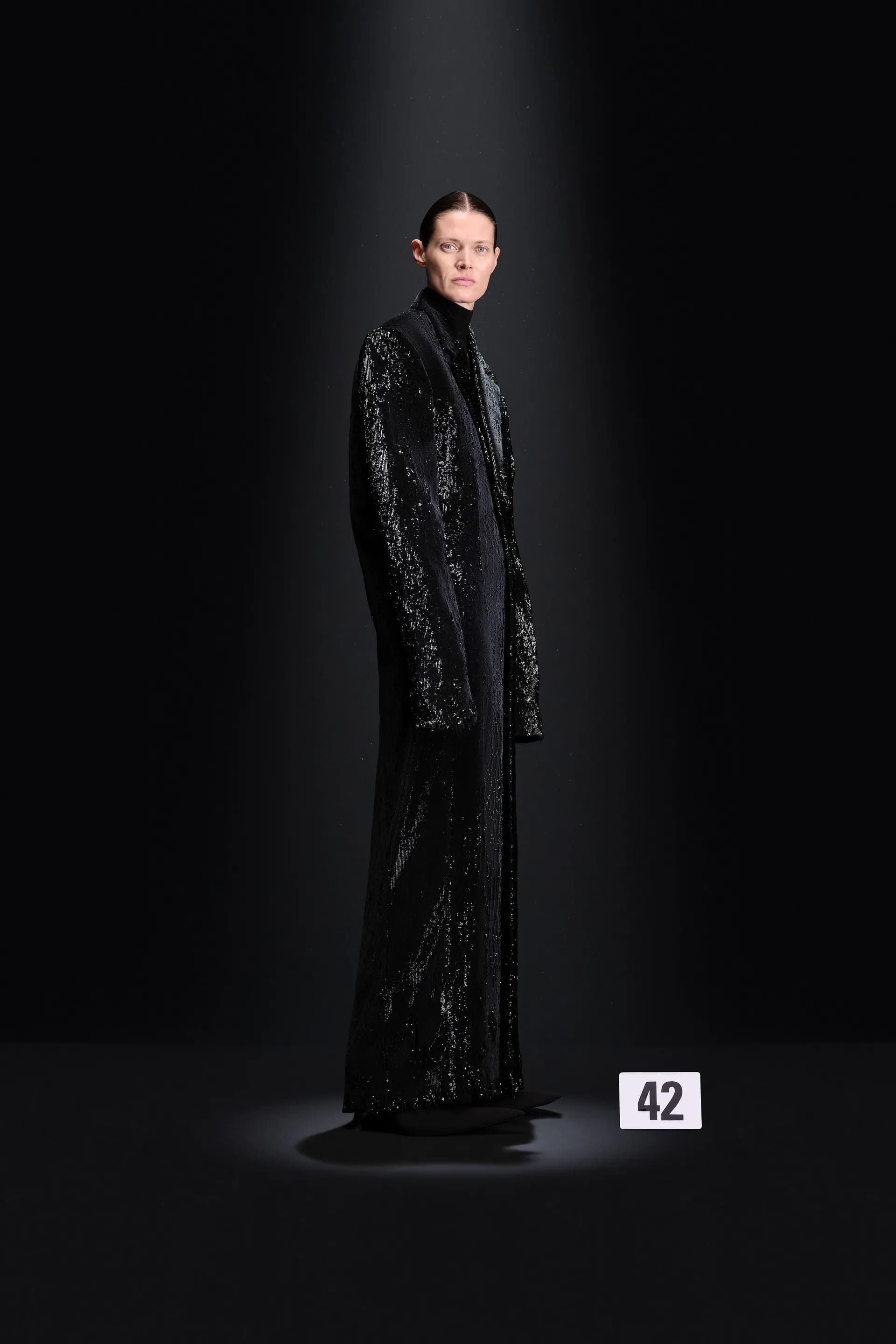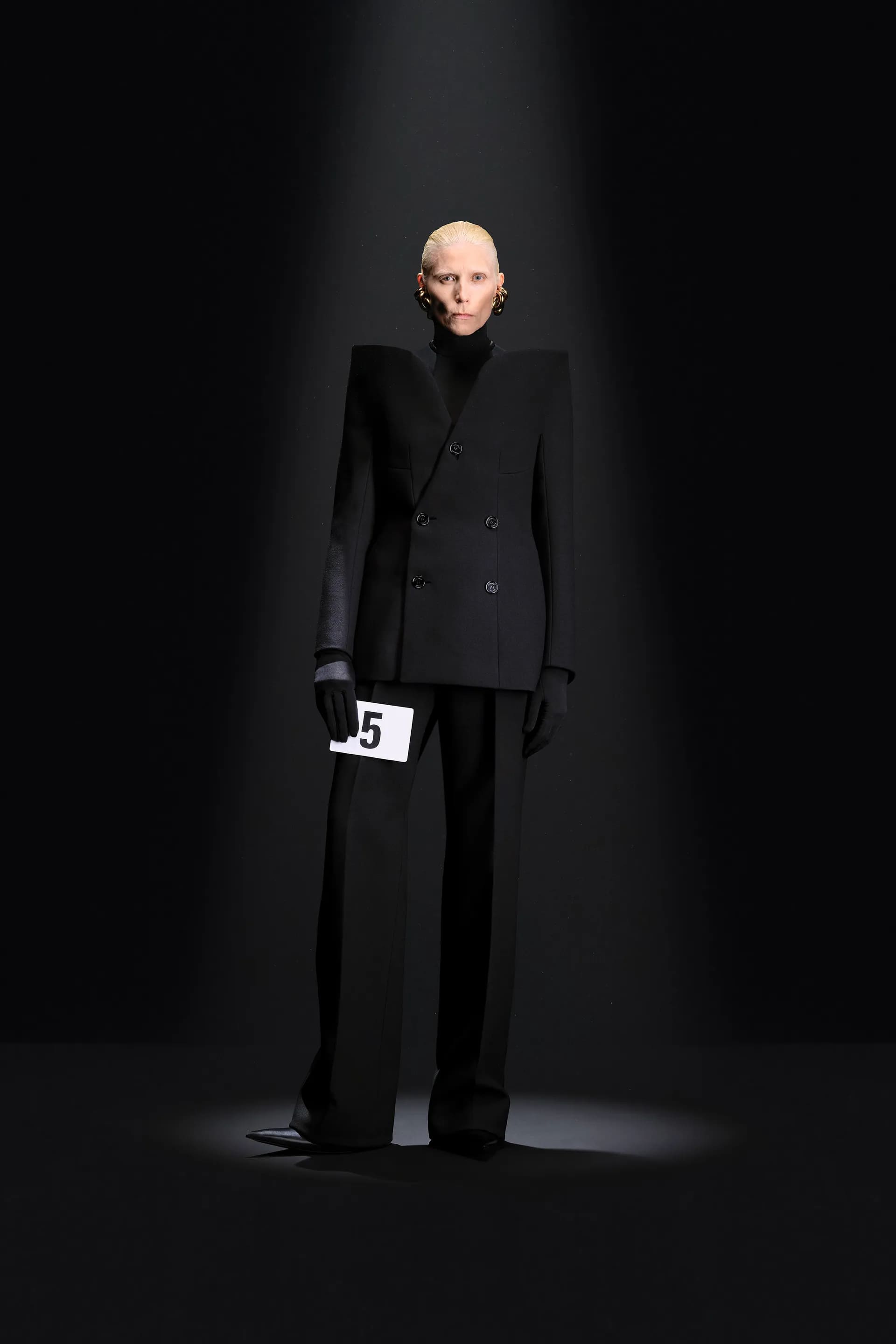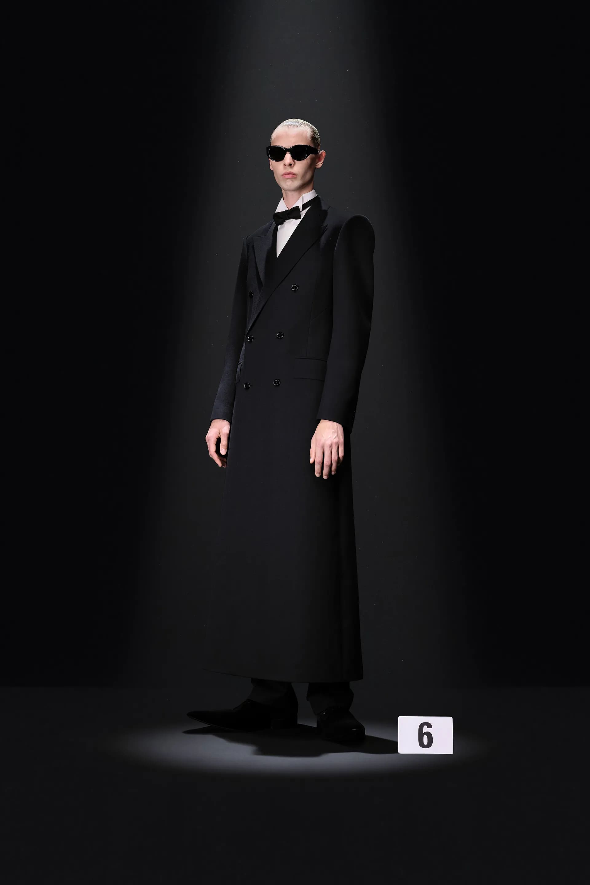 52-гу кутюрну колекцію Balanciaga відкриває чорна оксамитова сукня в комбінації з перловим намистом і білими рукавичками. Наступні кілька образів відображають зв’язок зі спадщиною Крістобаля, і згодом ця данина переходить в гіперболізовані об’ємні плечі луків.