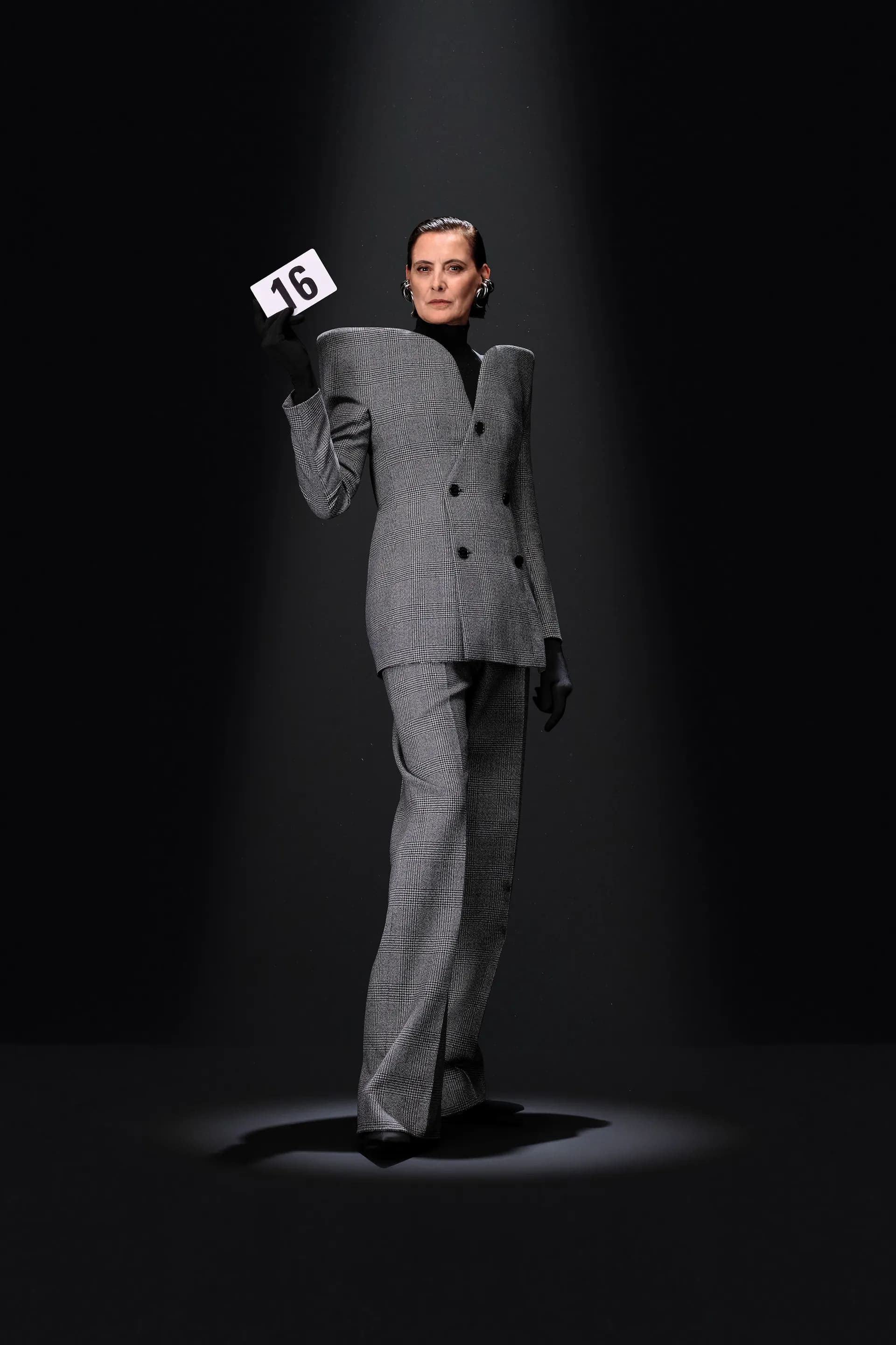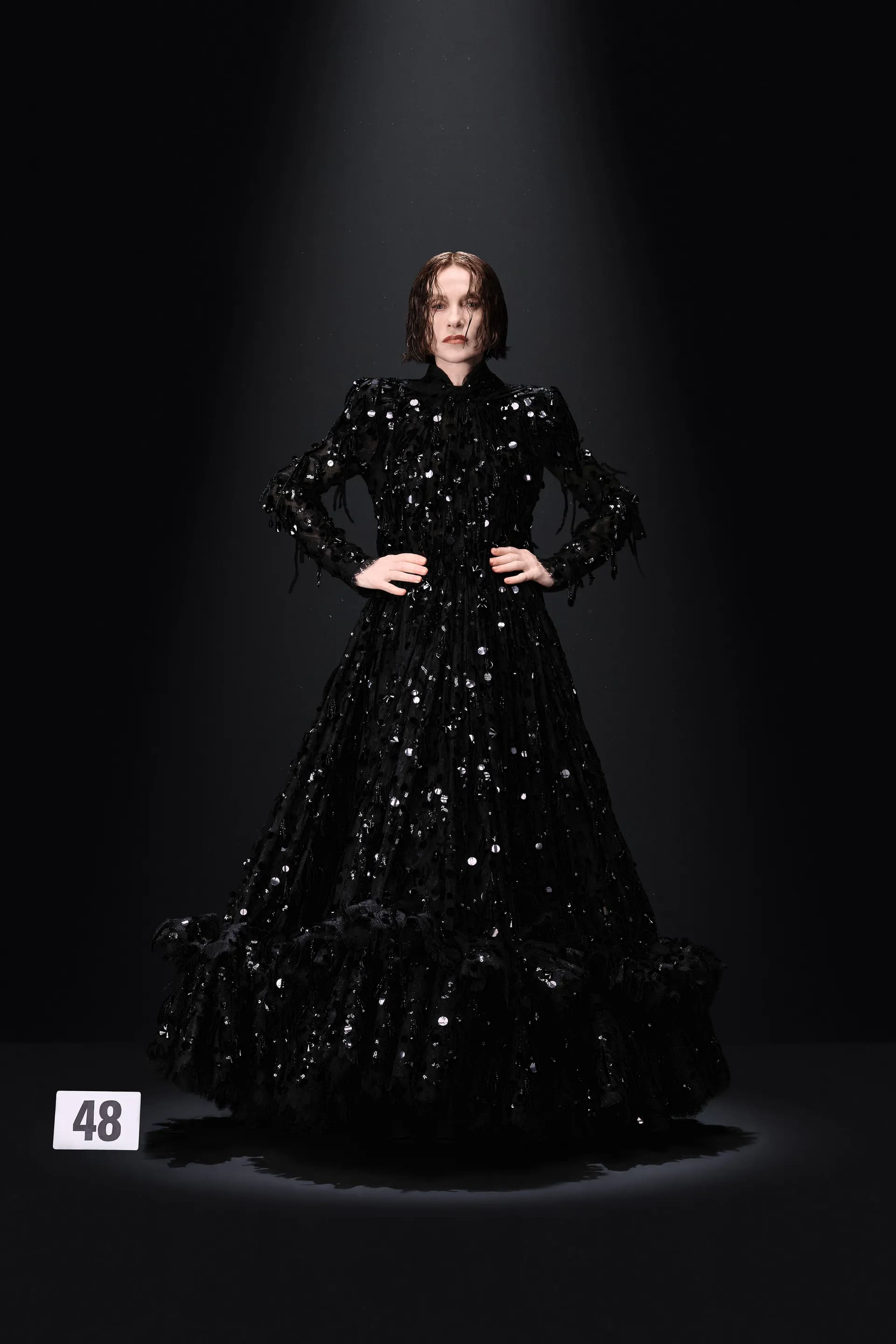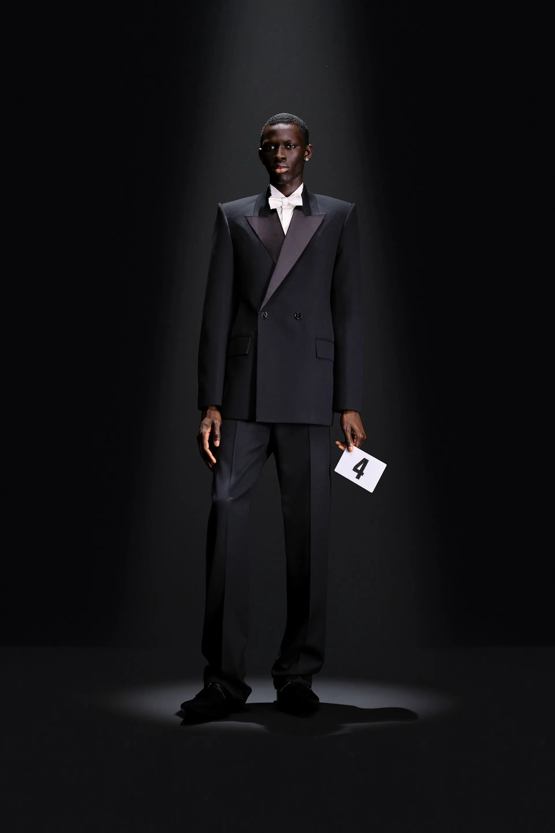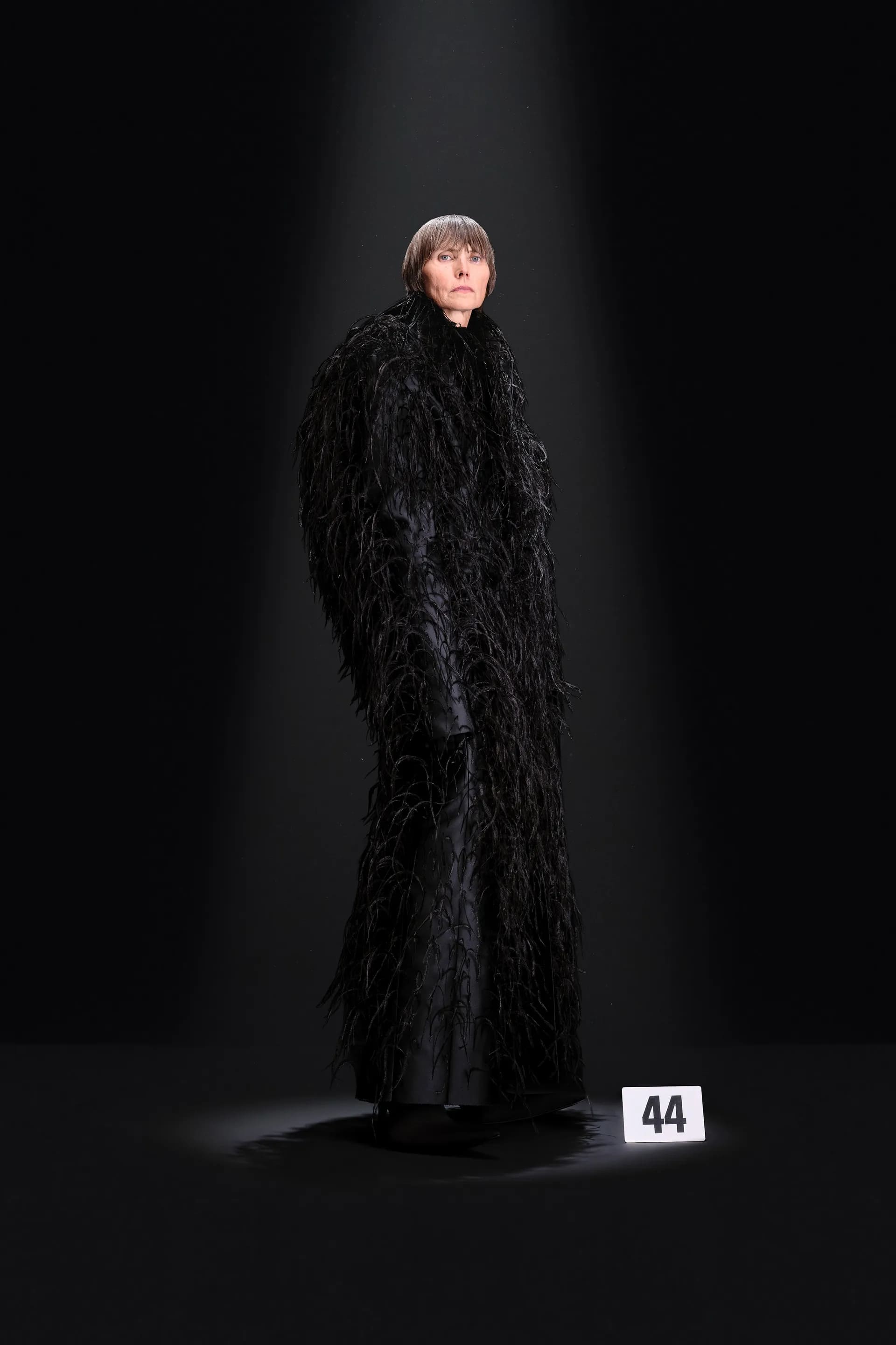 52-гу кутюрну колекцію Balanciaga відкриває чорна оксамитова сукня в комбінації з перловим намистом і білими рукавичками. Наступні кілька образів відображають зв’язок зі спадщиною Крістобаля, і згодом ця данина переходить в гіперболізовані об’ємні плечі луків.