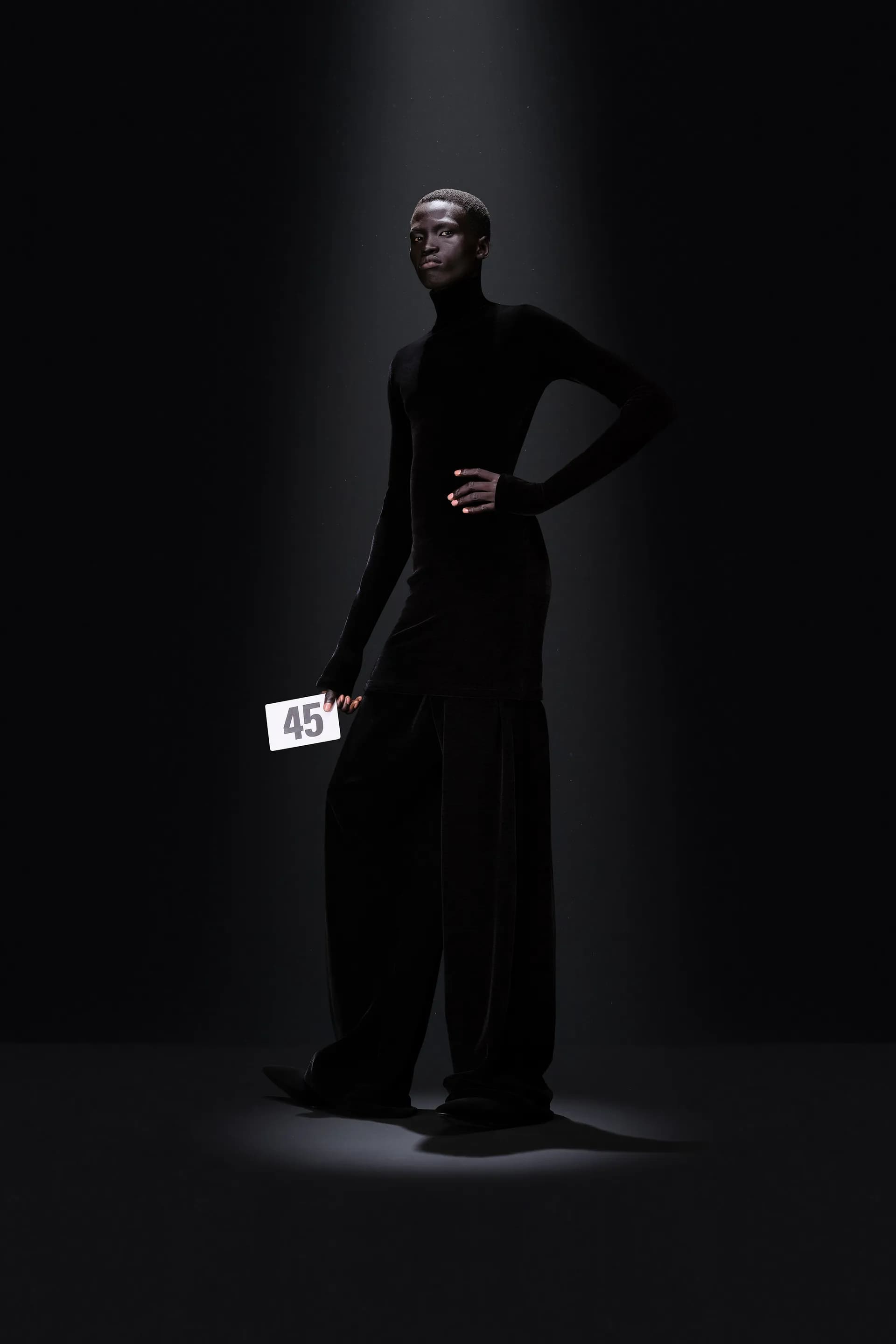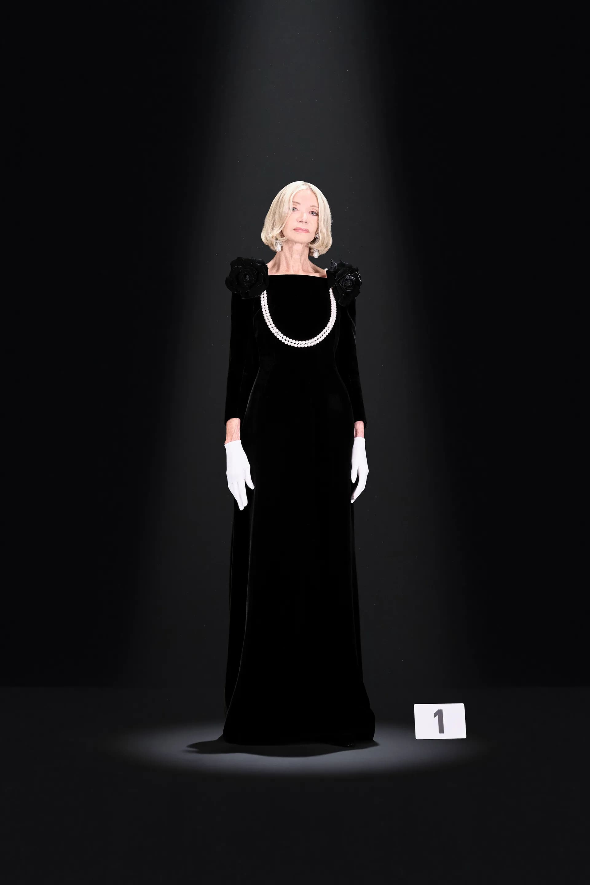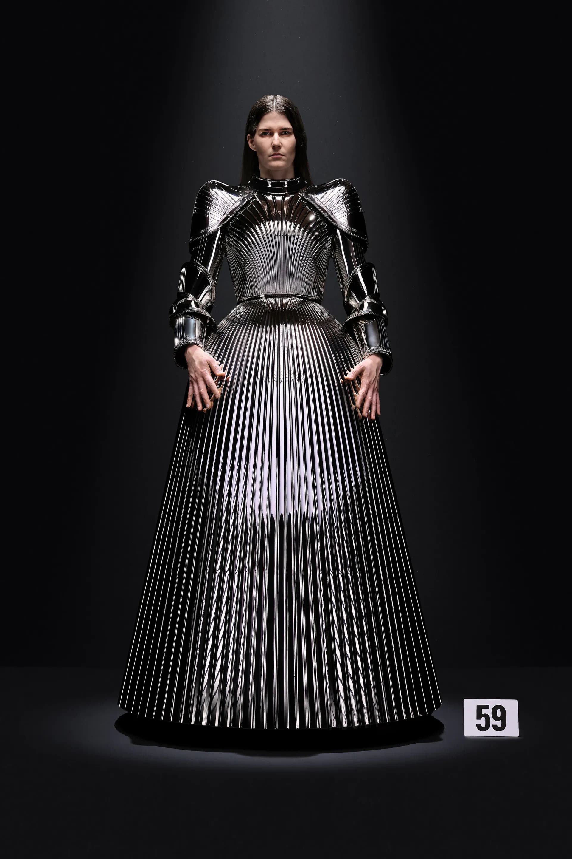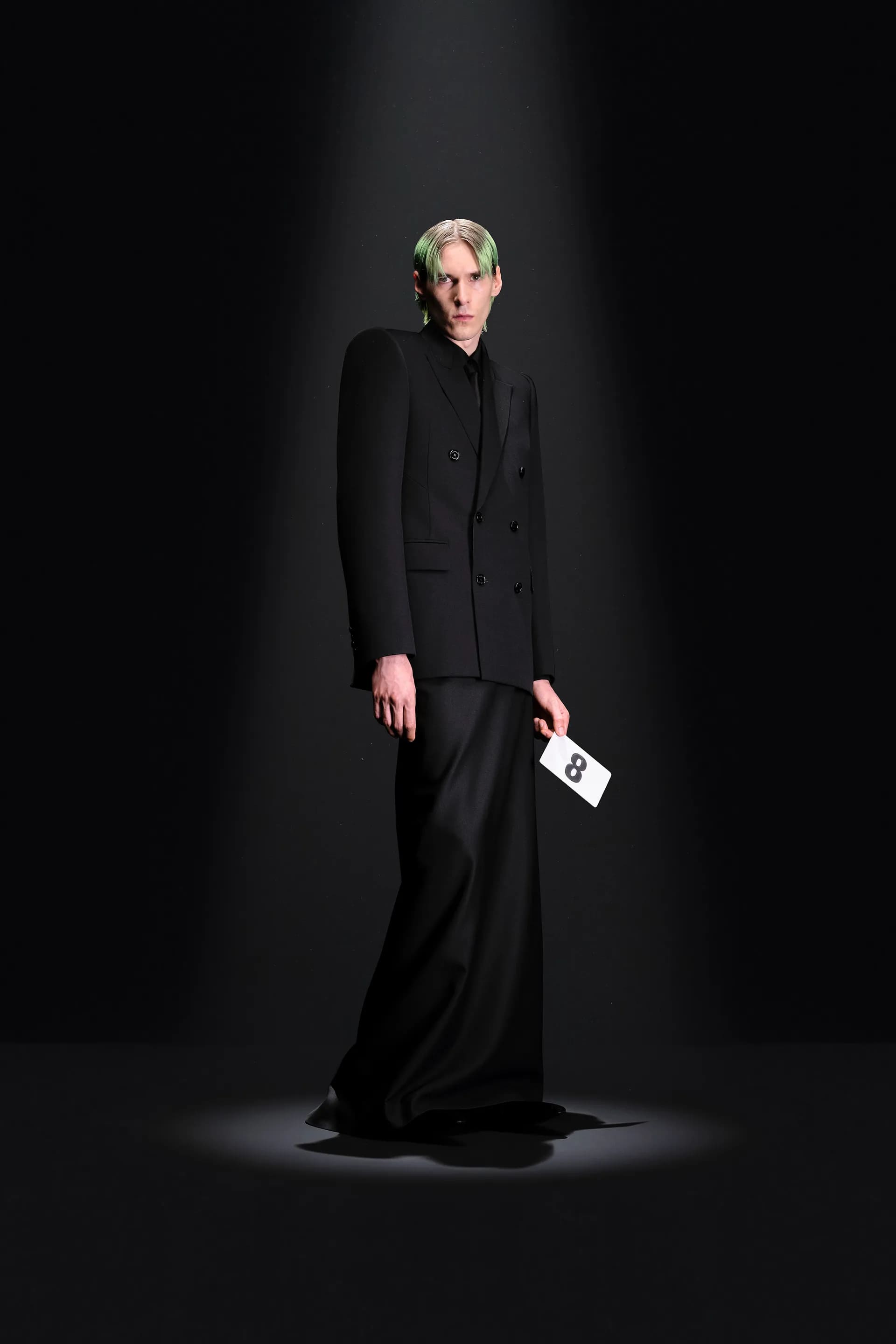 52-гу кутюрну колекцію Balanciaga відкриває чорна оксамитова сукня в комбінації з перловим намистом і білими рукавичками. Наступні кілька образів відображають зв’язок зі спадщиною Крістобаля, і згодом ця данина переходить в гіперболізовані об’ємні плечі луків.