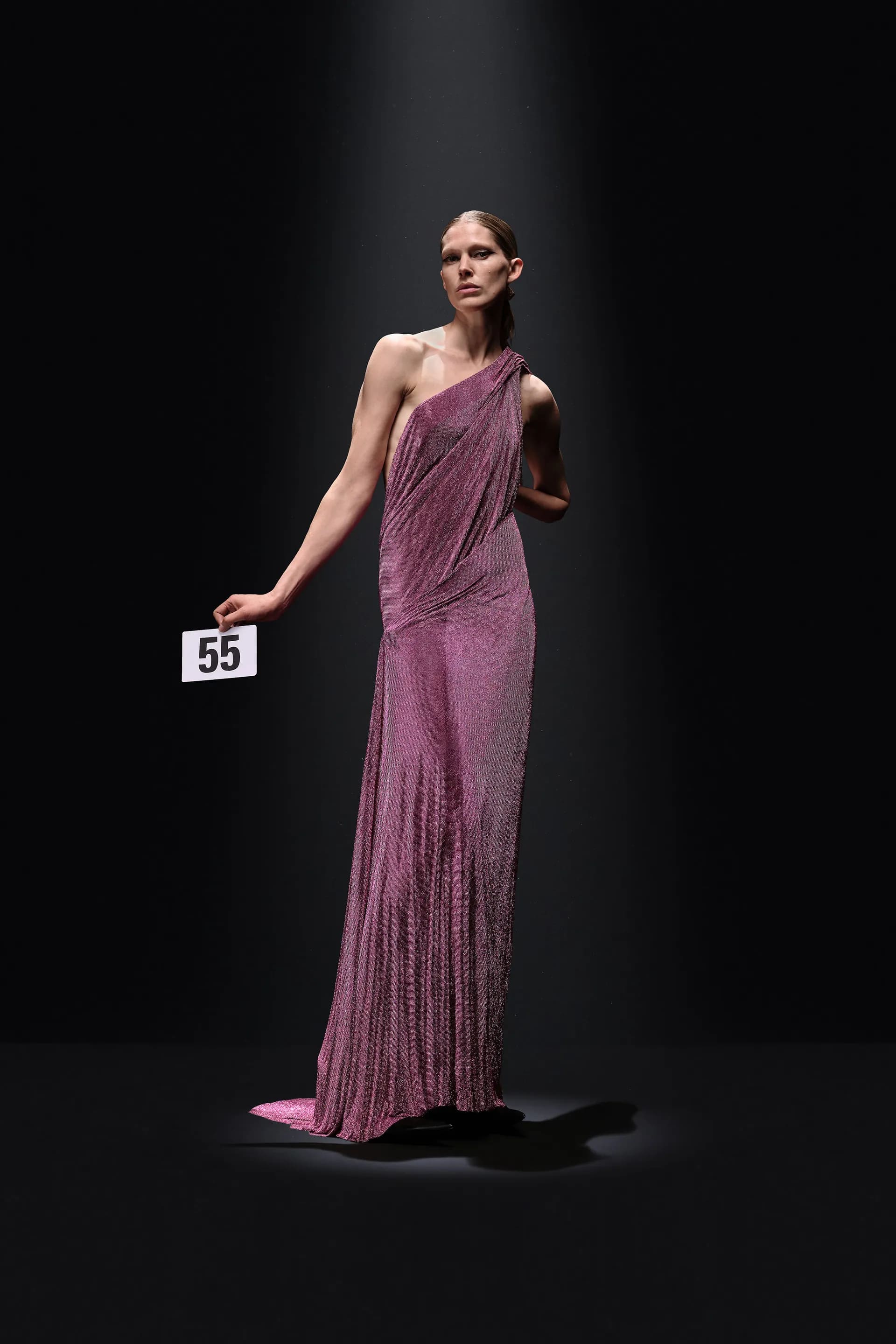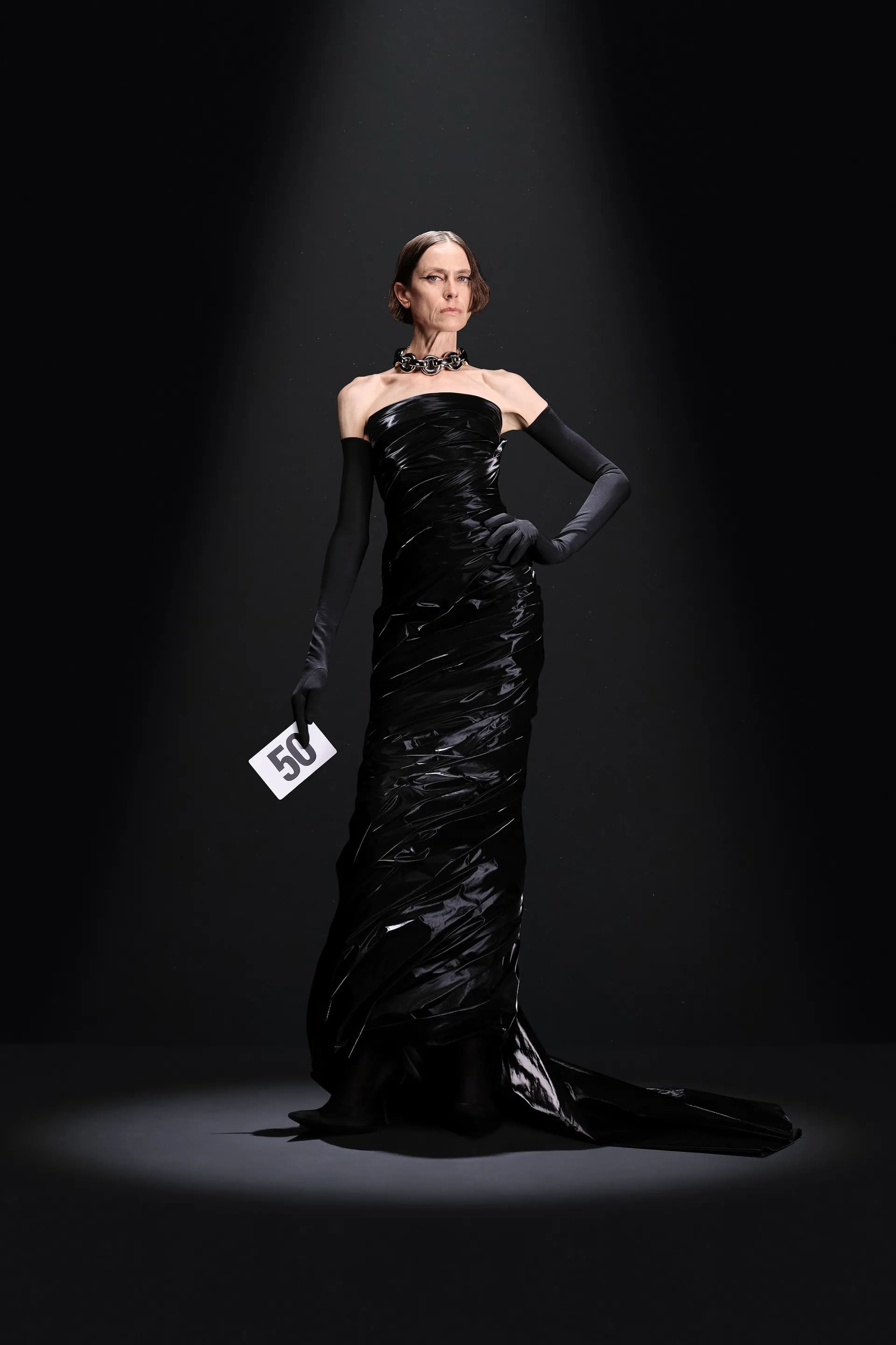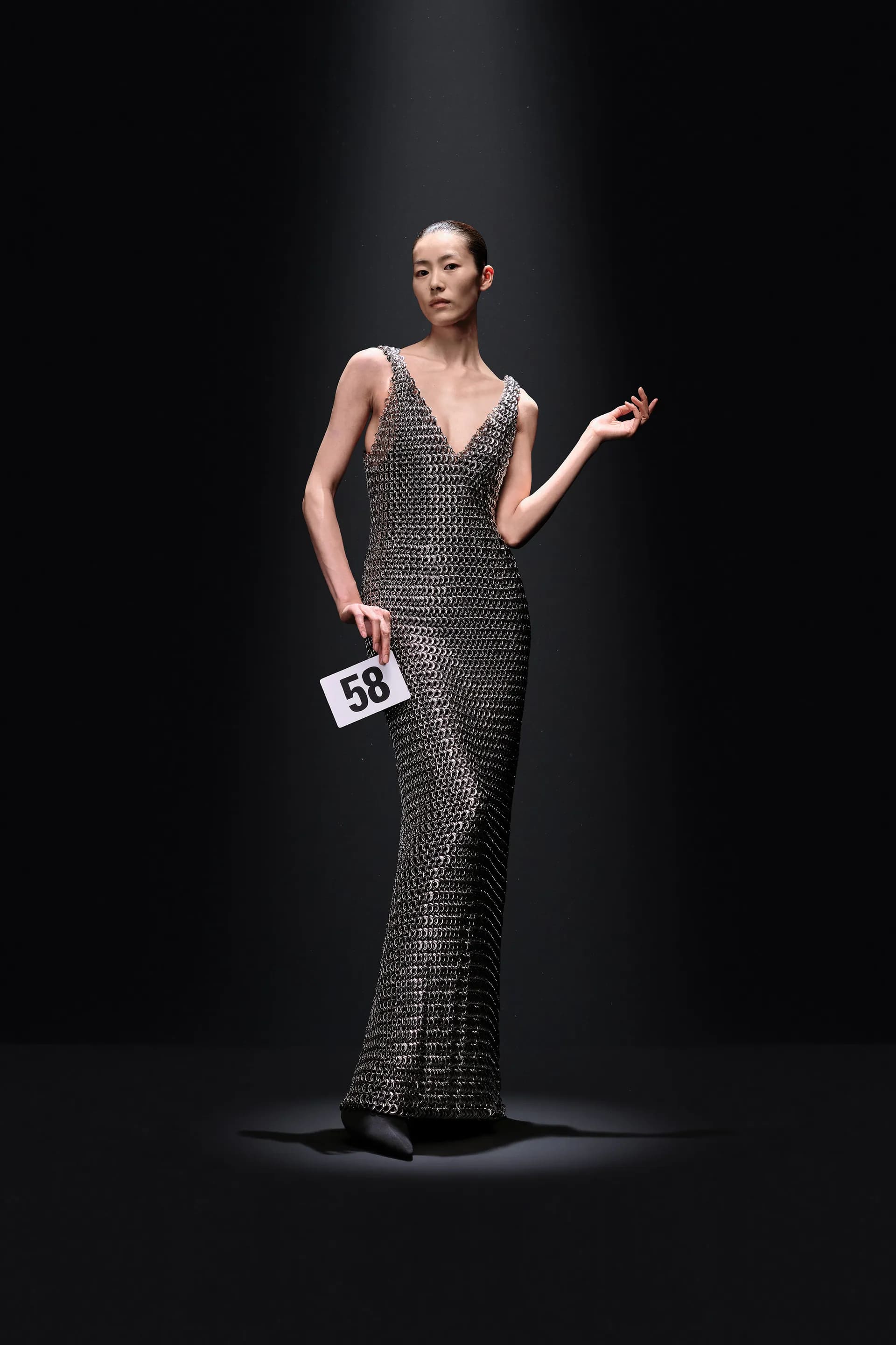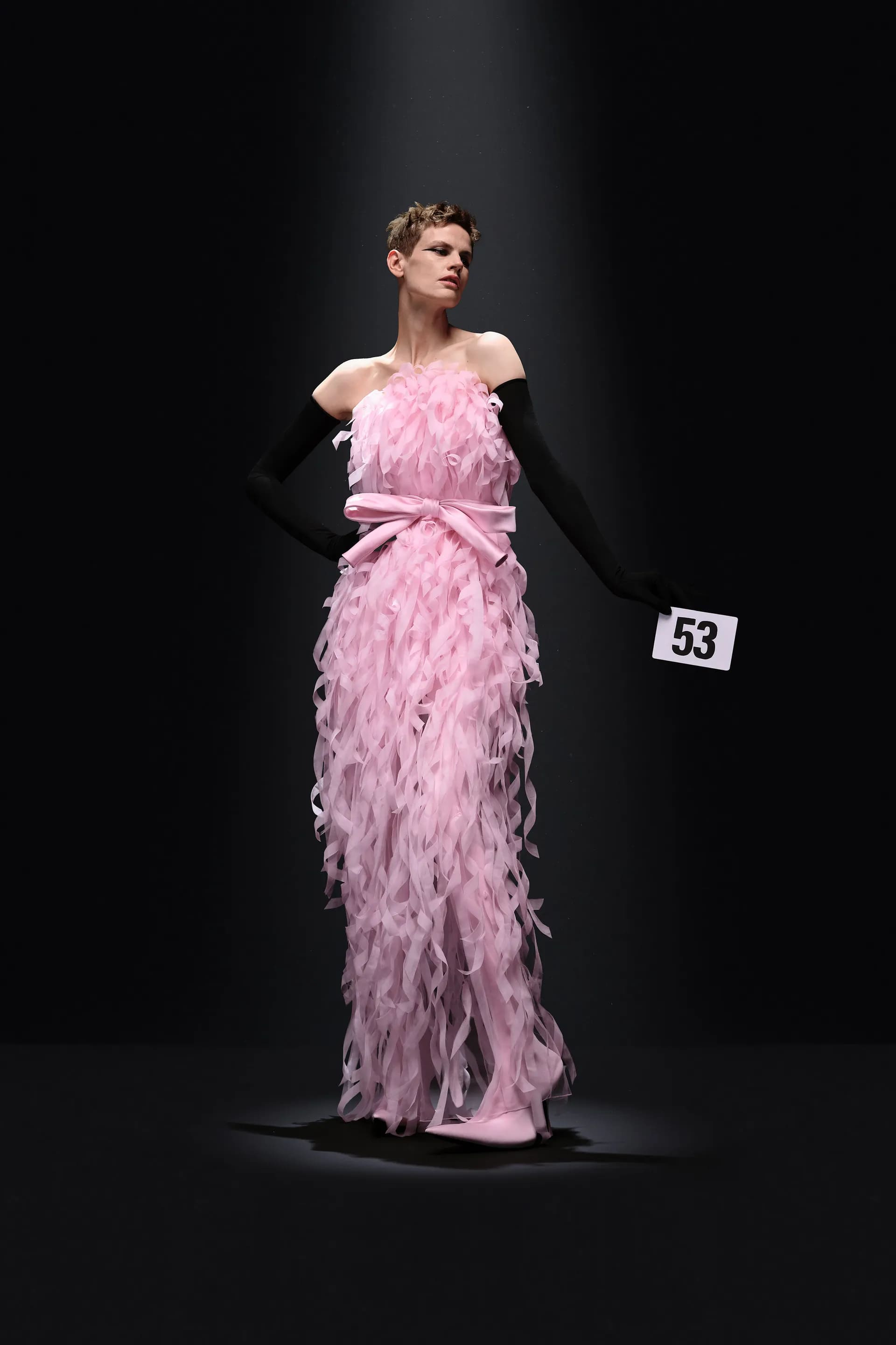 Серед принтів Демна фокусується на анімалістиці, а в середині колекції переходить до фактурних суконь для вечора в опері. Так, образ 52 складається зі стрічок, компонування яких тривало 160 годин роботи. Ця сукня-бюстьє також представлена у схожому світло-рожевому варіанті з оперними рукавицями зі спандексу.