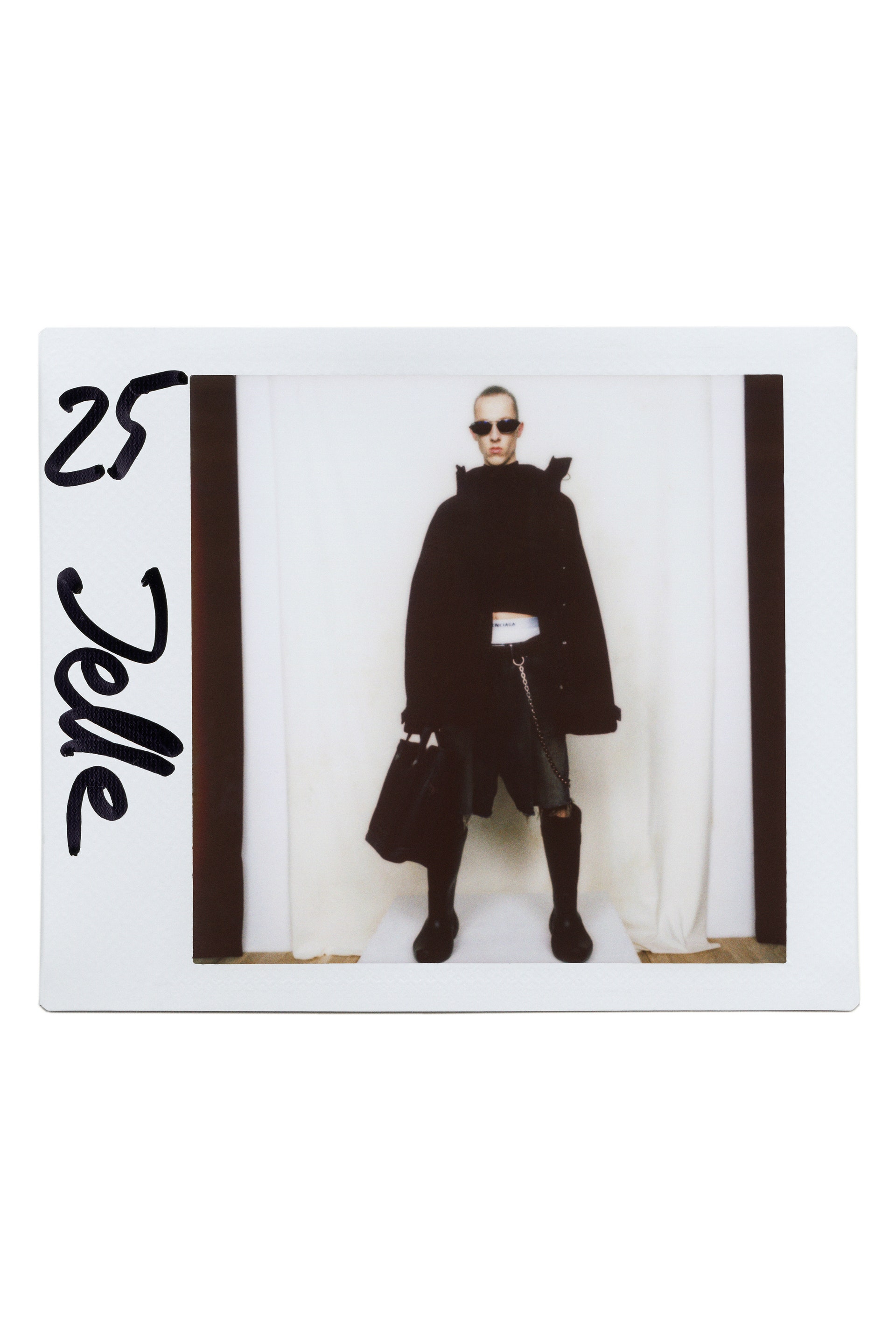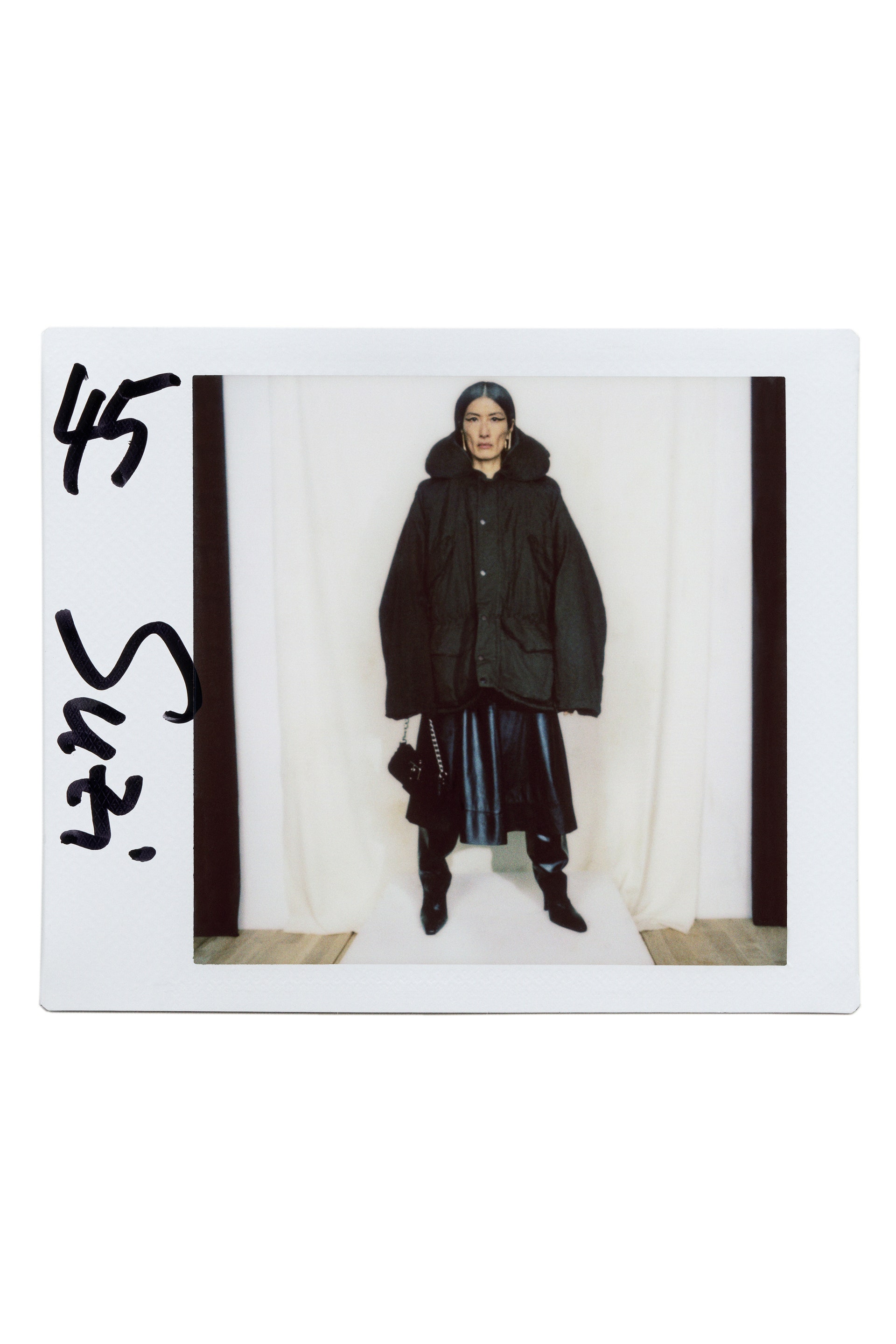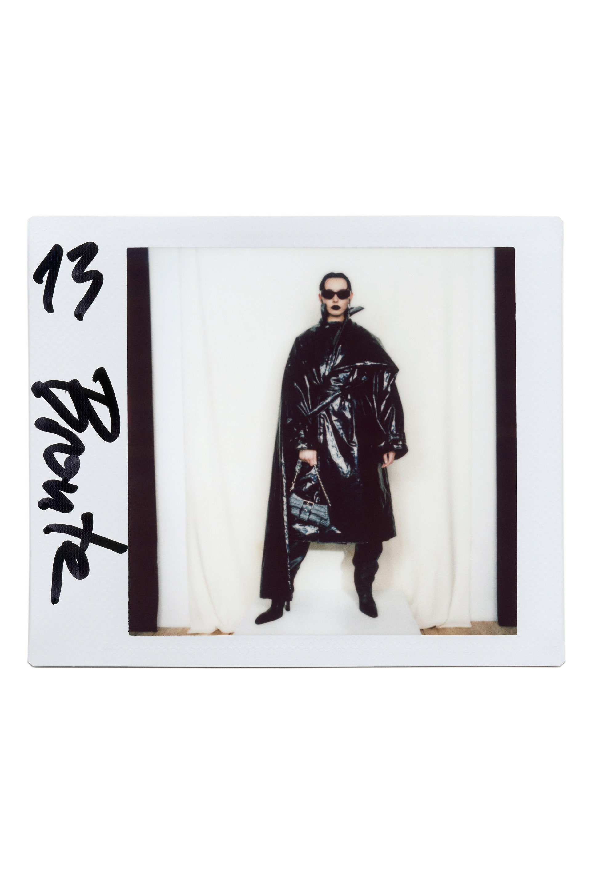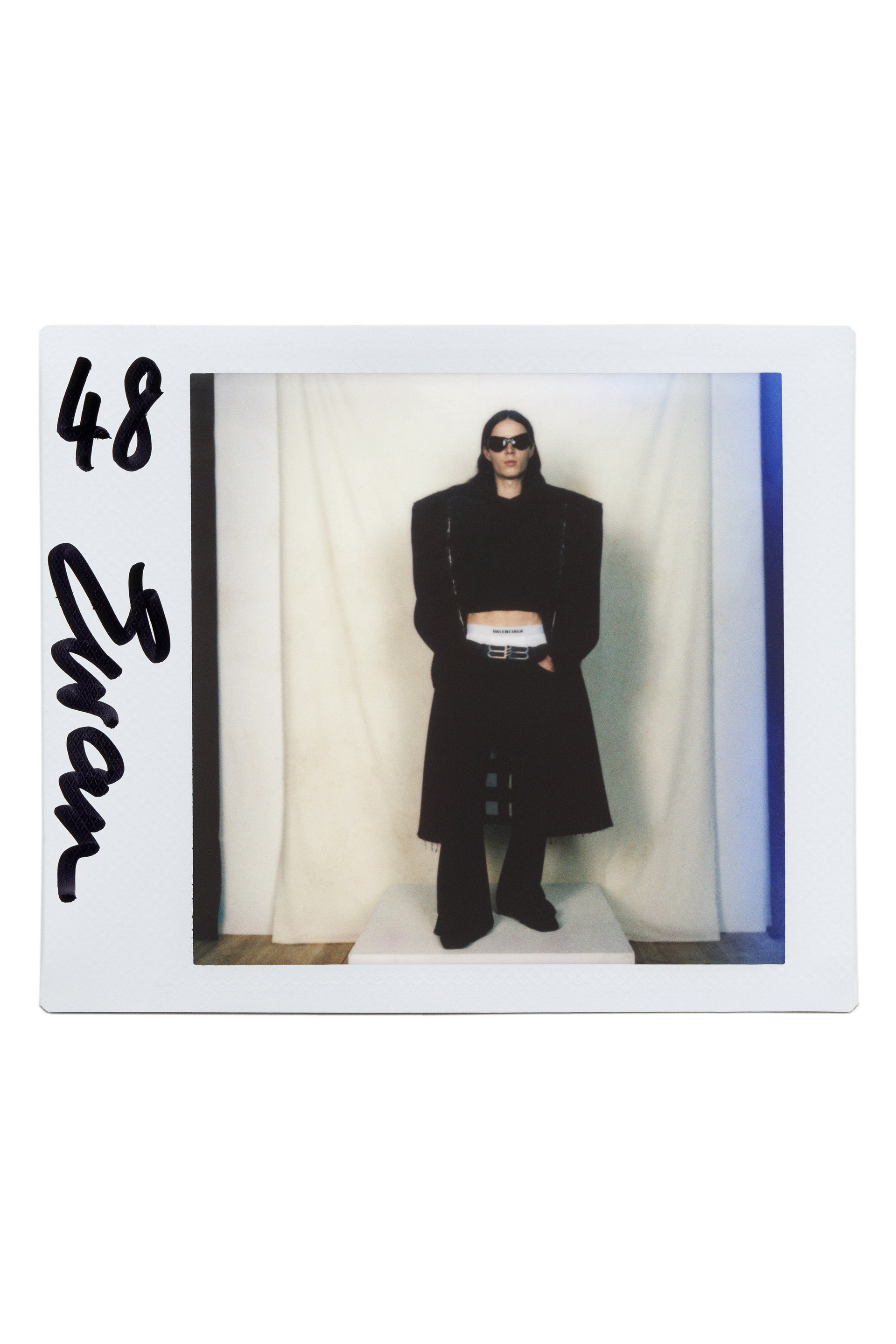Коллекция Демны также пропитана гранжем: объемные кожаные куртки, стянутые у краев, «квадратные» пальто и плащи, в которых так легко узнать Balenciaga наших дней и настроение минувшей эпохи, декадентские бархатные платья со шлейфами и плотные костюмы из шерсти, традиционно для Демны скульптурные и предельно силуэтные. Почти вся коллекция окрашена в черный — любимый цвет Демны, один из важнейших в творчестве Кристобаля Баленсиаги и самый модный в конце 90-х. Лишь некоторые вещи, вроде эластичных топов и текстильных шуб, выполнены в белом, голубом, красном или ярко-зеленом цветах.