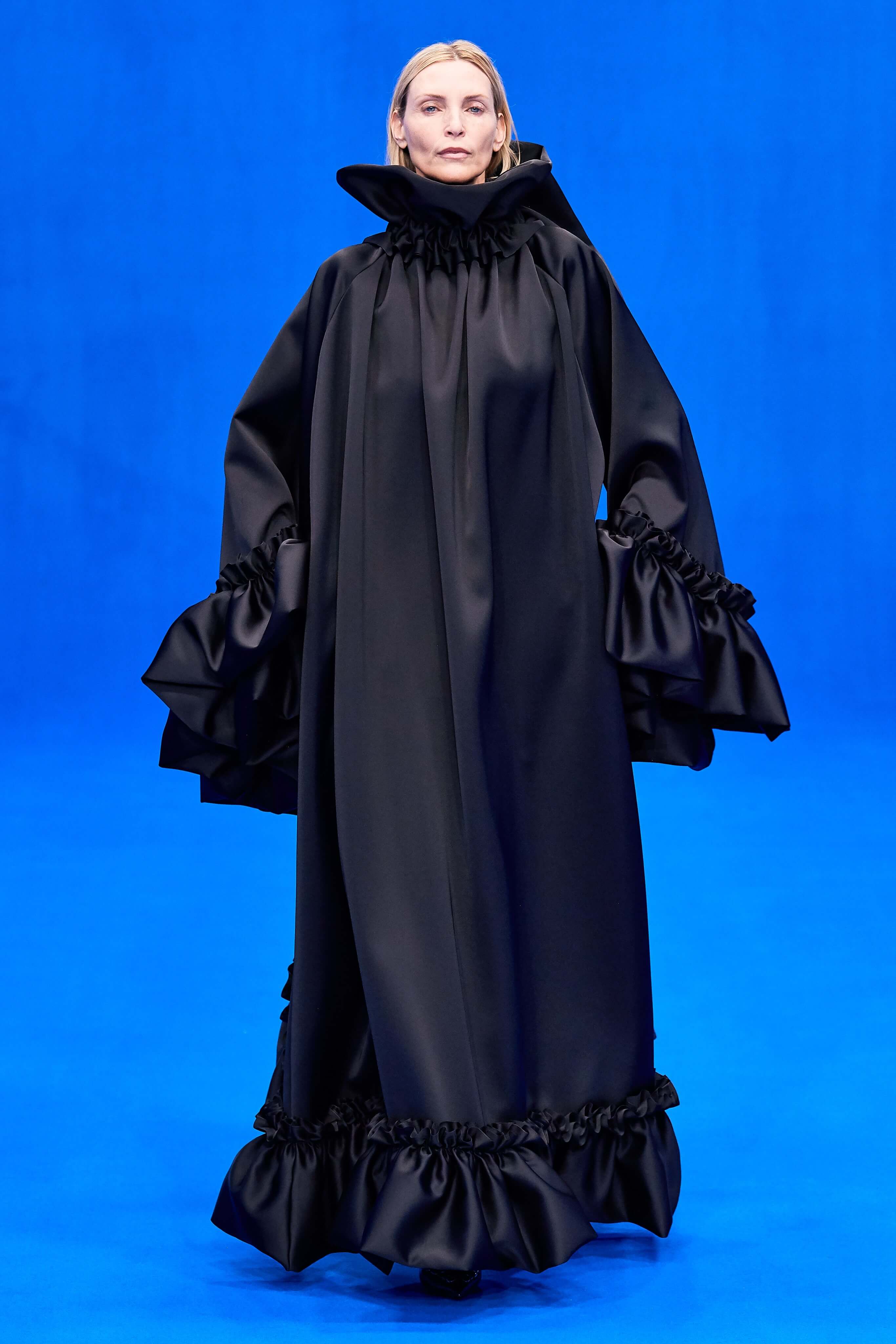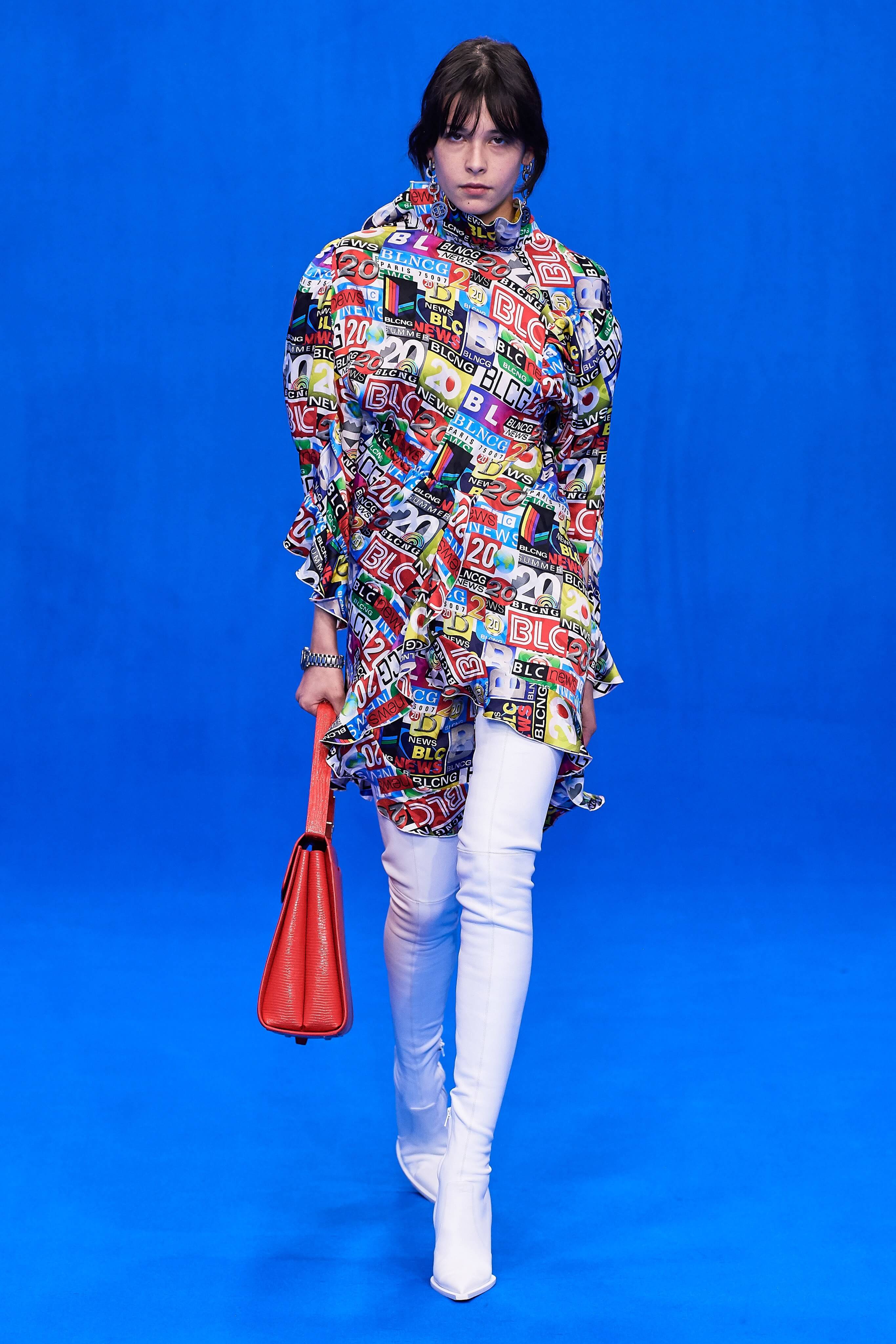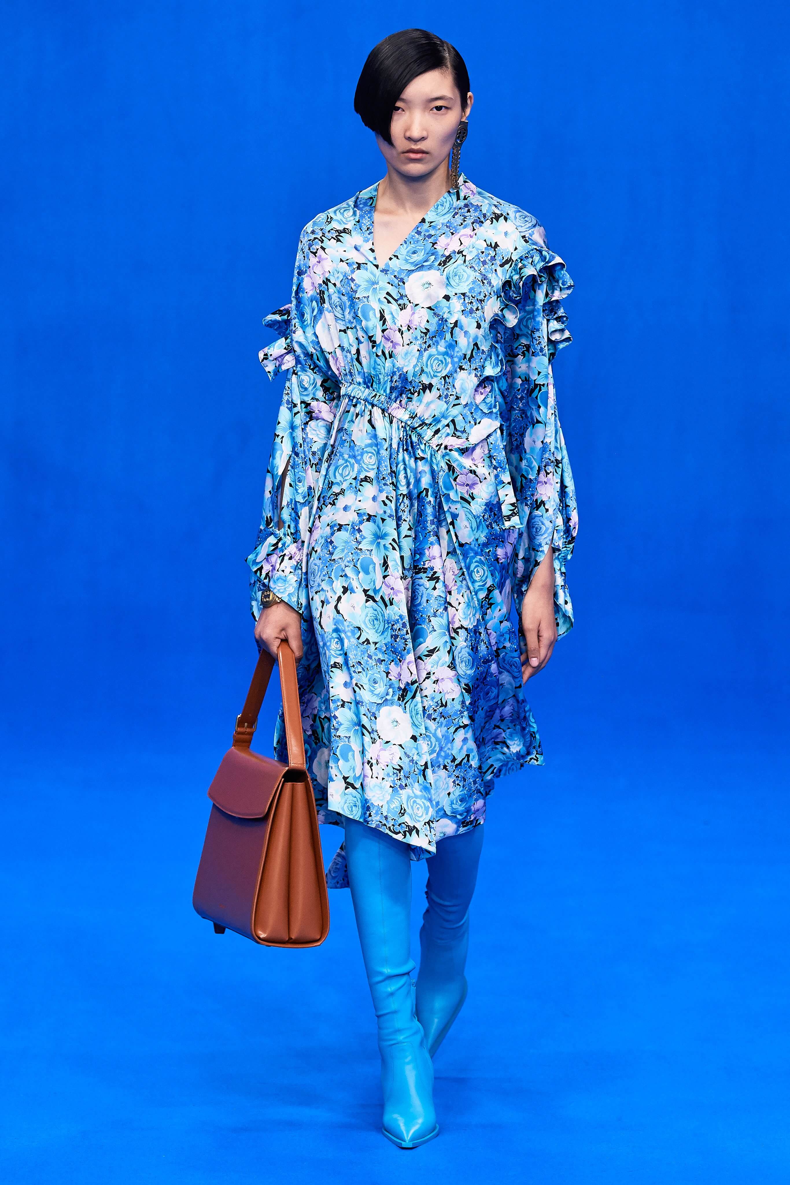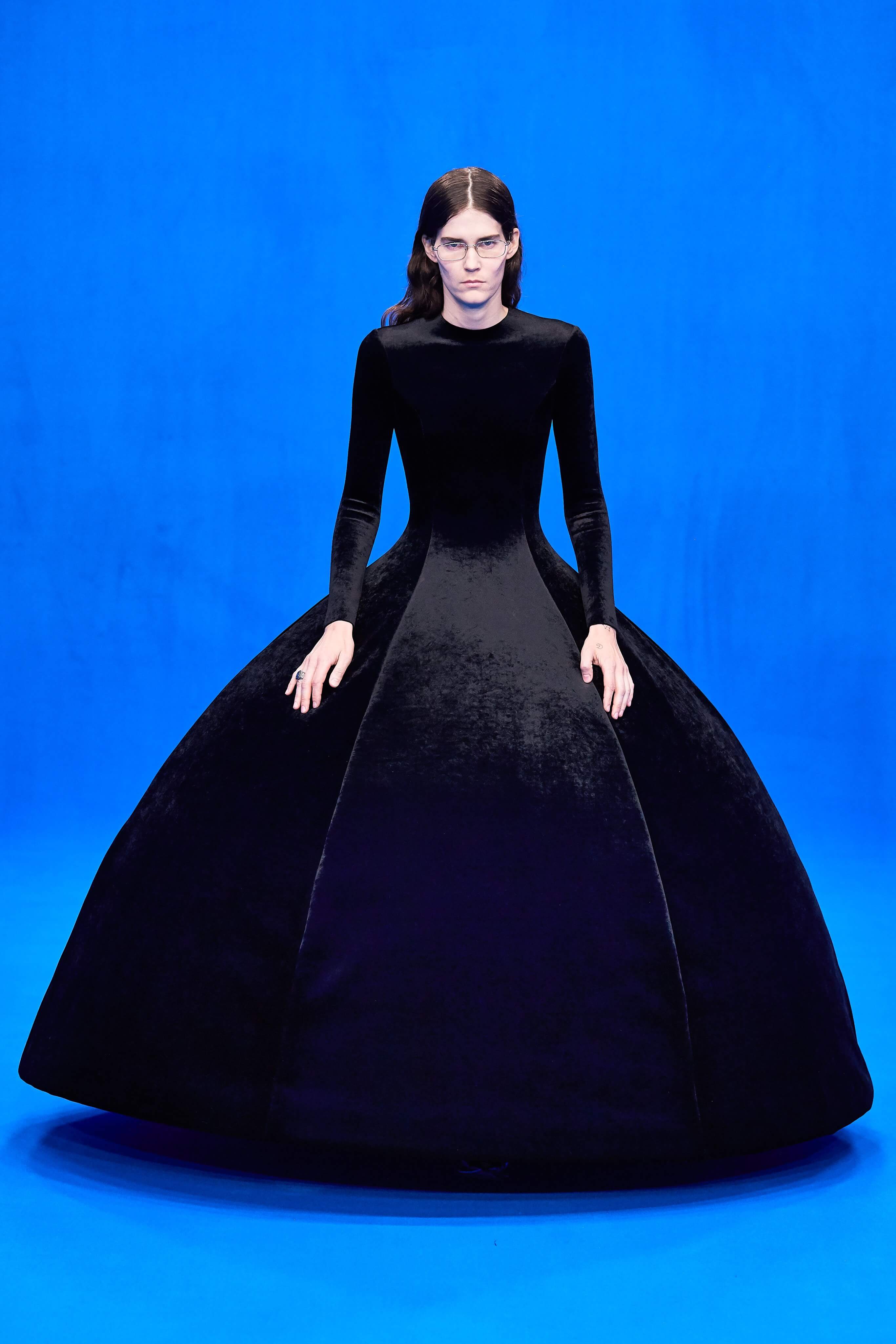 Демна Гвасалия верен себе – его острые плечистые костюмы с юбками до середины колена, "сутулые" пуховики, нарочито бесформенные костюмы и квадратные платья на первый взгляд выглядят гротескно, однако не только носибельны, но и имеют в основе эстетические коды хорошо знакомой нам классики 1940-80-х годов. Ирония - это то, чего нам зачастую остро не хватает, и Гвасалия дарит нам это неповторимое ощущение дурашливой серьёзности, то стилизуя аксессуары и вещи под дизайн кредиток MasterCard, то облачая моделей в сверхлаконичные, но не в меру пышные бальные платья на кринолинах, то укутывая их в леопардовые пальто, блестящие комбинезоны в зебру или серые плащи, напоминающие чехлы для мебели. В обильном декорированном рюшами платье-дезабилье на подиум в этот раз вышла Рената Литвинова, чего подспудно ждали многие поклонники актрисы, ведь инстаграм артистки изобилует элегантными total-look от Balenciaga.