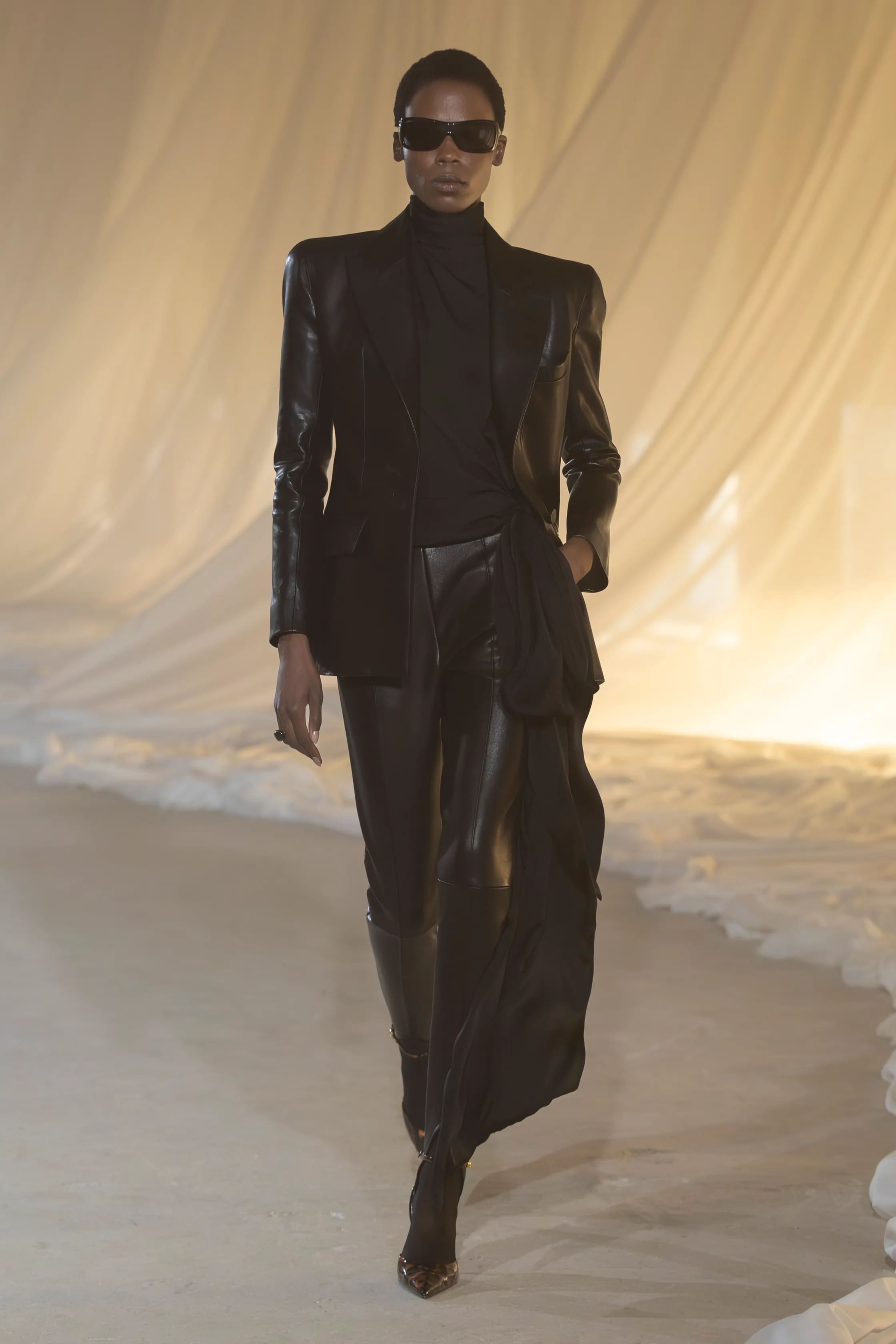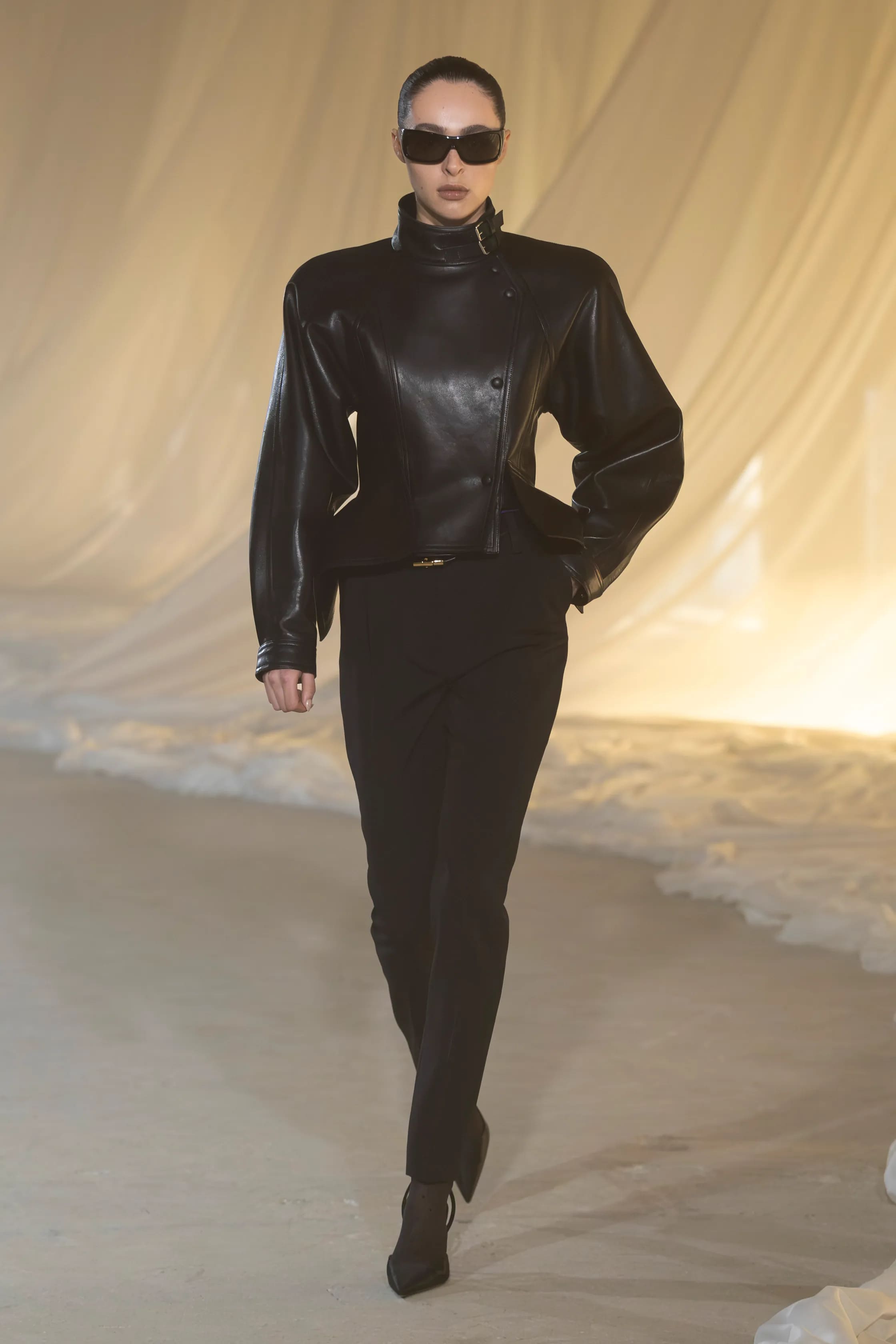 У дебютному образі з колекції fall-winter — 2026/27 Антонен Трон поєднав матову шкіряну куртку з класичними брюками. Водночас інша частина шоу відтворювала ранні етапи кар’єри П’єра Бальмена та становлення його як кутюрьє. М’які лінії контрастували з графічними формами, шкіра змінювала вовну та шовк, а анімалістичні мотиви доповнювалися безпрограшною комбінацією з чорним.