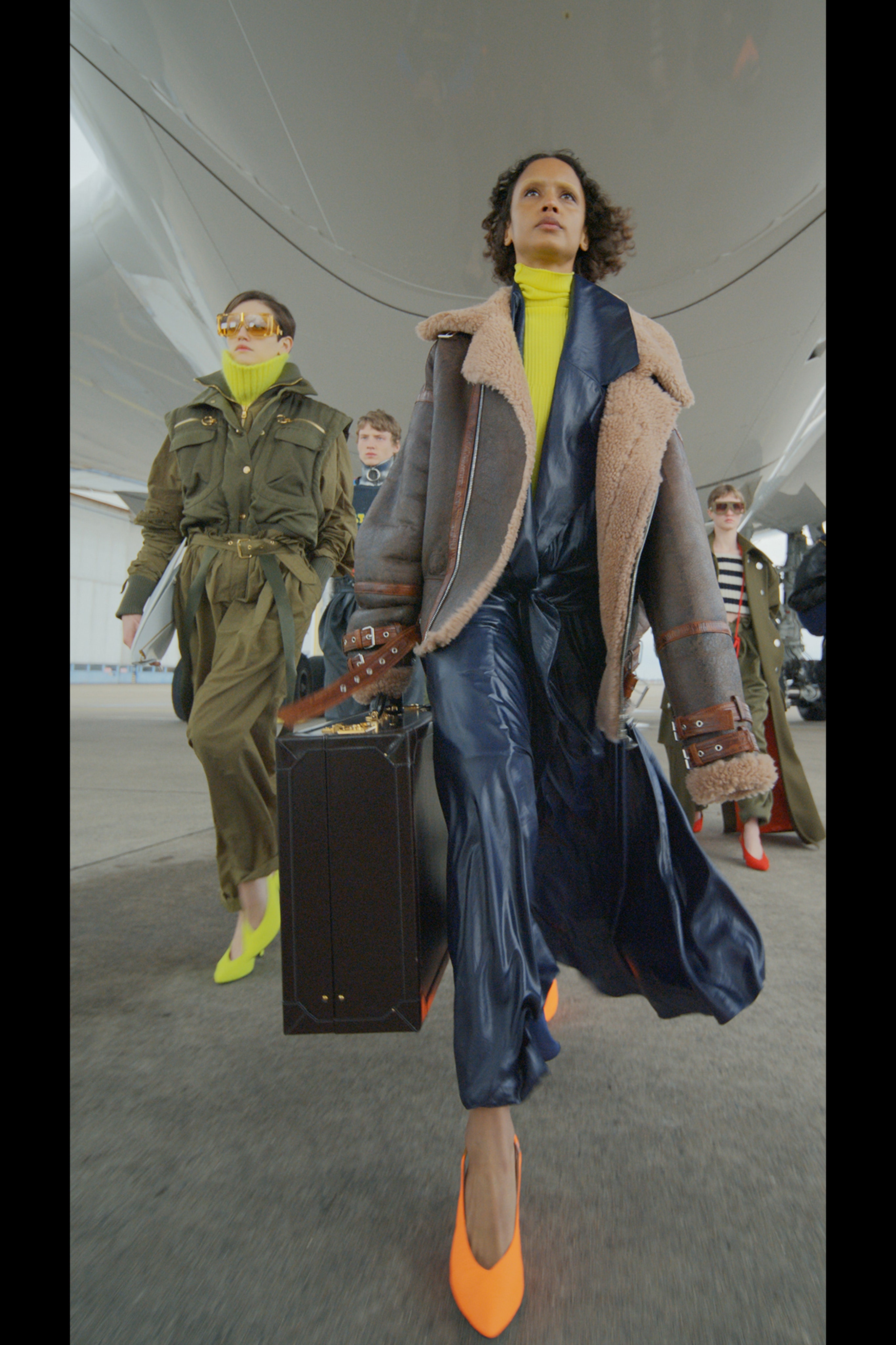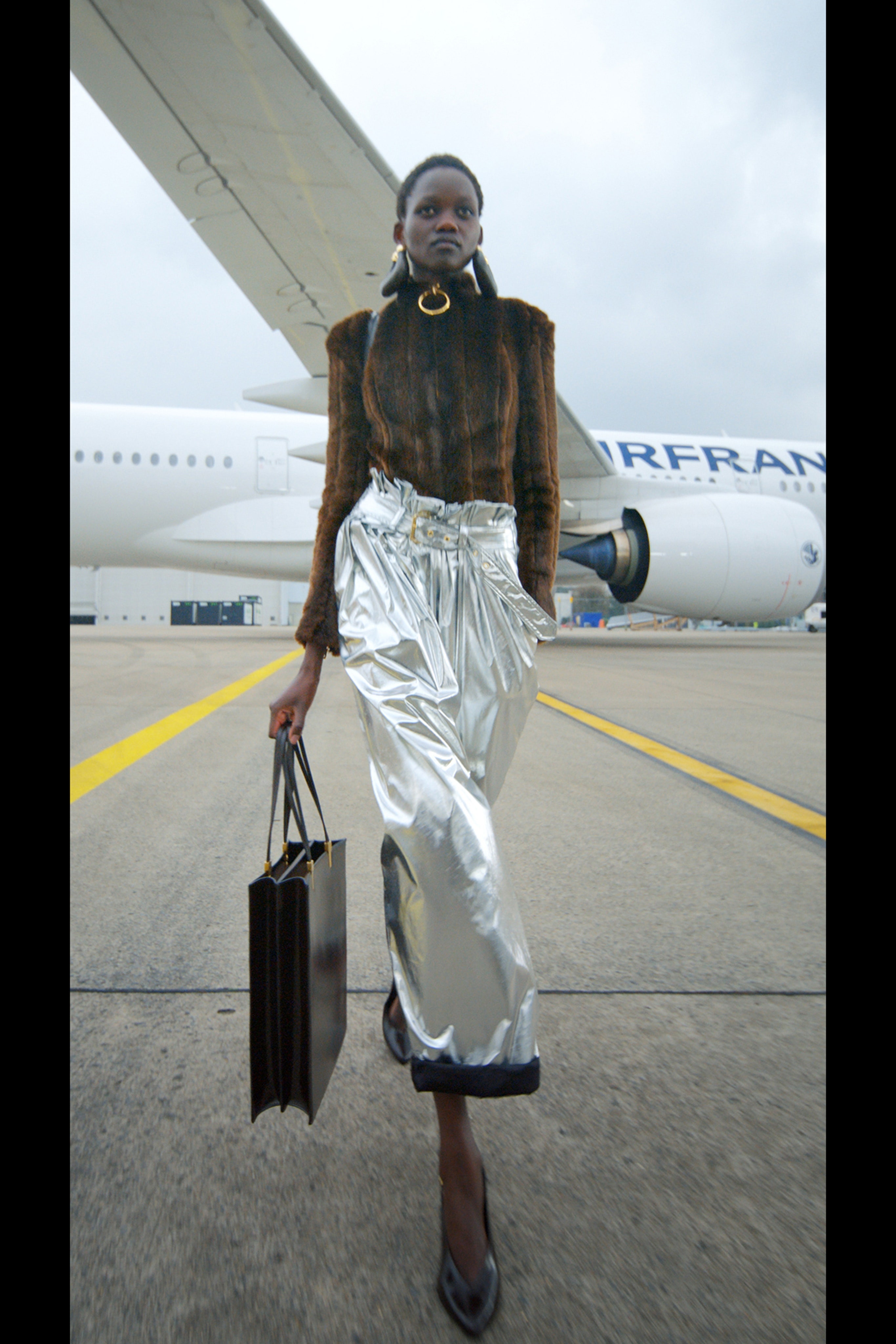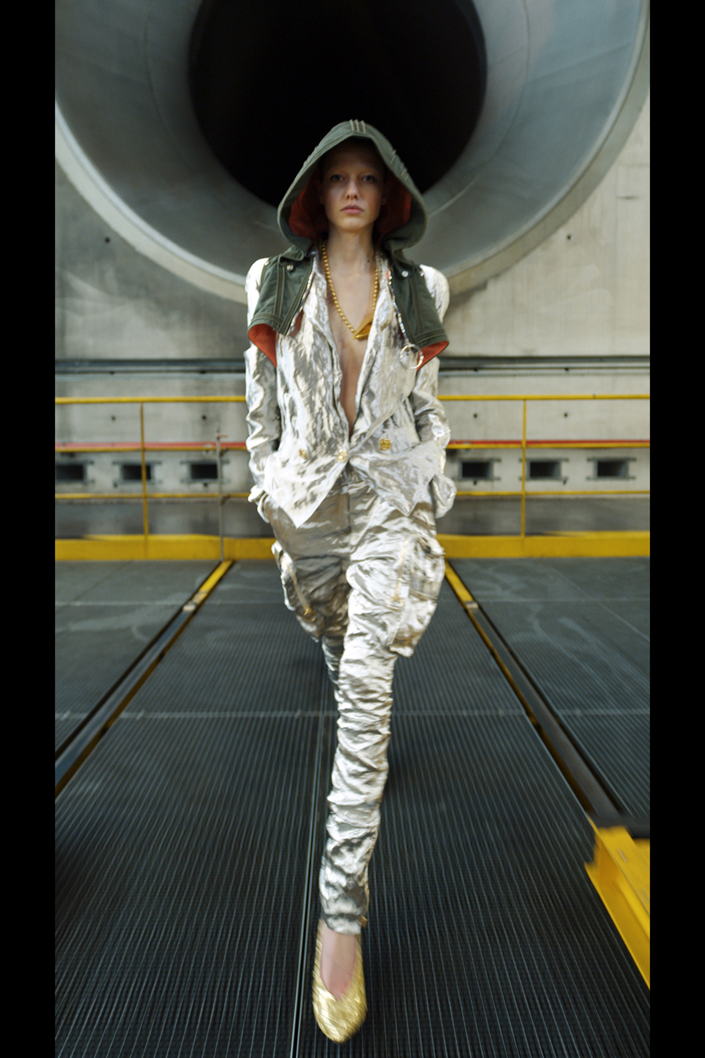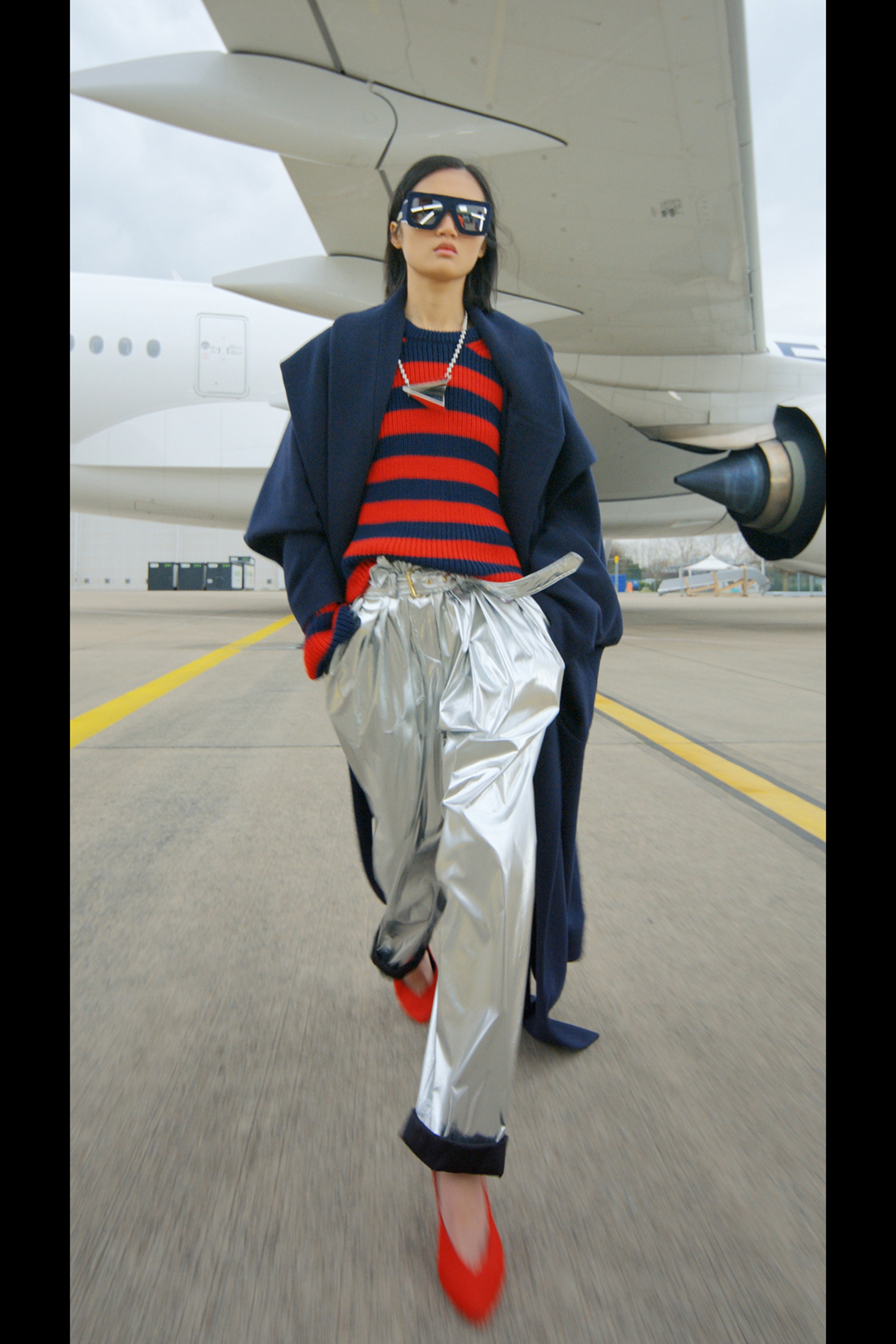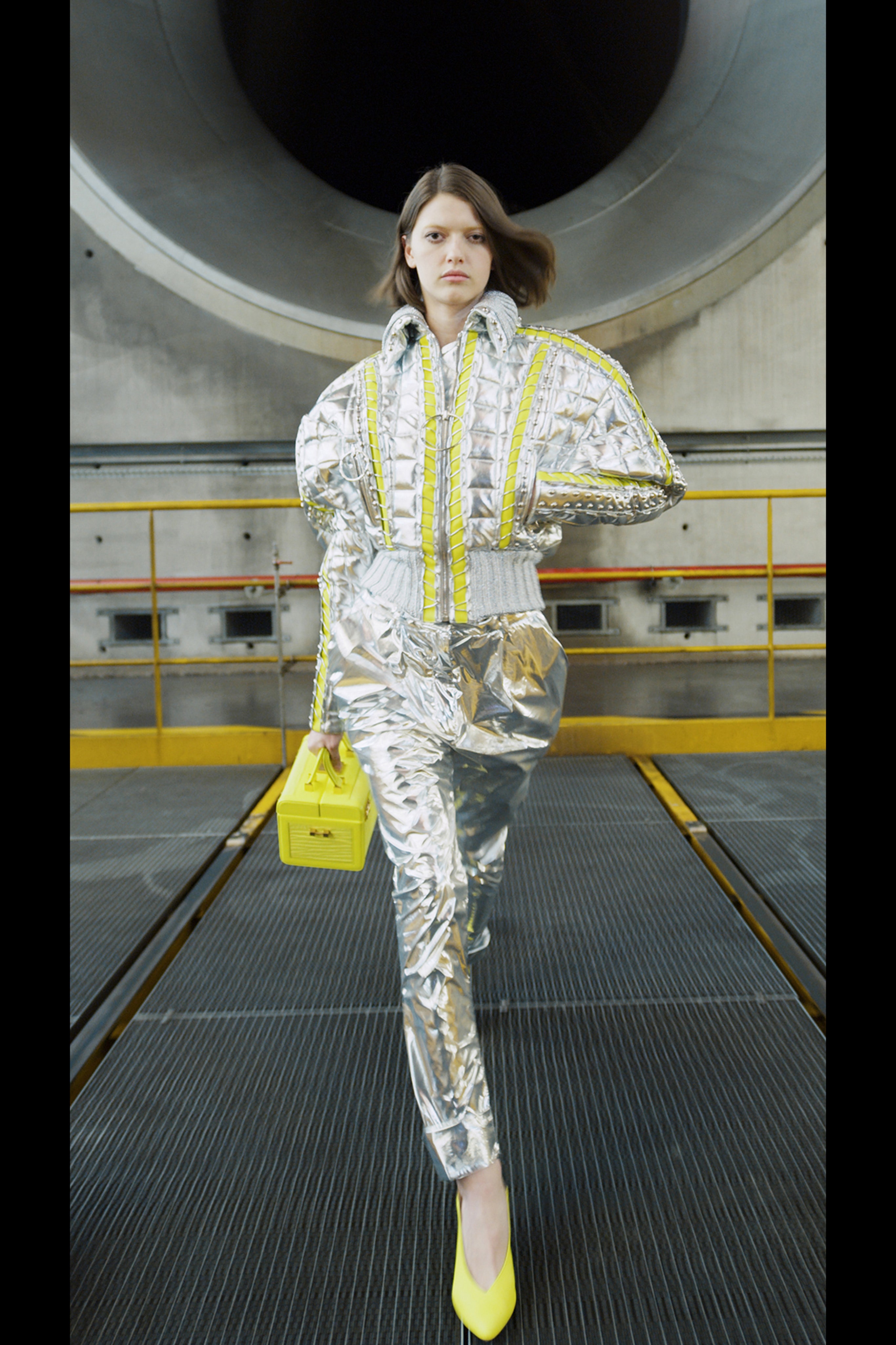 Ощущение праздника, которое сопровождает нас в поездках, передается в золотых брючных костюмах и платьях, ярких водолазках и ироничных аксессуарах. Украшения коллекции выполнены в виде дорожных подушек для сна, а сумки напоминают папки для деловой документации и дипломаты. Кто знает, возможно совсем скоро, надев сверкающие брюки и росокшный авиационный топ, можно будет отправиться в путешествие по орбите на электрическом самолете NASA.
