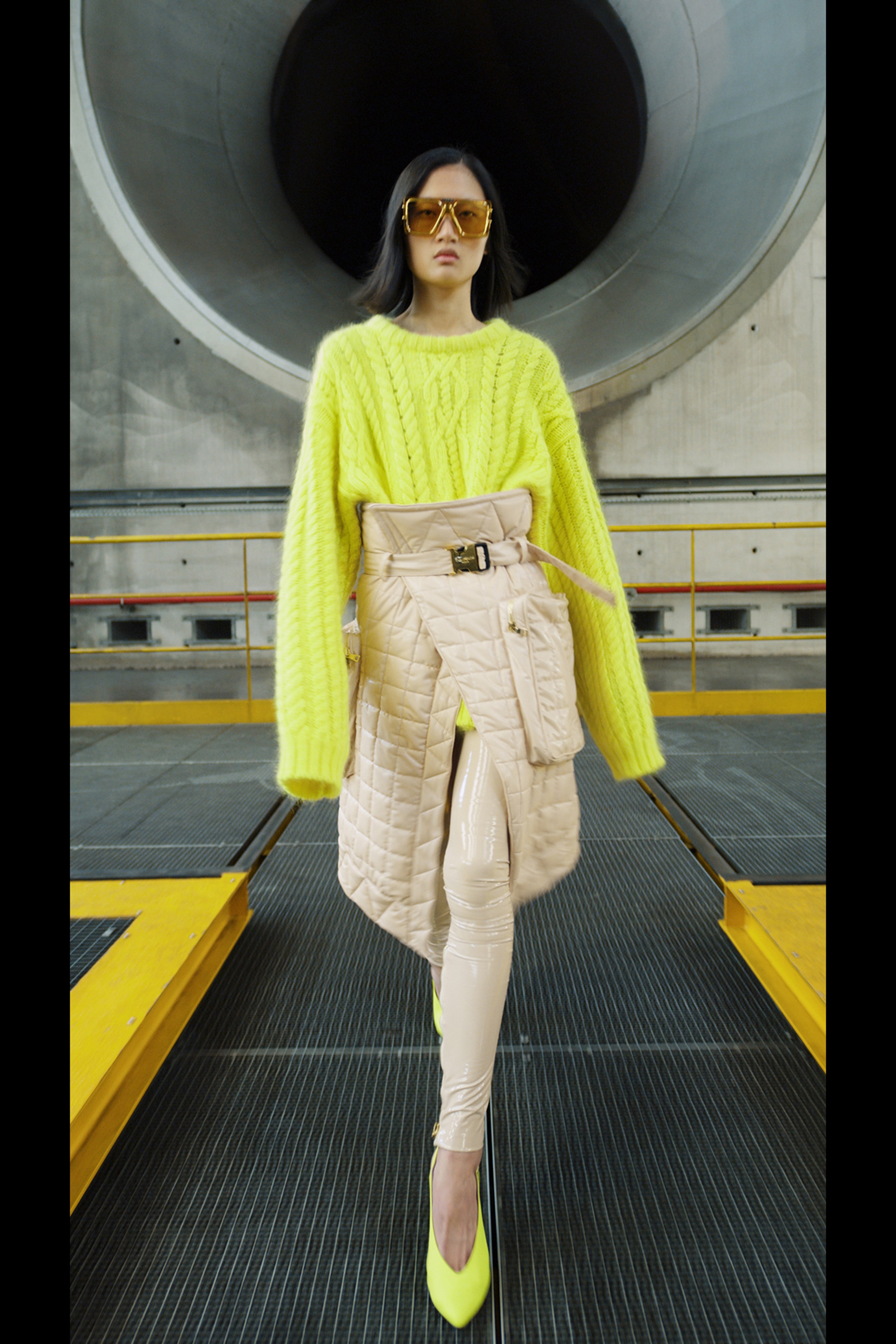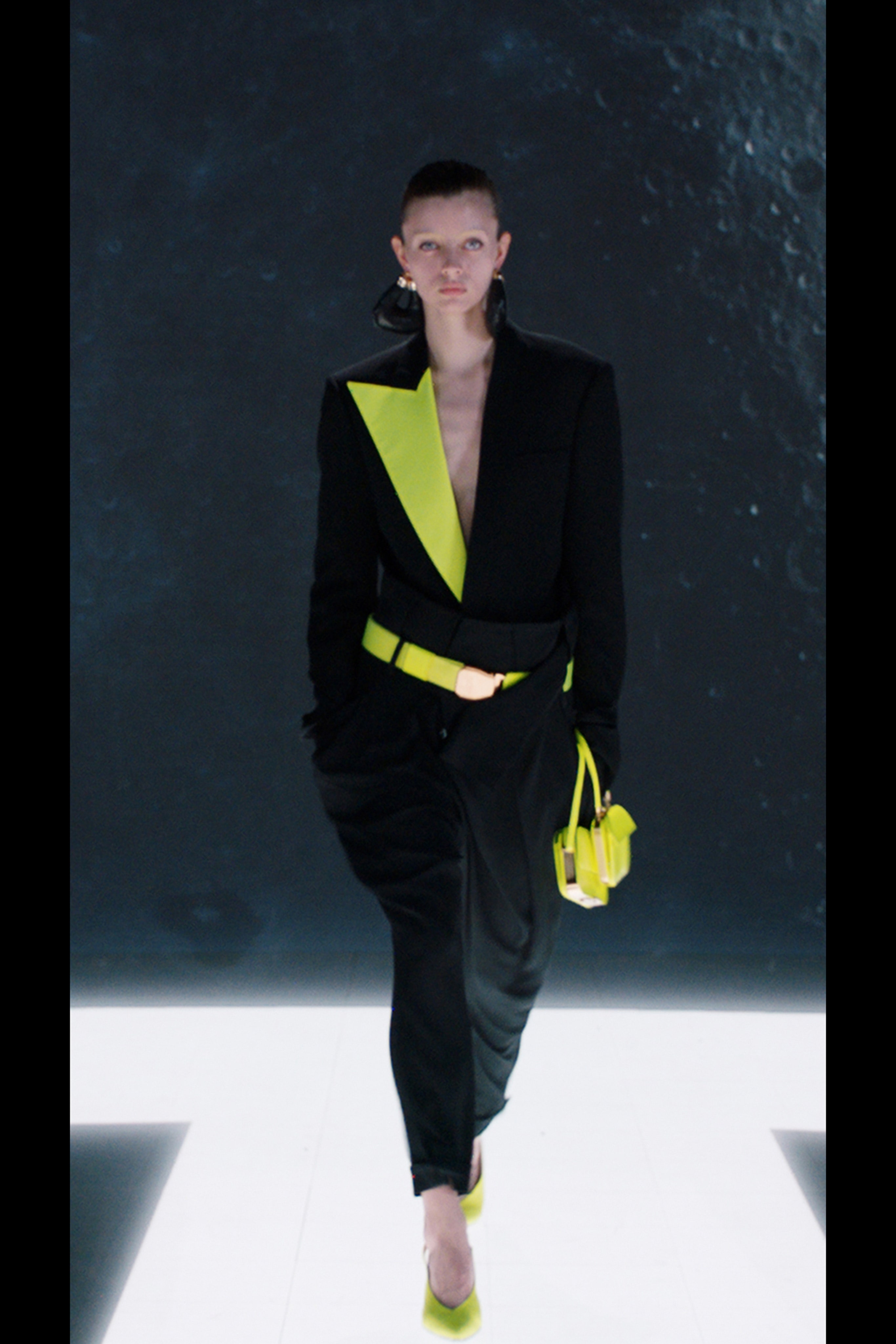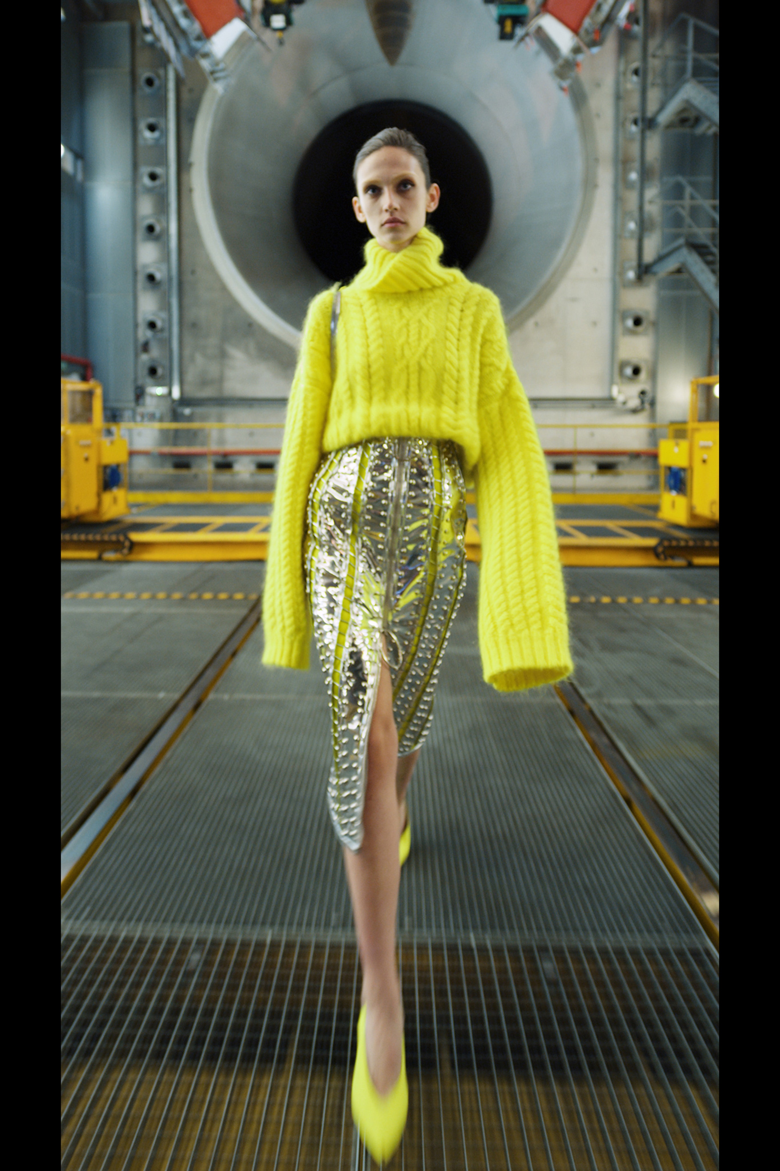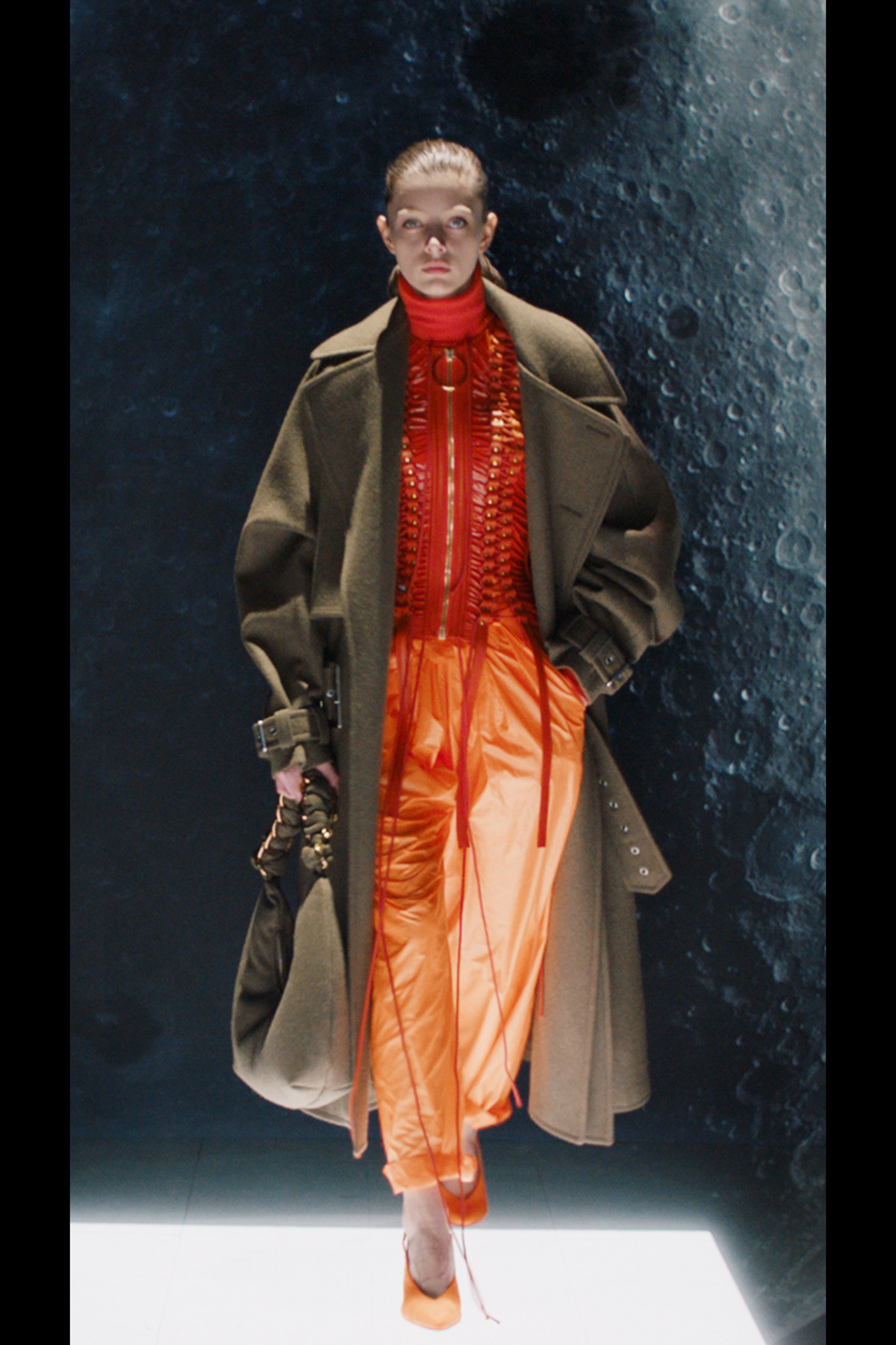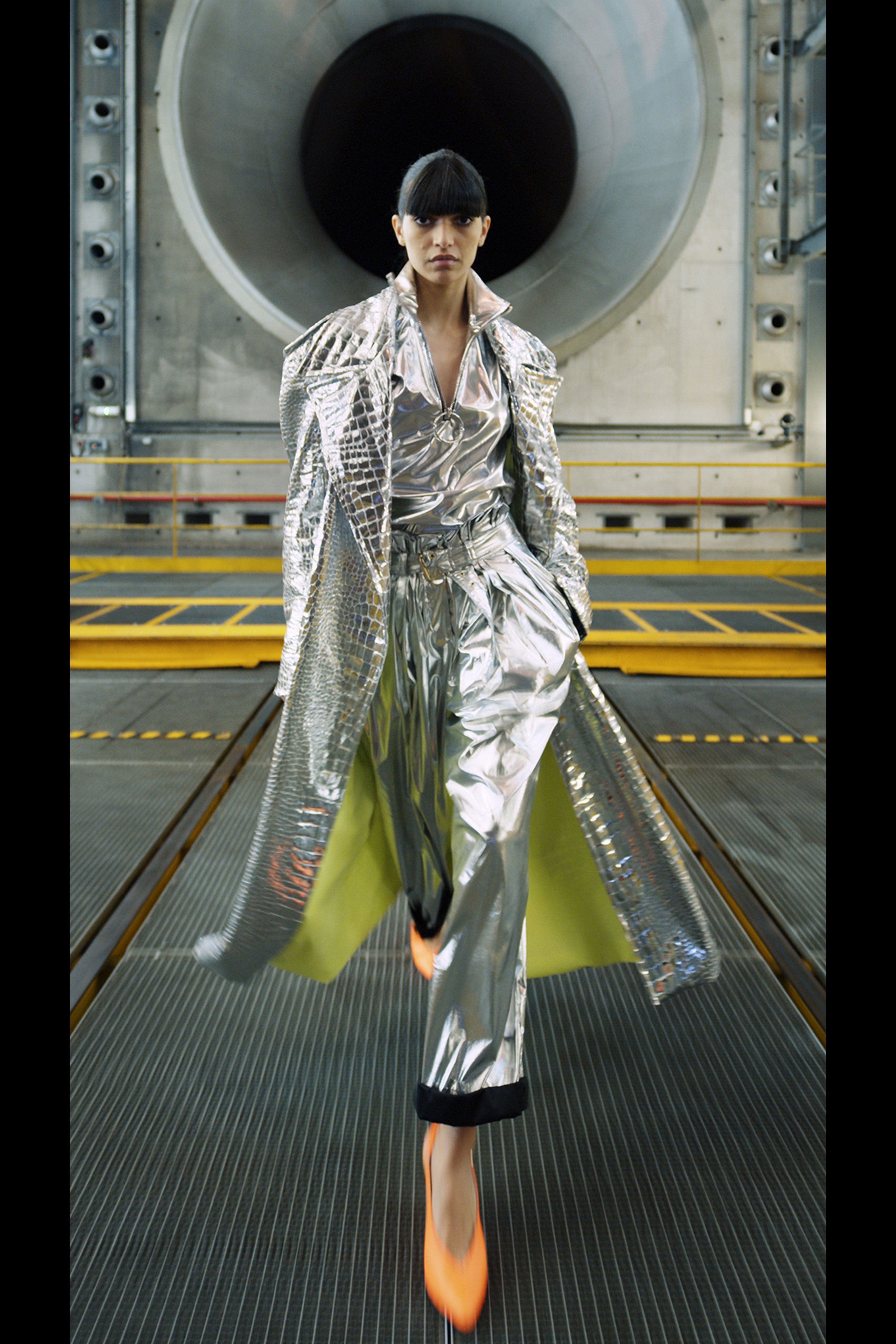 Ощущение праздника, которое сопровождает нас в поездках, передается в золотых брючных костюмах и платьях, ярких водолазках и ироничных аксессуарах. Украшения коллекции выполнены в виде дорожных подушек для сна, а сумки напоминают папки для деловой документации и дипломаты. Кто знает, возможно совсем скоро, надев сверкающие брюки и росокшный авиационный топ, можно будет отправиться в путешествие по орбите на электрическом самолете NASA.