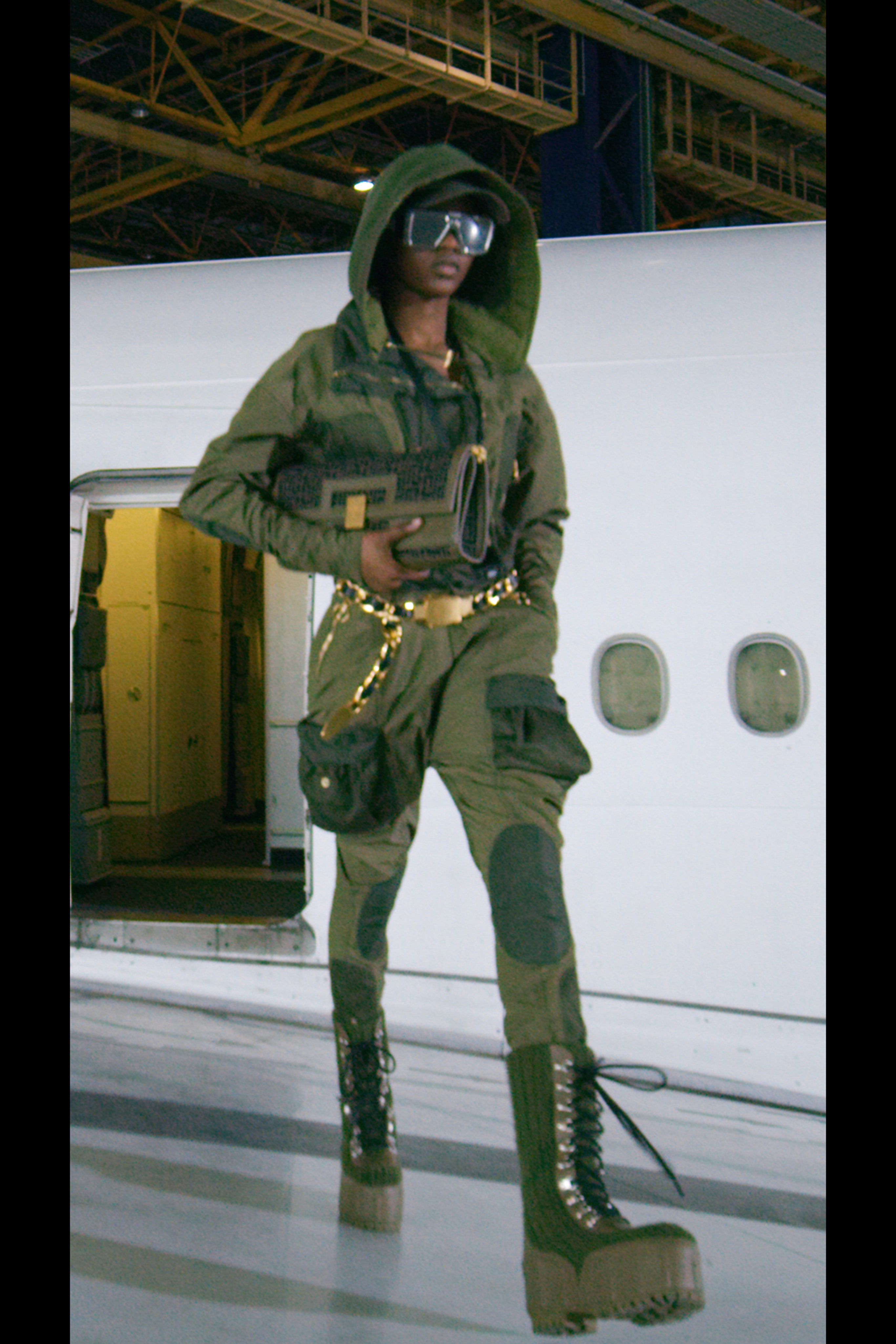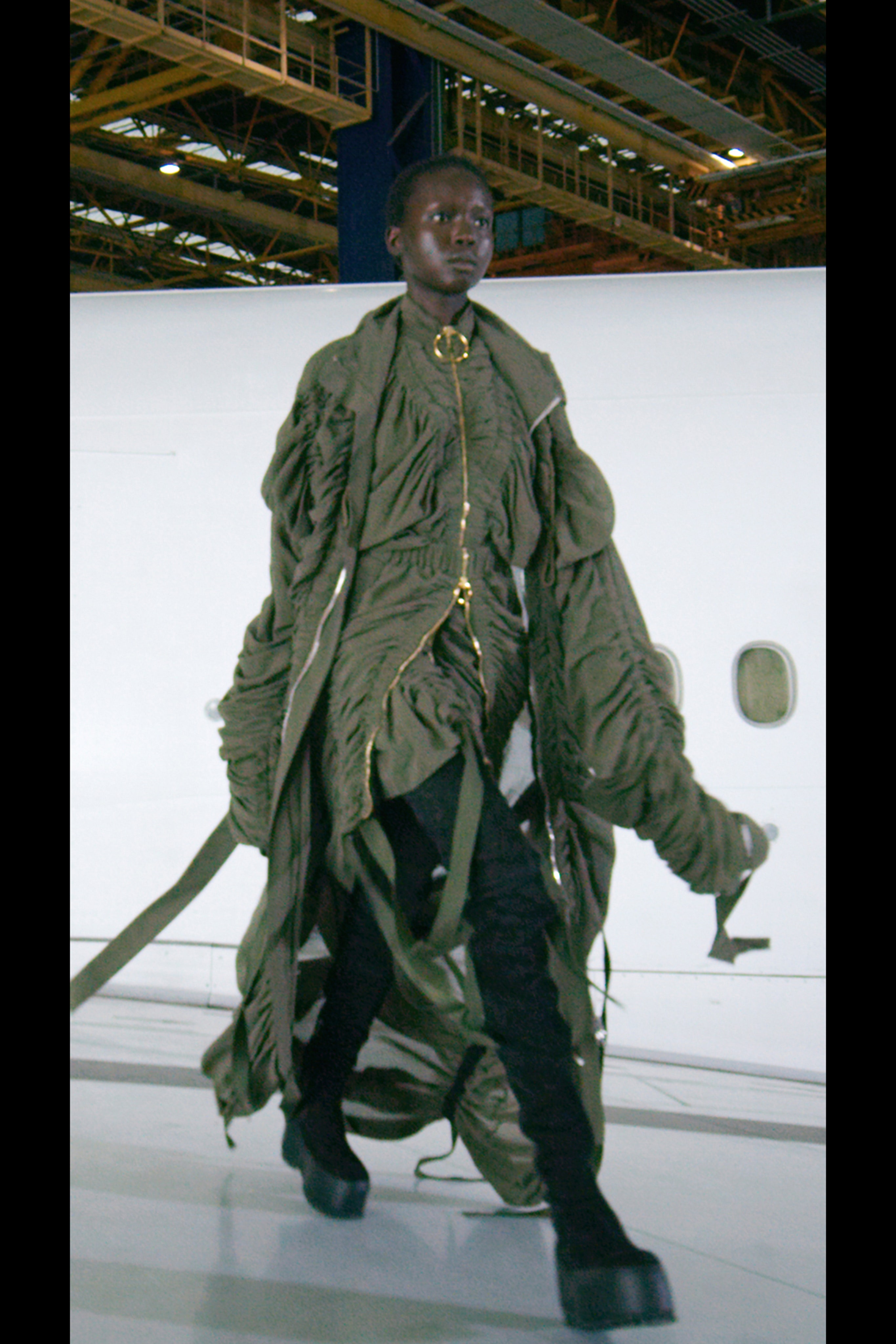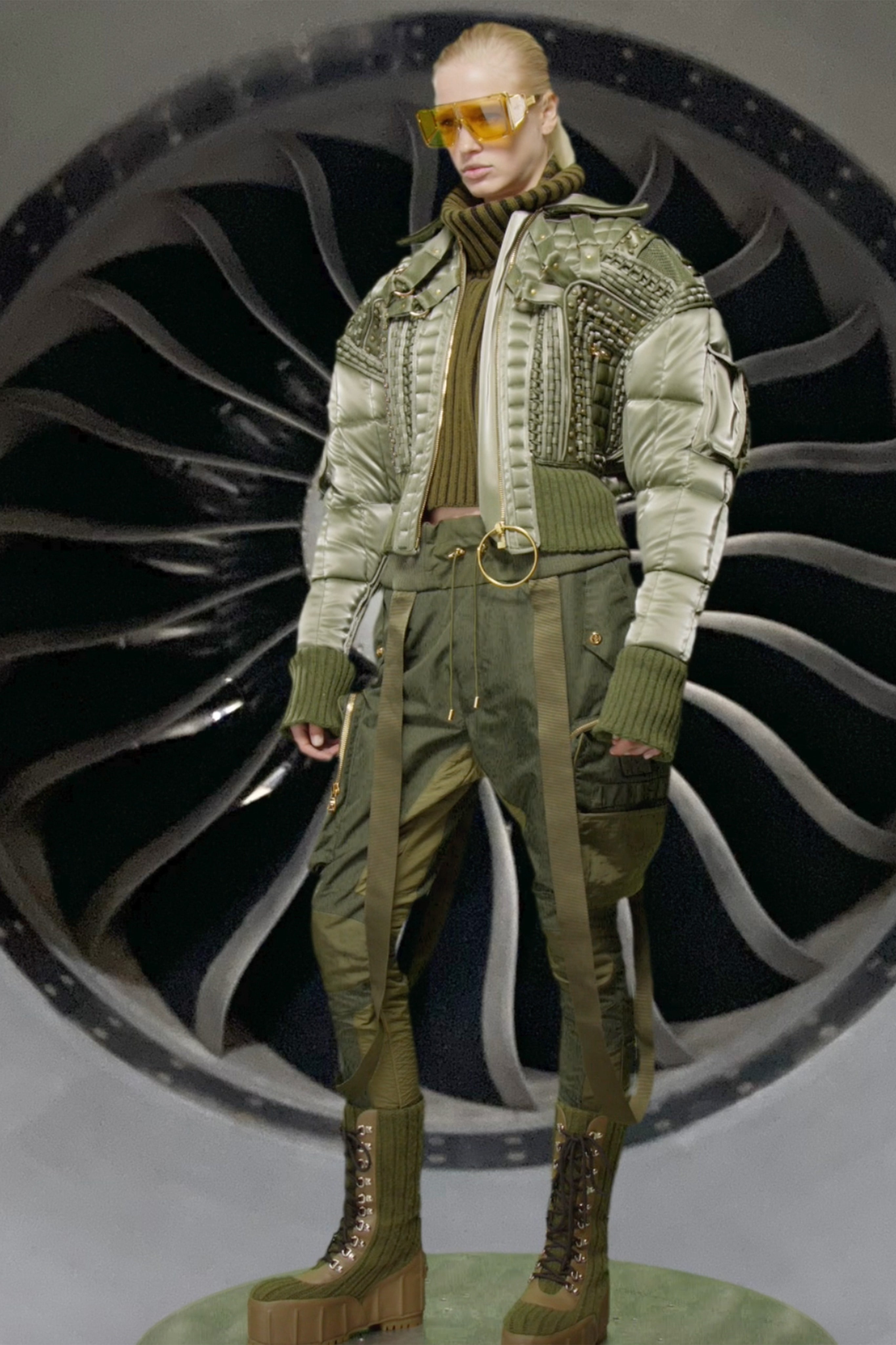 Рустен поручил своему любимому ателье, в котором создаются те самые платья Balmain, оснащенные тяжелыми украшениями, цепями и жемчугом, воссоздать в новом прочтении элементы деловой авиационной одежды и тактического снаряжения. Результатом стали укороченные бомберы и стеганые мини-юбки с множеством завязок, фиксаторов и парашютными кольцами, брюки галифе с накладными карманами и объемные куртки, строгие униформенные бушлаты защитного цвета и пальто с золотыми пуговицами, которые навевают мысли о военно-морских силах и круизных путешествиях.