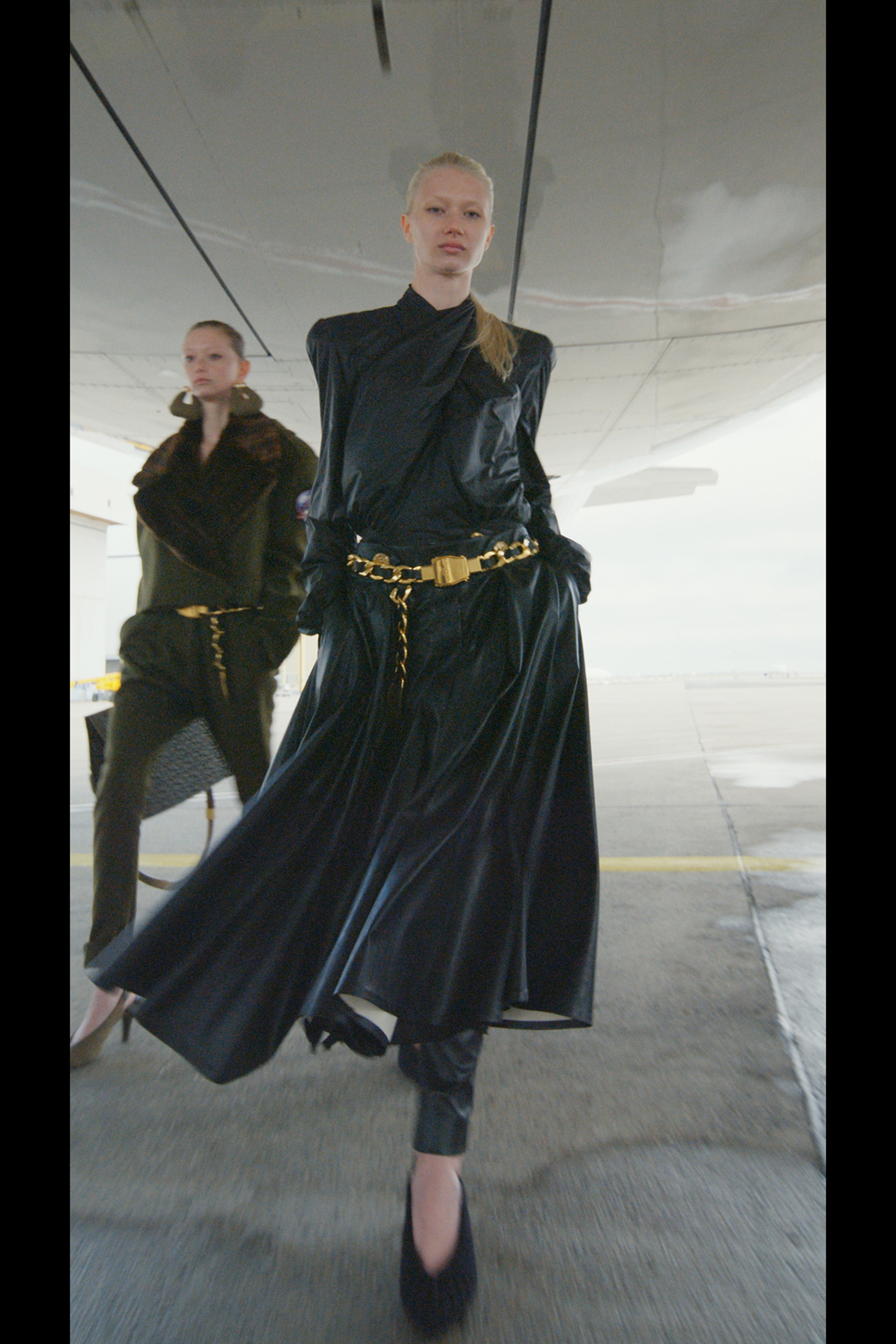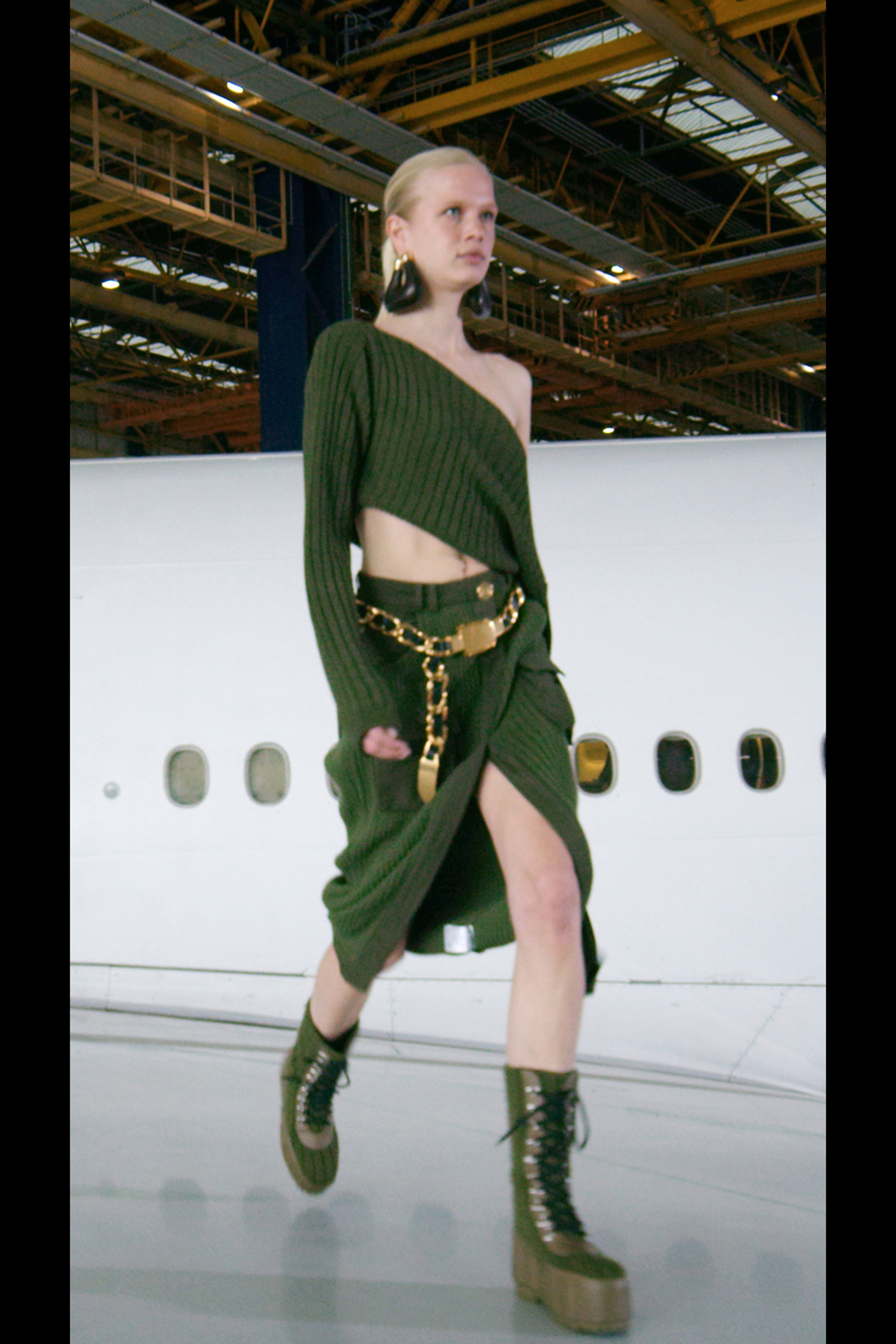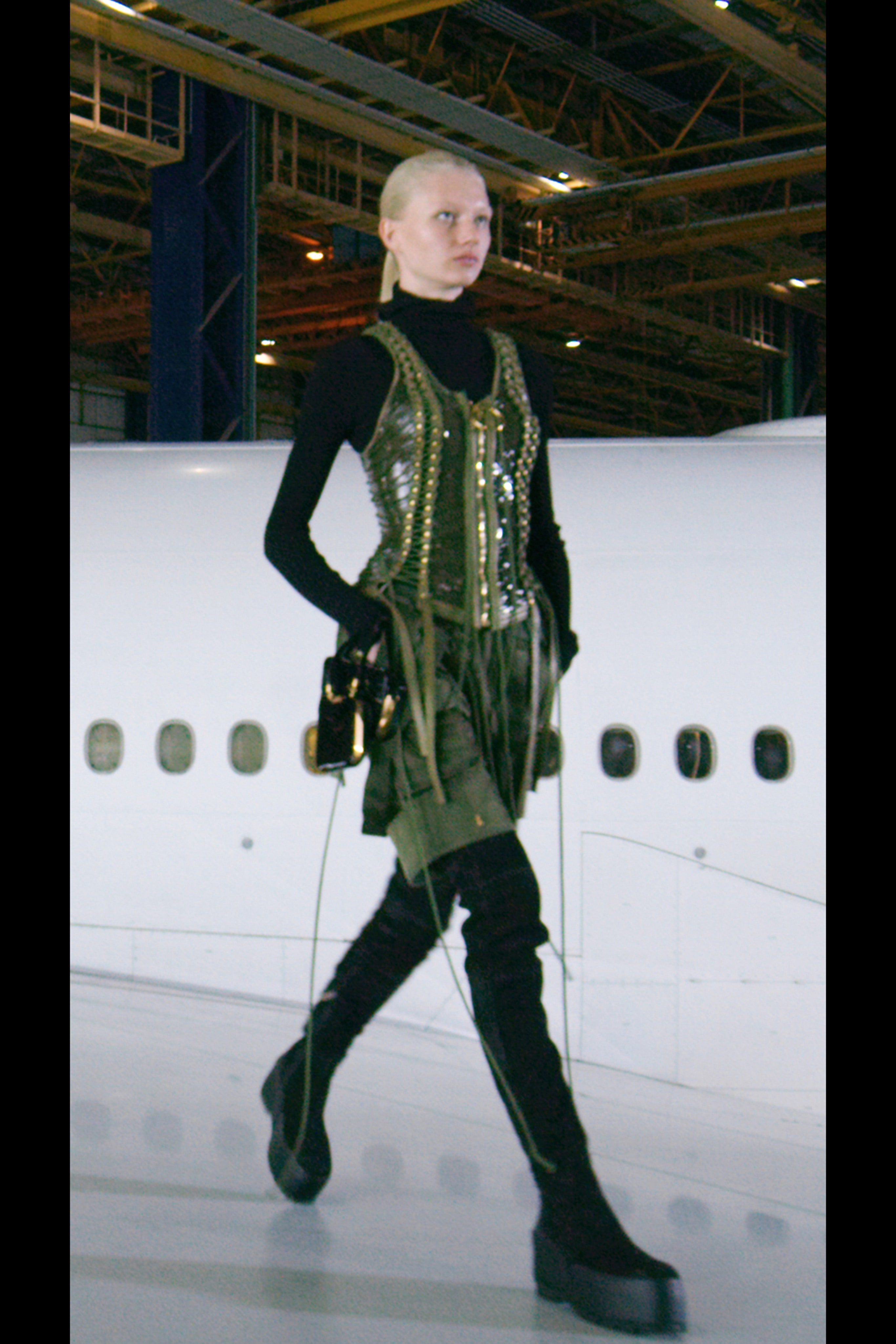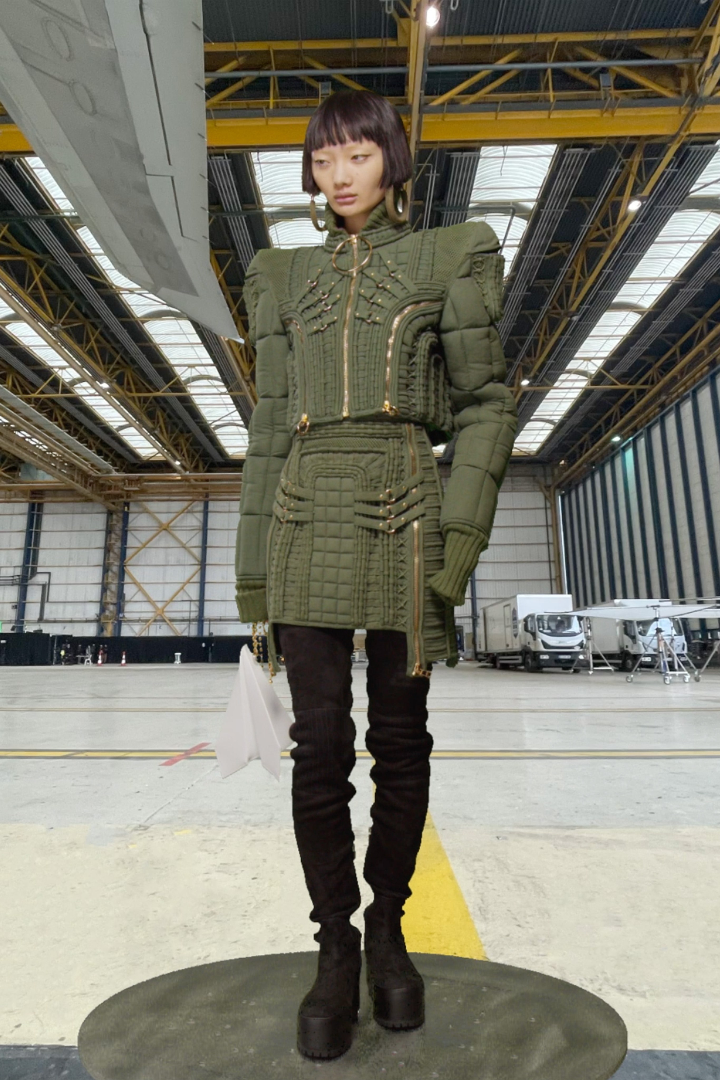 Рустен поручил своему любимому ателье, в котором создаются те самые платья Balmain, оснащенные тяжелыми украшениями, цепями и жемчугом, воссоздать в новом прочтении элементы деловой авиационной одежды и тактического снаряжения. Результатом стали укороченные бомберы и стеганые мини-юбки с множеством завязок, фиксаторов и парашютными кольцами, брюки галифе с накладными карманами и объемные куртки, строгие униформенные бушлаты защитного цвета и пальто с золотыми пуговицами, которые навевают мысли о военно-морских силах и круизных путешествиях.