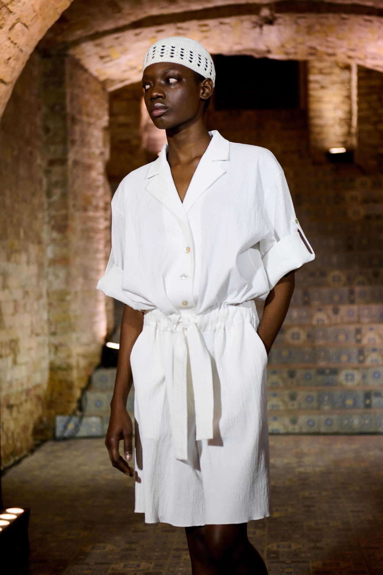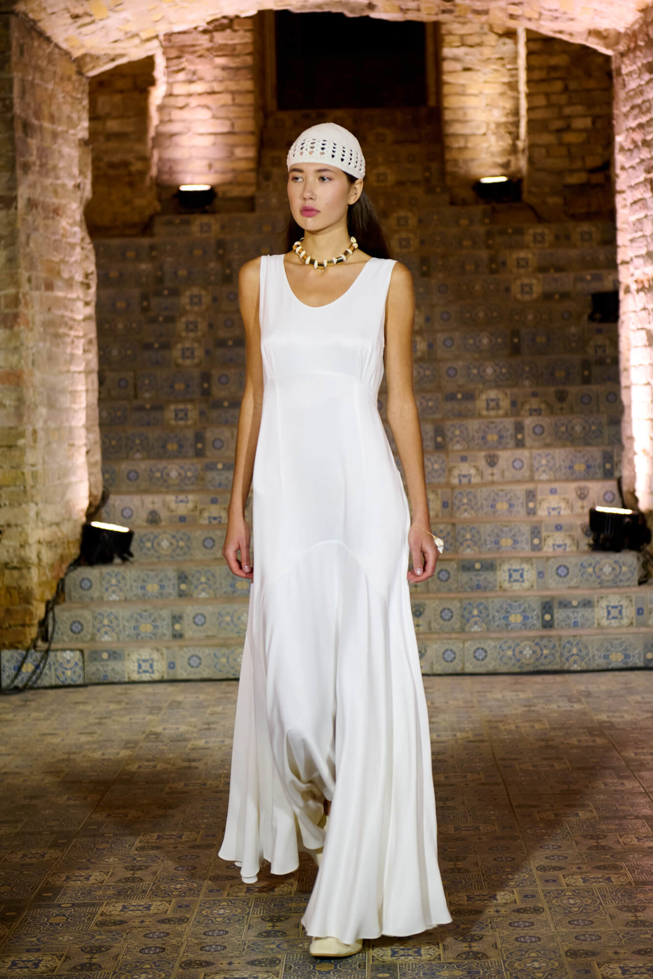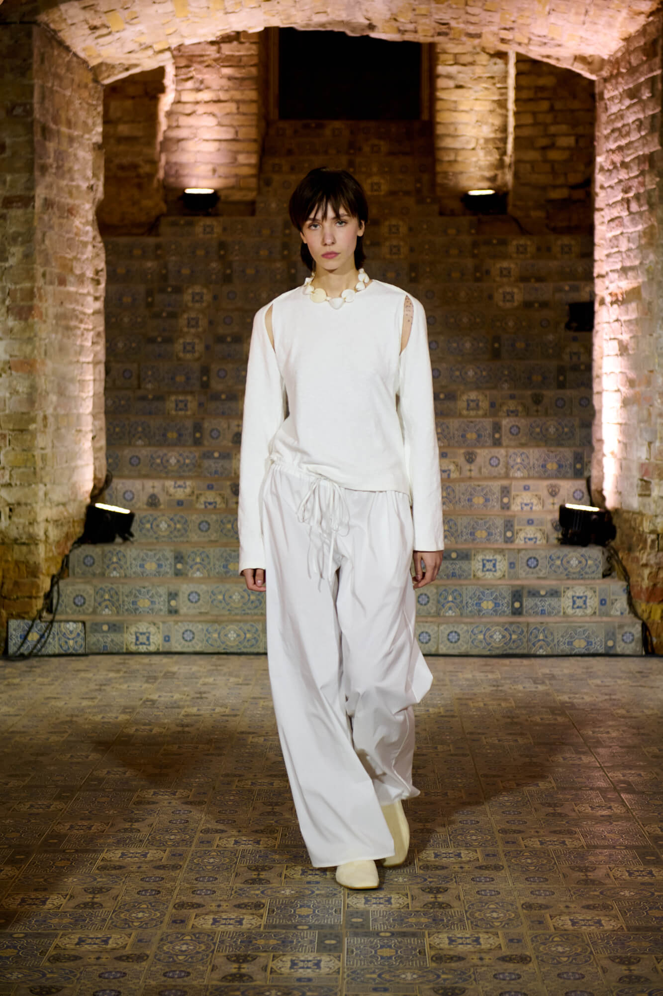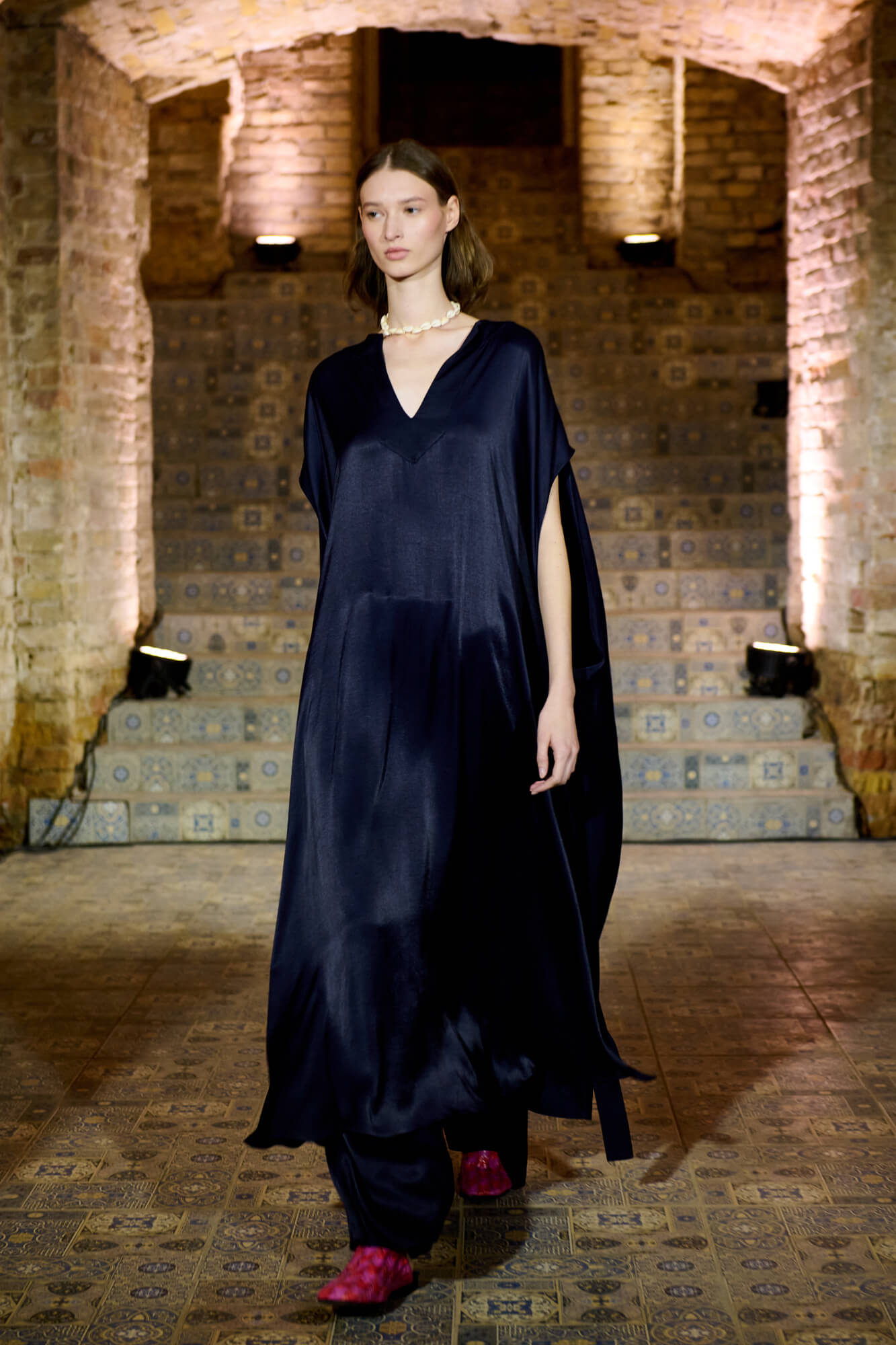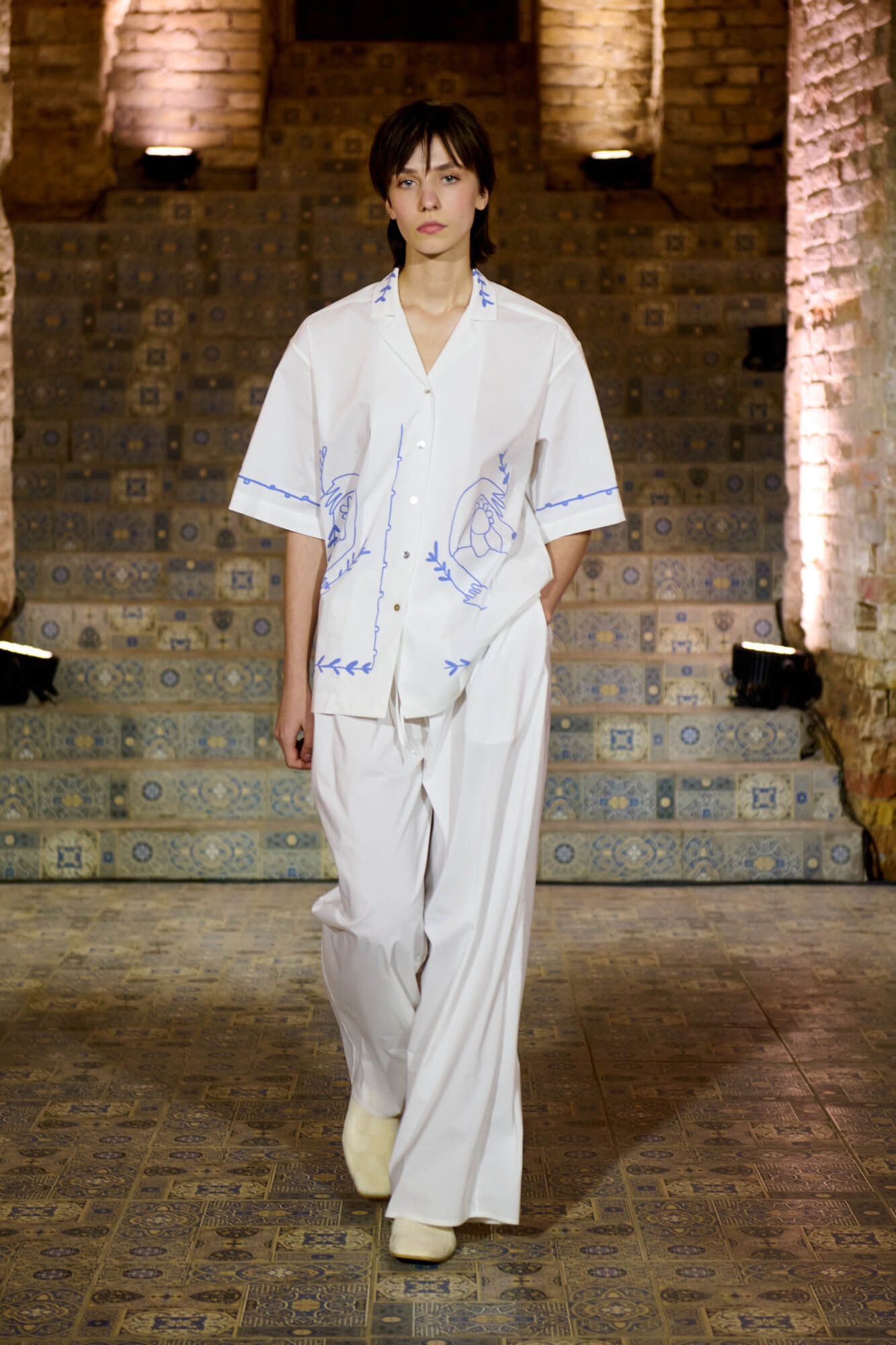 Образ с миниатюрной вязаной шапочкой и принтованной рубашкой отсылает к артистическим истокам африканского джаза, а создавая обувь, дизайнер переосмыслила традиционные деревенские лапти — так в коллекции появились плетенные из кожи мюли, шлепанцы и балетки. Натуральные морские ракушки стали основным материалом для украшений Bobkova: брошей, подвесок, сережек и браслетов с позолотой и камнями Swarovski.