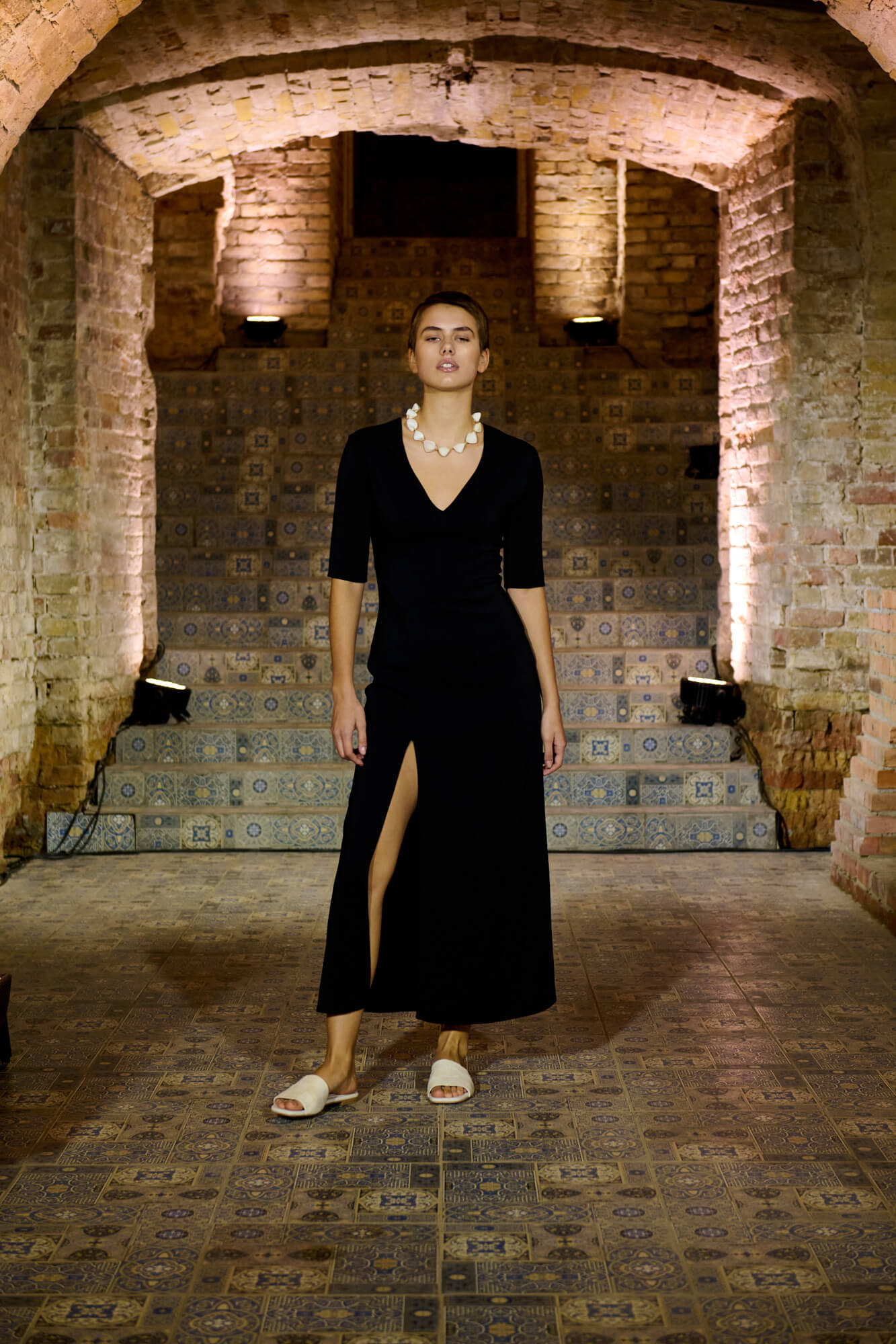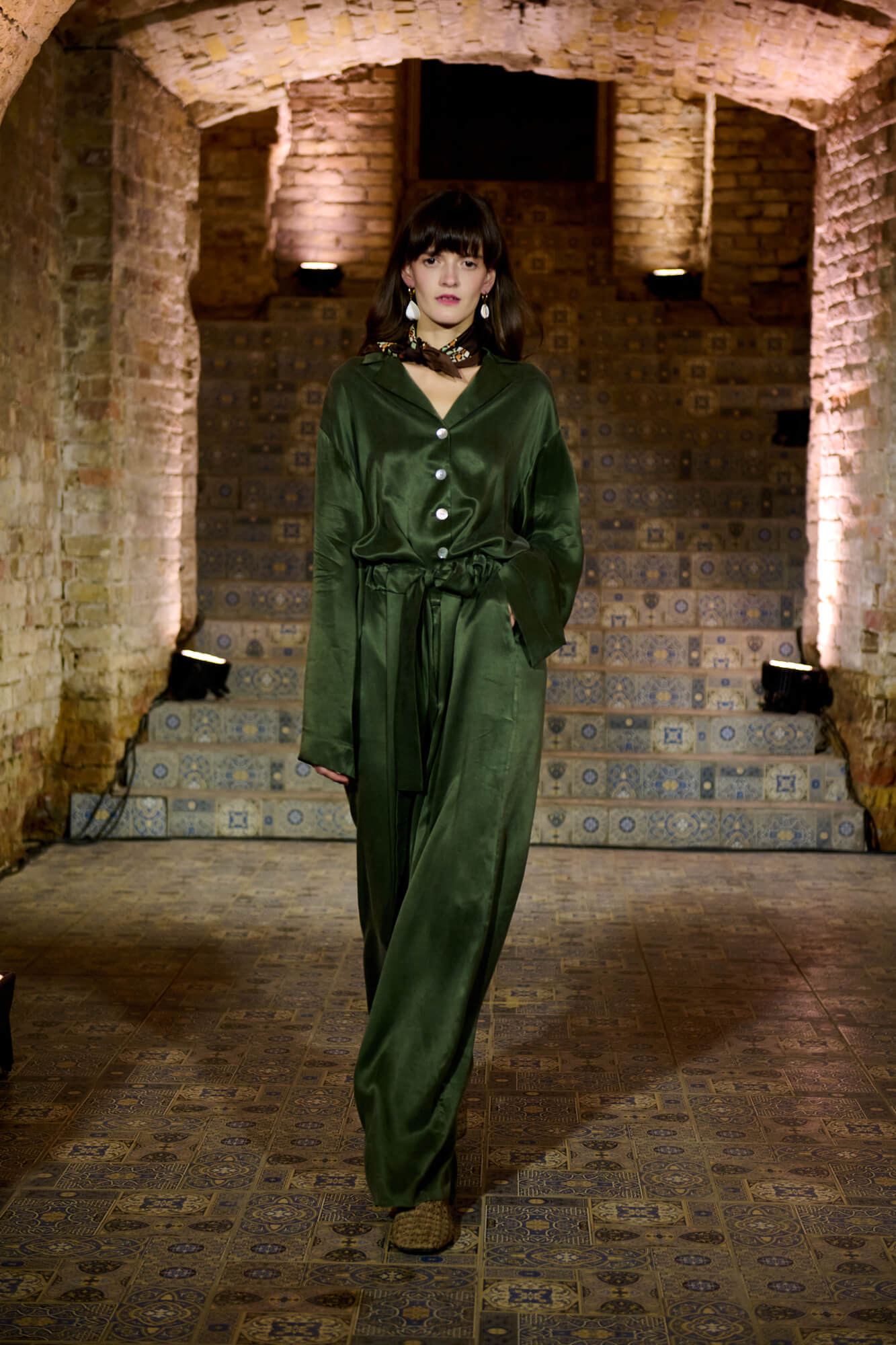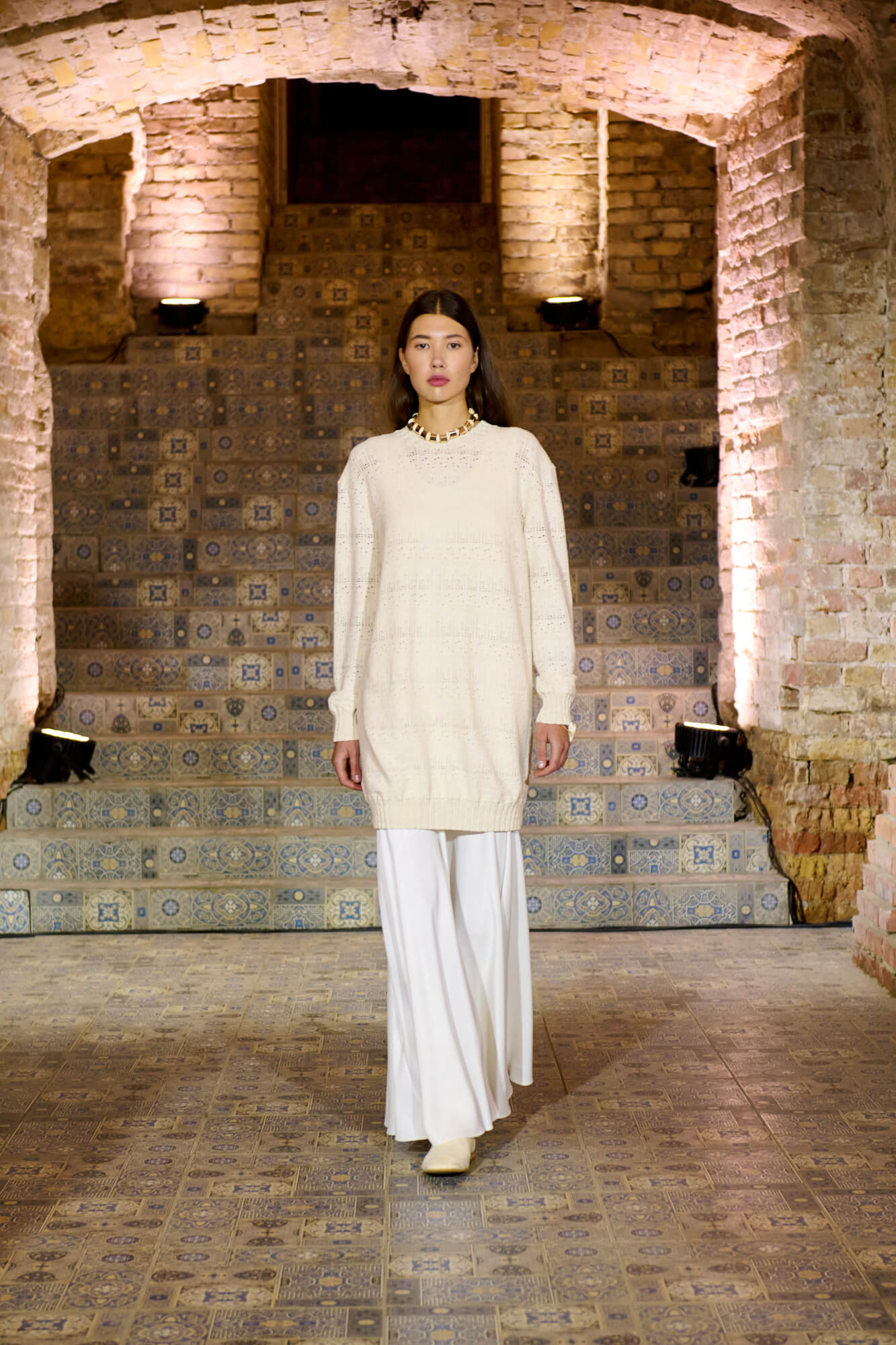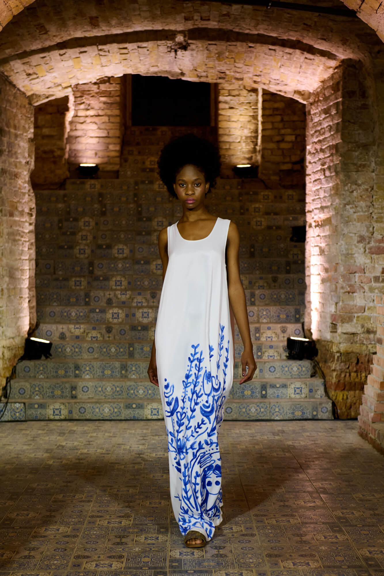 Образ с миниатюрной вязаной шапочкой и принтованной рубашкой отсылает к артистическим истокам африканского джаза, а создавая обувь, дизайнер переосмыслила традиционные деревенские лапти — так в коллекции появились плетенные из кожи мюли, шлепанцы и балетки. Натуральные морские ракушки стали основным материалом для украшений Bobkova: брошей, подвесок, сережек и браслетов с позолотой и камнями Swarovski.