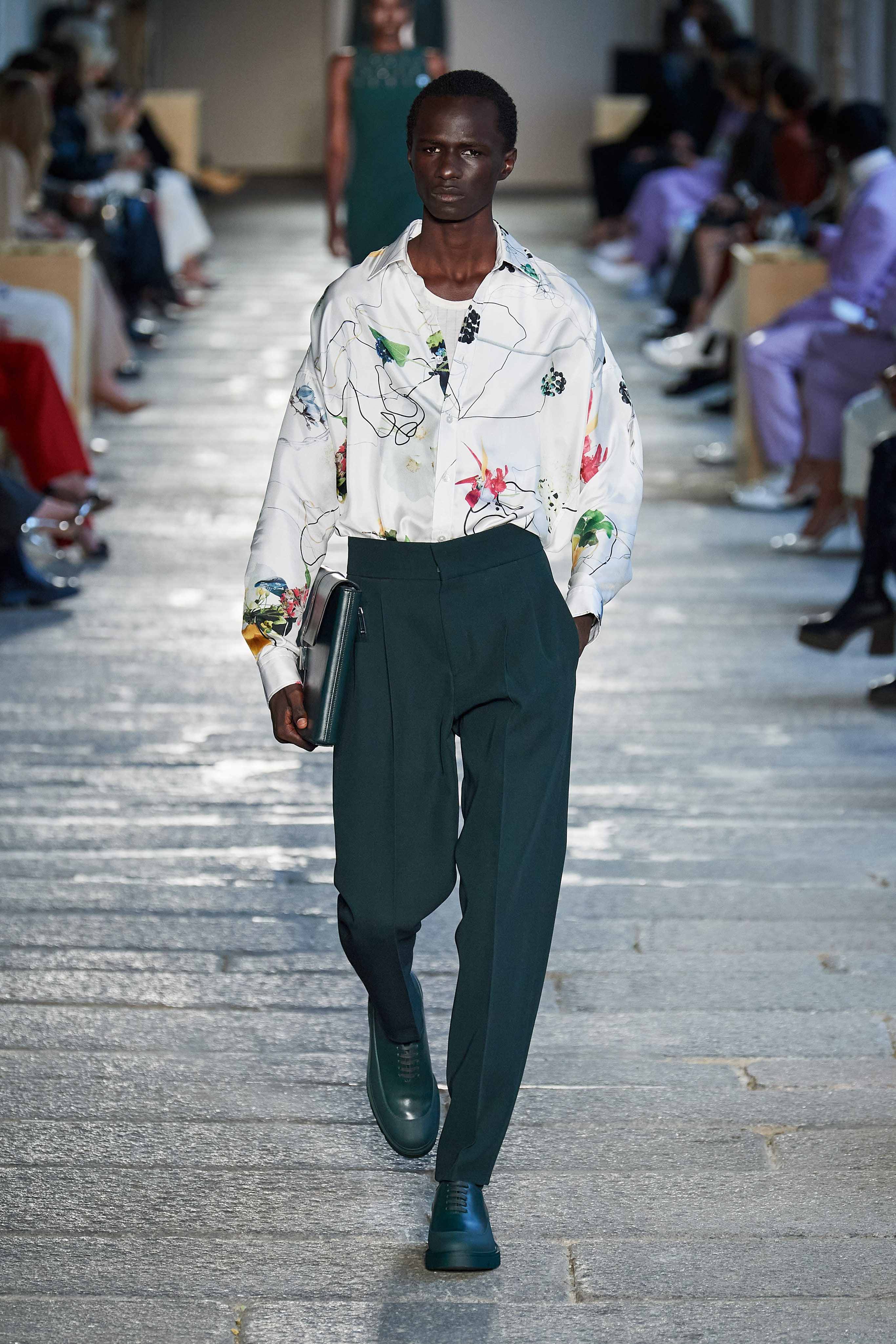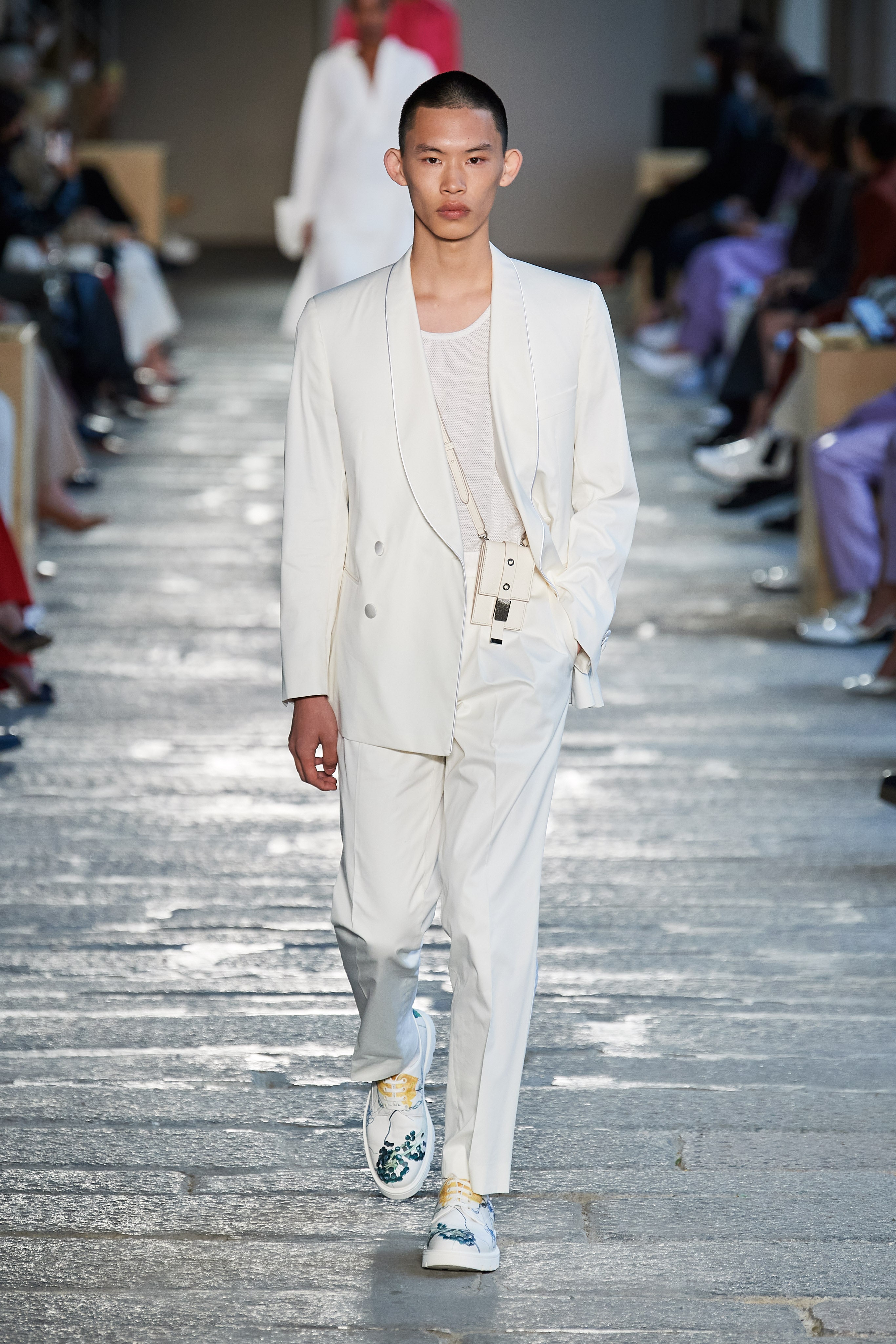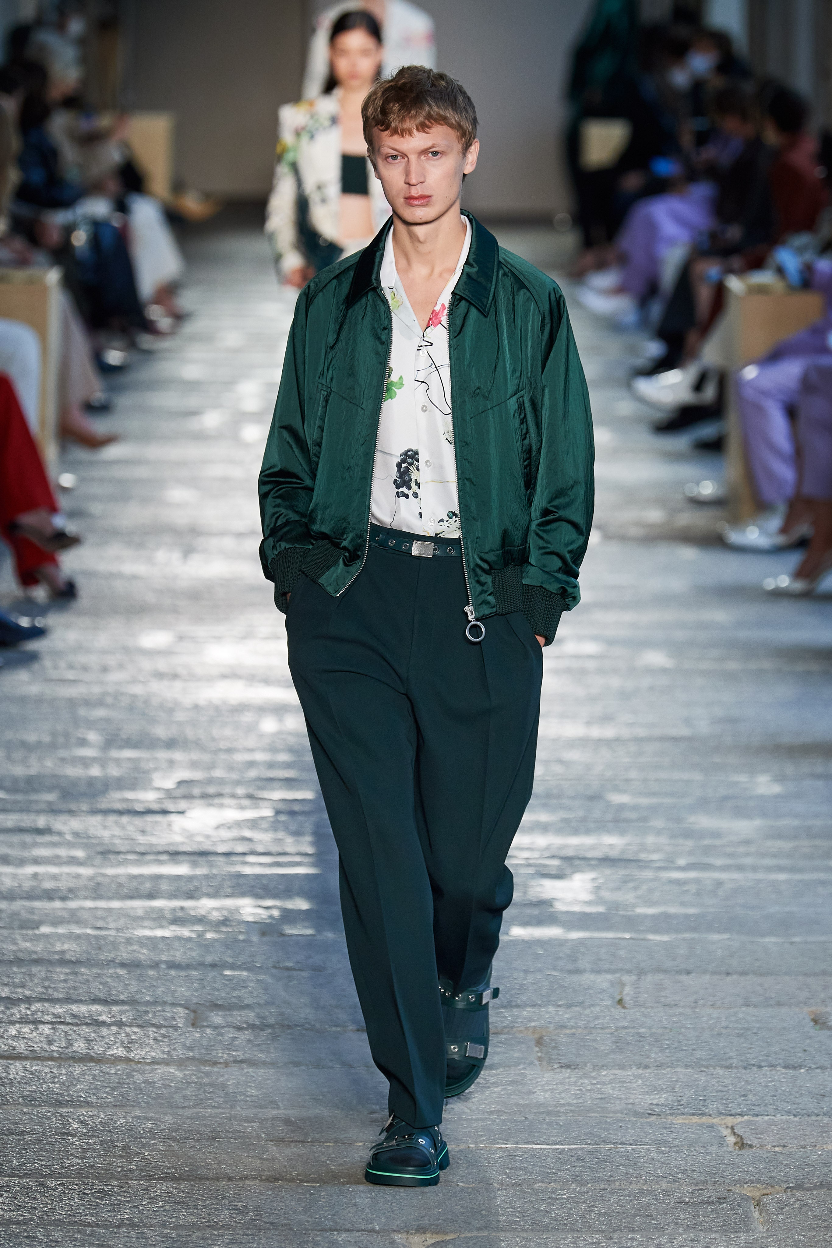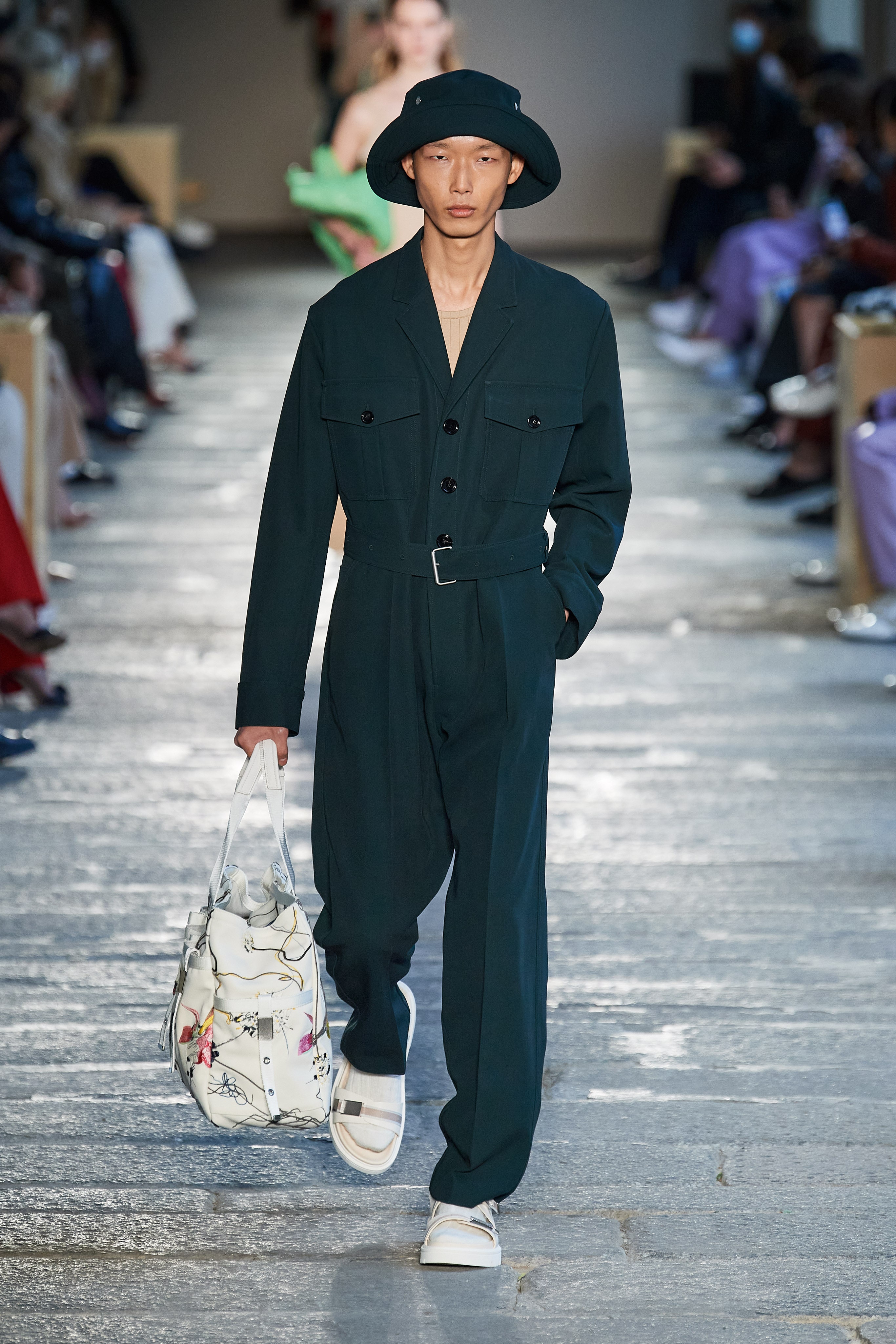 В первой части показа одежда на моделях была выдержана в оттенках ментоловых леденцов и небесной глади. Вторая часть раскрыла коллекцию с самой "весенней" стороны: брюки, бомберы и пальто были покрыты флористическим принтом, а в костюмах-двойках, платьях с прорезями на талии и мужских шортах с куртками преобладали травянистые и мятные оттенки.