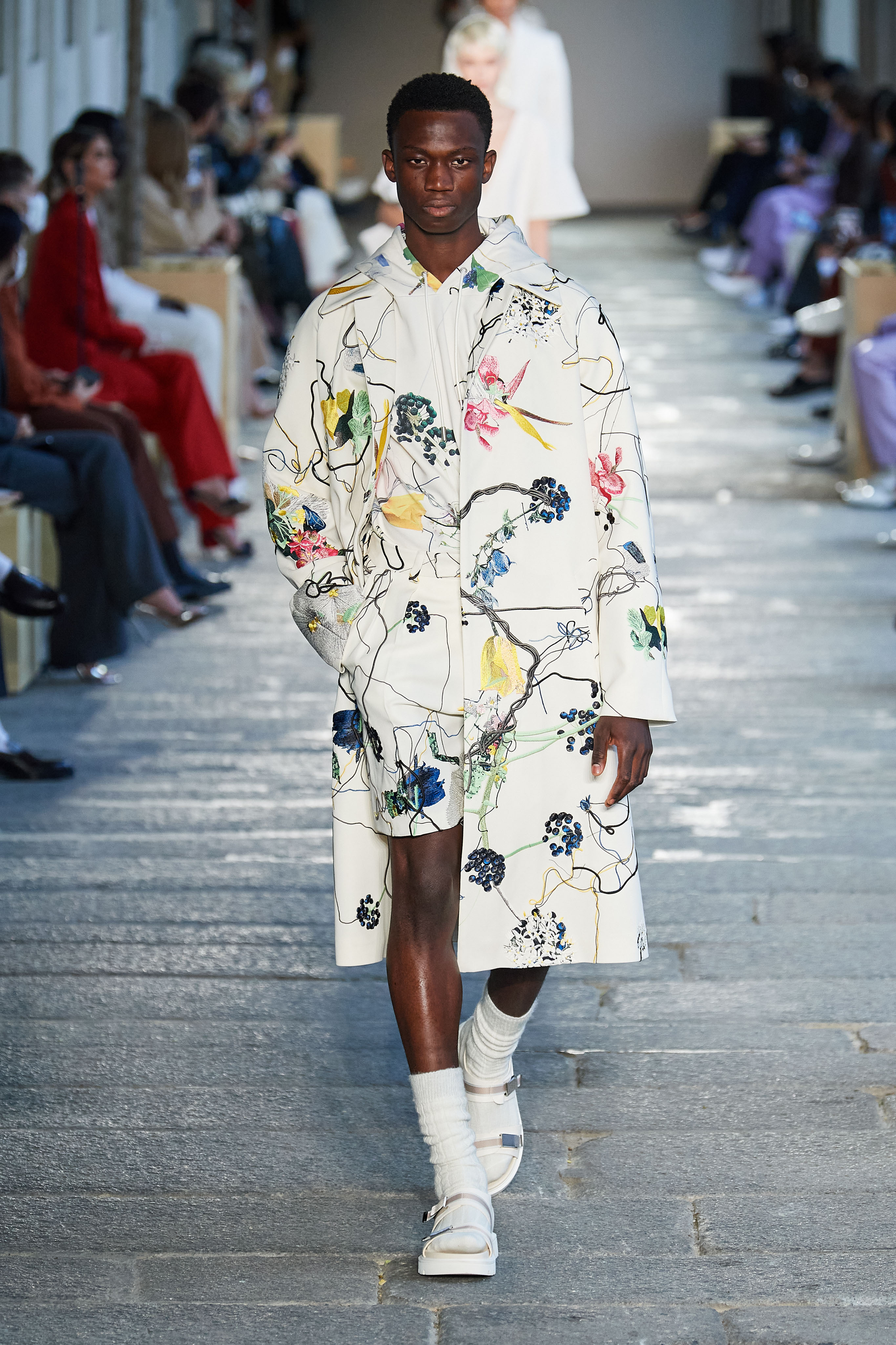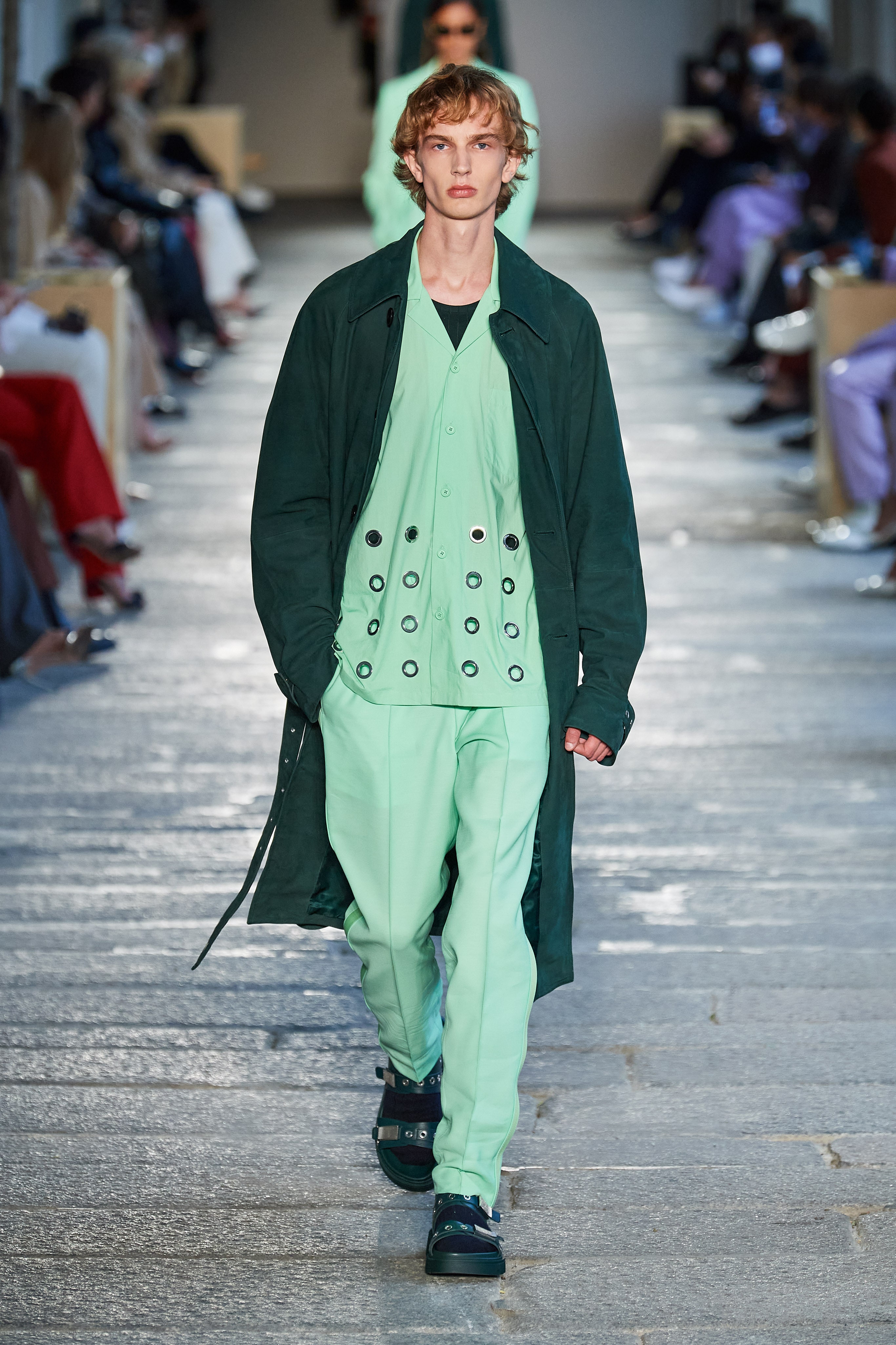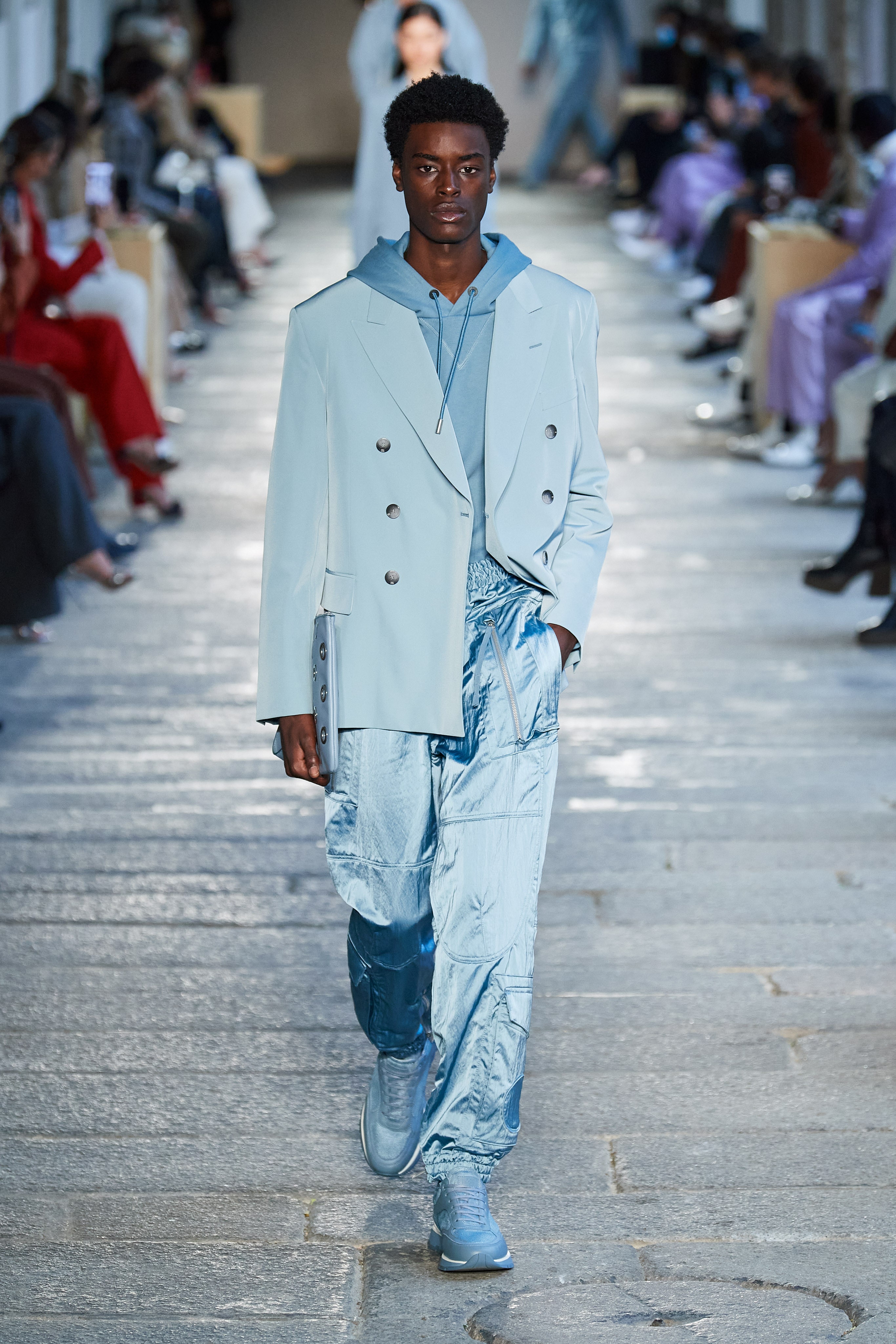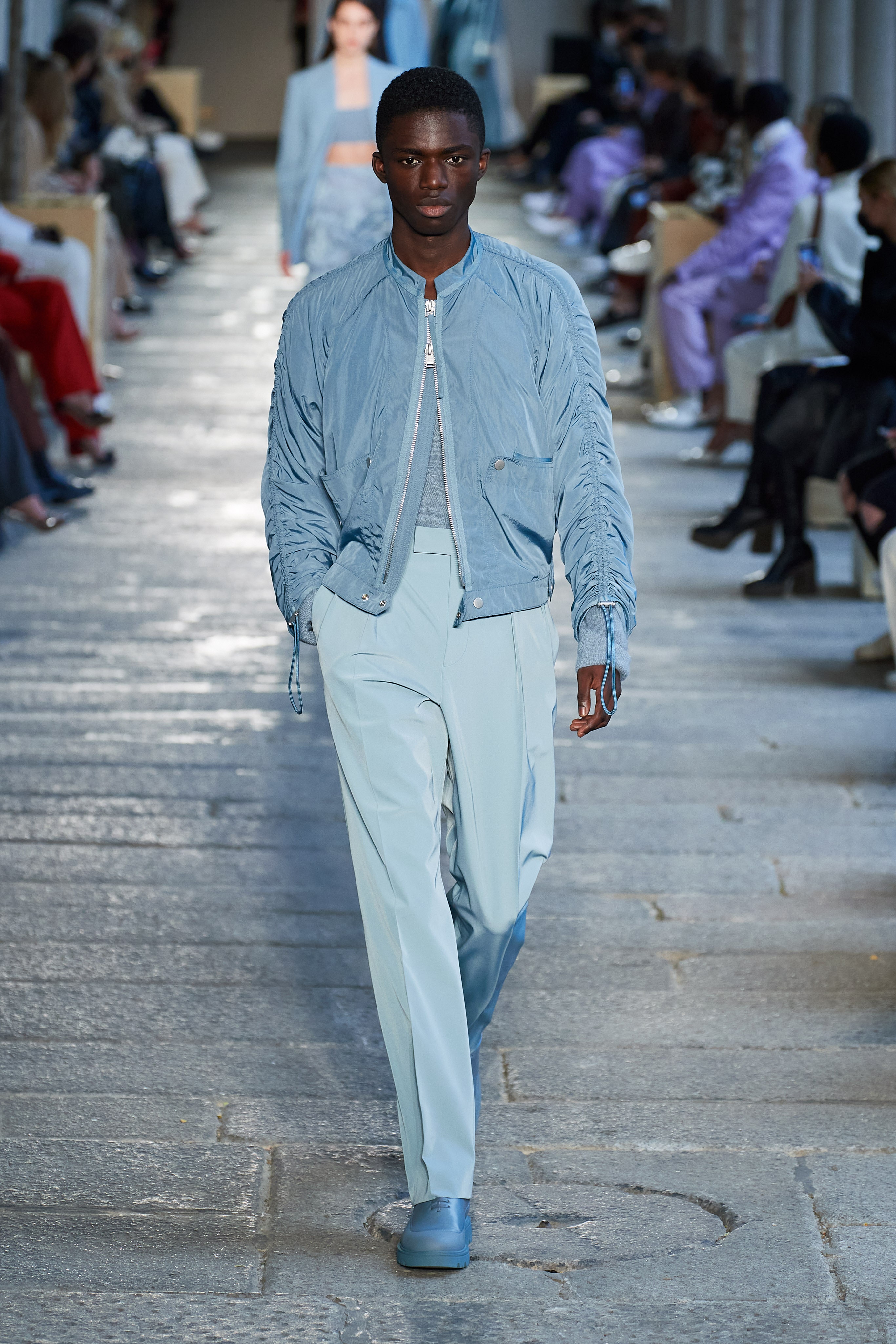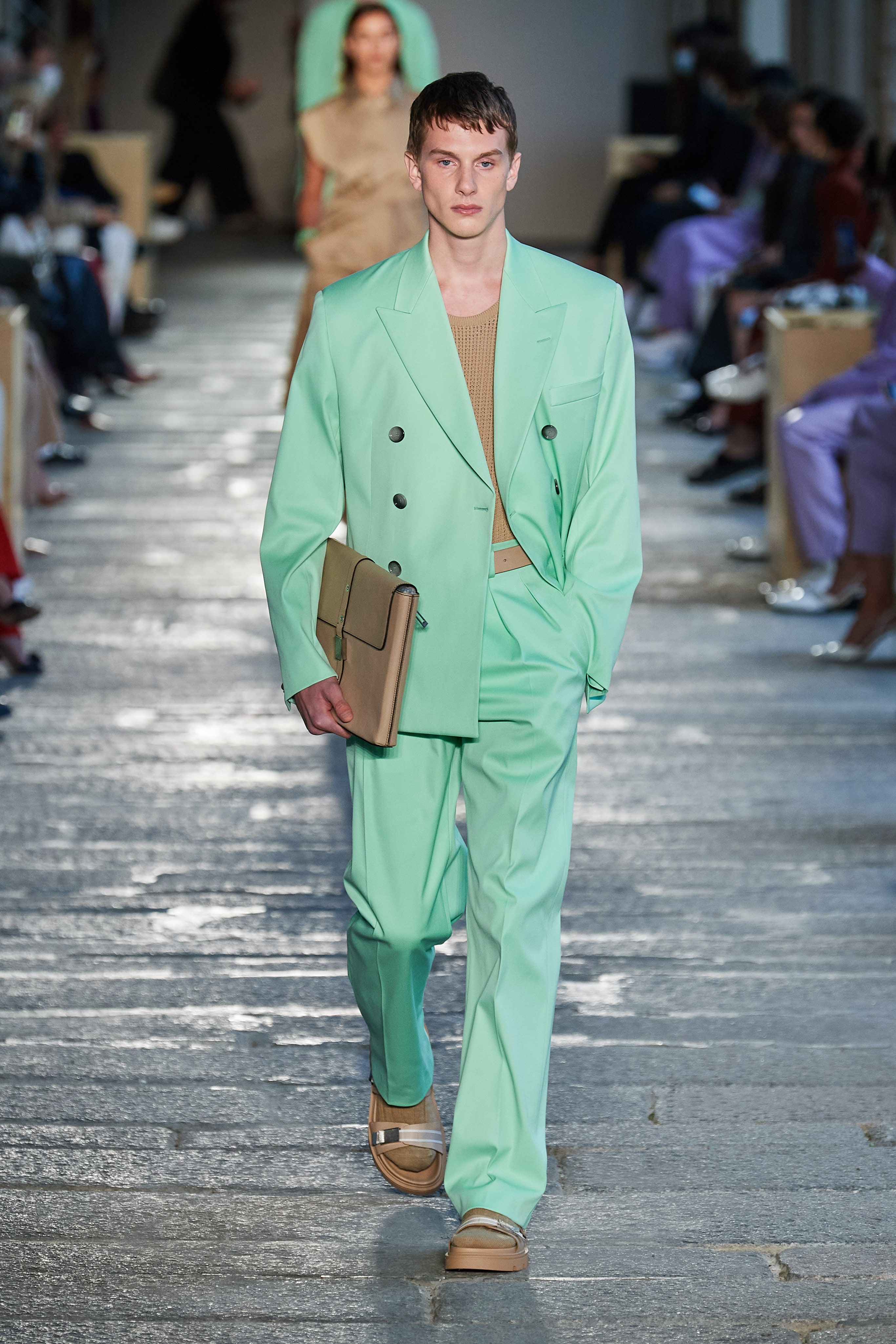 В первой части показа одежда на моделях была выдержана в оттенках ментоловых леденцов и небесной глади. Вторая часть раскрыла коллекцию с самой "весенней" стороны: брюки, бомберы и пальто были покрыты флористическим принтом, а в костюмах-двойках, платьях с прорезями на талии и мужских шортах с куртками преобладали травянистые и мятные оттенки.
