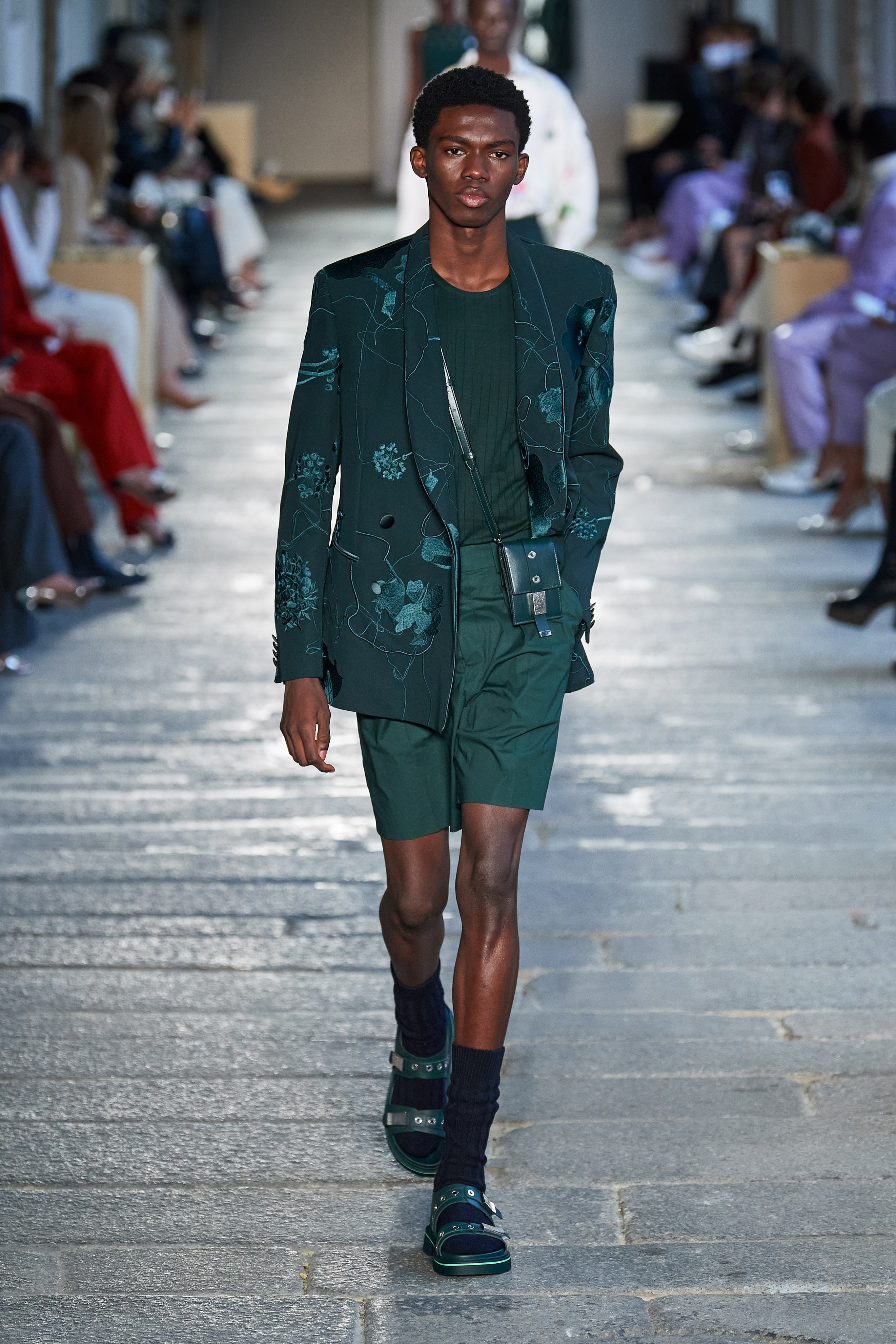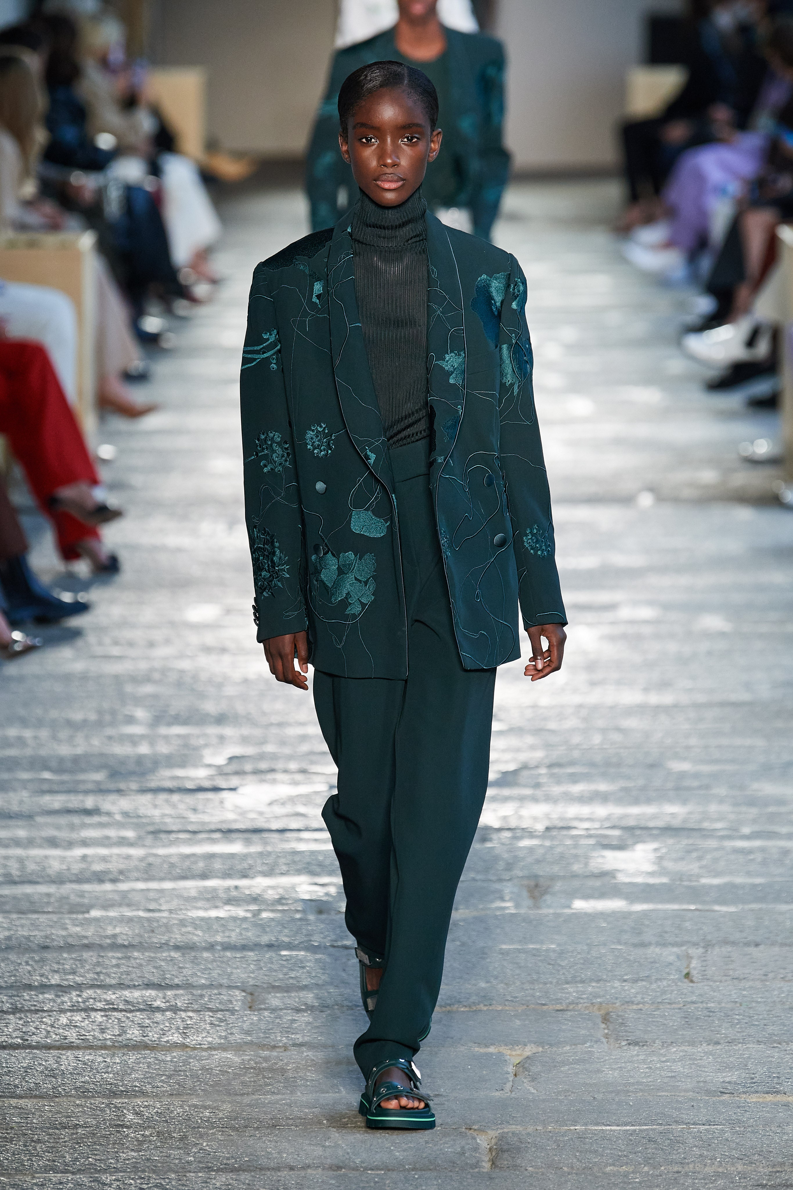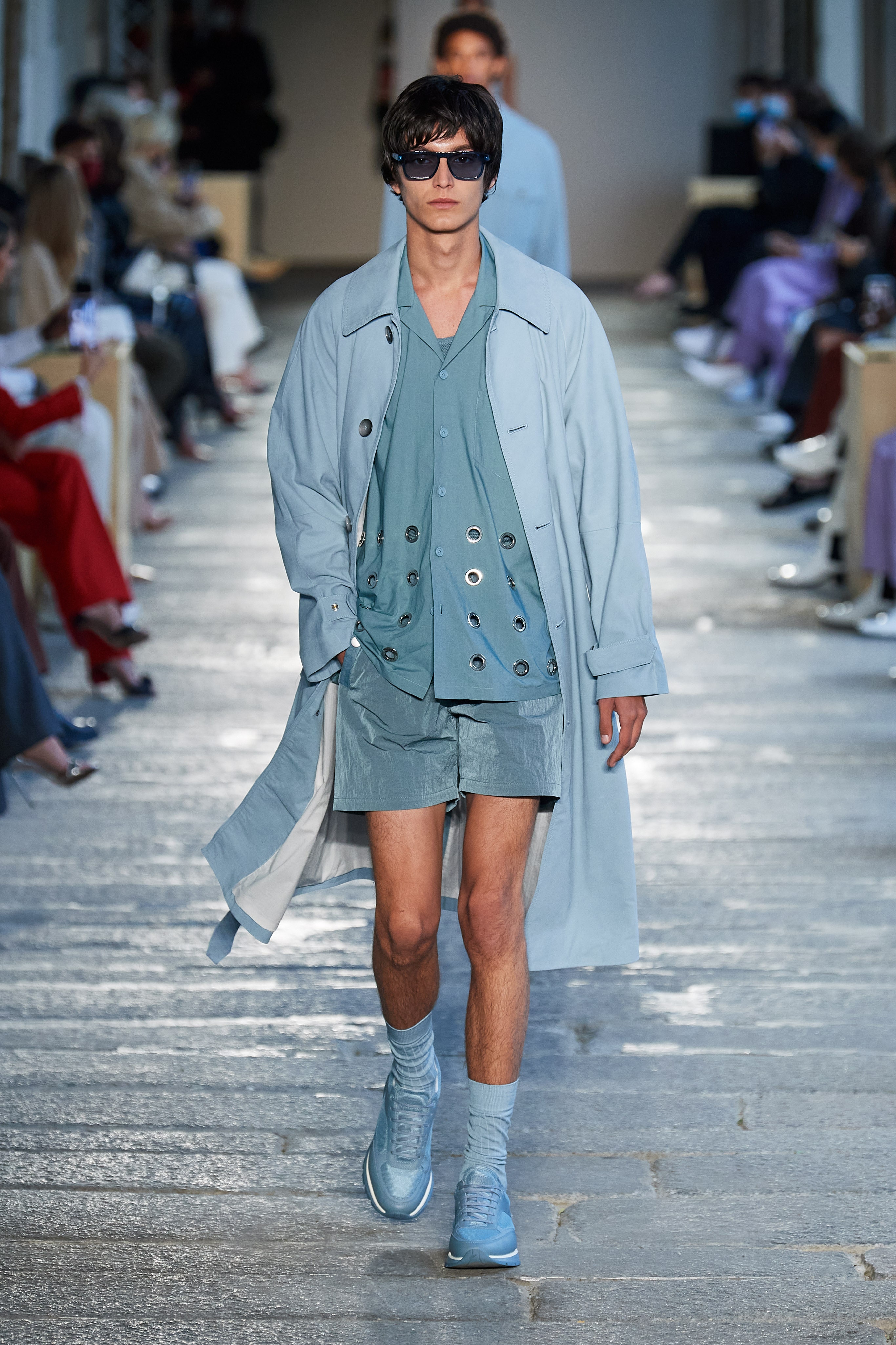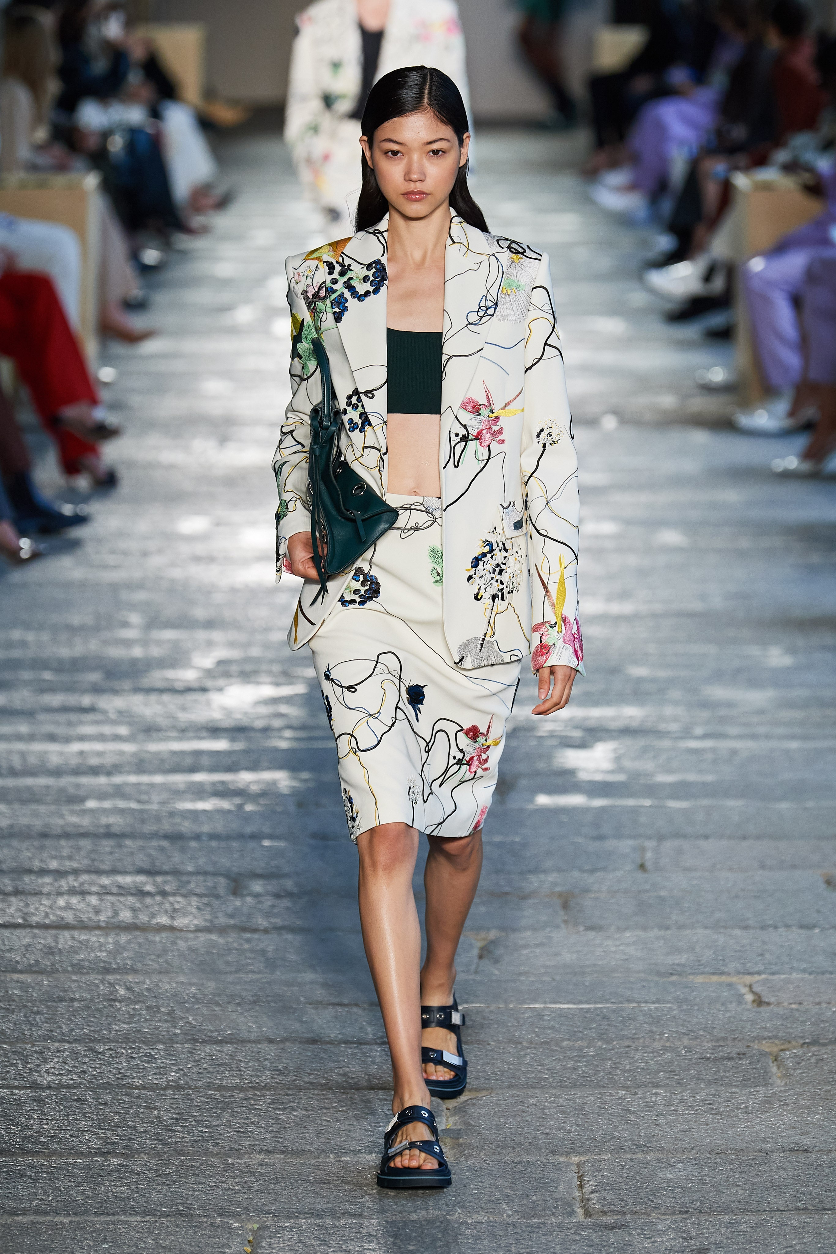 В первой части показа одежда на моделях была выдержана в оттенках ментоловых леденцов и небесной глади. Вторая часть раскрыла коллекцию с самой "весенней" стороны: брюки, бомберы и пальто были покрыты флористическим принтом, а в костюмах-двойках, платьях с прорезями на талии и мужских шортах с куртками преобладали травянистые и мятные оттенки.