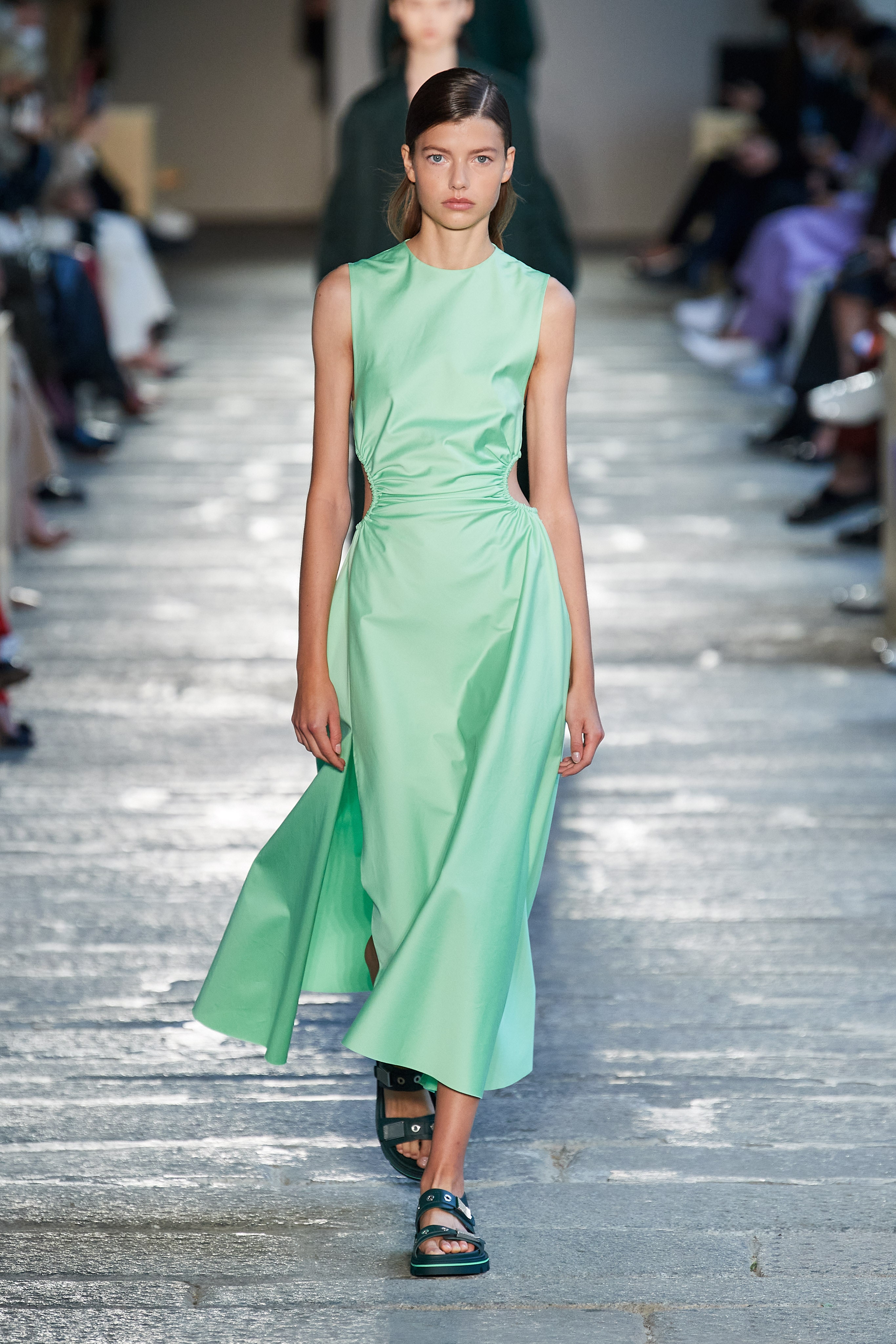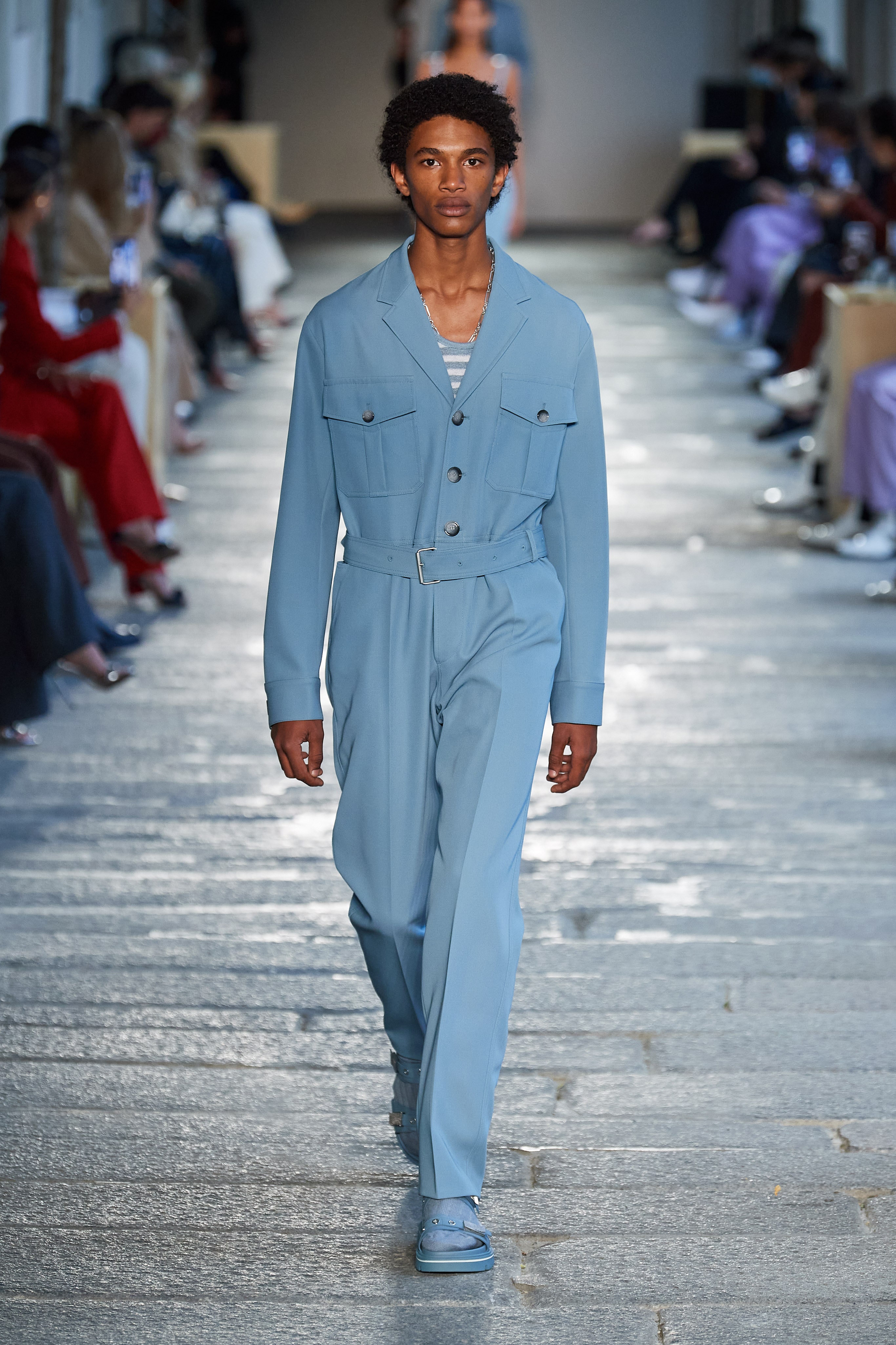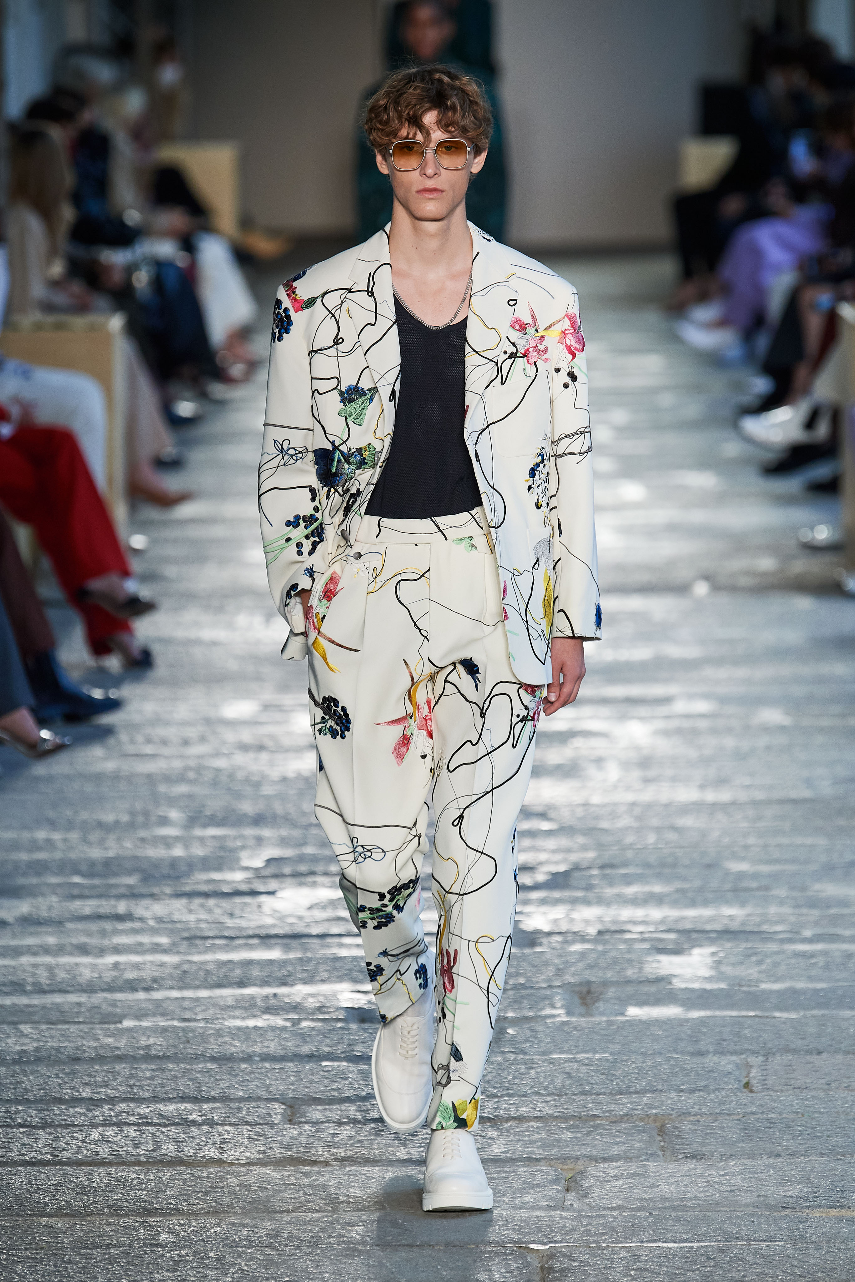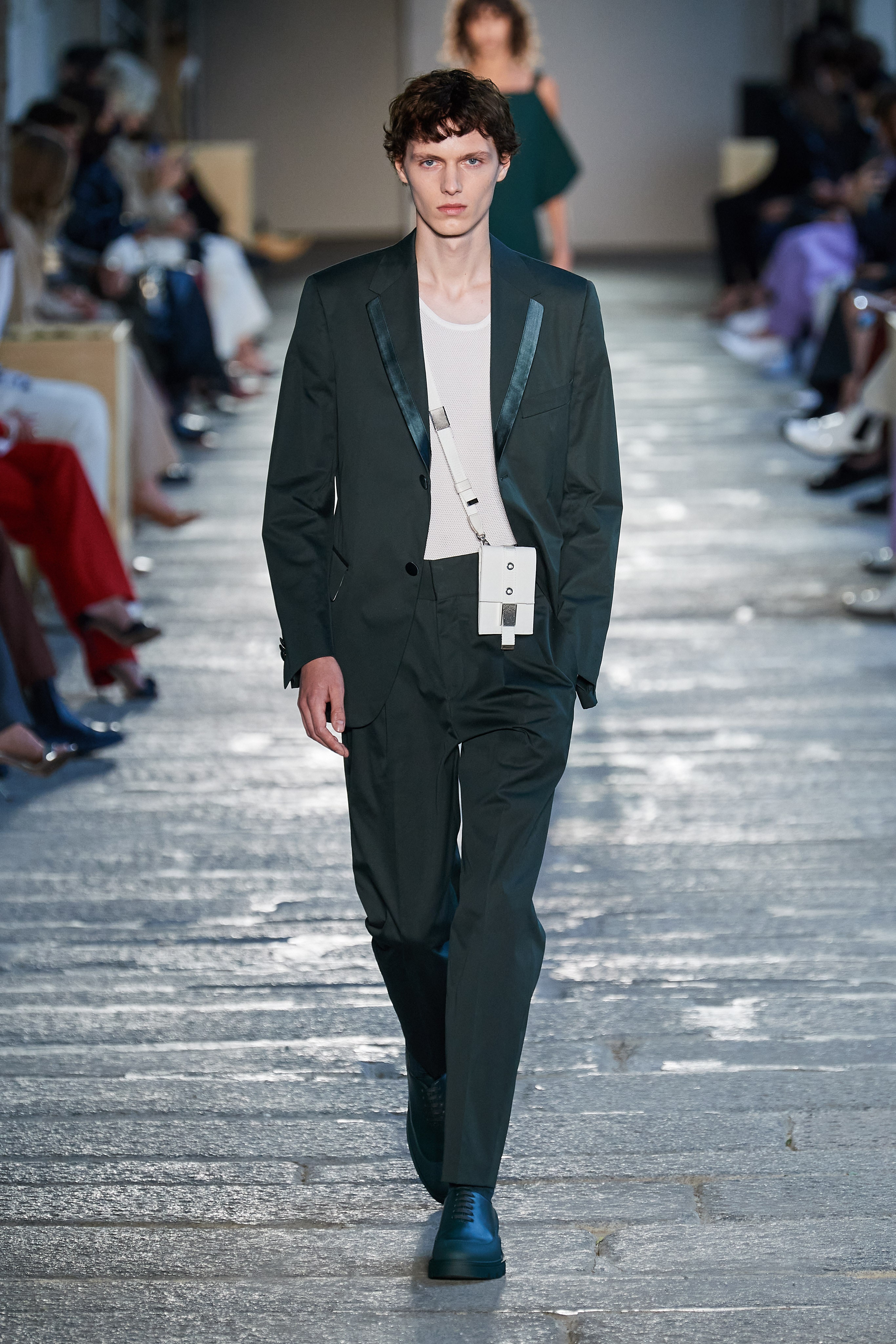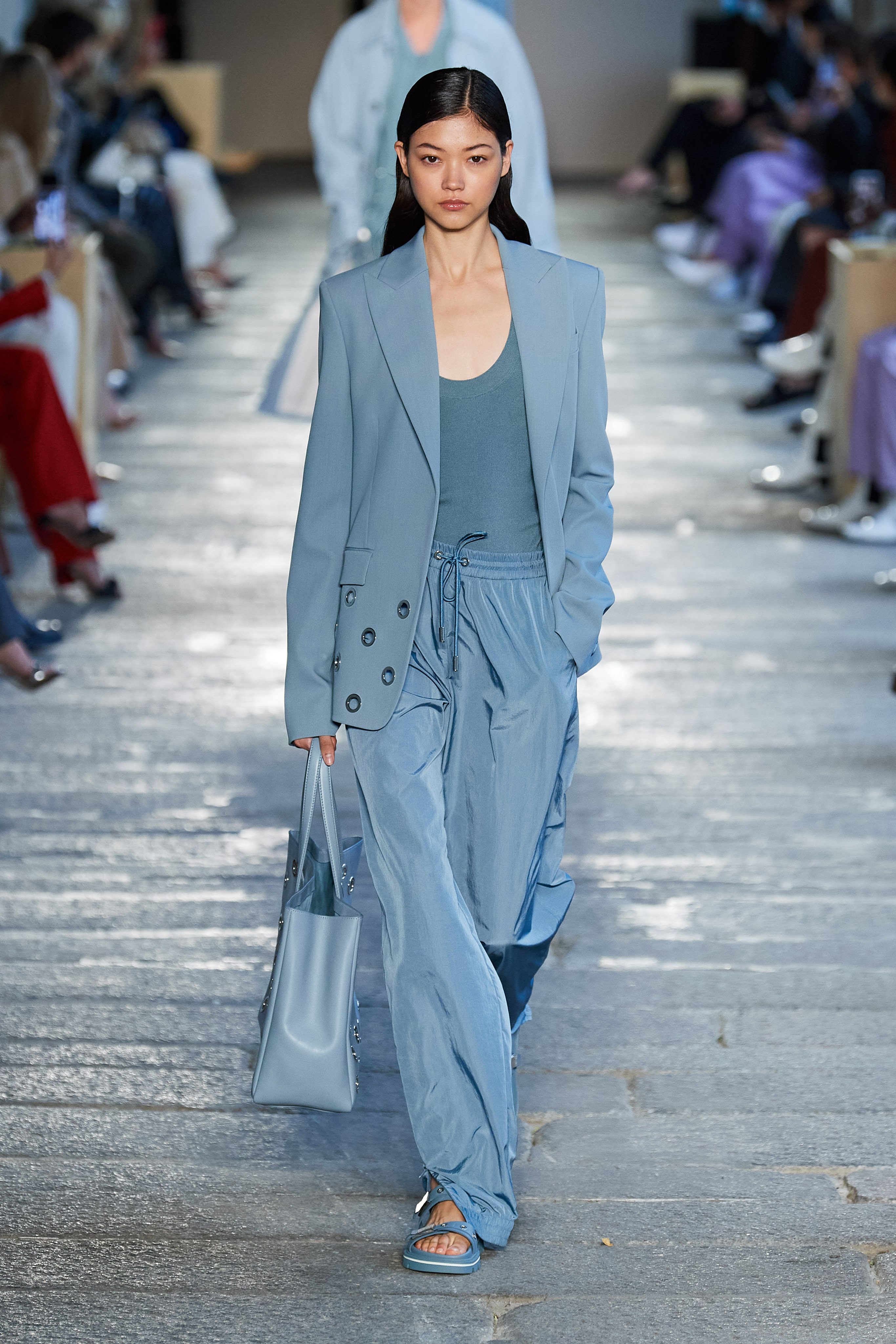 В первой части показа одежда на моделях была выдержана в оттенках ментоловых леденцов и небесной глади. Вторая часть раскрыла коллекцию с самой "весенней" стороны: брюки, бомберы и пальто были покрыты флористическим принтом, а в костюмах-двойках, платьях с прорезями на талии и мужских шортах с куртками преобладали травянистые и мятные оттенки.