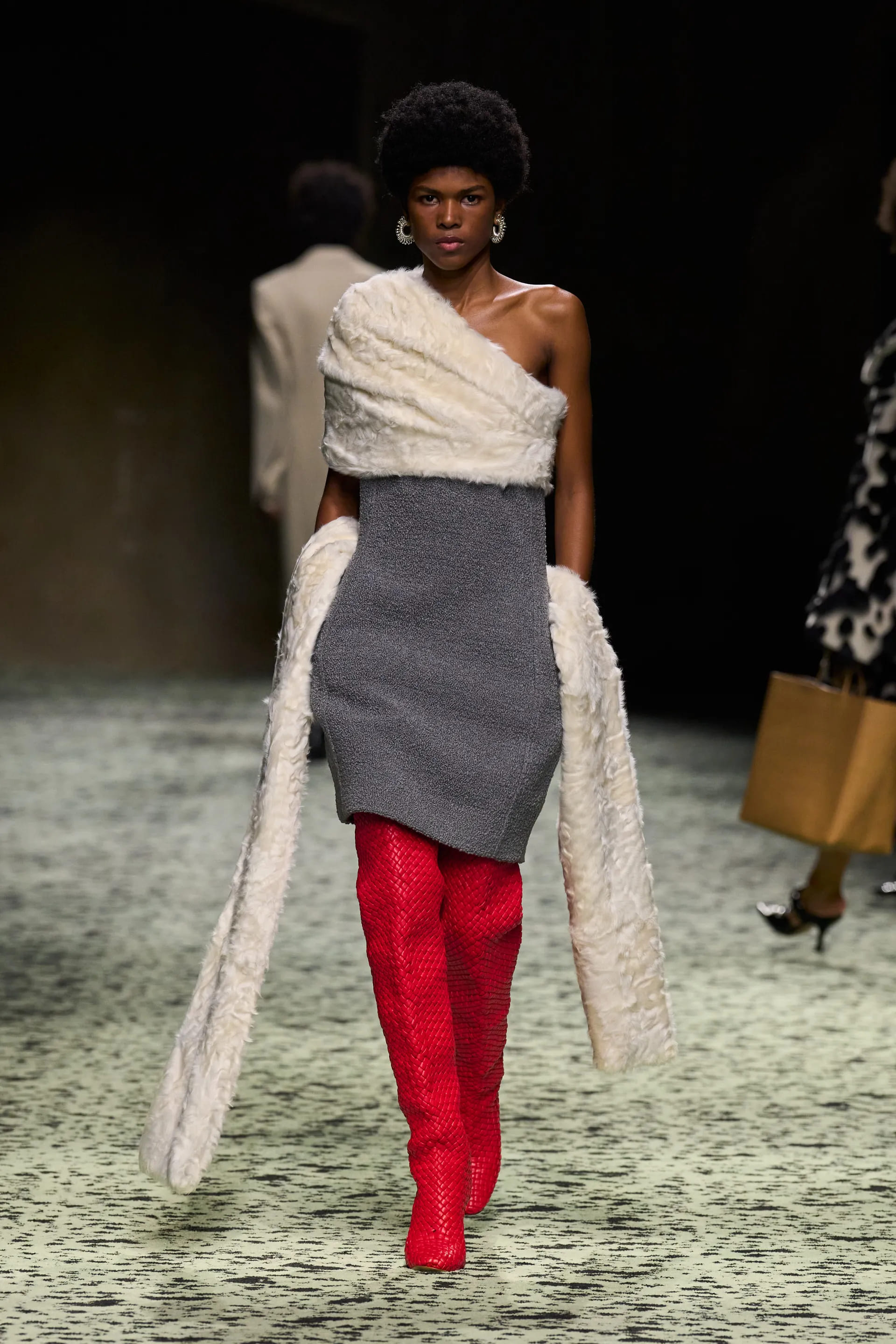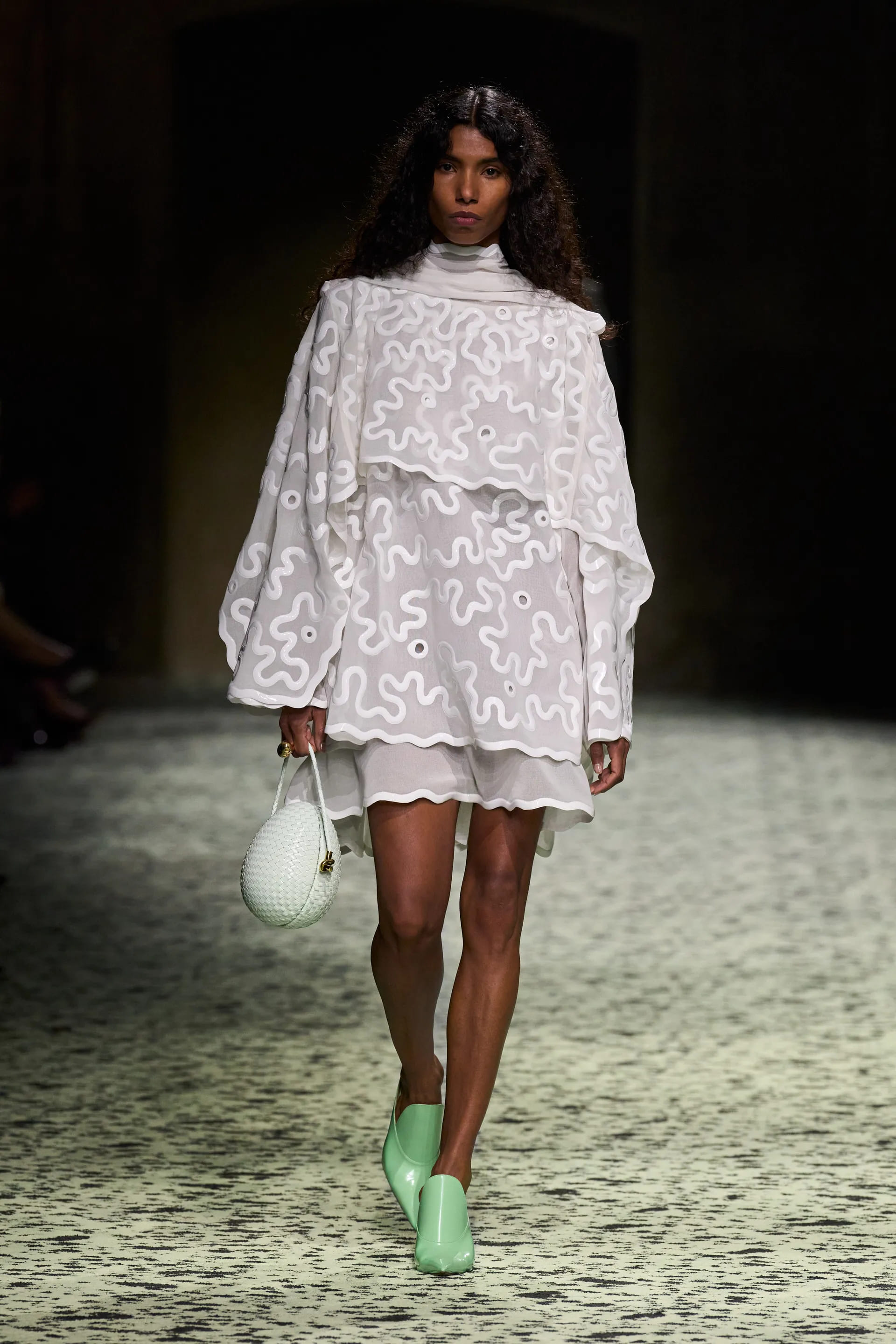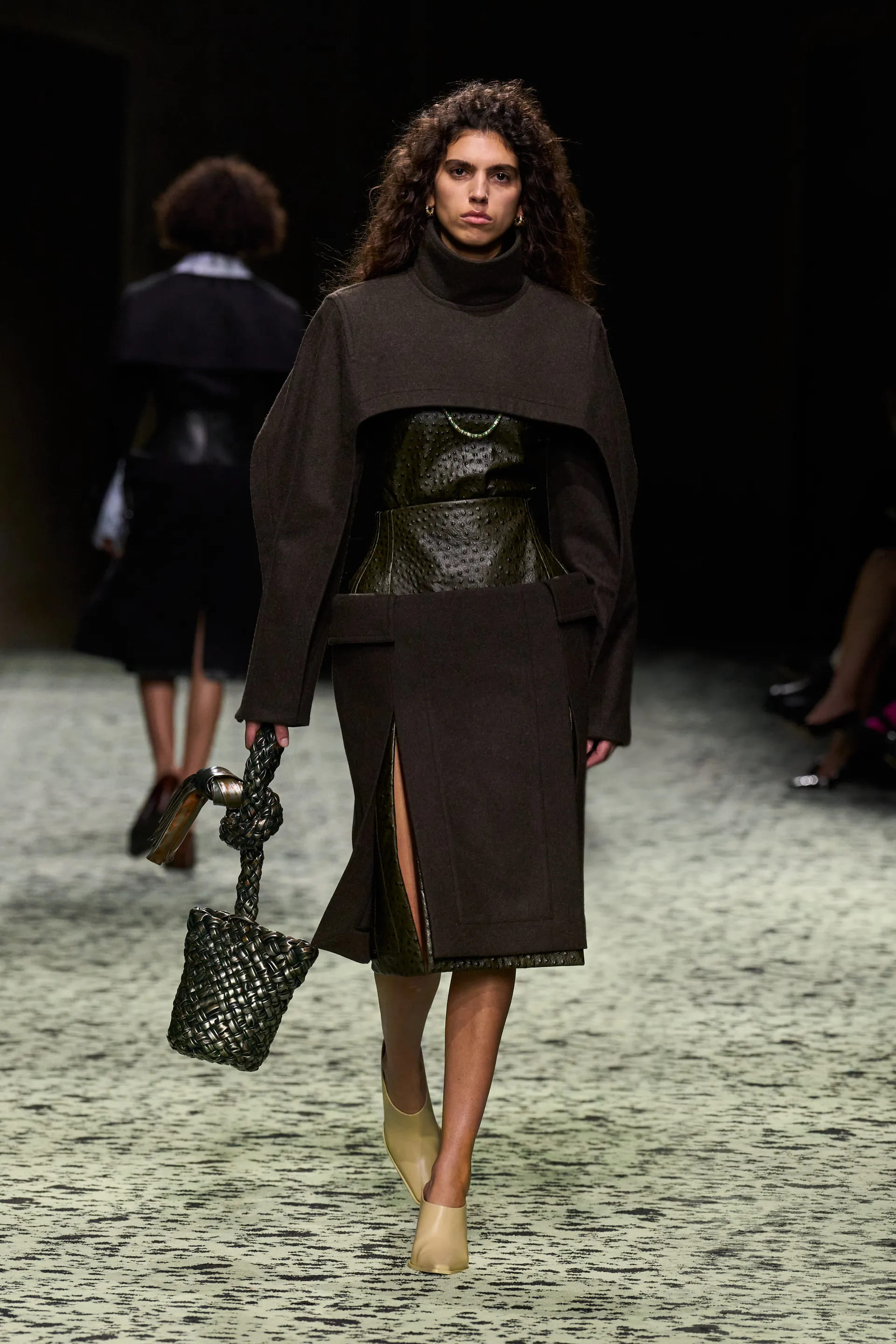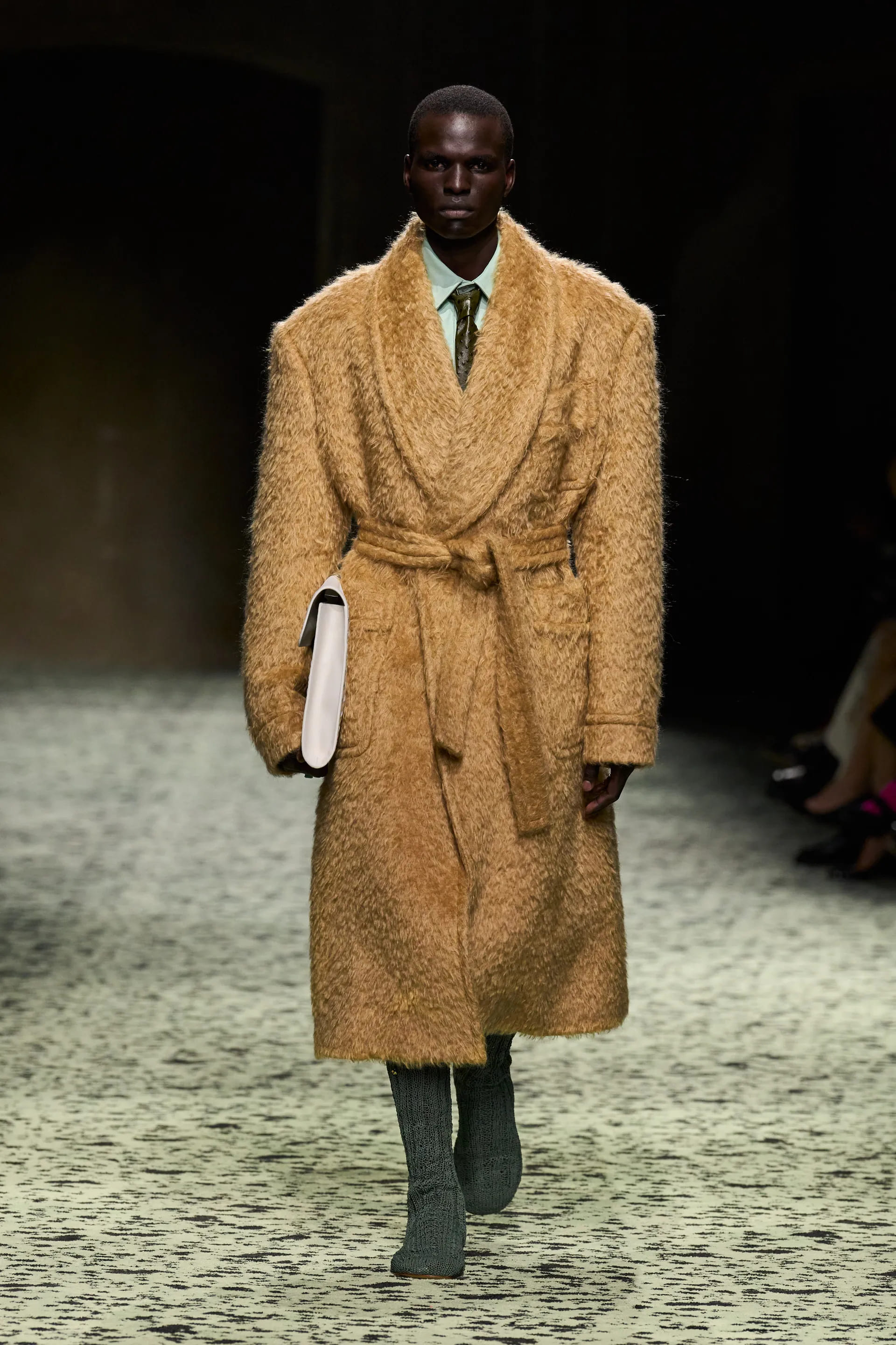 Варто відмітити й майстерність тканин та фактур: в’язані шкарпетки зі шкіри, вовна у вафельній фактурі, пір’я, тканина під страусину шкіру – творчий та безпосередній технічний потенціал Bottega був втілений на максимум.