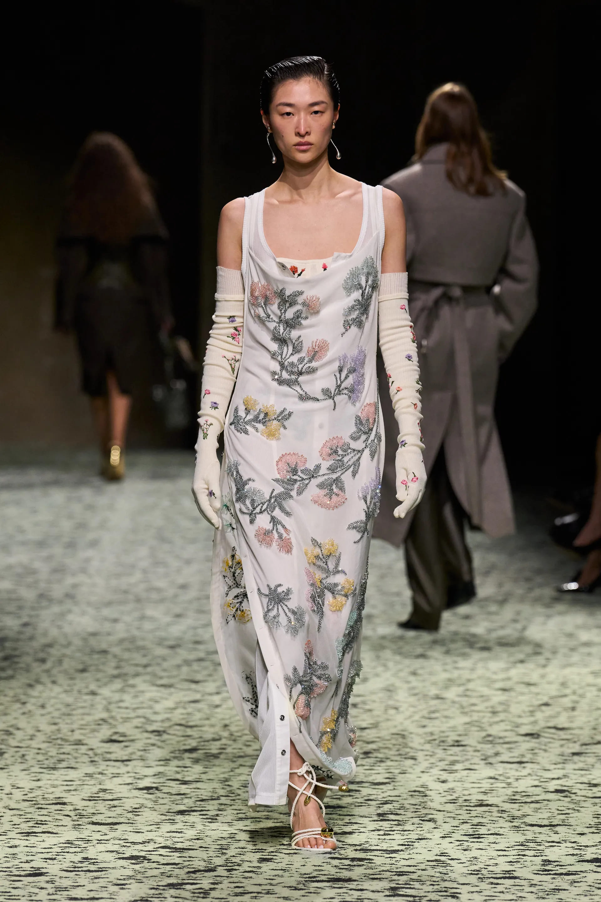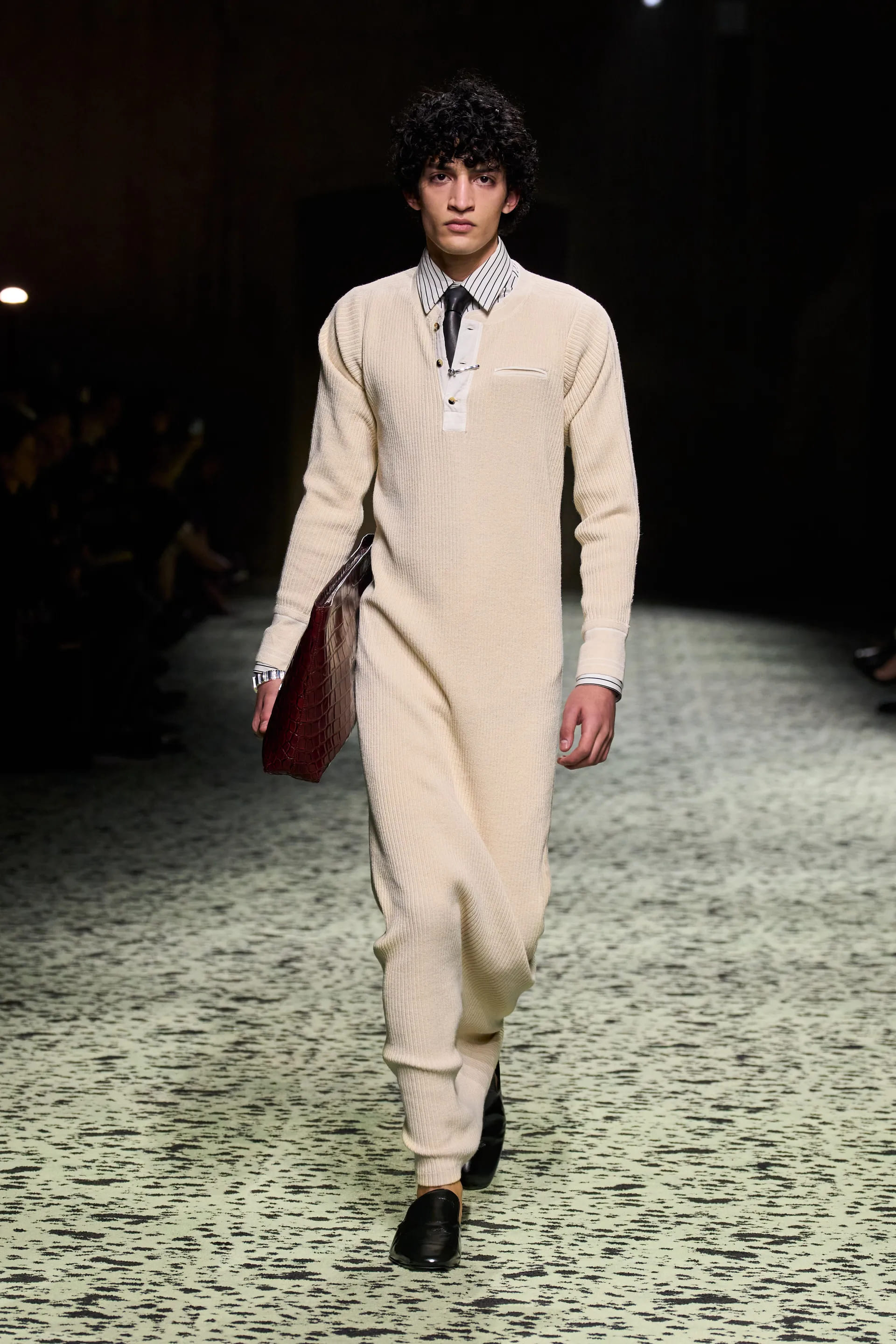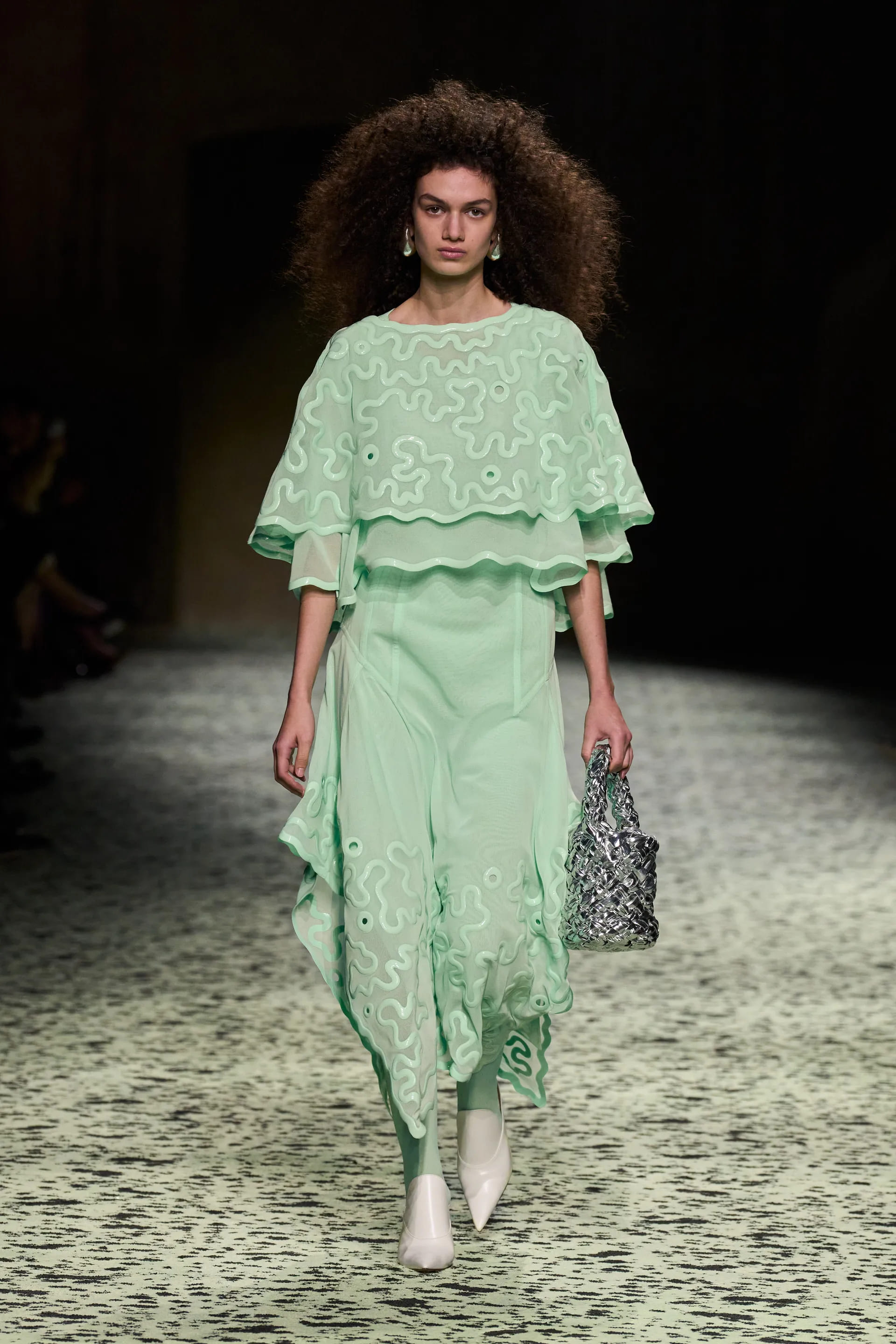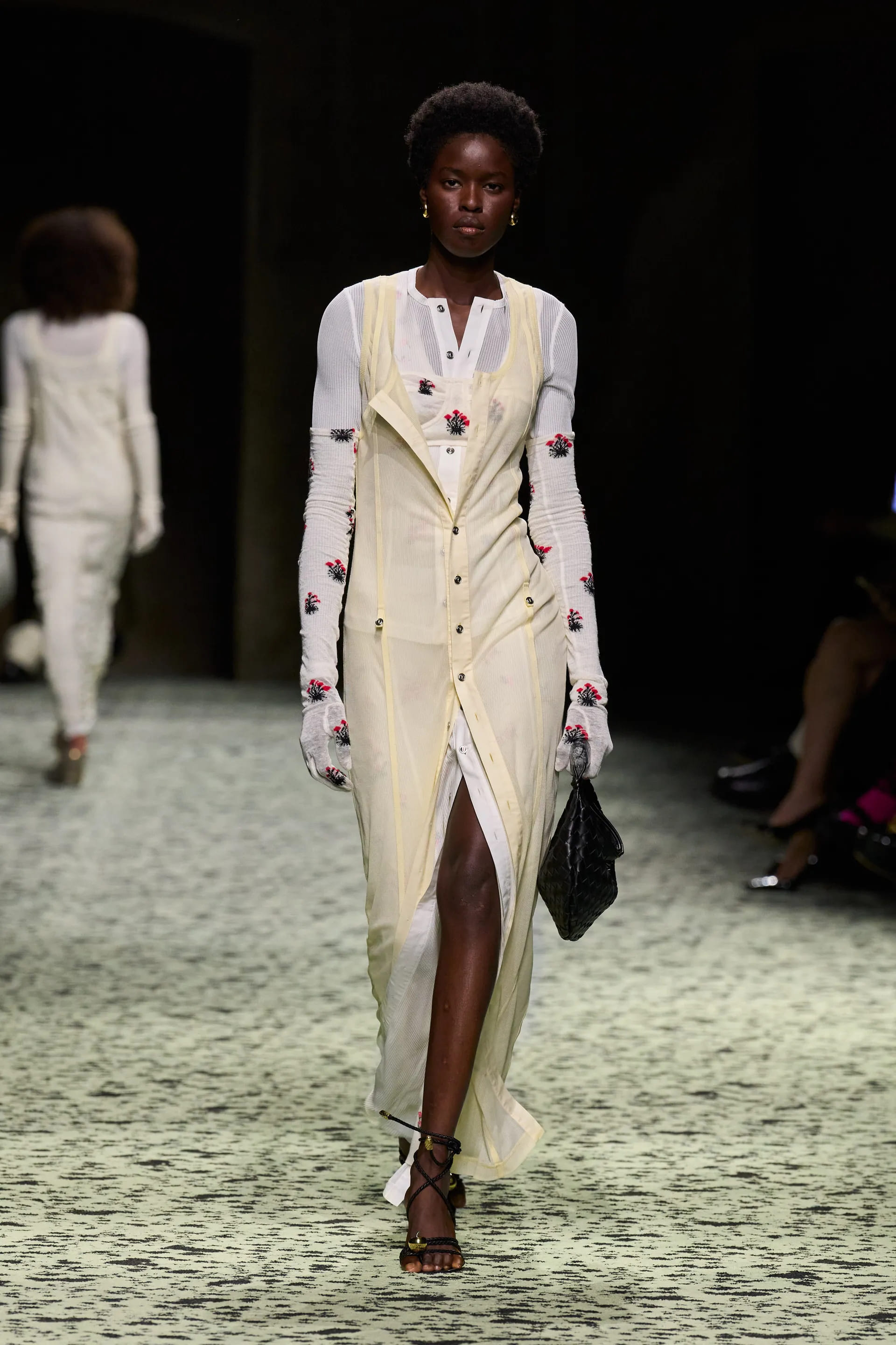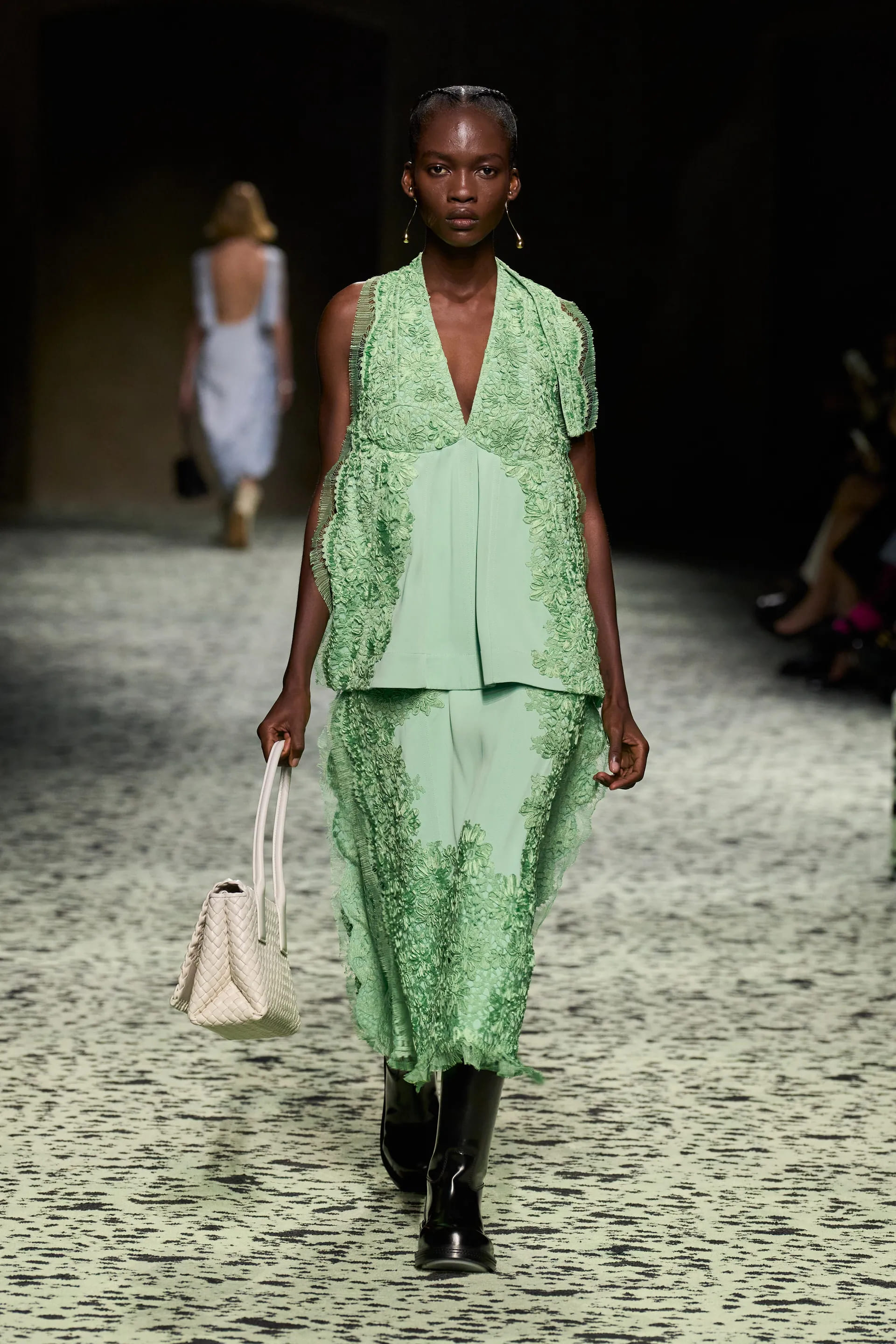 Варто відмітити й майстерність тканин та фактур: в’язані шкарпетки зі шкіри, вовна у вафельній фактурі, пір’я, тканина під страусину шкіру – творчий та безпосередній технічний потенціал Bottega був втілений на максимум.