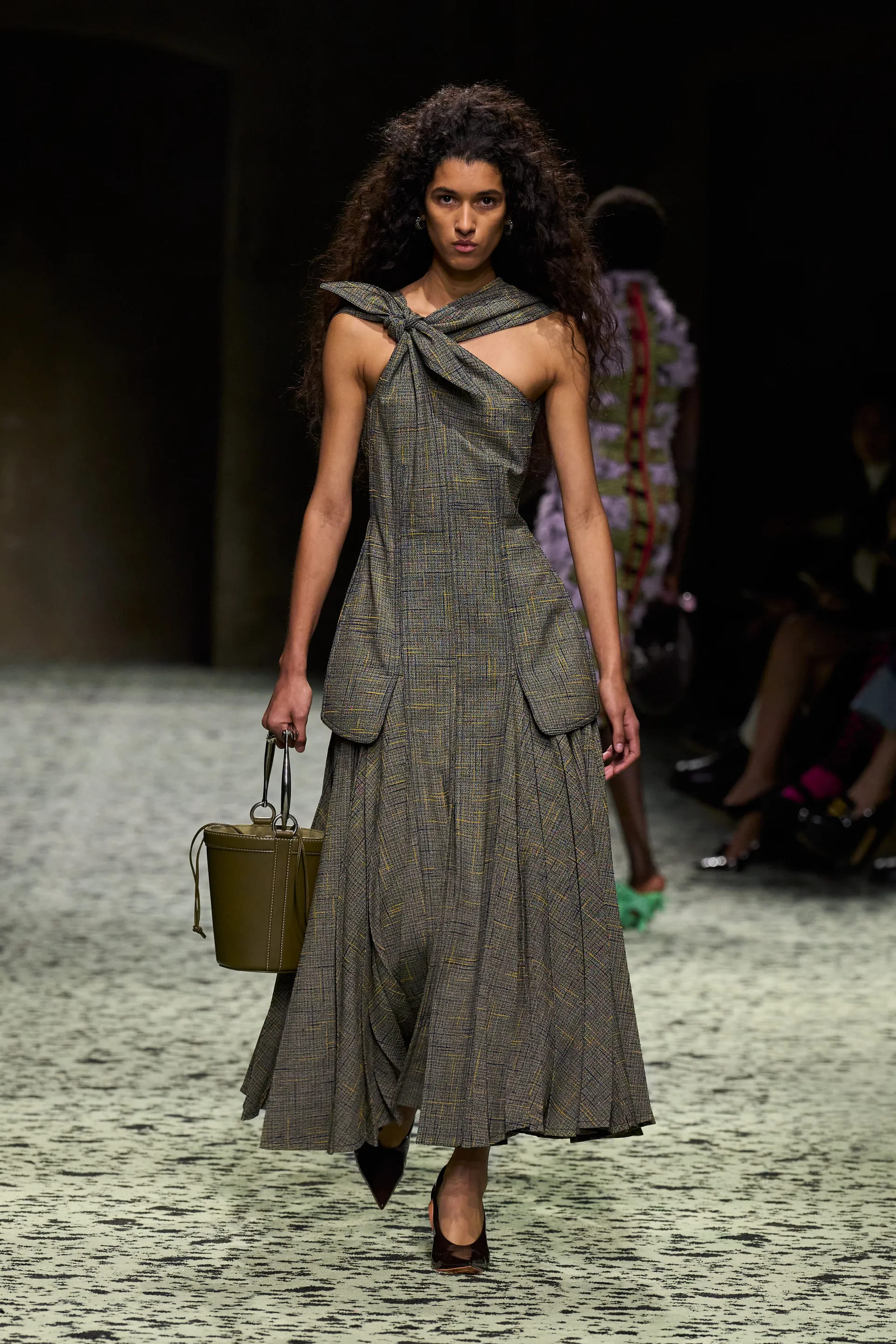 Коди будинку Bottega Veneta втілені в техніці intrecciato та в майстерності роботи зі шкірою – для окремих образів бренд "поголив" шкіру, надаючи їй легкості. intrecciato було втілене в об’ємних сумках-відрах з фактурною шкірою та сумках-pouchet різних кольорів на короткій ручці.