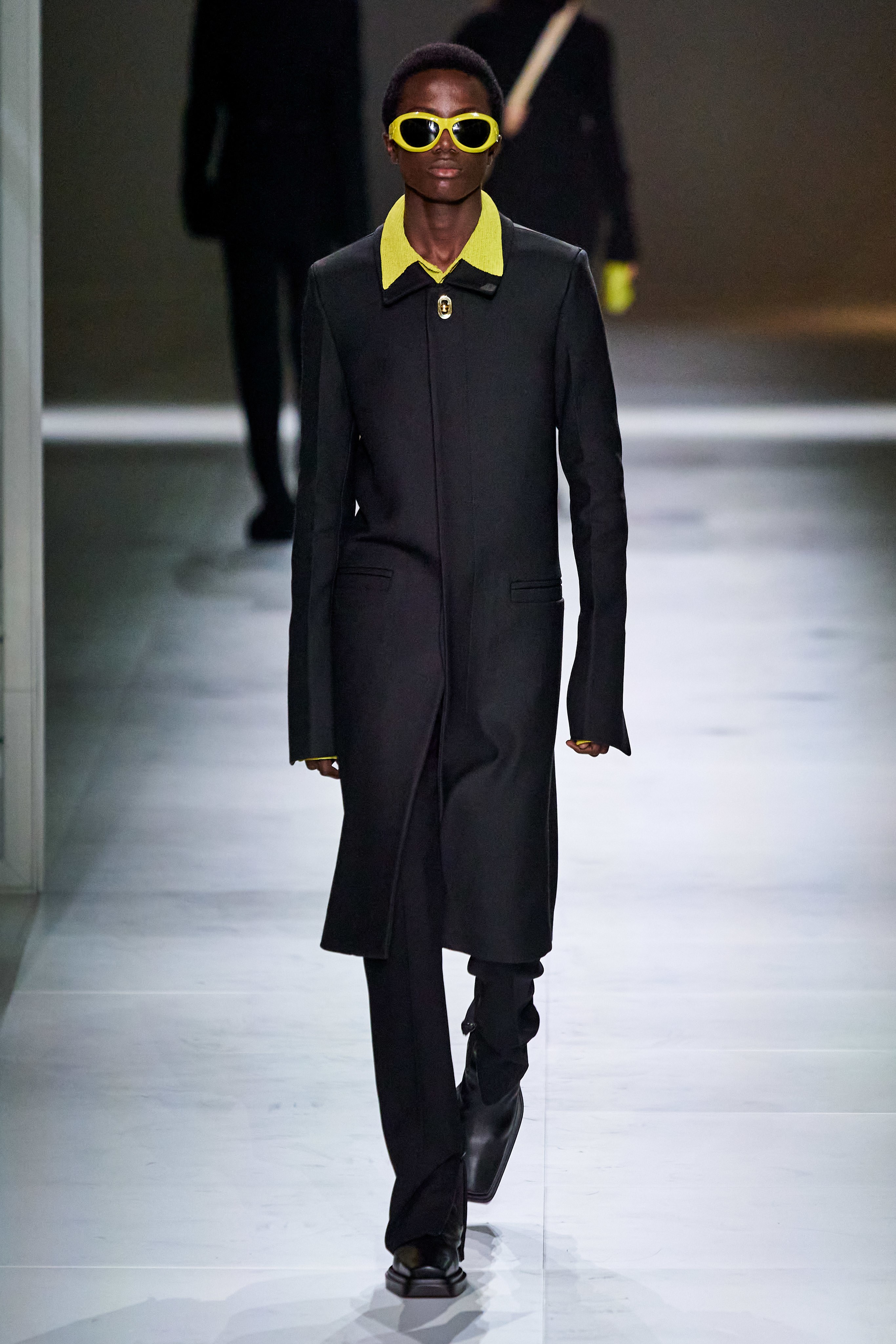 Ключевые элементы: мужские пальто и костюмы чистых силуэтов в духе фильма "Эквилибриум", неоновые рубашки и черные костюмы, трикотажные платья с плетеными элементами, шубы и сумки с бахромой, жилеты, сплетенные в технике "тромплей" из крупных фрагментов, обувь с геометричными носками.