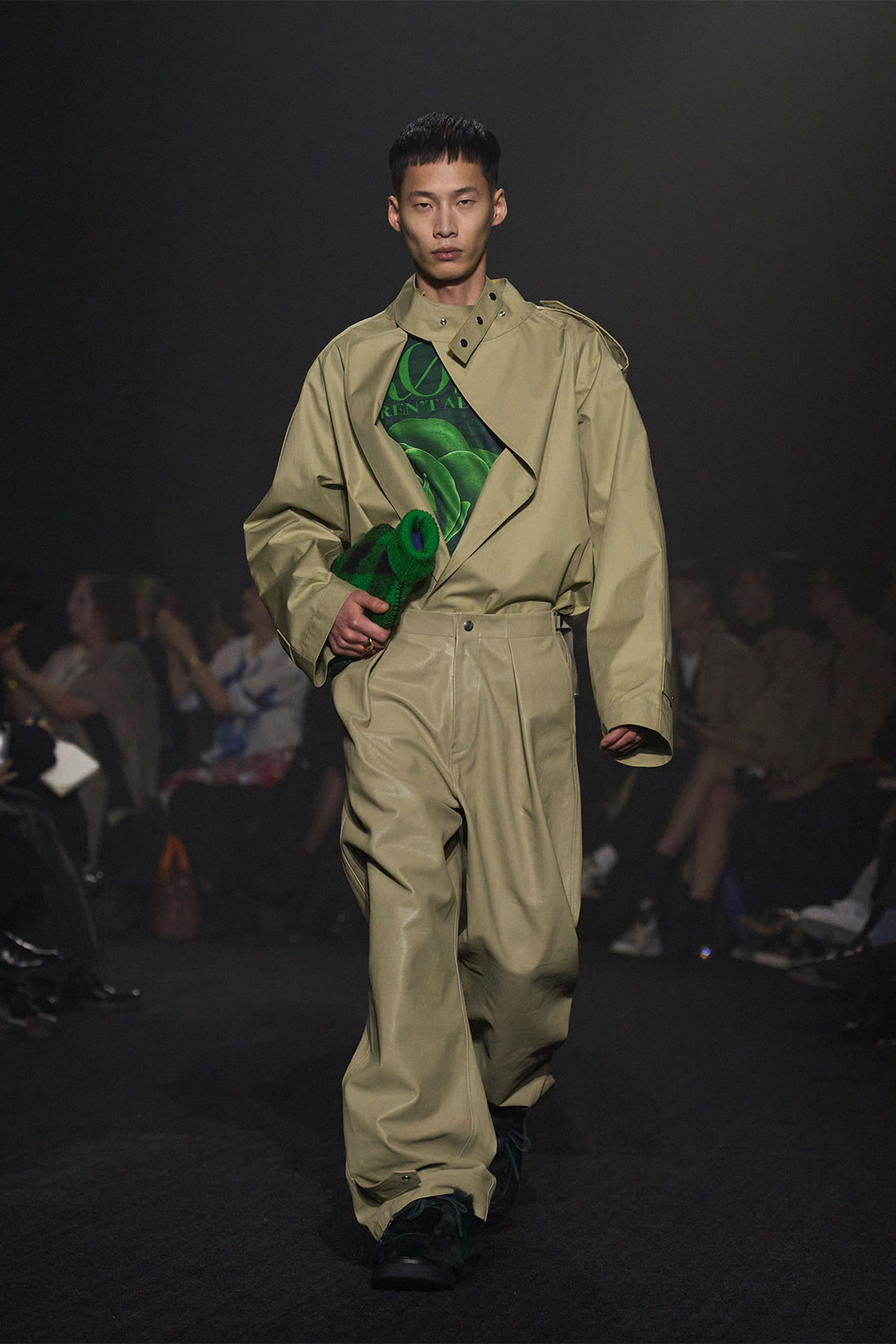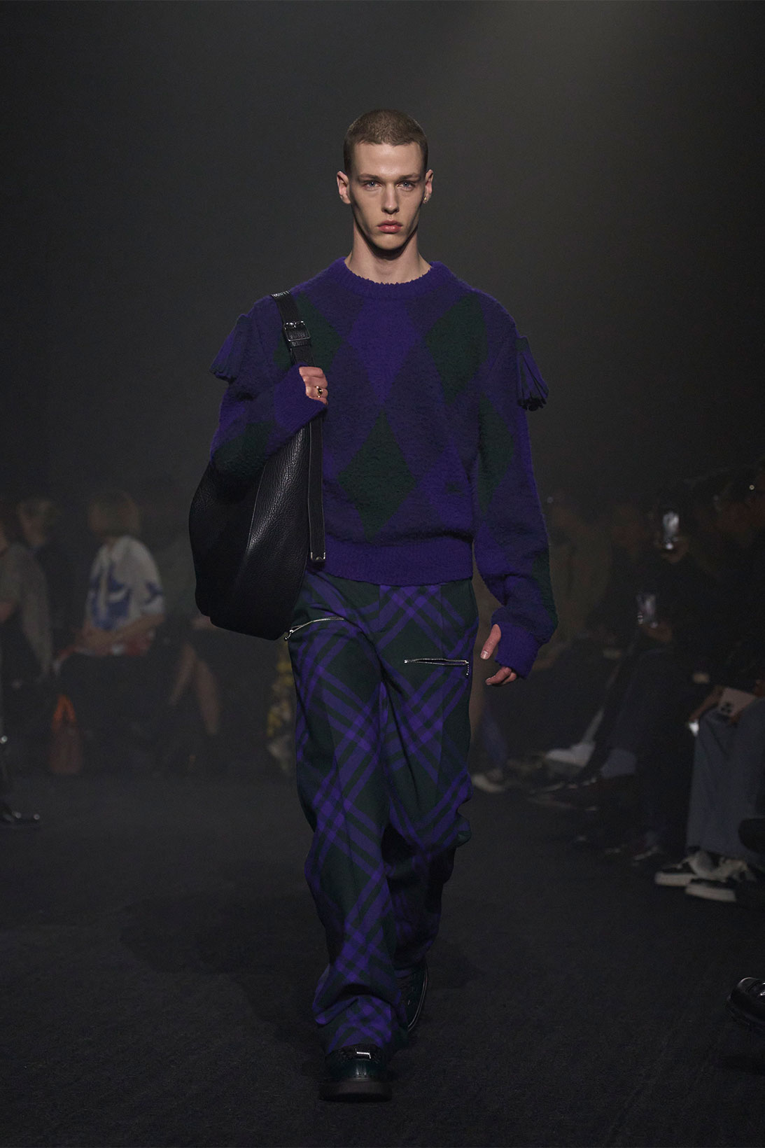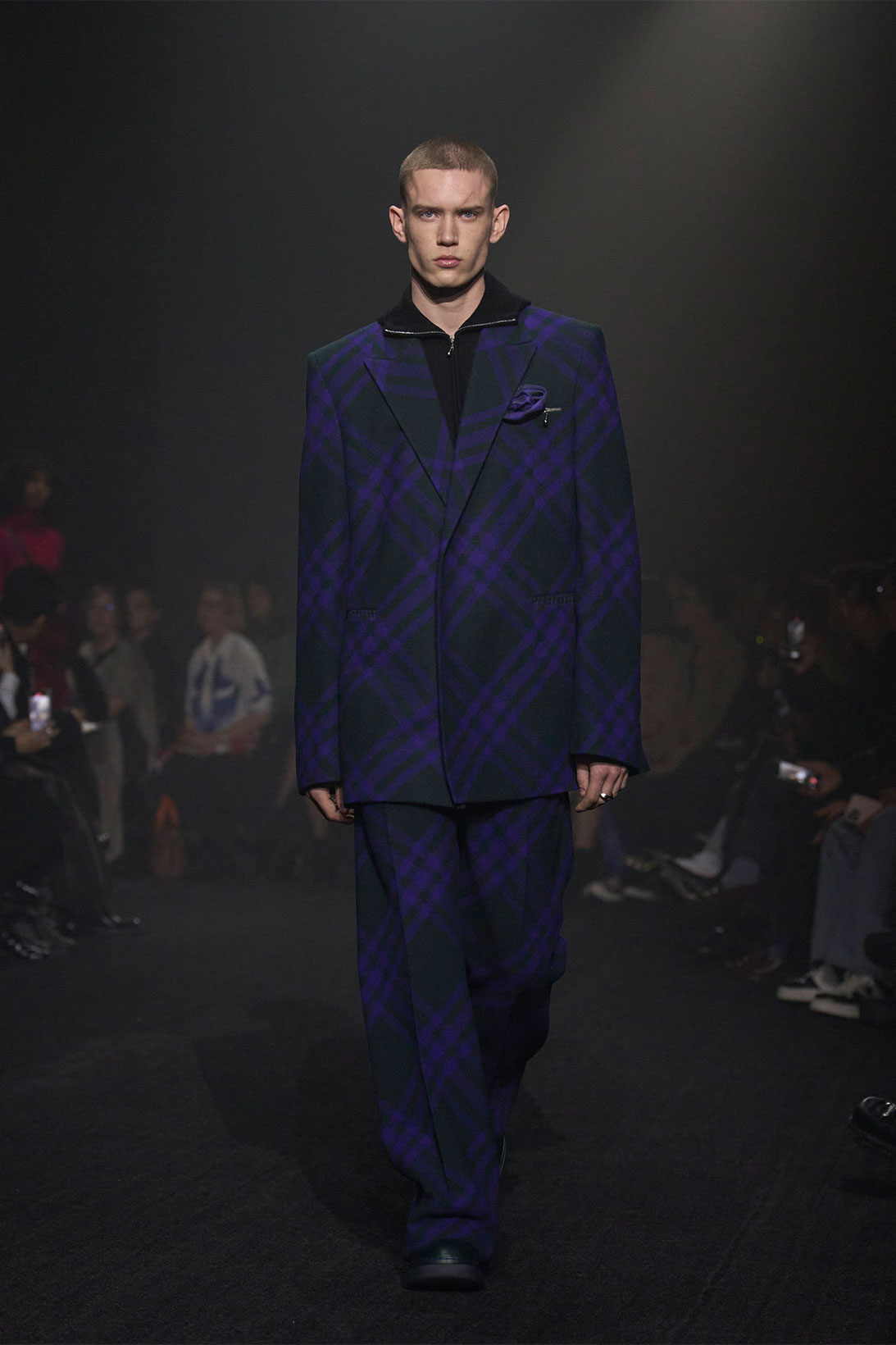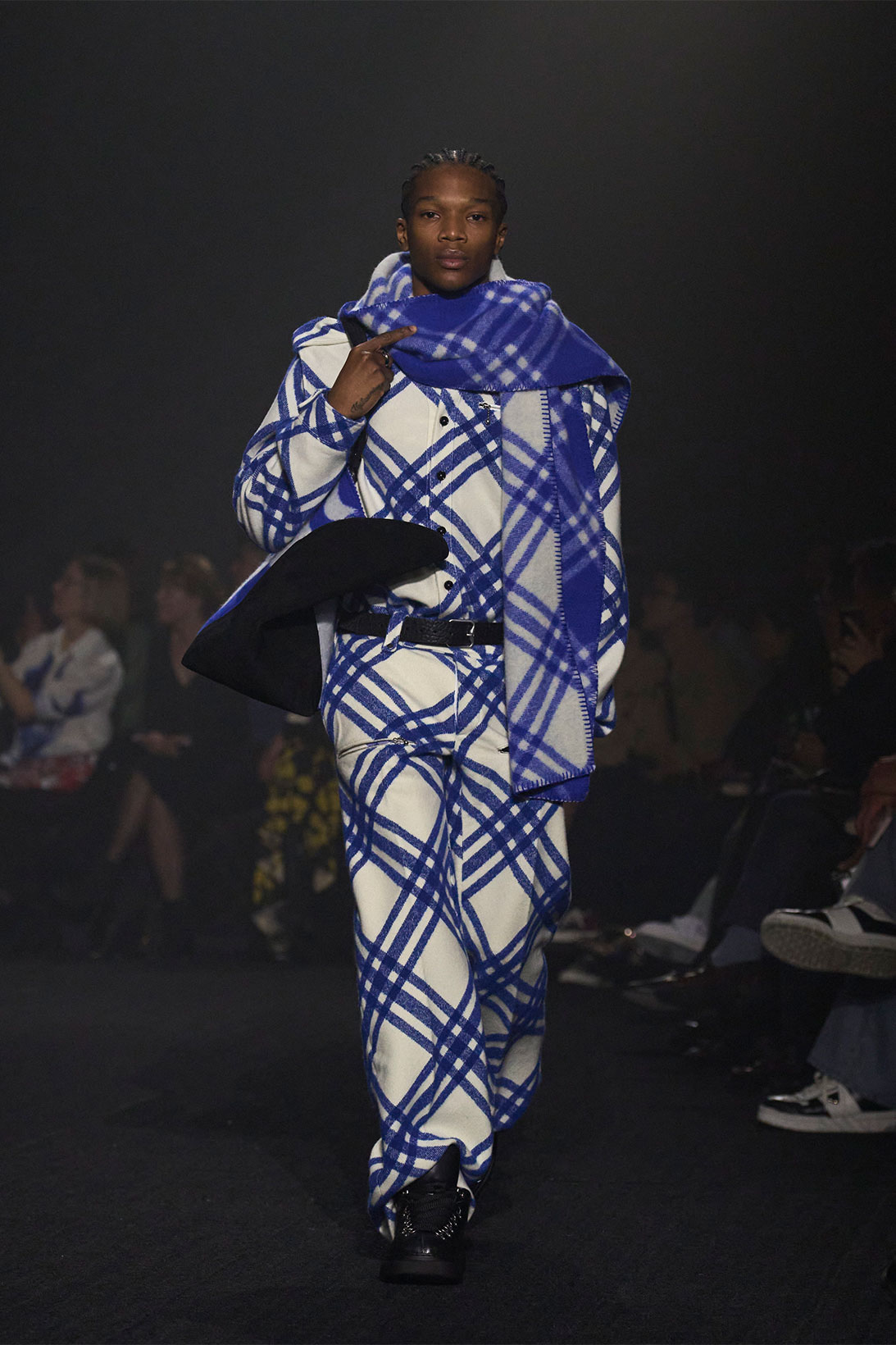 Нову FW 23/24 колекцію дизайнер відкрив класичною та найвпізнаванішою для Burberry річчю: тренчем. Два об’ємні тренчі у темно-зеленому кольорі, що є історичним кодом для бренду, були представлені і для чоловічої, і для жіночої лінії. Оздоблені штучним хутром комірці, безперечно, сигналізували руку Лі. До цих образів були додані клатчі з відомою Burberry-клітинкою у темних відтінках фіолетового та зеленого.