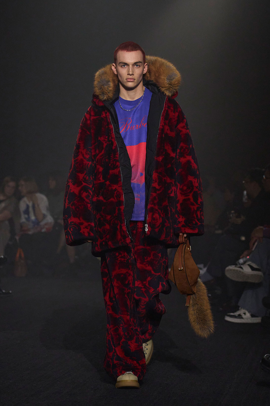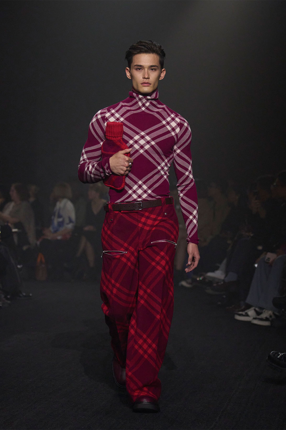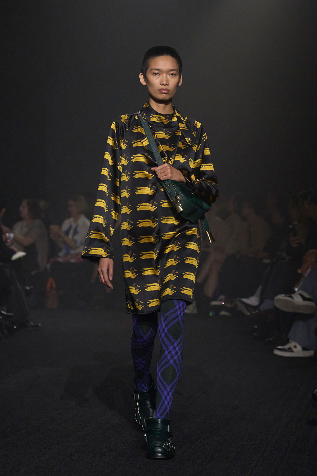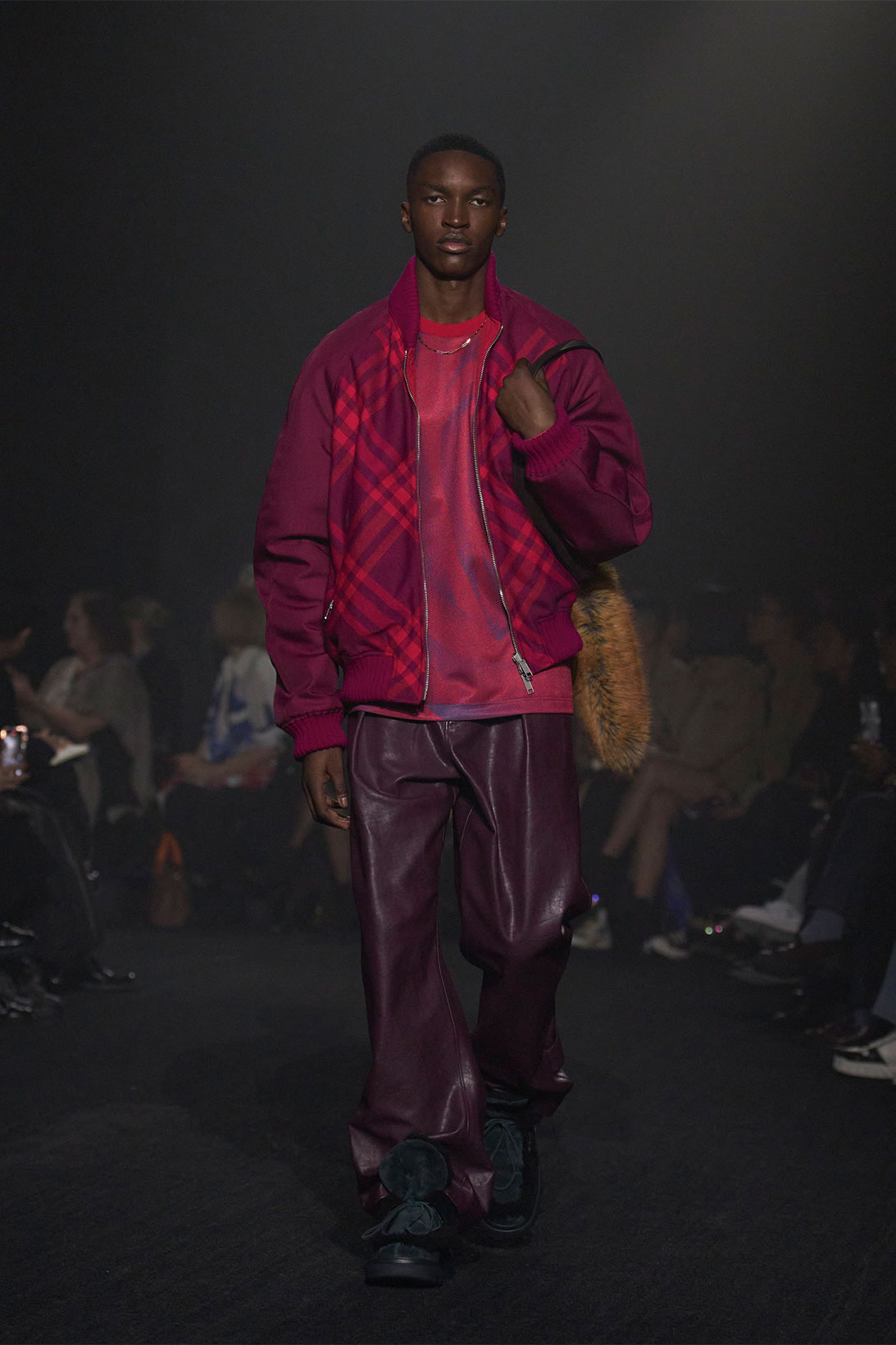 Нову FW 23/24 колекцію дизайнер відкрив класичною та найвпізнаванішою для Burberry річчю: тренчем. Два об’ємні тренчі у темно-зеленому кольорі, що є історичним кодом для бренду, були представлені і для чоловічої, і для жіночої лінії. Оздоблені штучним хутром комірці, безперечно, сигналізували руку Лі. До цих образів були додані клатчі з відомою Burberry-клітинкою у темних відтінках фіолетового та зеленого.