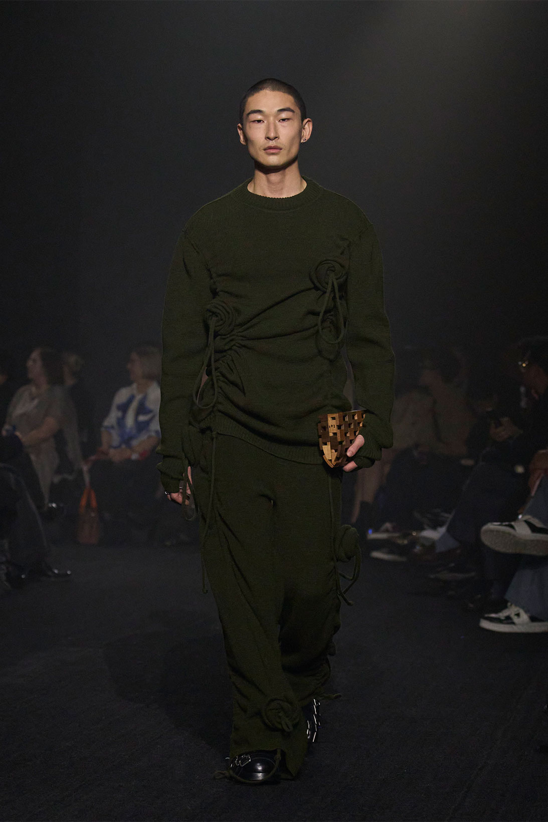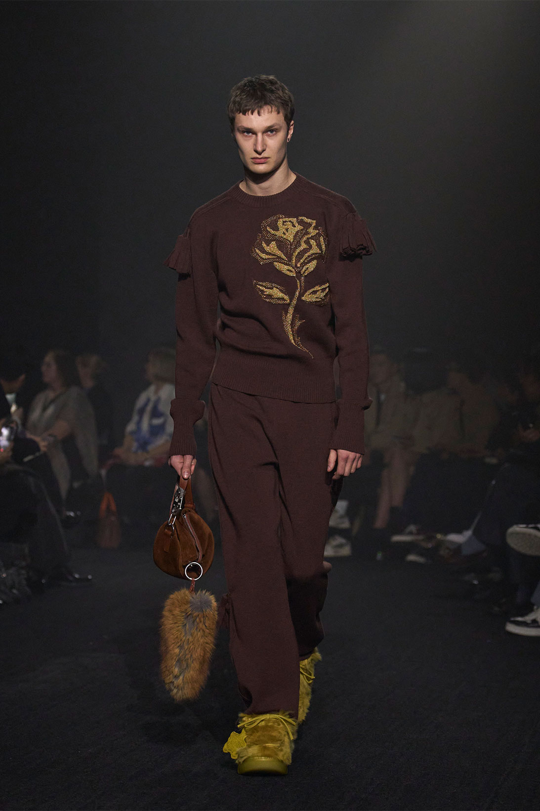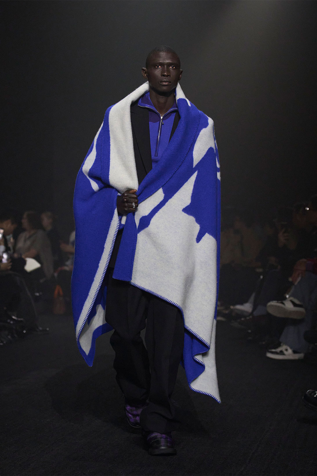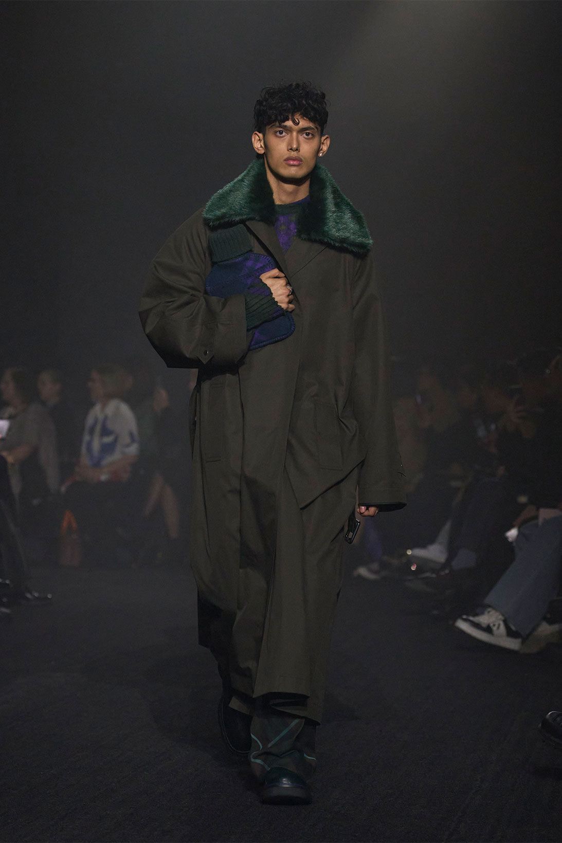 Нову FW 23/24 колекцію дизайнер відкрив класичною та найвпізнаванішою для Burberry річчю: тренчем. Два об’ємні тренчі у темно-зеленому кольорі, що є історичним кодом для бренду, були представлені і для чоловічої, і для жіночої лінії. Оздоблені штучним хутром комірці, безперечно, сигналізували руку Лі. До цих образів були додані клатчі з відомою Burberry-клітинкою у темних відтінках фіолетового та зеленого.