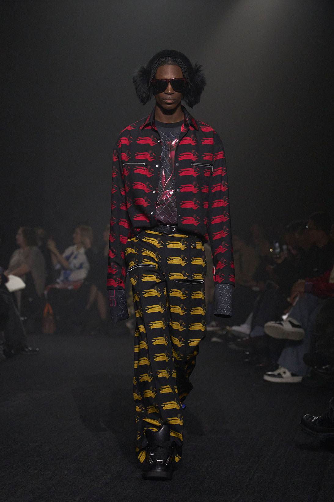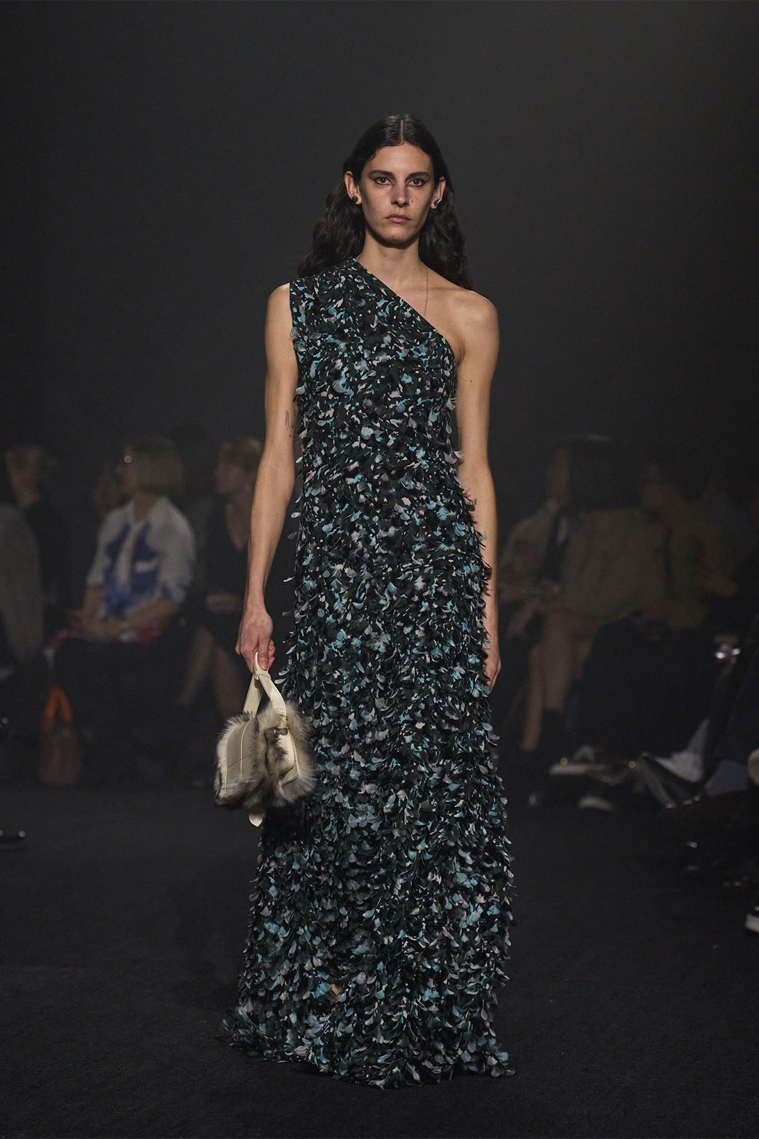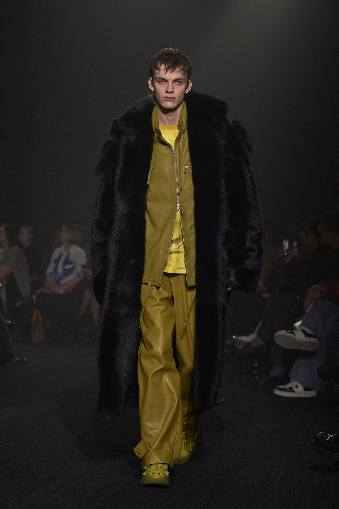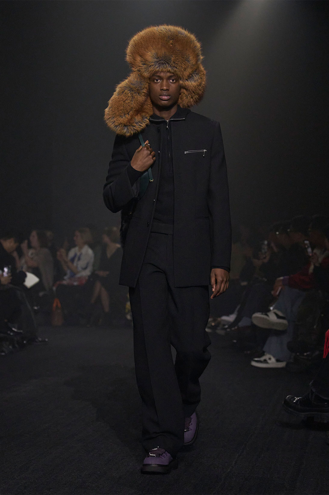 Нову FW 23/24 колекцію дизайнер відкрив класичною та найвпізнаванішою для Burberry річчю: тренчем. Два об’ємні тренчі у темно-зеленому кольорі, що є історичним кодом для бренду, були представлені і для чоловічої, і для жіночої лінії. Оздоблені штучним хутром комірці, безперечно, сигналізували руку Лі. До цих образів були додані клатчі з відомою Burberry-клітинкою у темних відтінках фіолетового та зеленого.