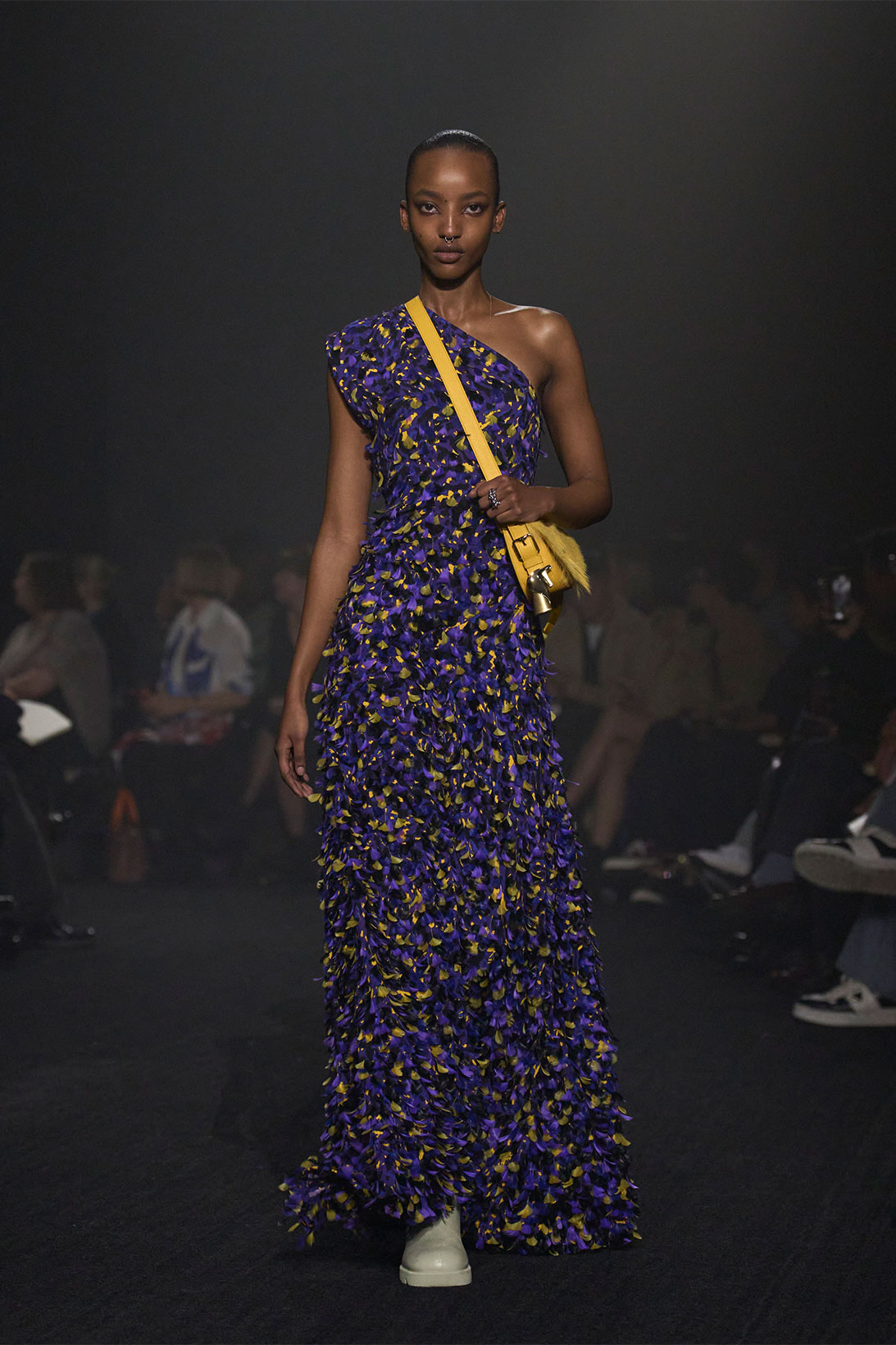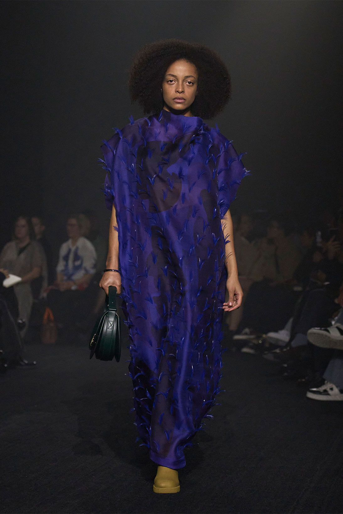 Також можна помітити деконструкцію, нашарування різних фактурних тканин: цьогорічний “качковий принт”, напів дезерти фіолетового кольору, об’ємна сумка та штучне боа.