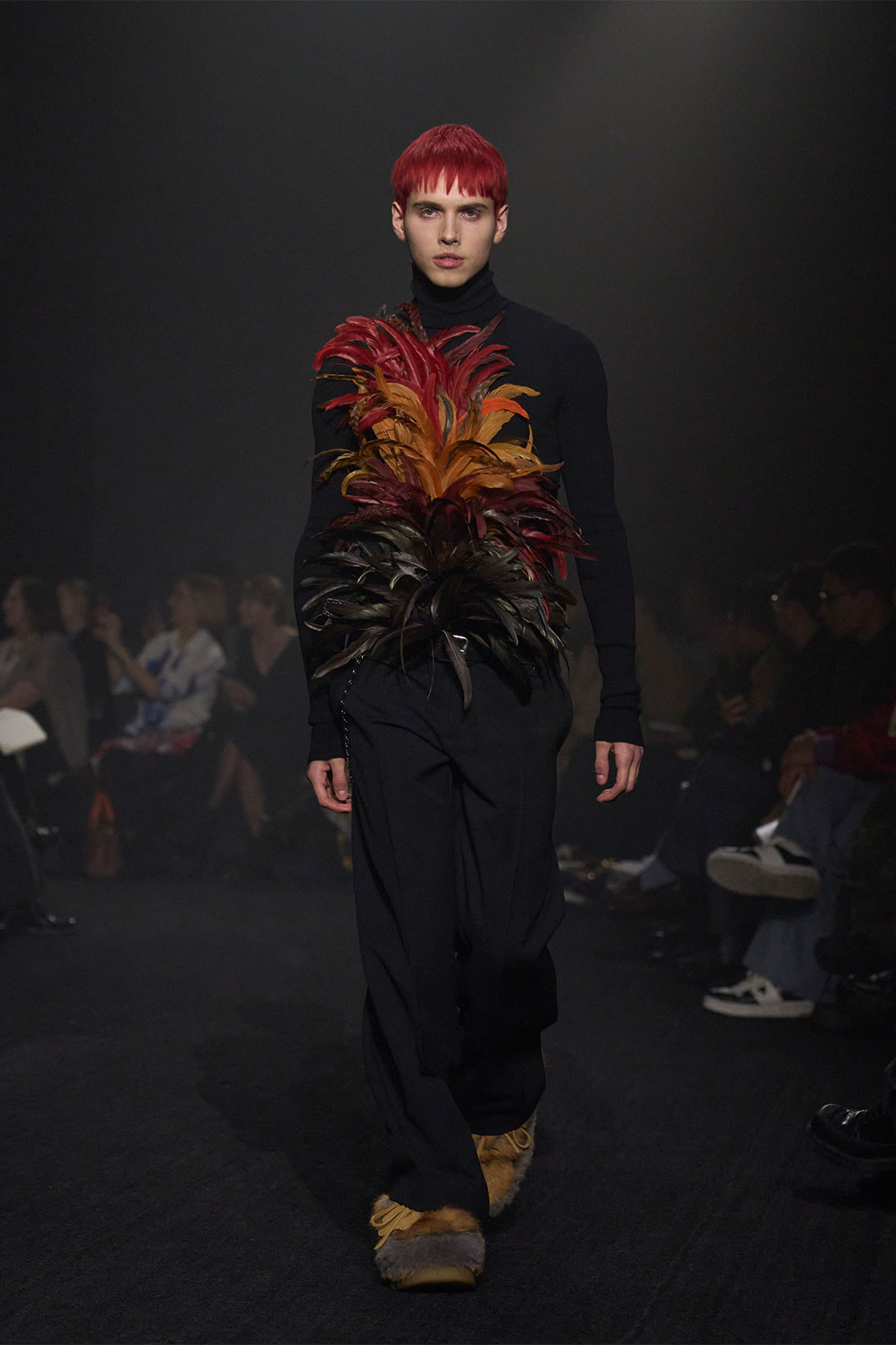 Окремі образи були прикрашені незвичною фурнітурою у вигляді качиного пір’я. У цьому прослідковується спадковість бренду Burberry: класичний для полювання одяг був дуже популярним у ХХ-му столітті. А разом з високими черевиками це точно навіює естетику англійського полювання.