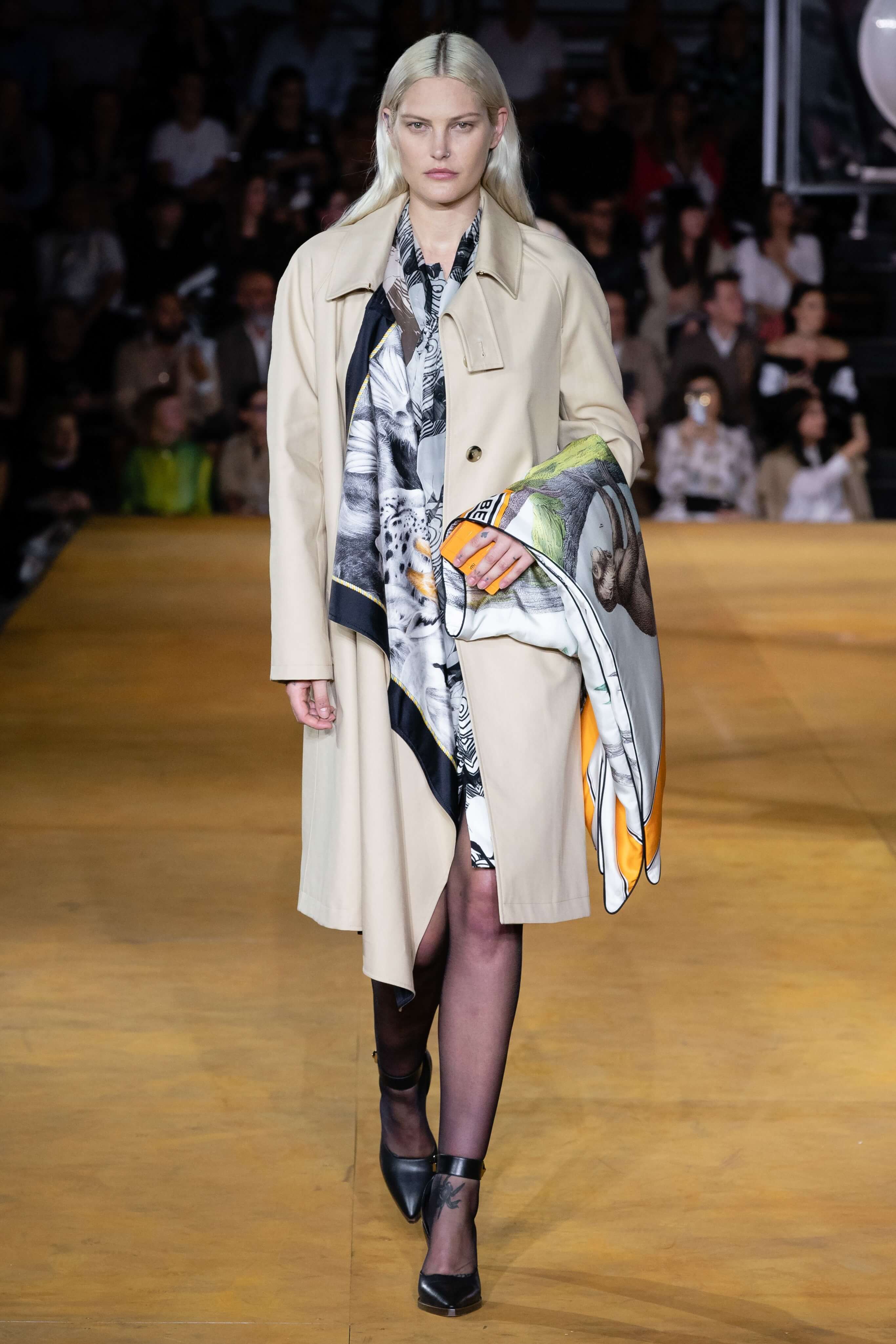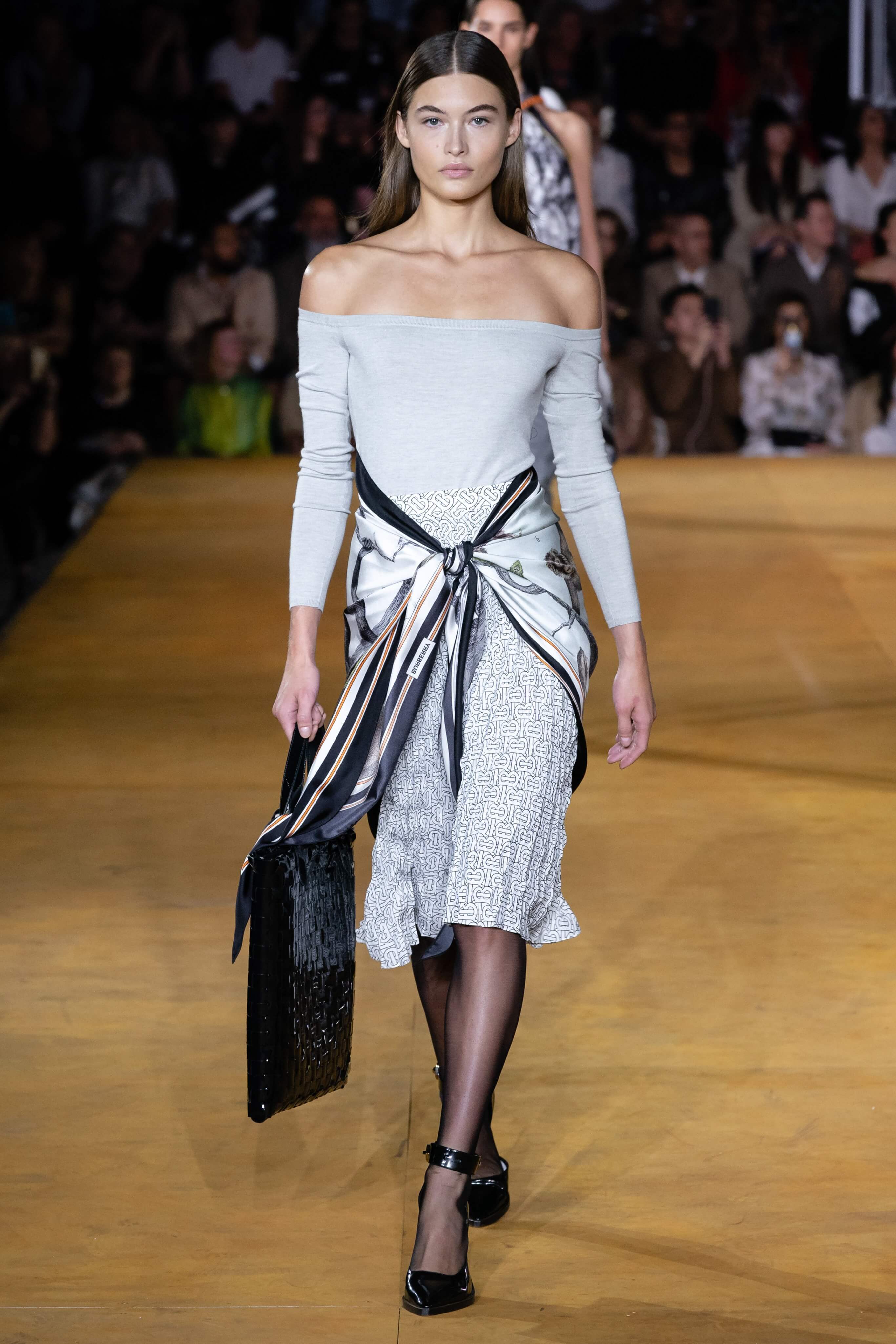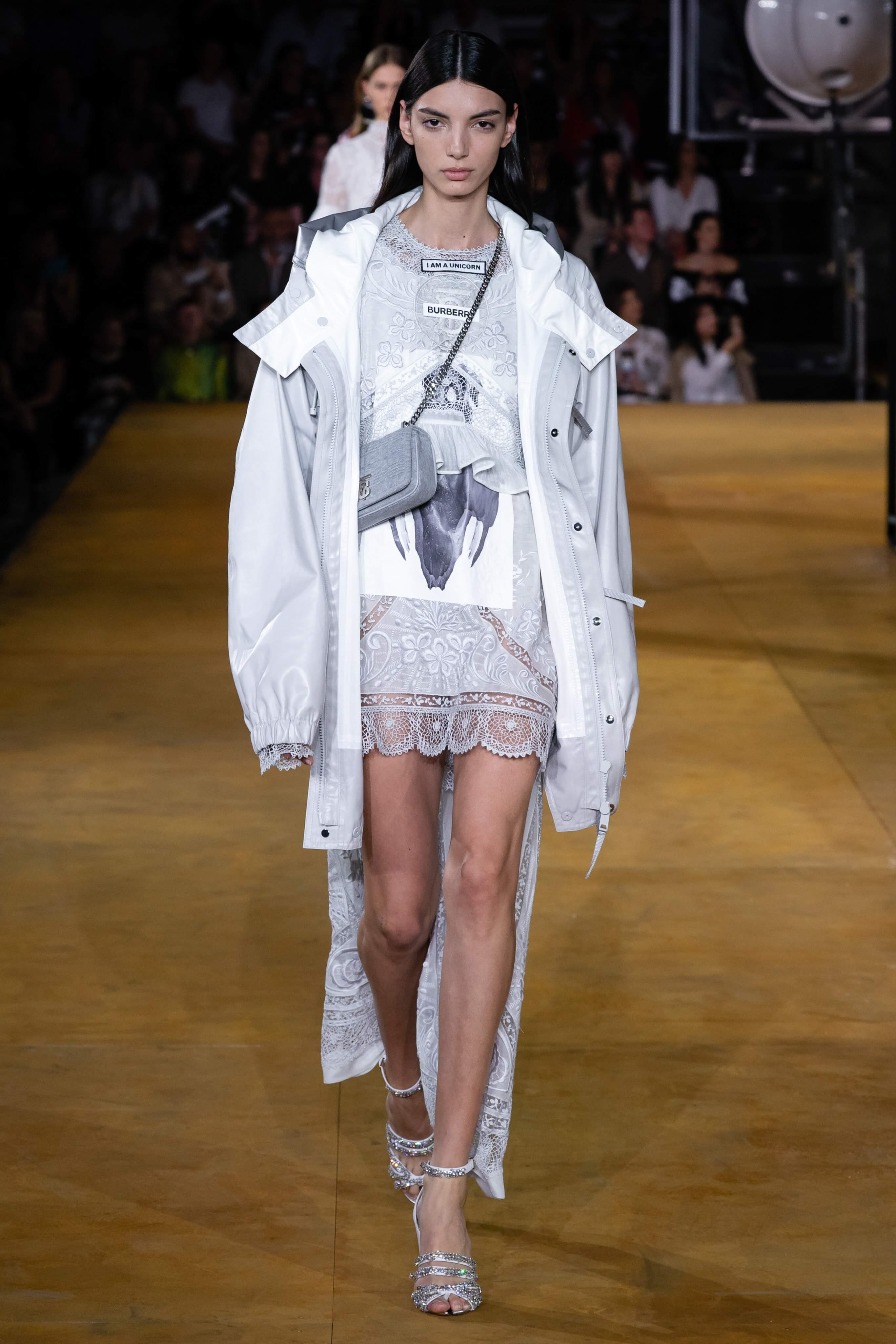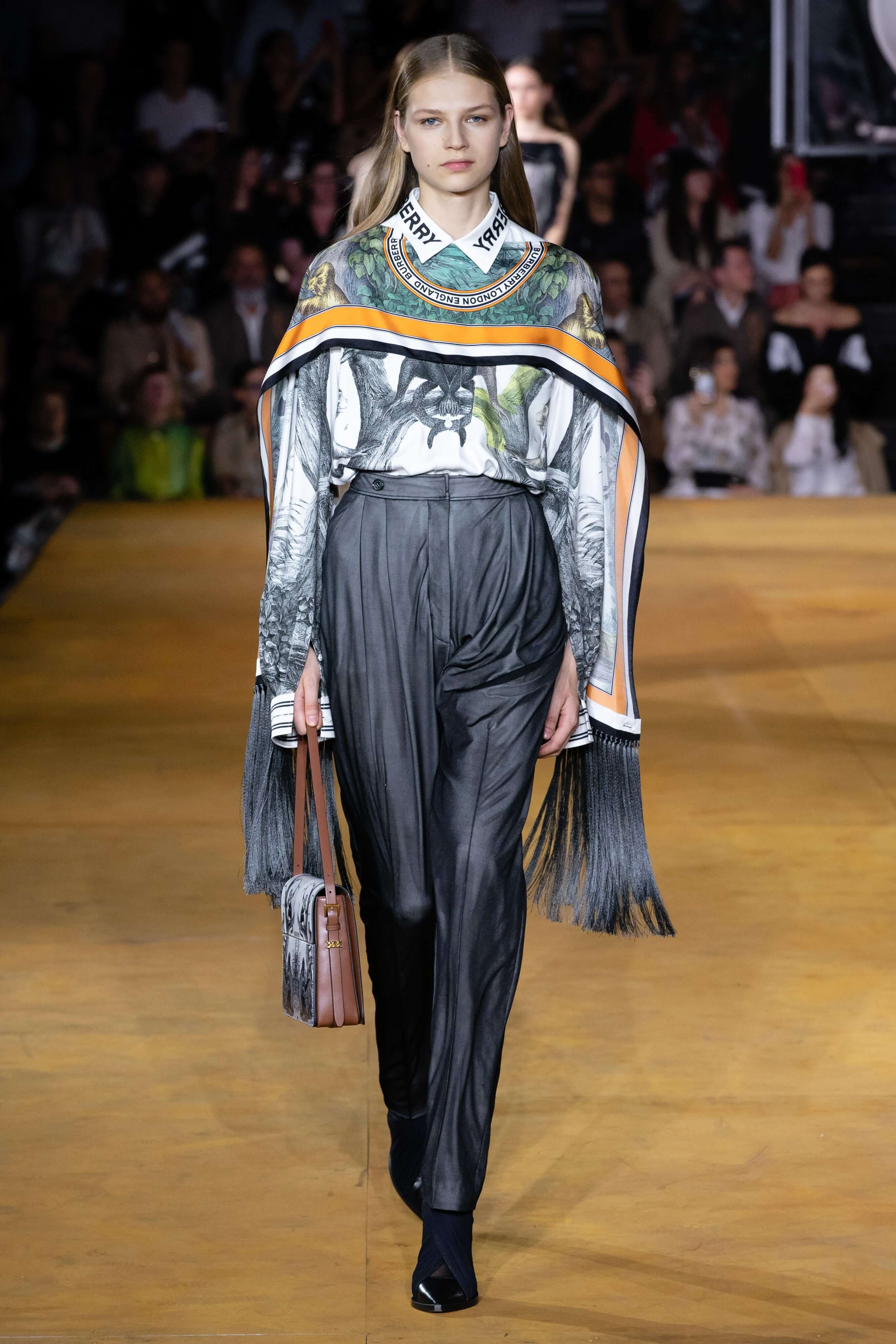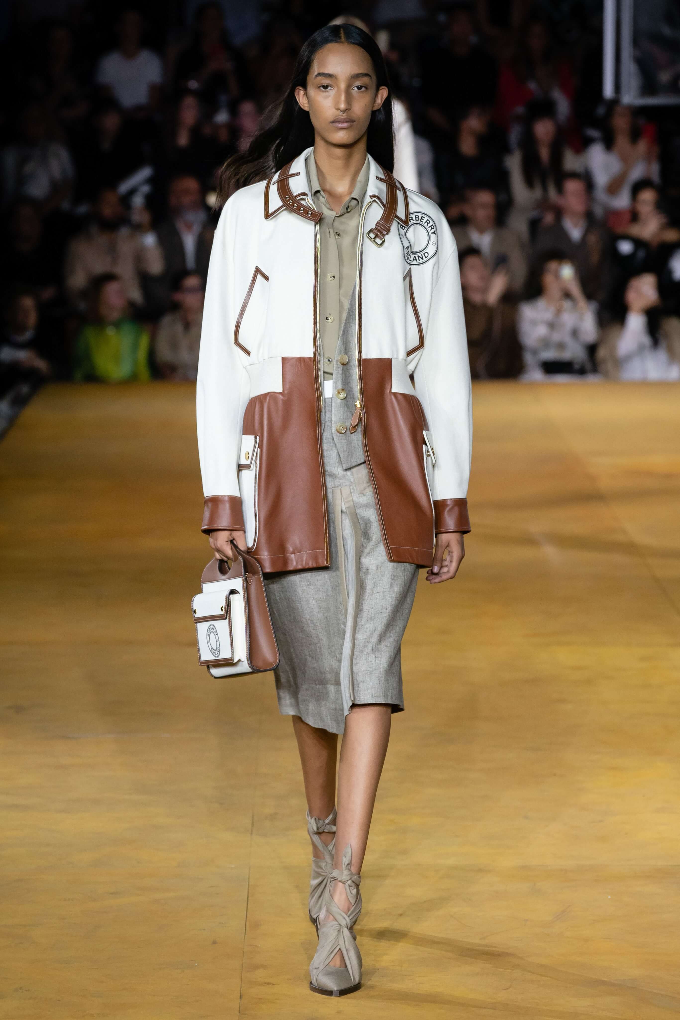 В весенней коллекции необычных и приковывающих взгляд вещей по-настоящему много: это и строгие комбинезоны с неожиданной шелковой бахромой на манжетах, и бейсбольные куртки-бомберы с застёжками на воротах, и вторящие их расцветке мини-сумочки, и удивительной красоты тренчи из хлопка с элементами шитого кружева мышино-серого цвета. Знаковыми для Burberry под началом Рикардо Тиши стали блузы из шелковых платков — в этот раз дизайнер снова умудрился создать нетривиальные силуэты из, казалось бы, однообразных инструментов. Общие стилистические решения коллекции отсылают ум к моде викторианской Англии середины 19 века, когда Томас Берберри изобрёл и модернизировал габардин и знаменитый тренч.
