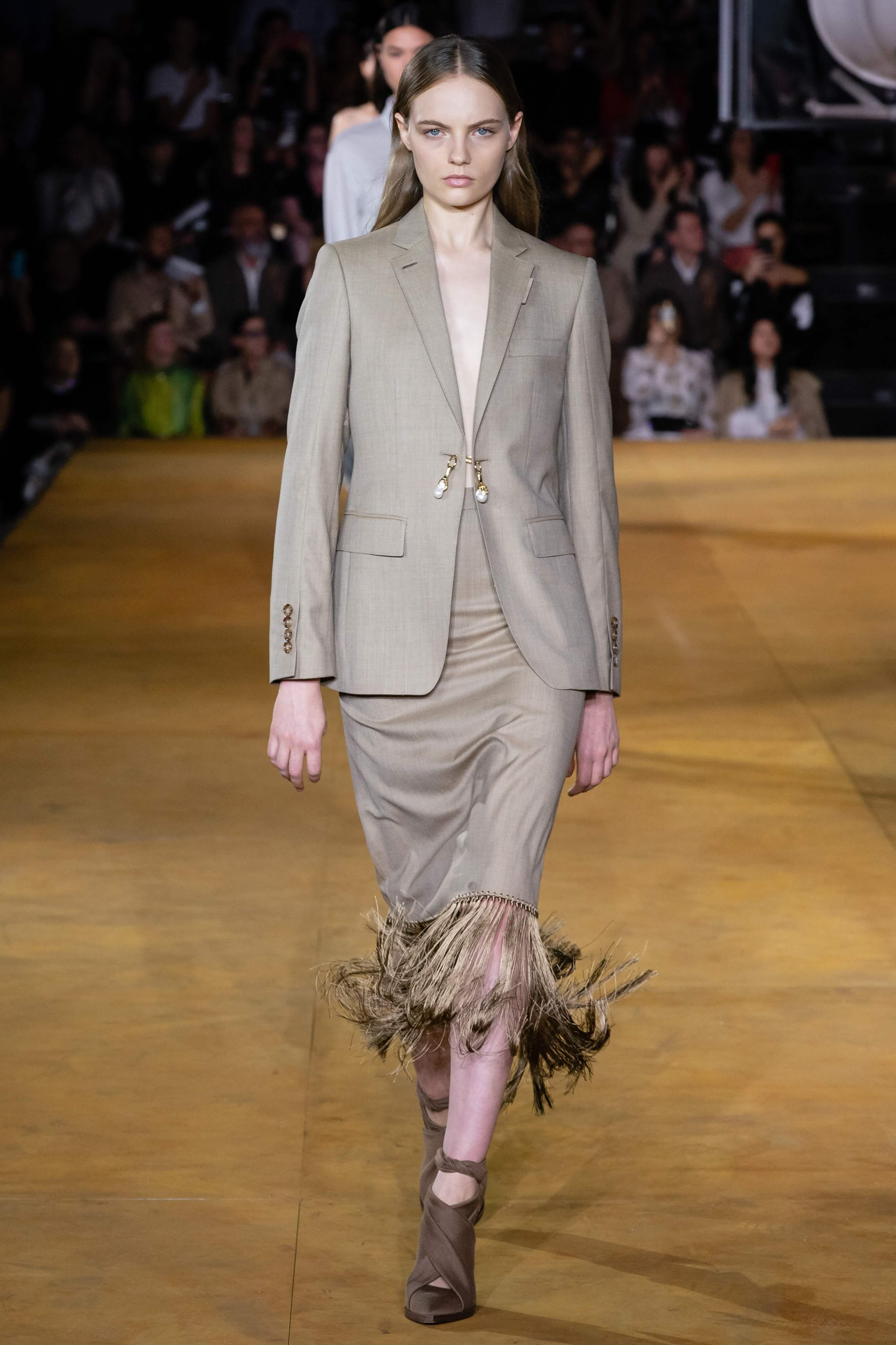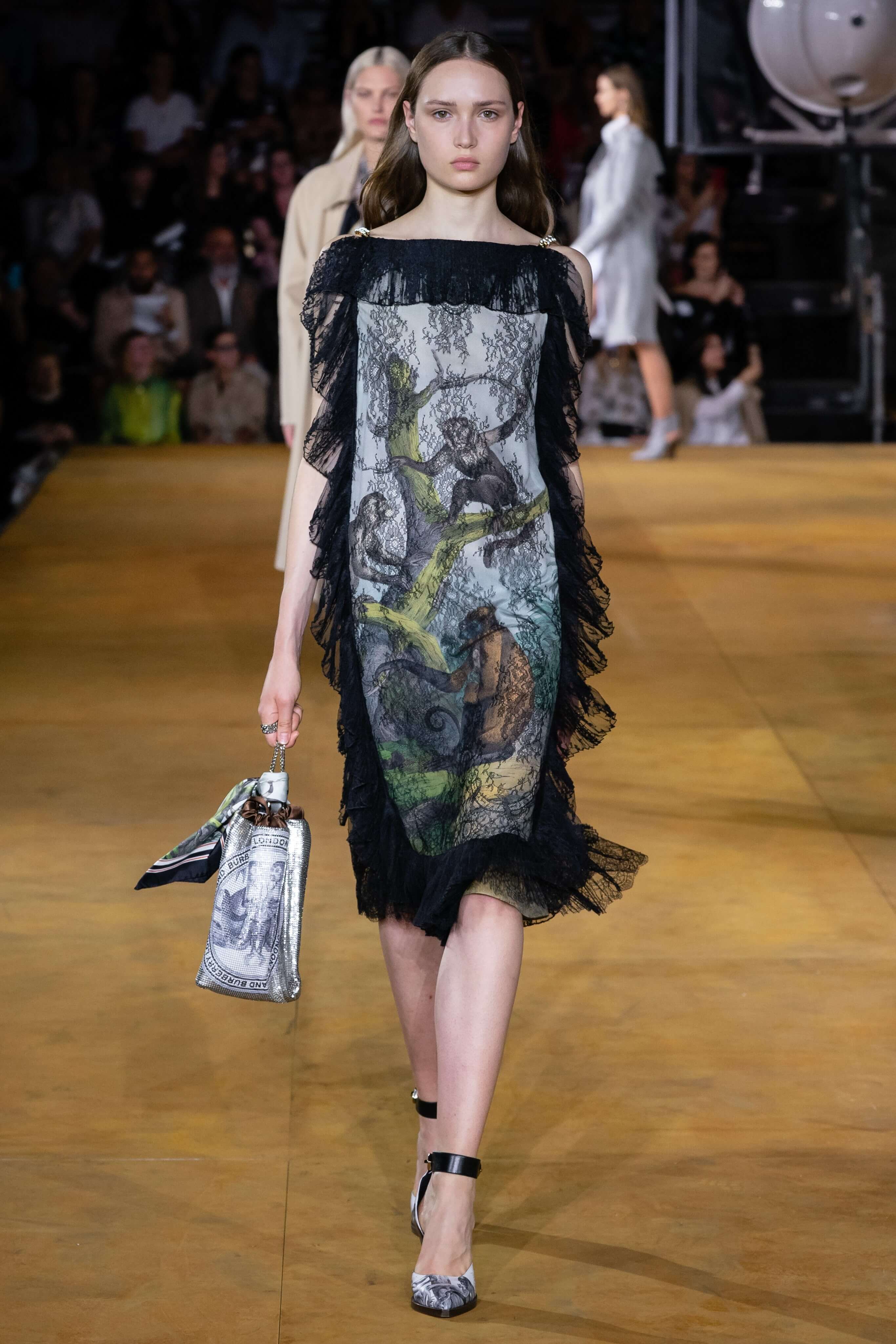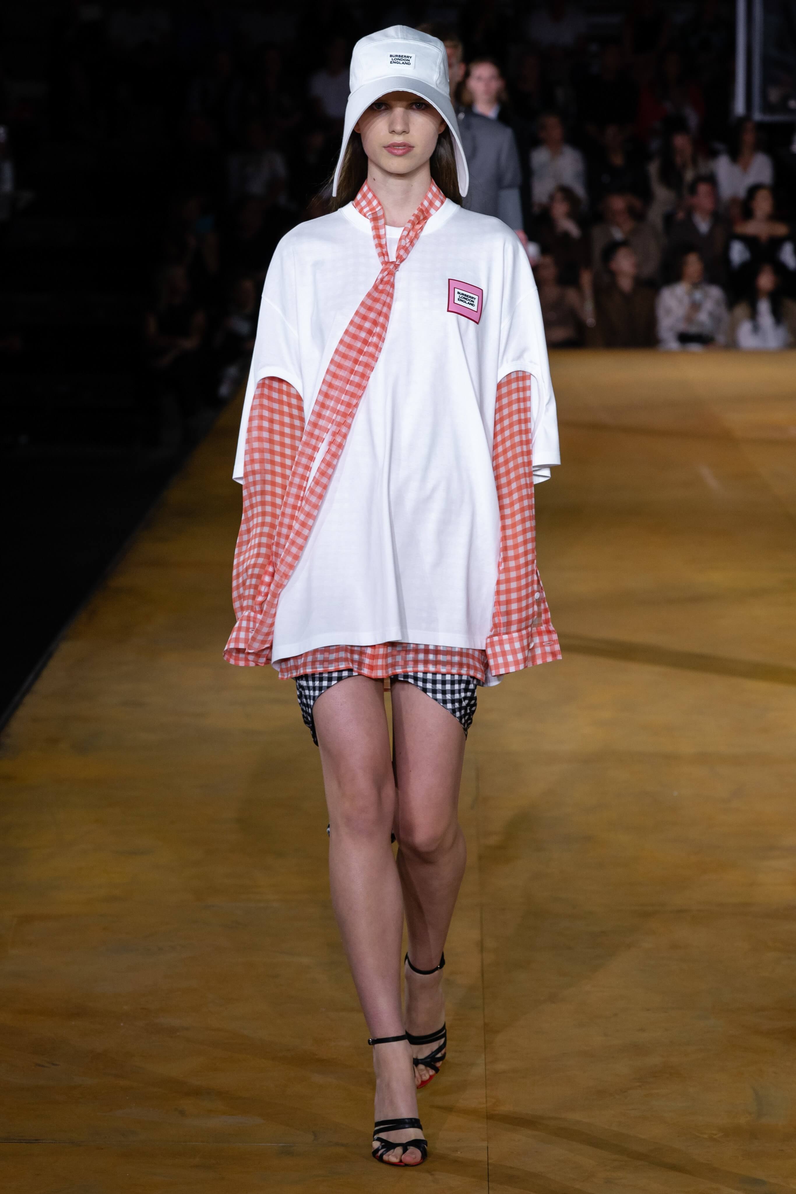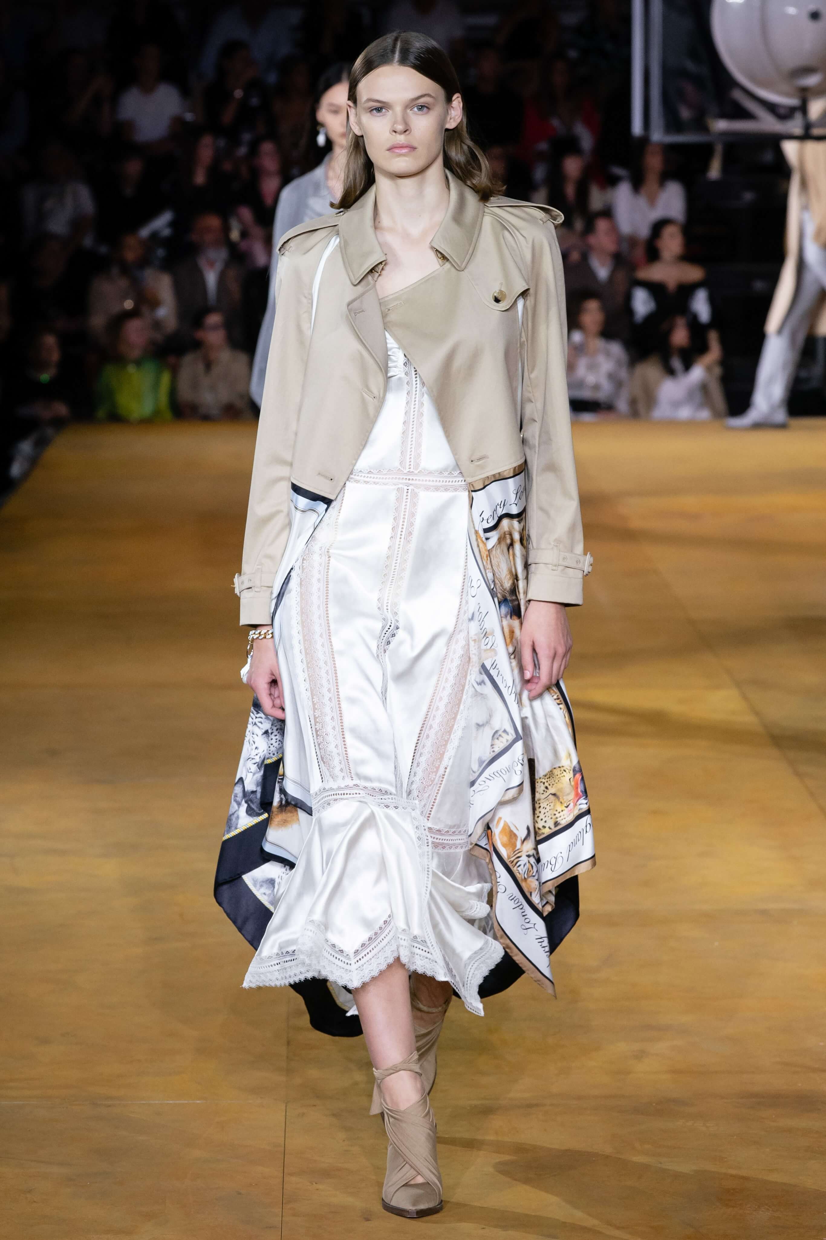 В весенней коллекции необычных и приковывающих взгляд вещей по-настоящему много: это и строгие комбинезоны с неожиданной шелковой бахромой на манжетах, и бейсбольные куртки-бомберы с застёжками на воротах, и вторящие их расцветке мини-сумочки, и удивительной красоты тренчи из хлопка с элементами шитого кружева мышино-серого цвета. Знаковыми для Burberry под началом Рикардо Тиши стали блузы из шелковых платков — в этот раз дизайнер снова умудрился создать нетривиальные силуэты из, казалось бы, однообразных инструментов. Общие стилистические решения коллекции отсылают ум к моде викторианской Англии середины 19 века, когда Томас Берберри изобрёл и модернизировал габардин и знаменитый тренч.