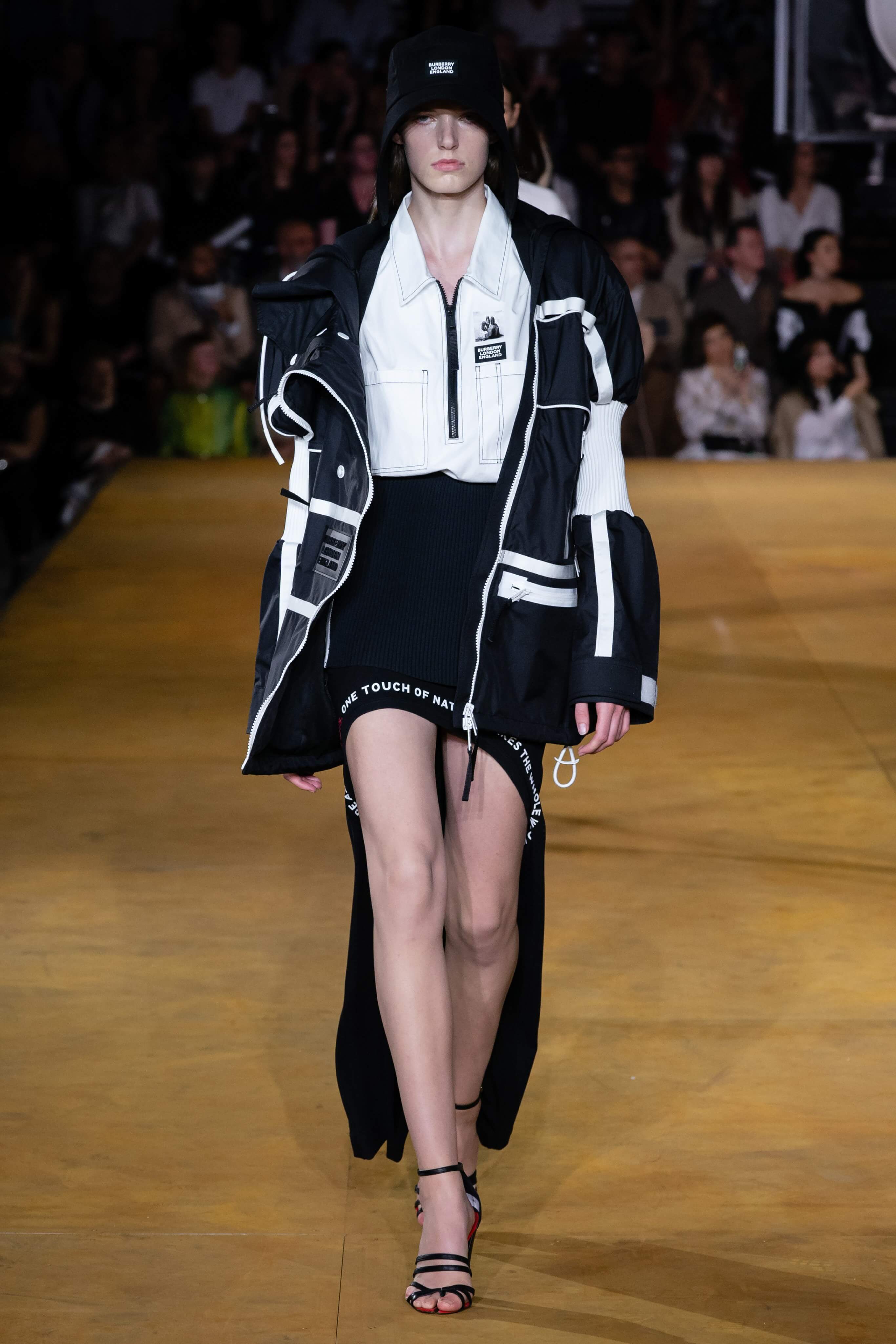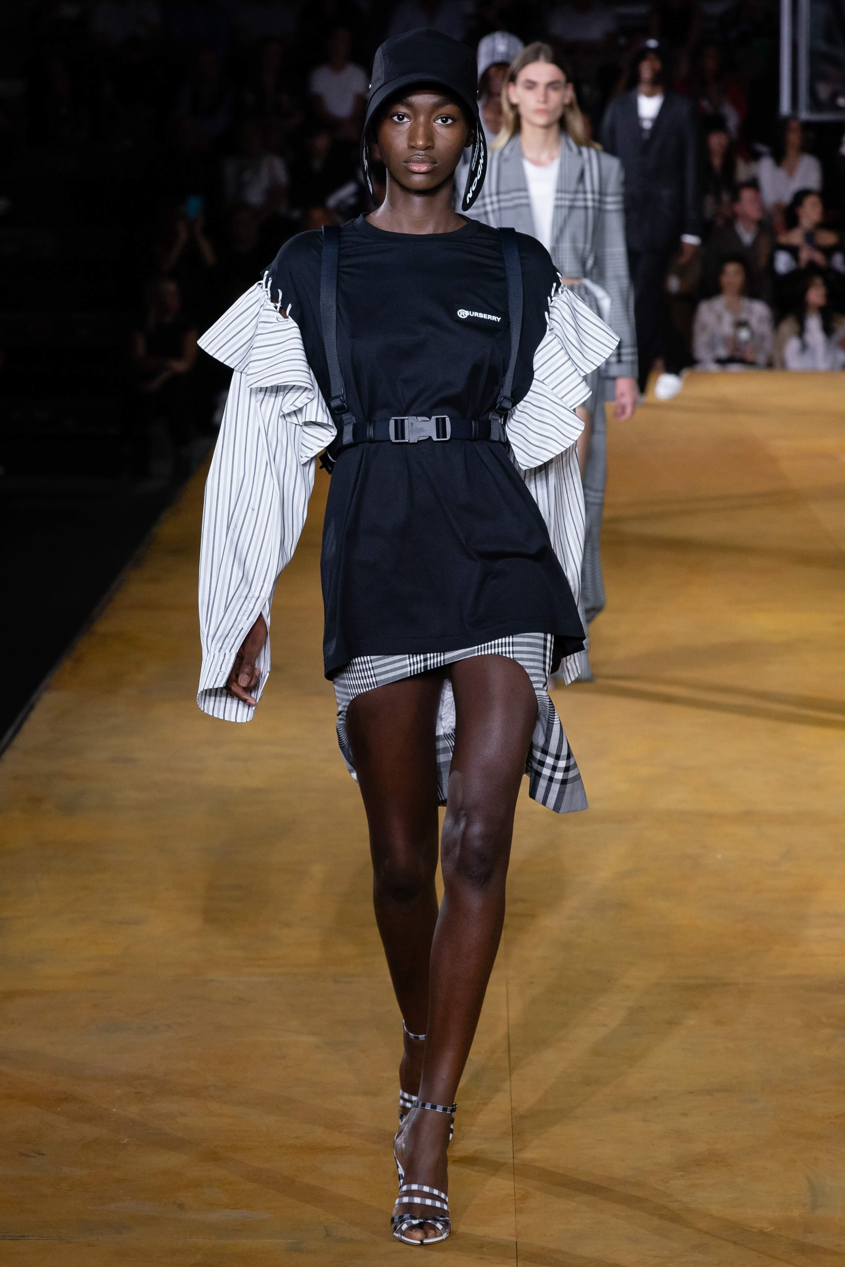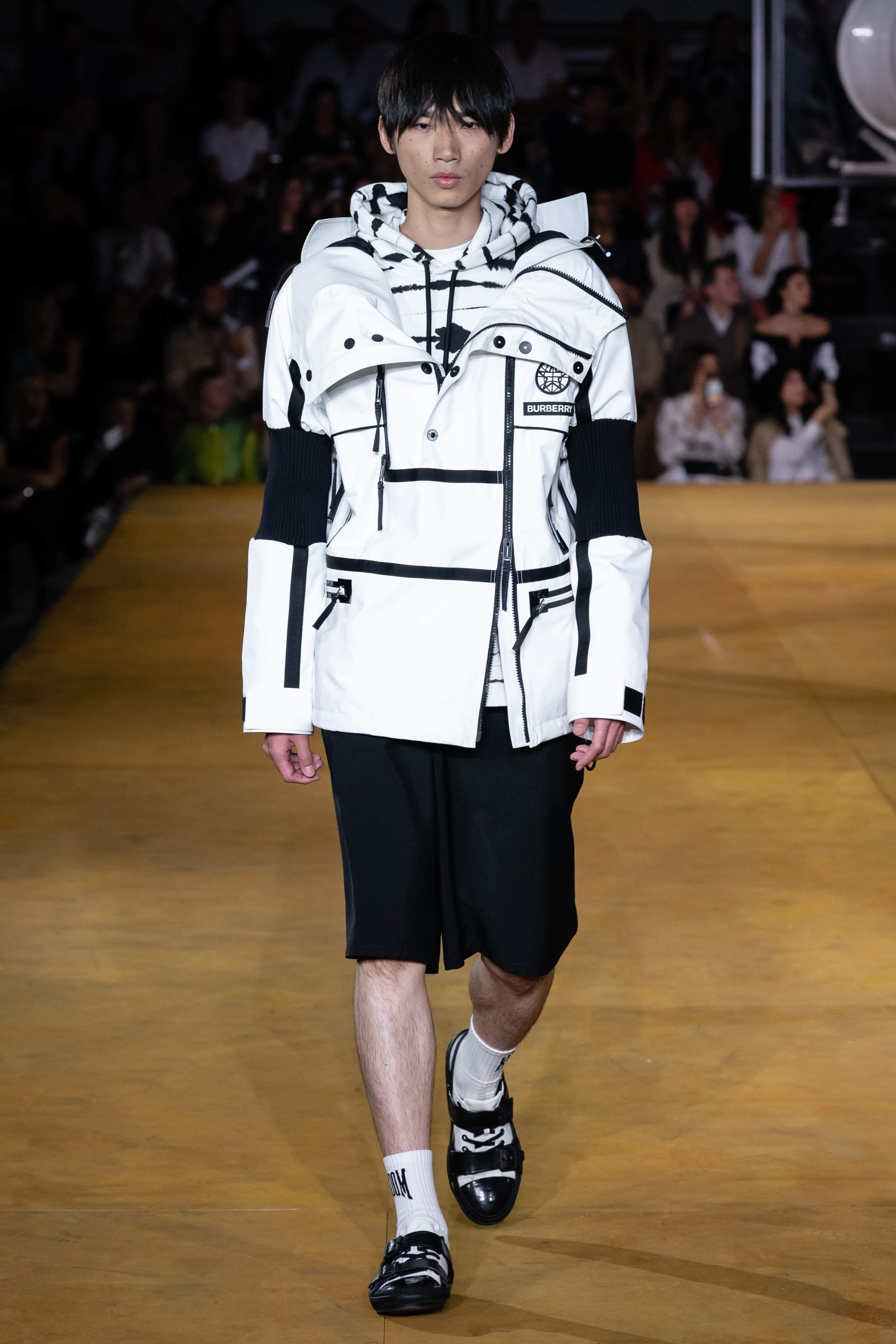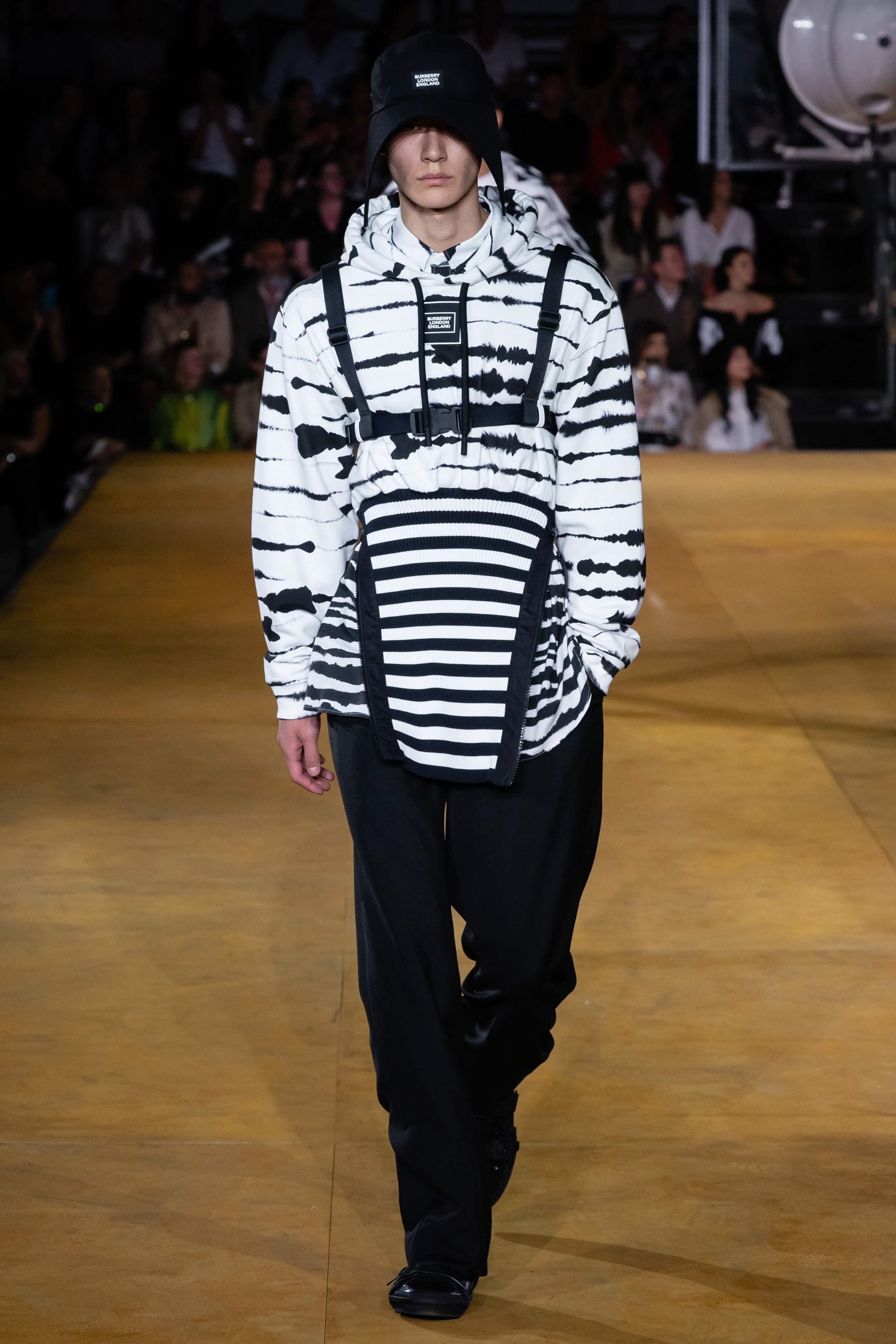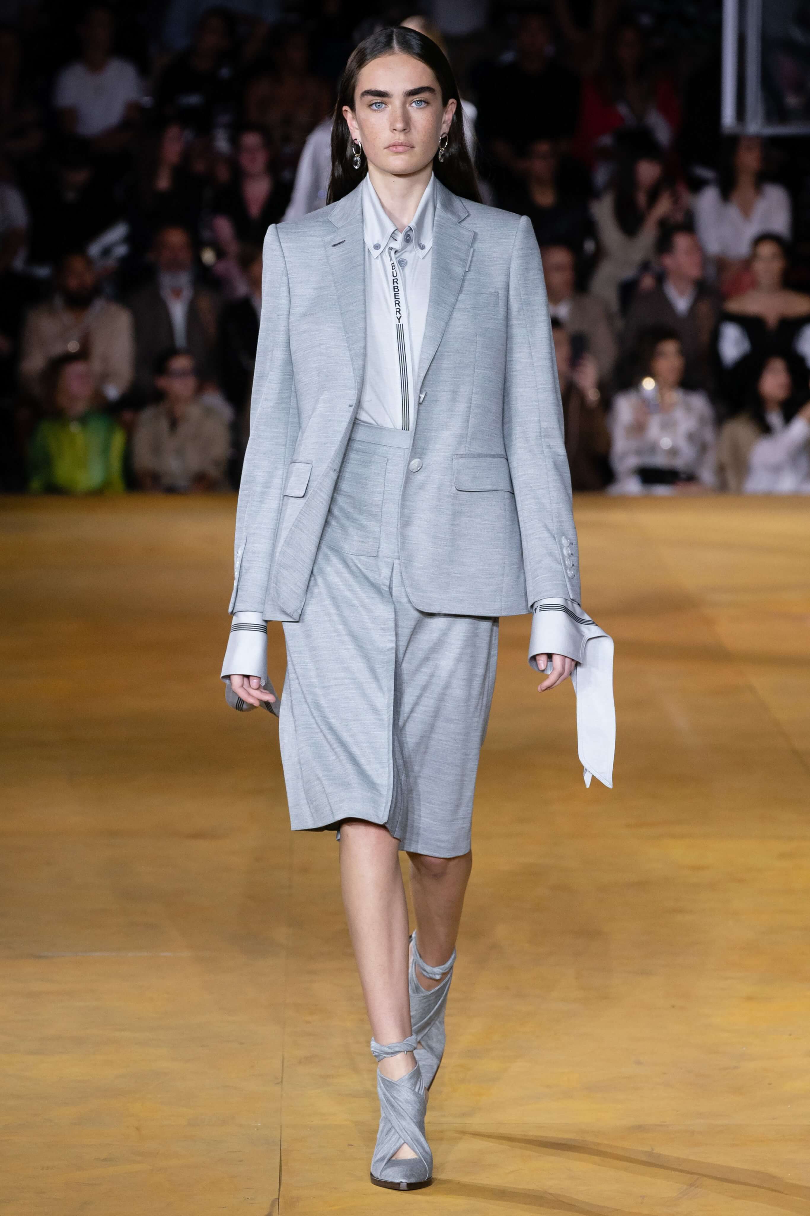 В весенней коллекции необычных и приковывающих взгляд вещей по-настоящему много: это и строгие комбинезоны с неожиданной шелковой бахромой на манжетах, и бейсбольные куртки-бомберы с застёжками на воротах, и вторящие их расцветке мини-сумочки, и удивительной красоты тренчи из хлопка с элементами шитого кружева мышино-серого цвета. Знаковыми для Burberry под началом Рикардо Тиши стали блузы из шелковых платков — в этот раз дизайнер снова умудрился создать нетривиальные силуэты из, казалось бы, однообразных инструментов. Общие стилистические решения коллекции отсылают ум к моде викторианской Англии середины 19 века, когда Томас Берберри изобрёл и модернизировал габардин и знаменитый тренч.
