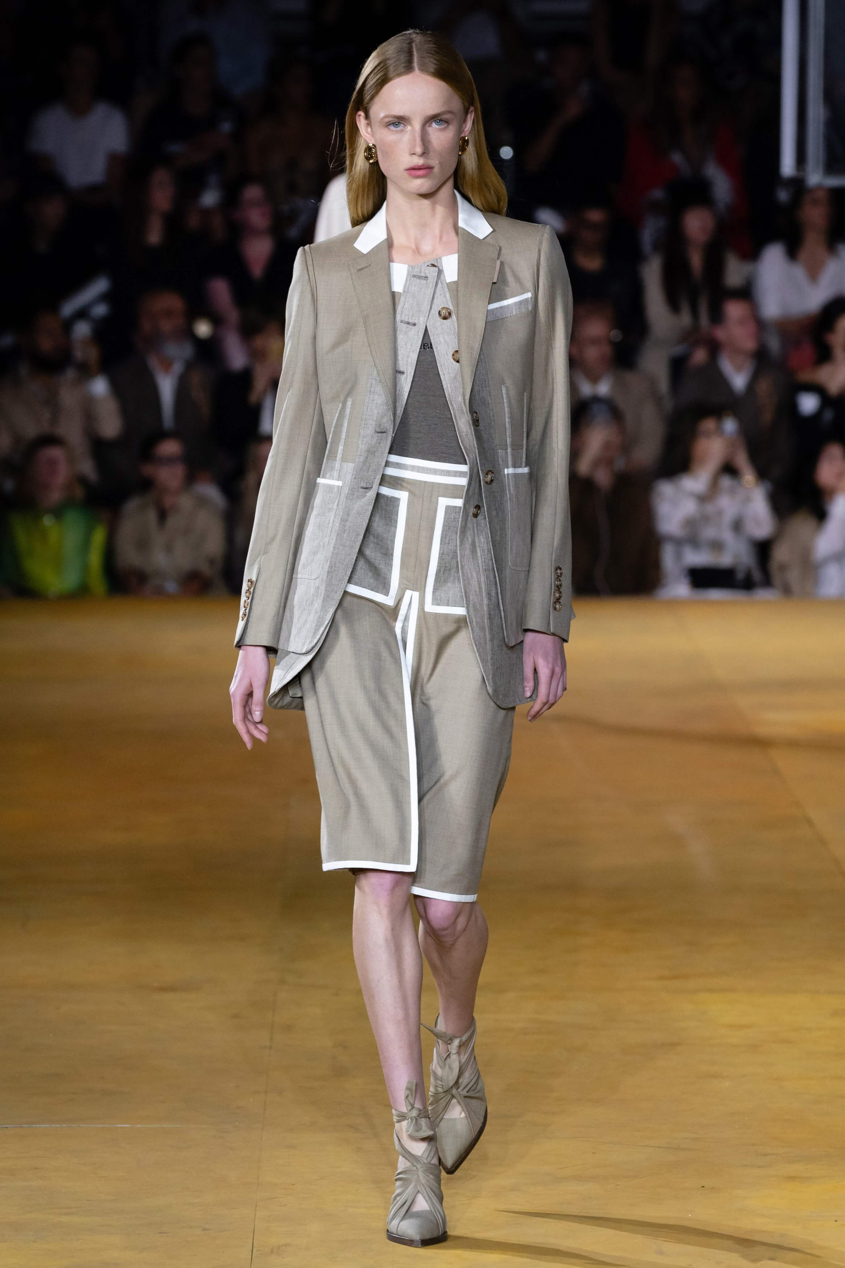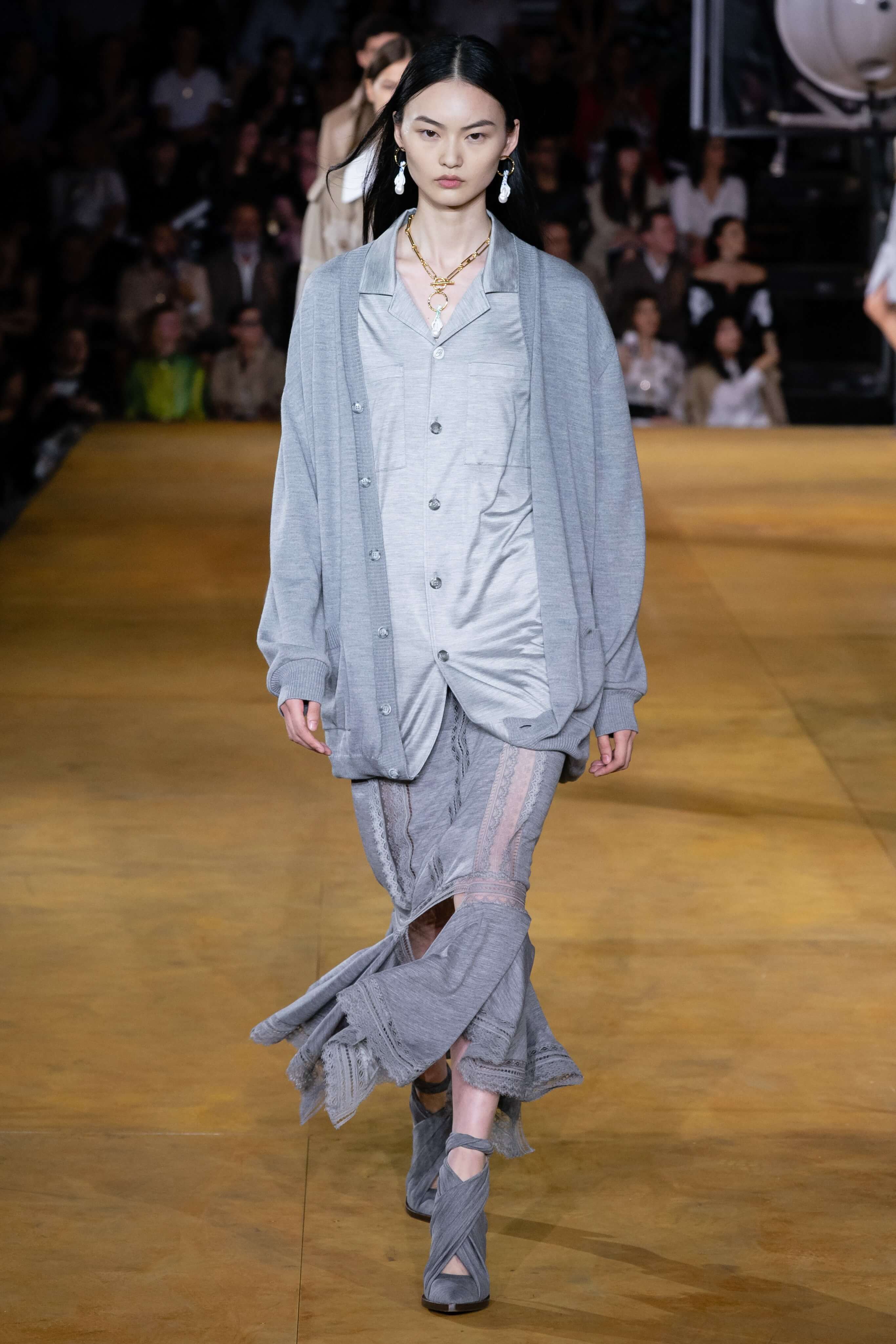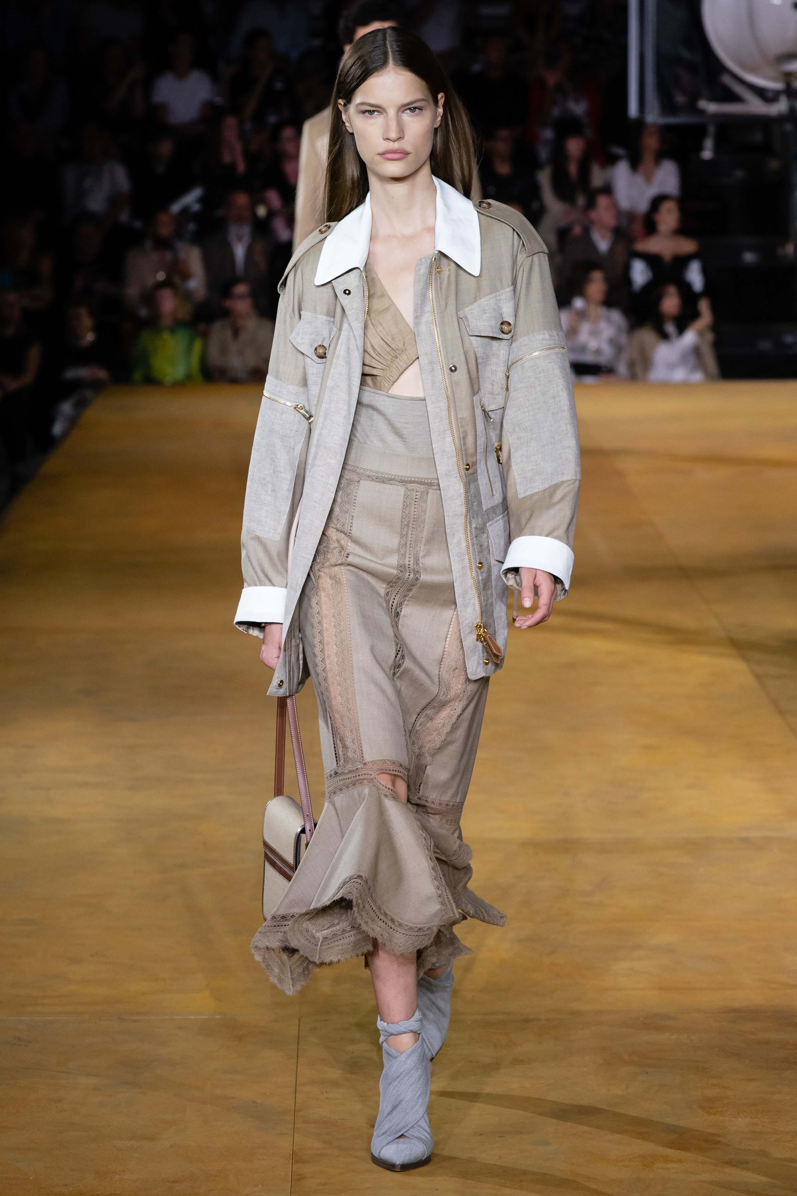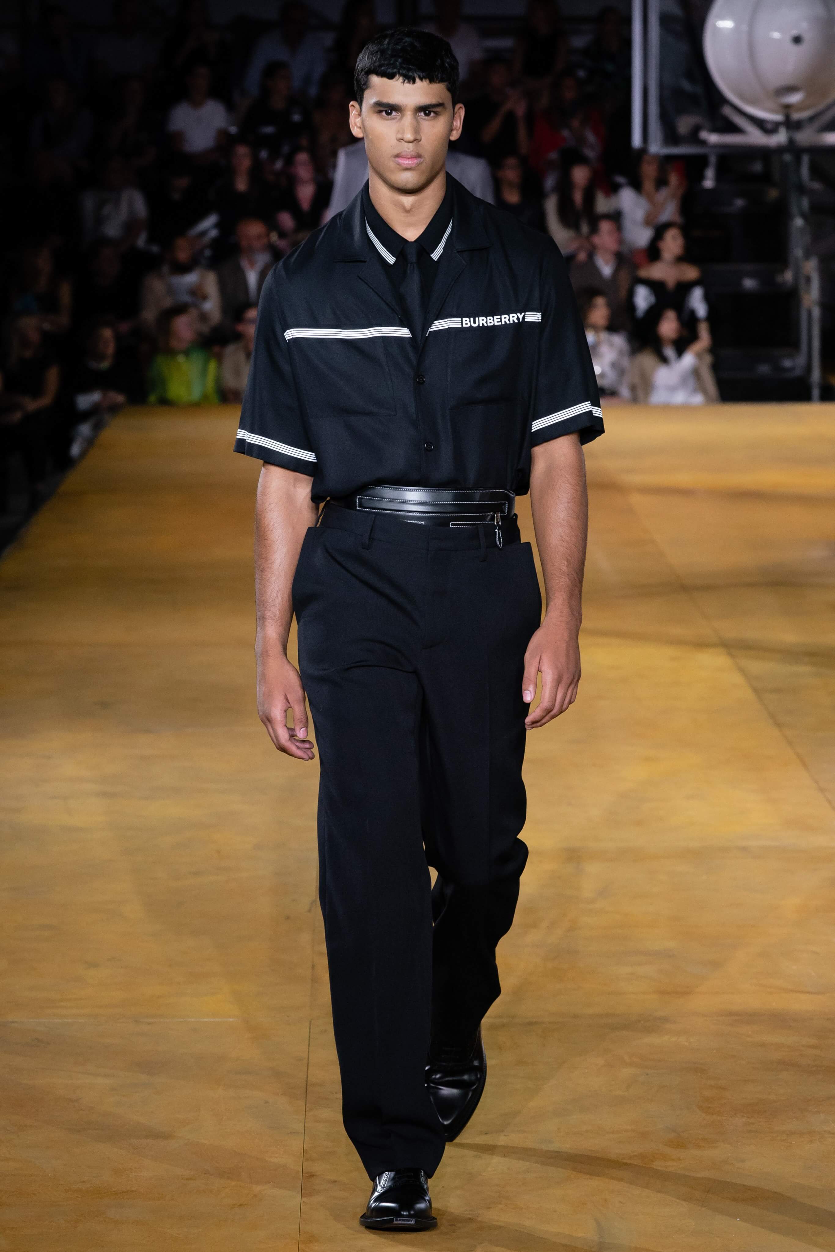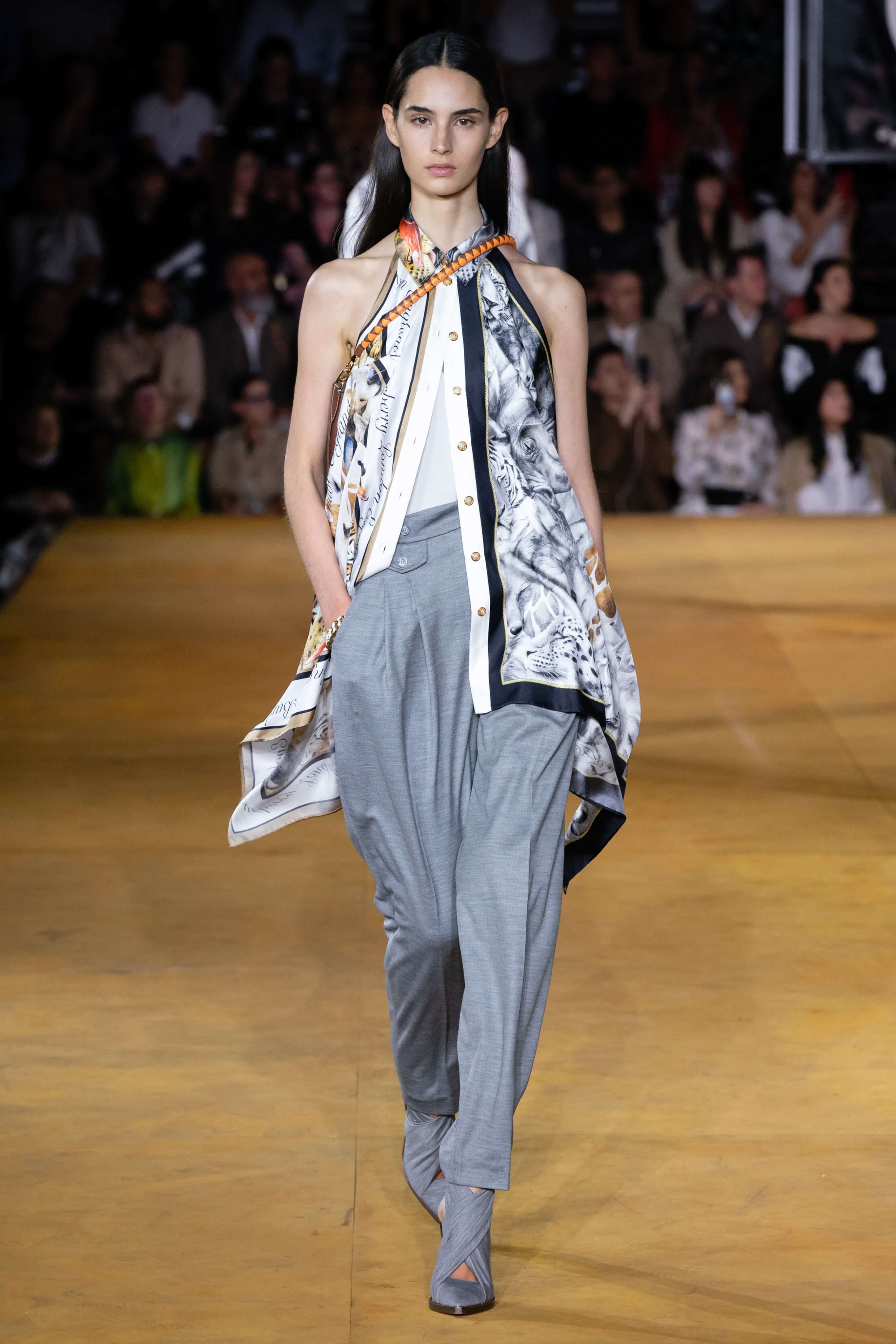 В весенней коллекции необычных и приковывающих взгляд вещей по-настоящему много: это и строгие комбинезоны с неожиданной шелковой бахромой на манжетах, и бейсбольные куртки-бомберы с застёжками на воротах, и вторящие их расцветке мини-сумочки, и удивительной красоты тренчи из хлопка с элементами шитого кружева мышино-серого цвета. Знаковыми для Burberry под началом Рикардо Тиши стали блузы из шелковых платков — в этот раз дизайнер снова умудрился создать нетривиальные силуэты из, казалось бы, однообразных инструментов. Общие стилистические решения коллекции отсылают ум к моде викторианской Англии середины 19 века, когда Томас Берберри изобрёл и модернизировал габардин и знаменитый тренч.