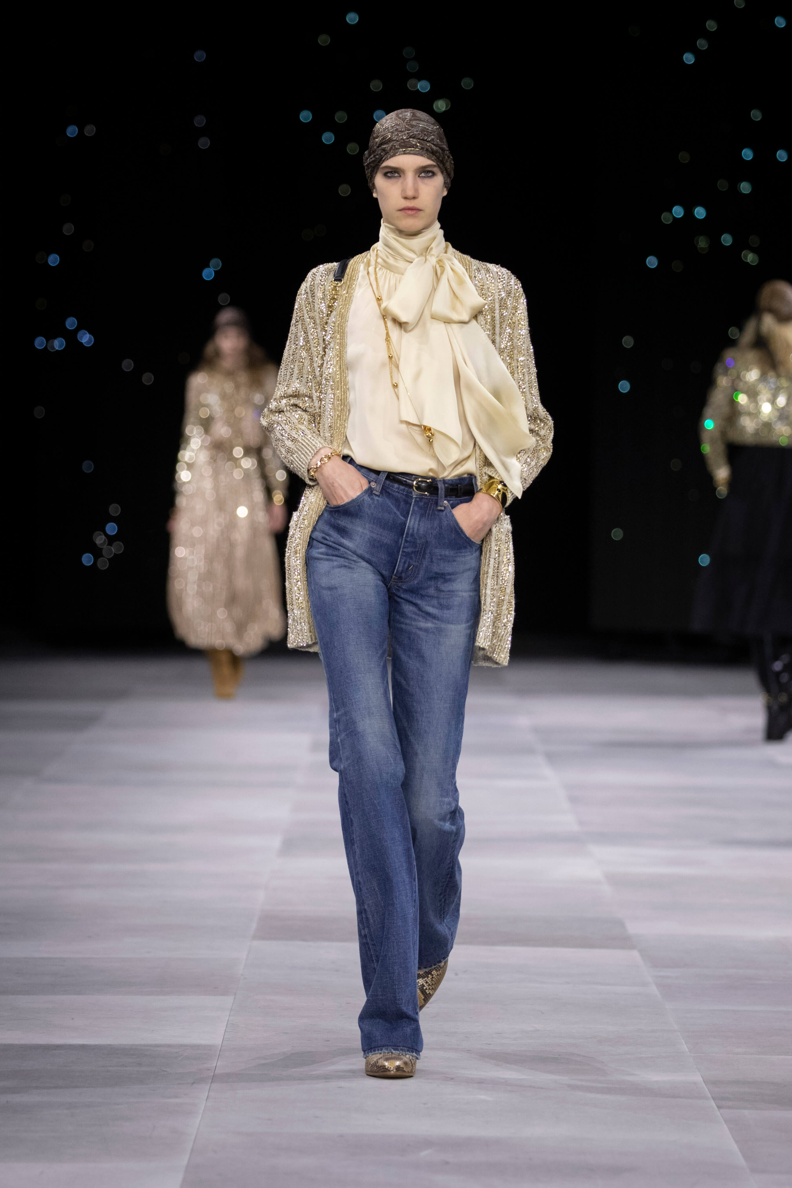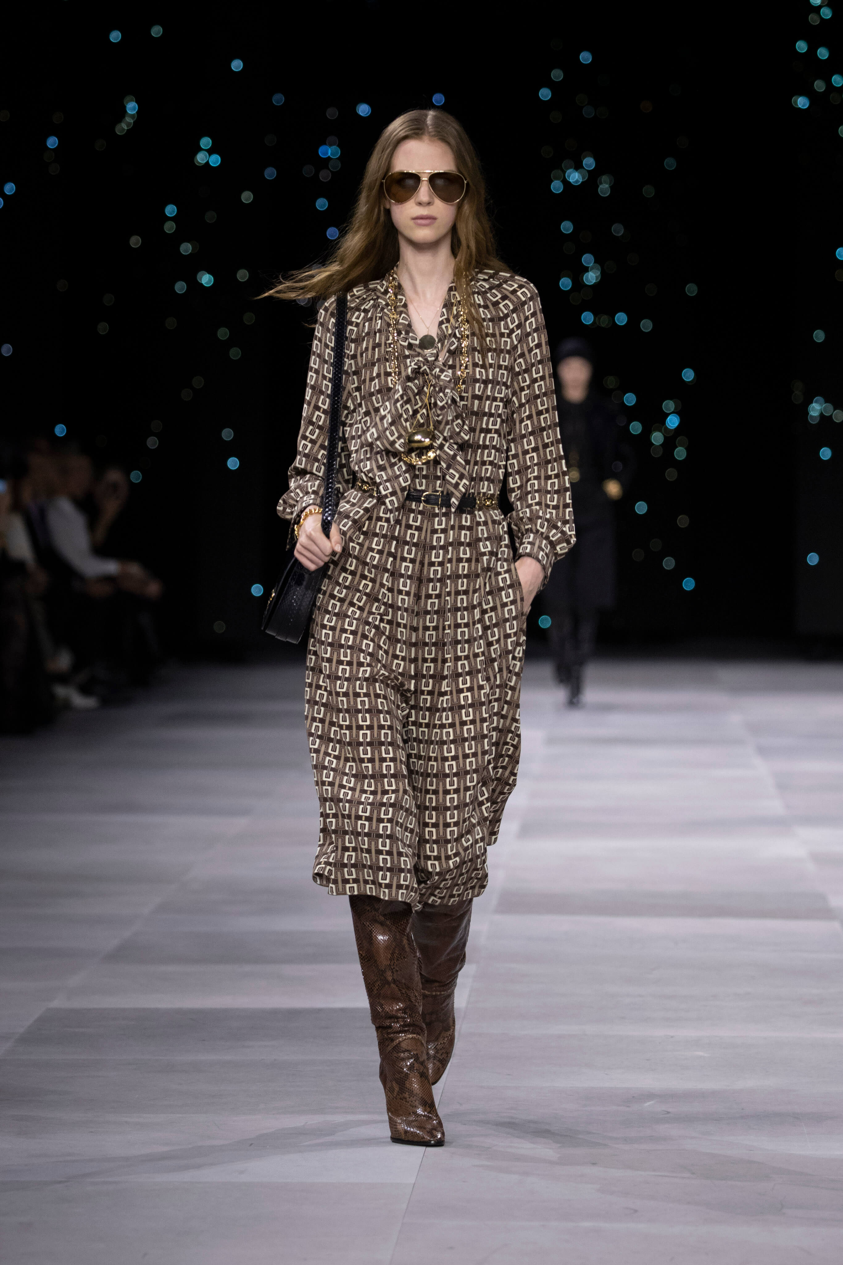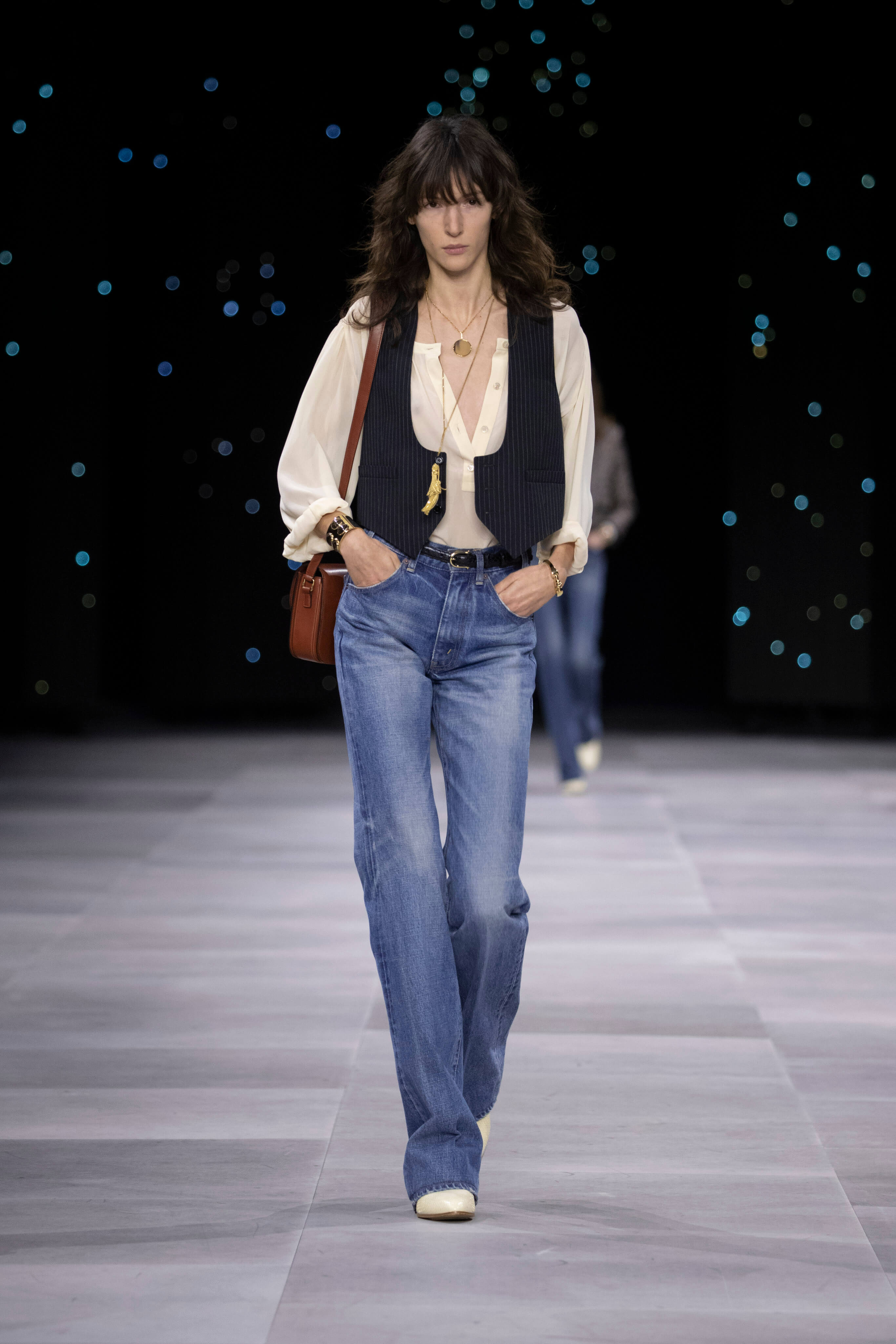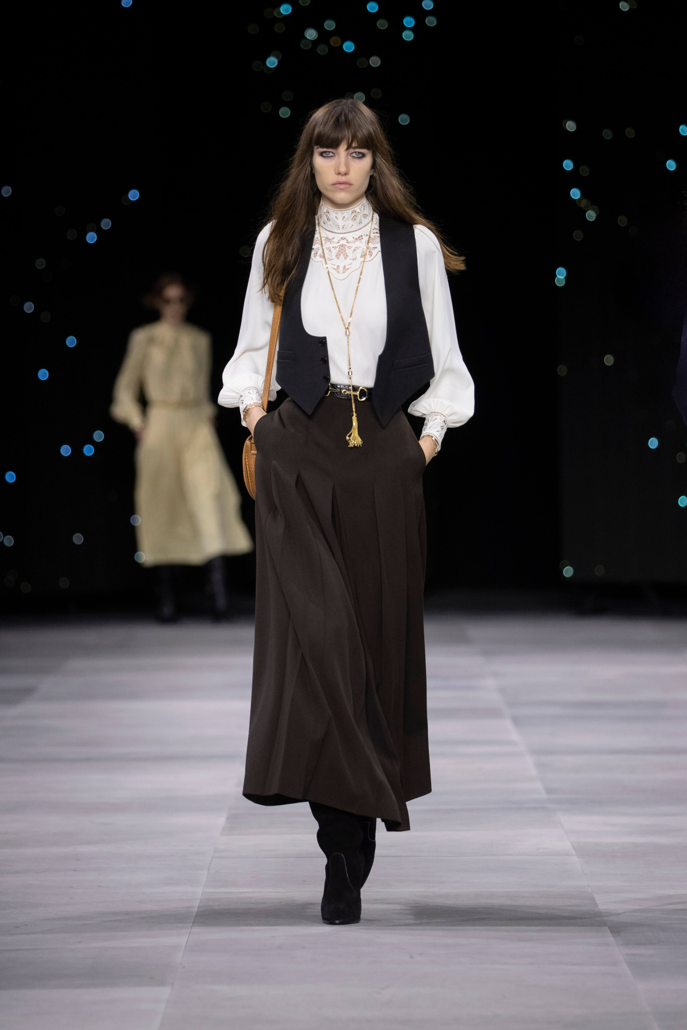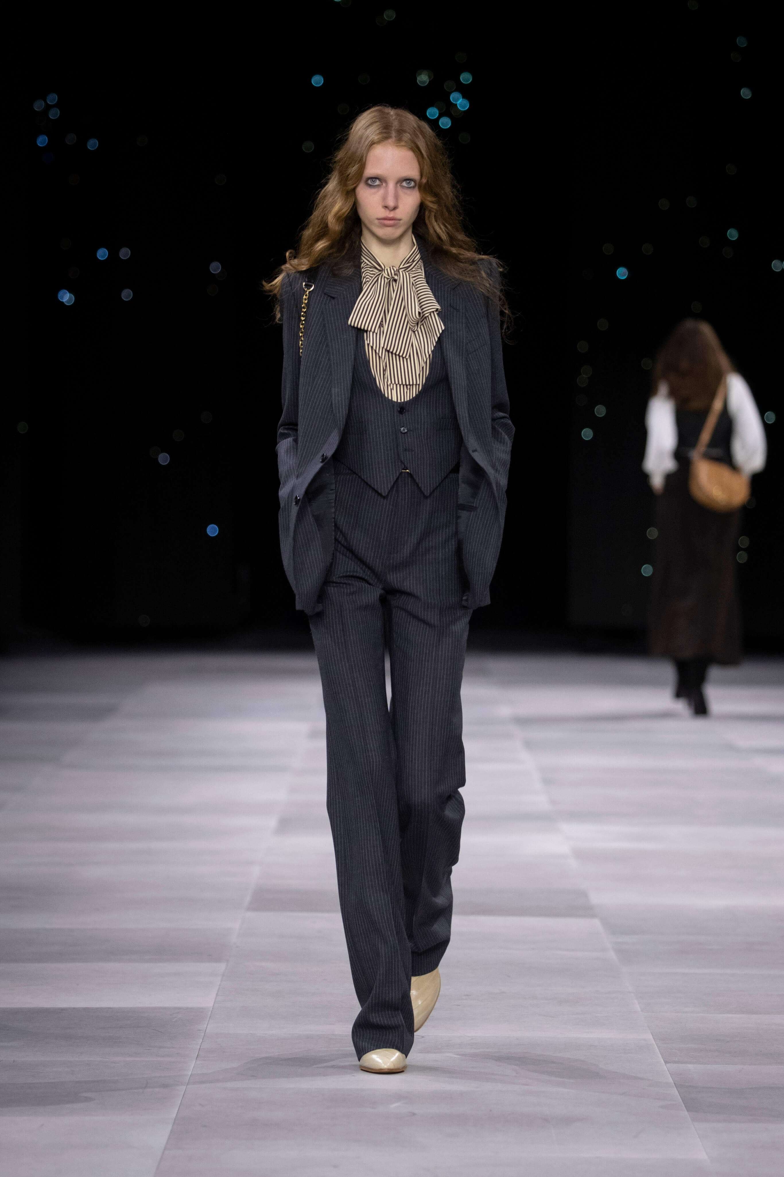 Назначение Слимана на пост креативного директора Celinе наделало немало шума, так что гостей на его показах собирается рекордное количество. Сам Эди не изменяет себе и с чувством и толком разбирает архивы бренда. Модели выходили в укороченных шубах и дублёнках, надетых поверх платьев, расшитых мерцающими нитями и вместе с песочными рубашками и узкими расклешенными джинсами, юбках миди, пёстрых блузах с бантами.