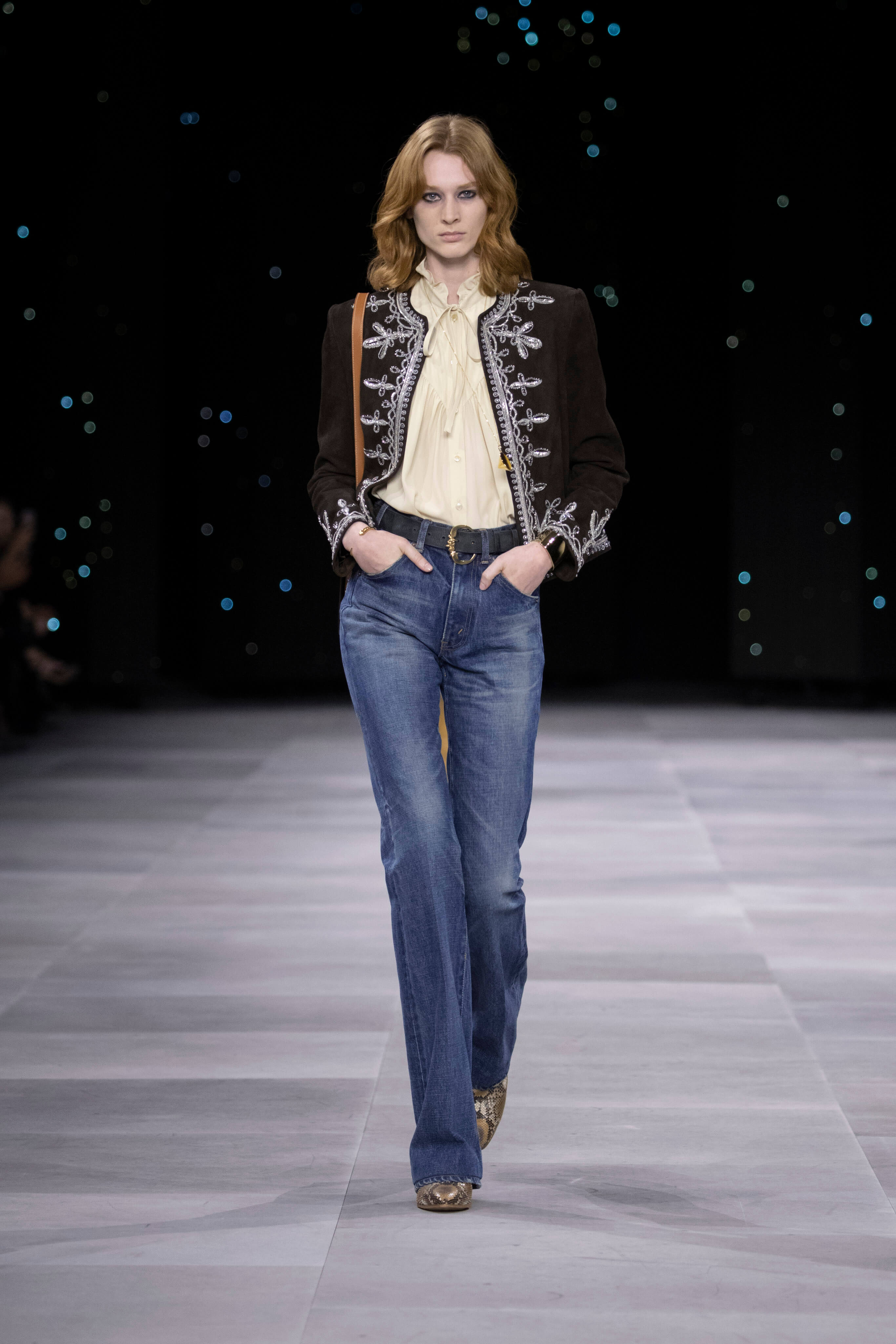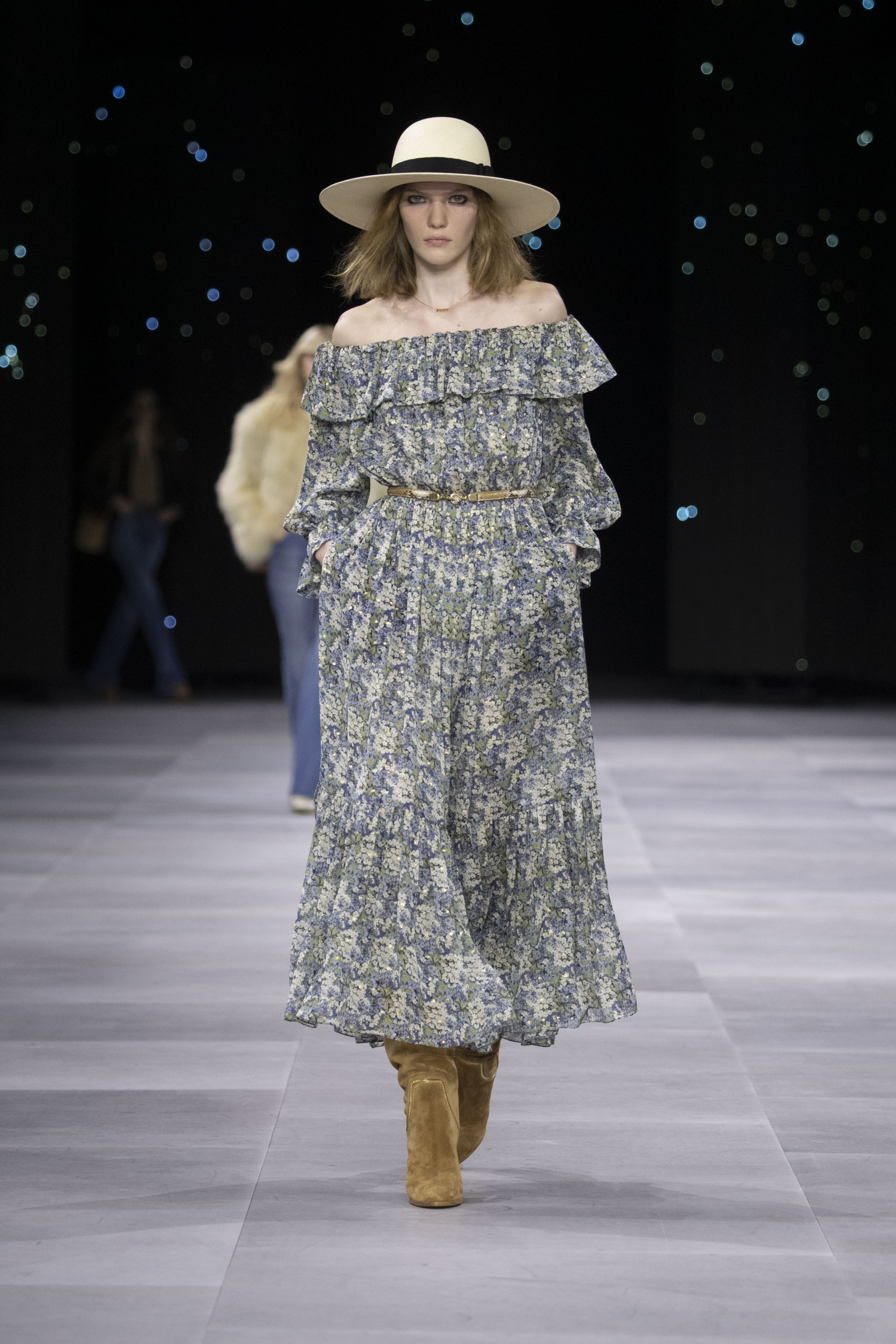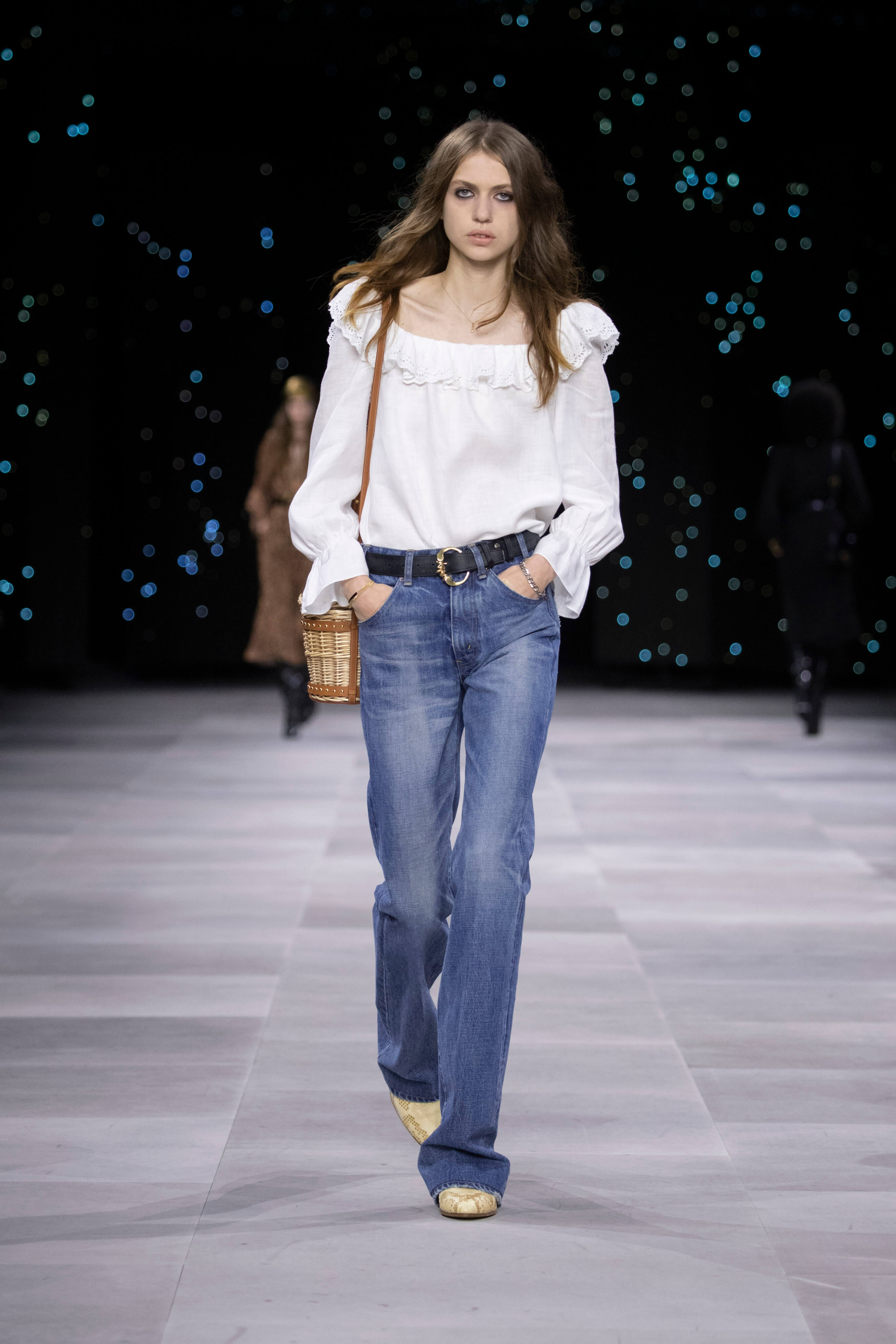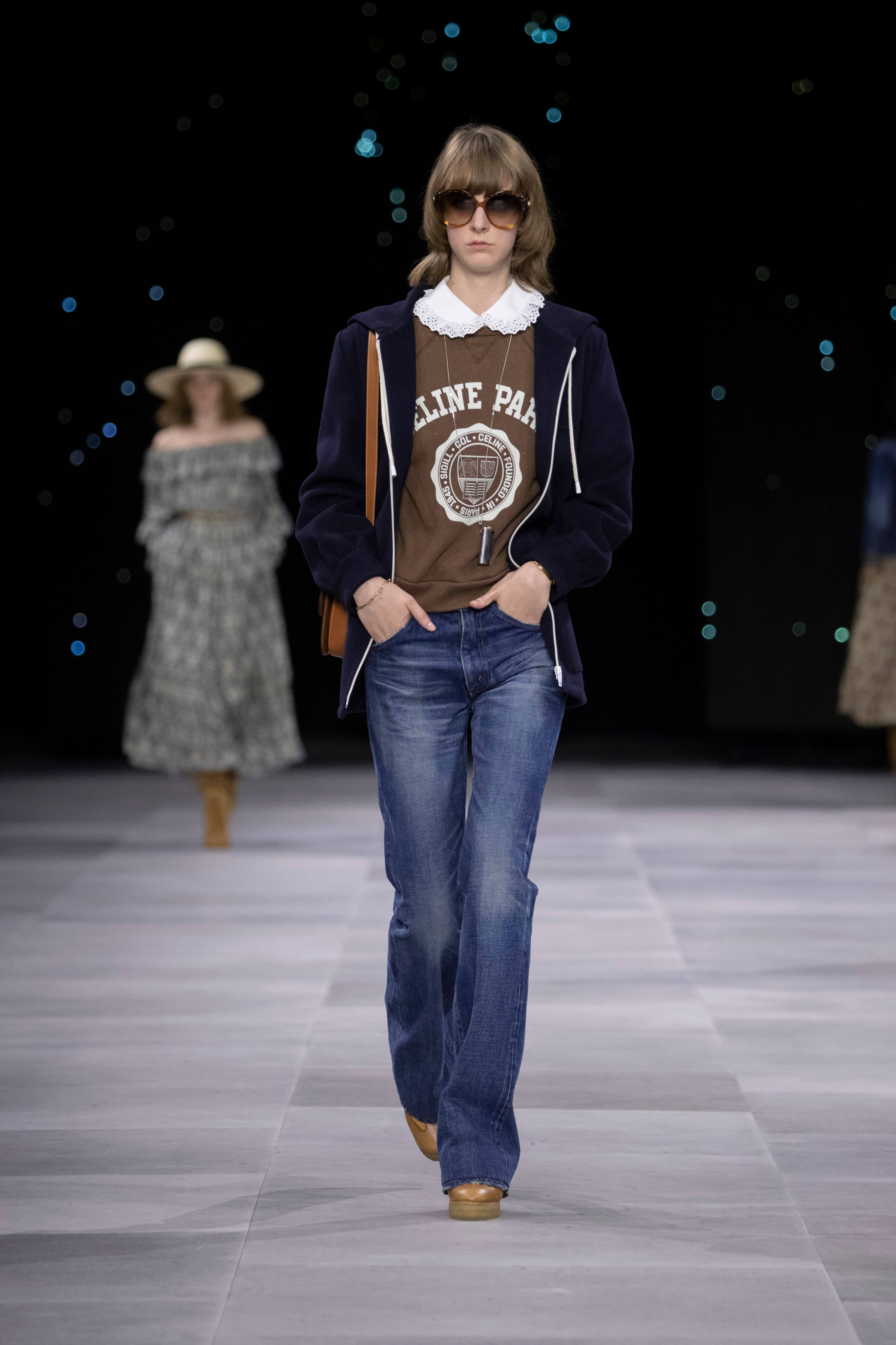 Назначение Слимана на пост креативного директора Celinе наделало немало шума, так что гостей на его показах собирается рекордное количество. Сам Эди не изменяет себе и с чувством и толком разбирает архивы бренда. Модели выходили в укороченных шубах и дублёнках, надетых поверх платьев, расшитых мерцающими нитями и вместе с песочными рубашками и узкими расклешенными джинсами, юбках миди, пёстрых блузах с бантами.