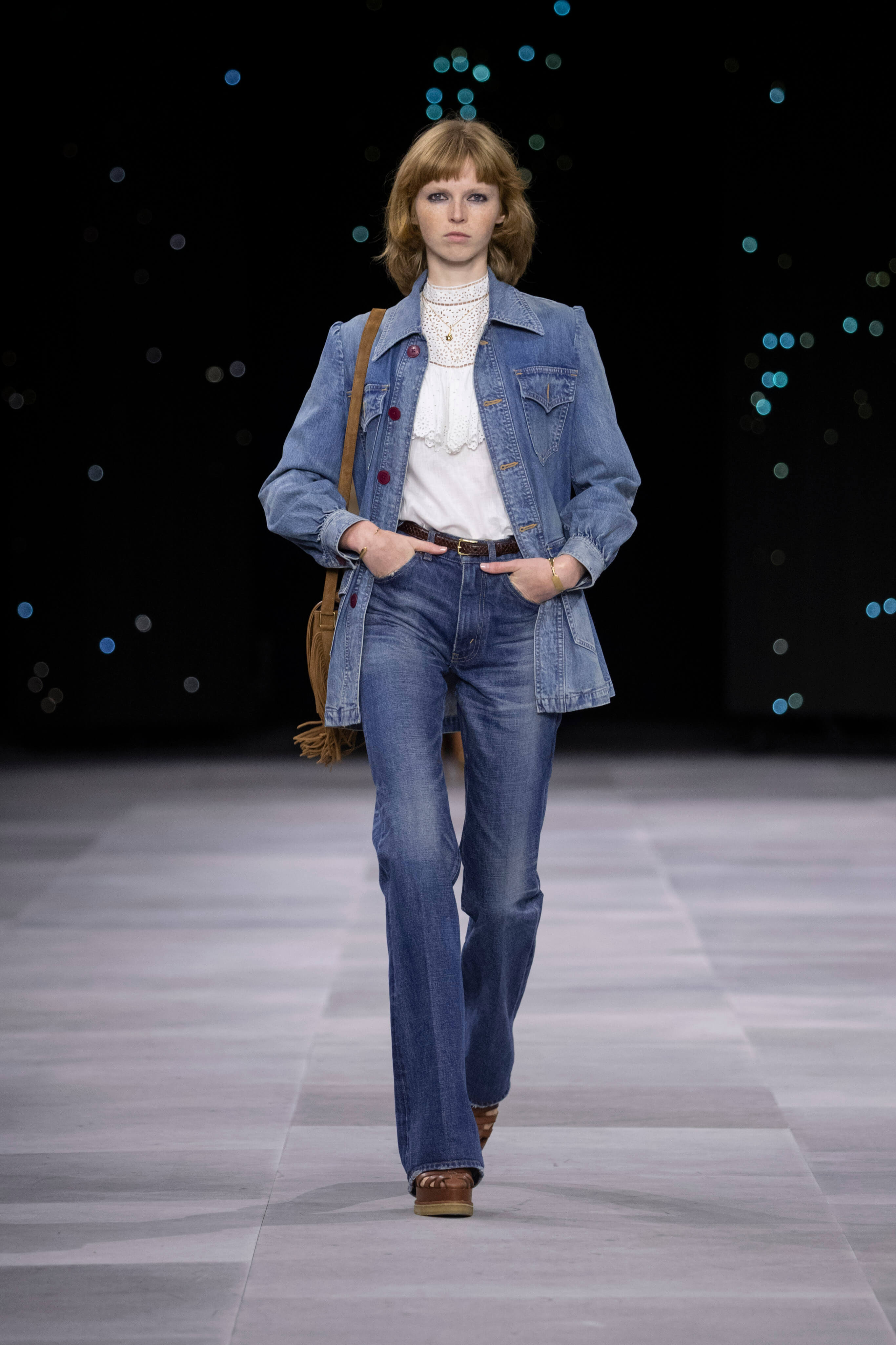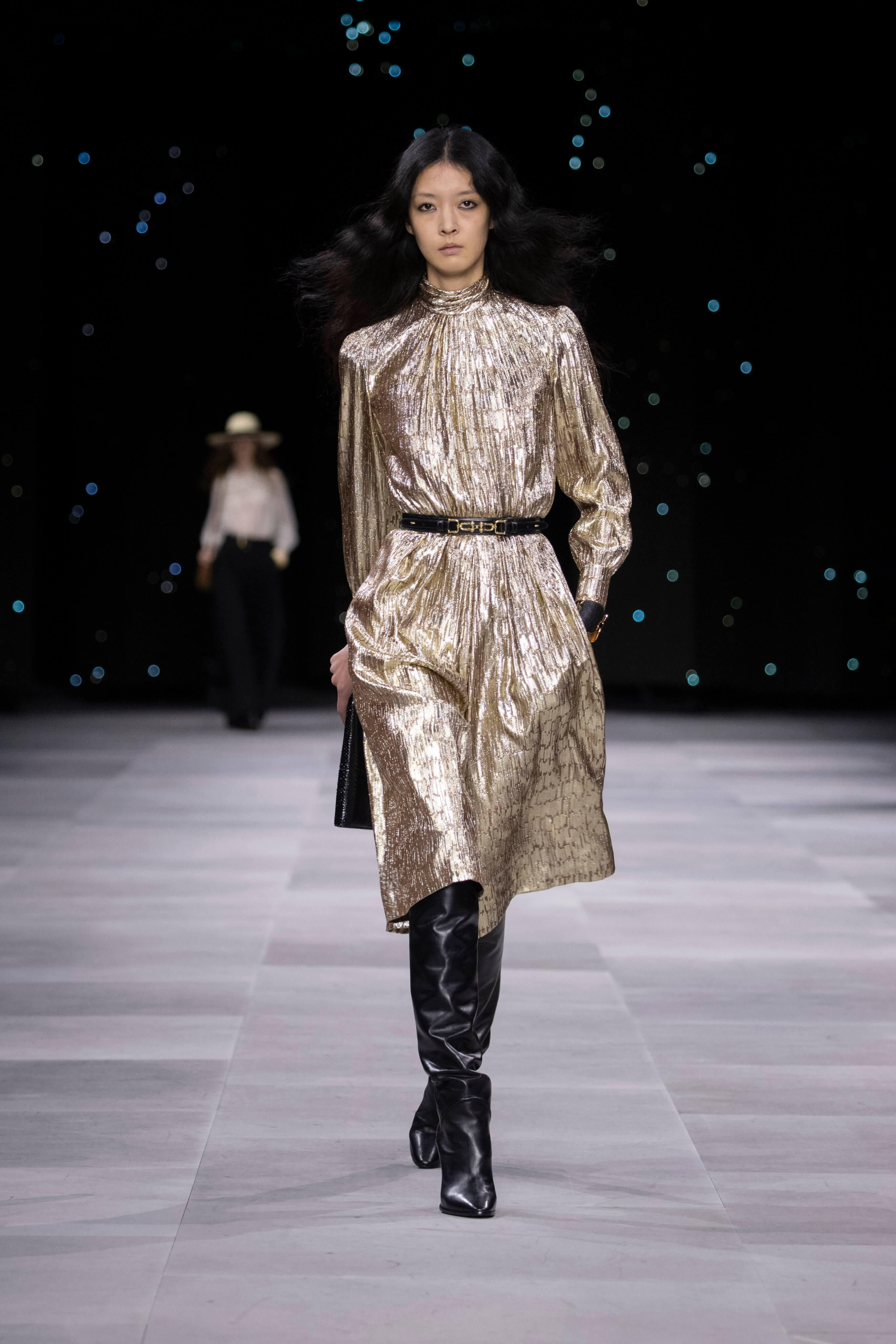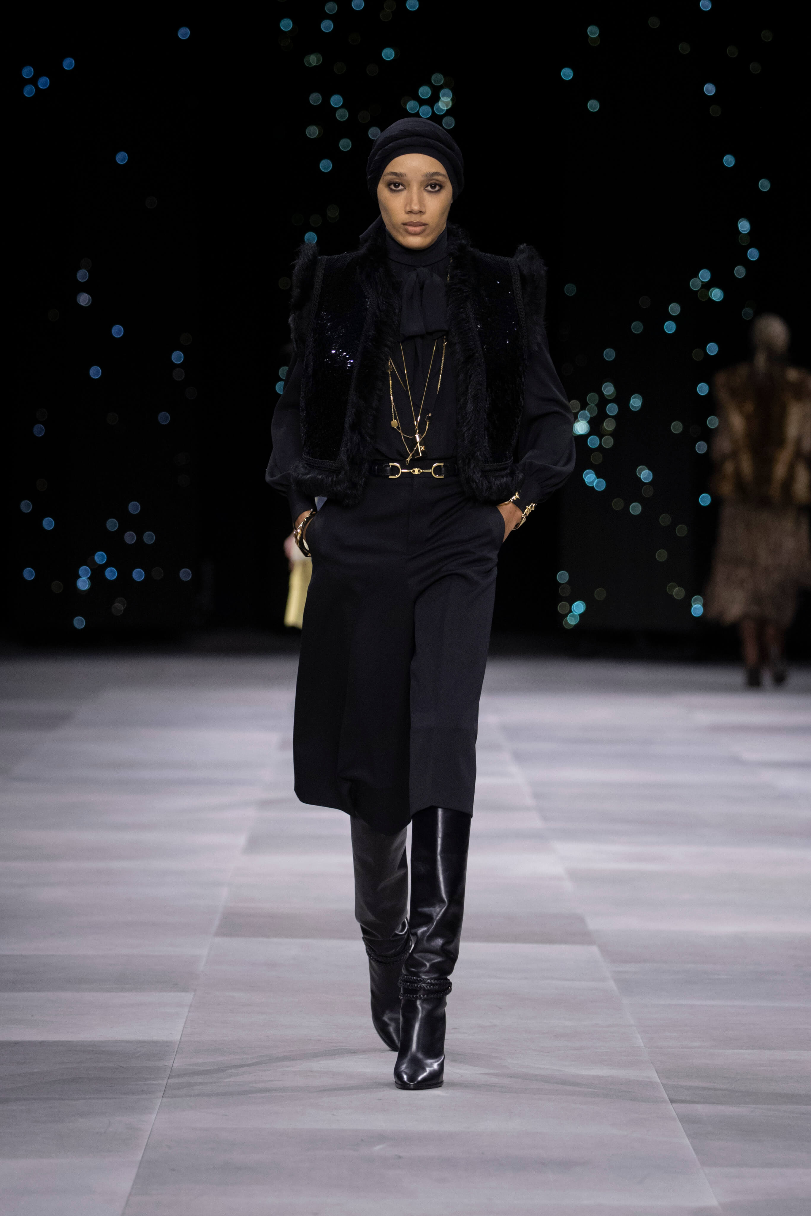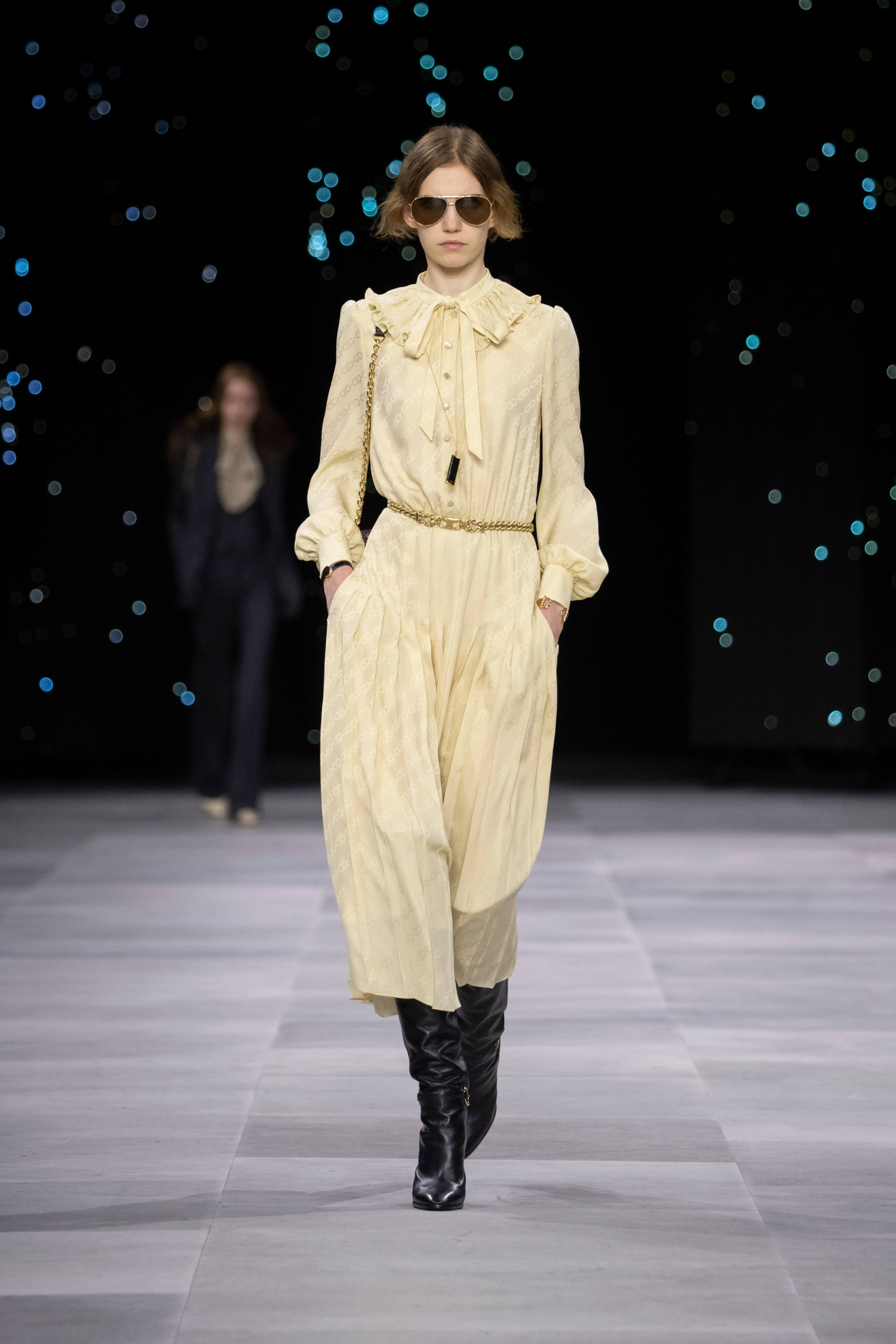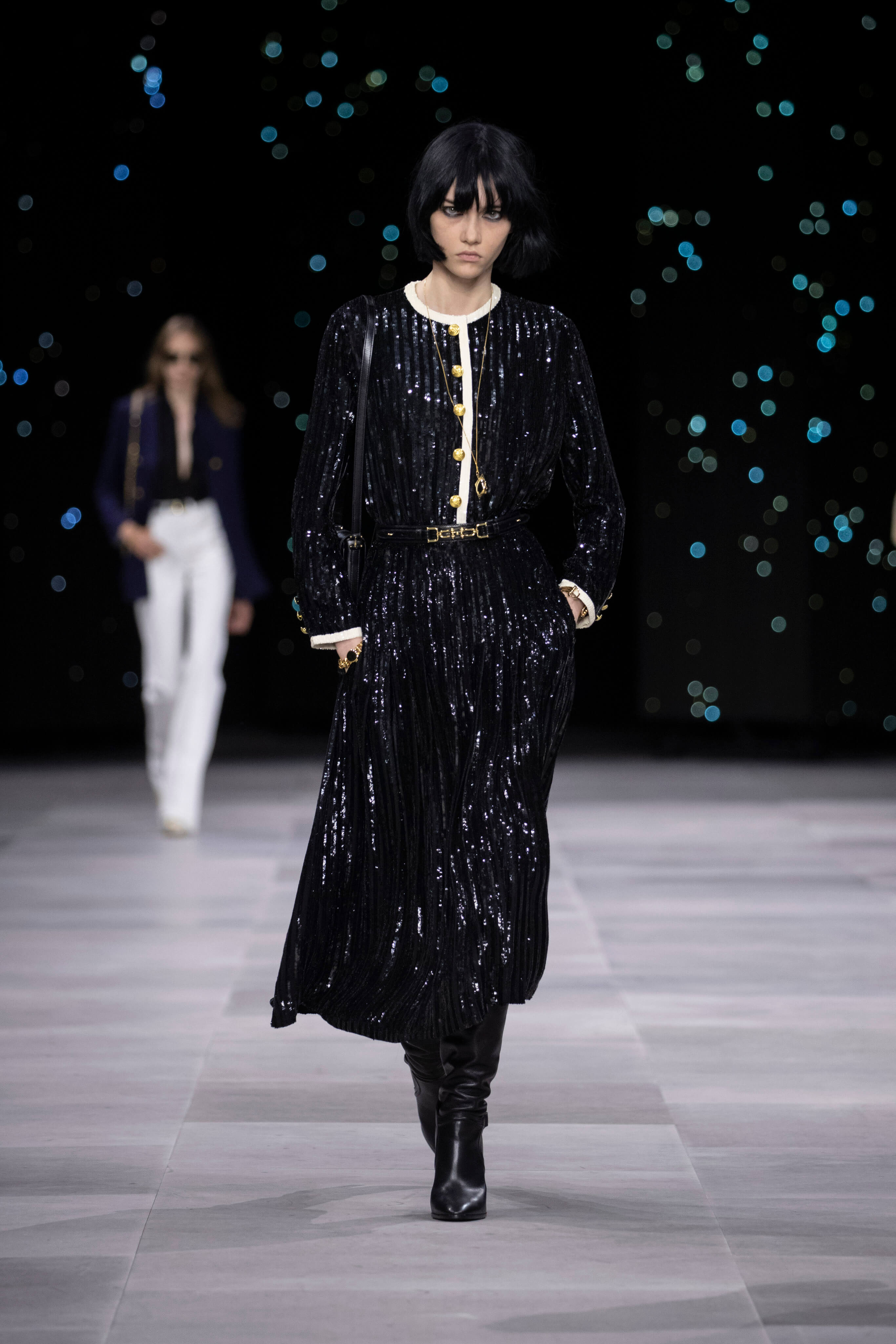 Назначение Слимана на пост креативного директора Celinе наделало немало шума, так что гостей на его показах собирается рекордное количество. Сам Эди не изменяет себе и с чувством и толком разбирает архивы бренда. Модели выходили в укороченных шубах и дублёнках, надетых поверх платьев, расшитых мерцающими нитями и вместе с песочными рубашками и узкими расклешенными джинсами, юбках миди, пёстрых блузах с бантами.