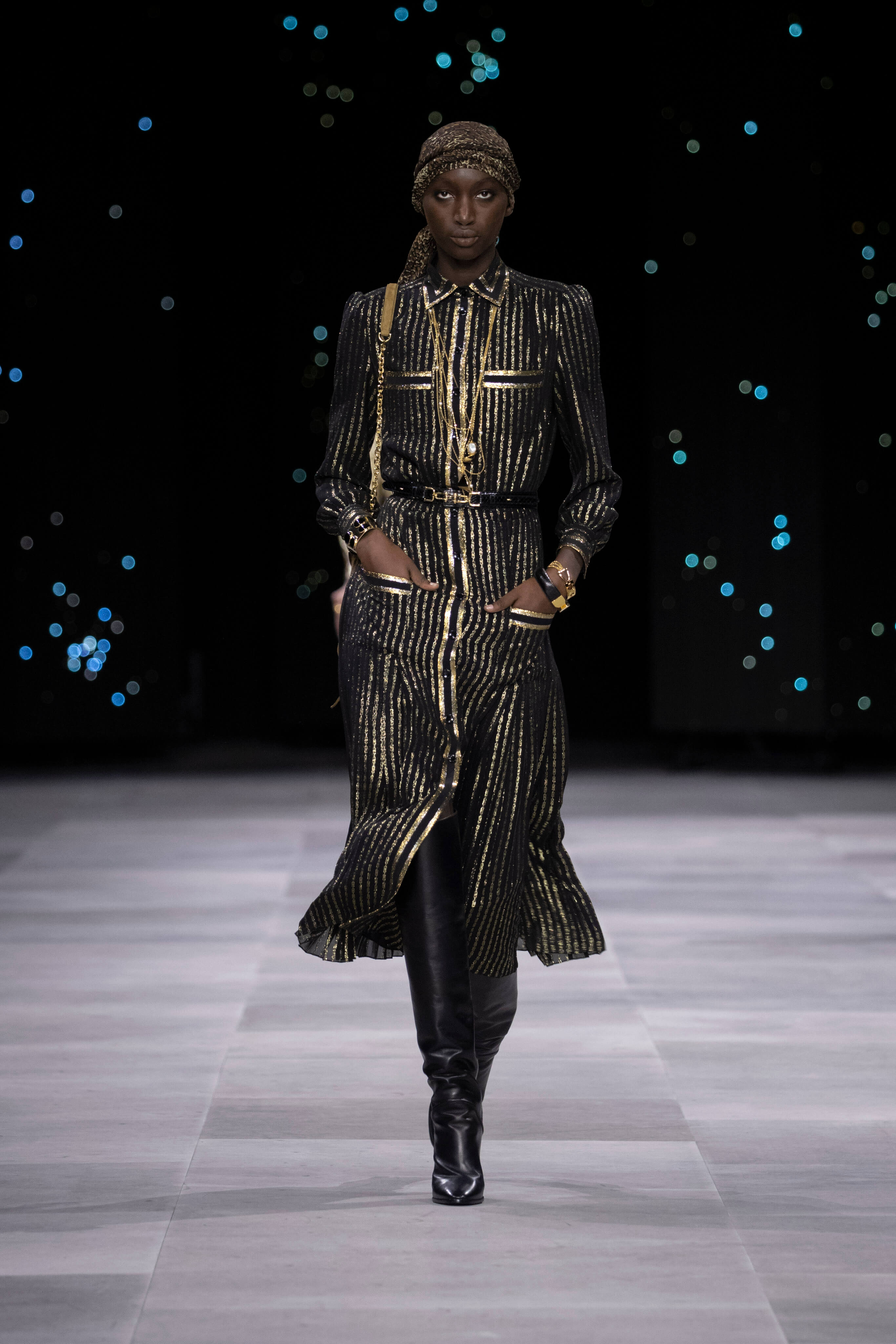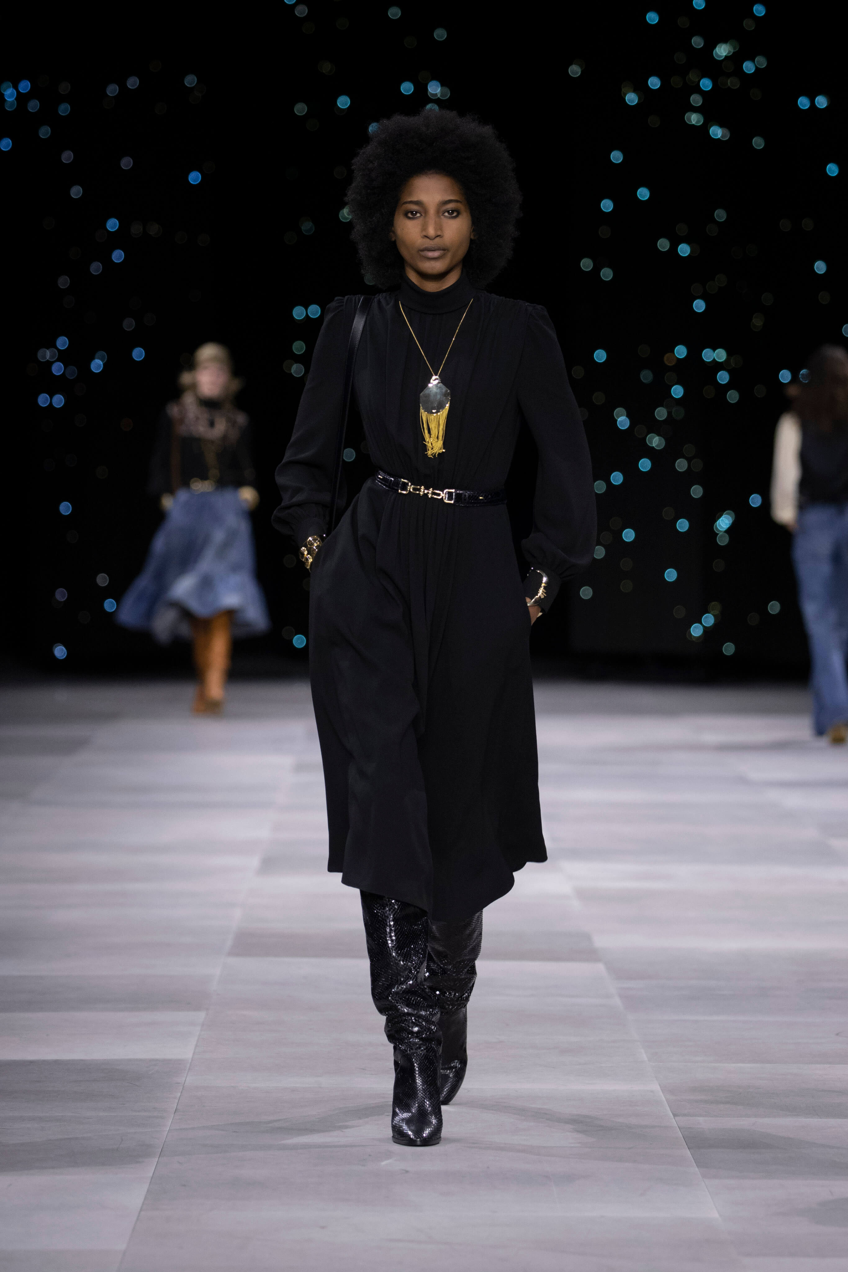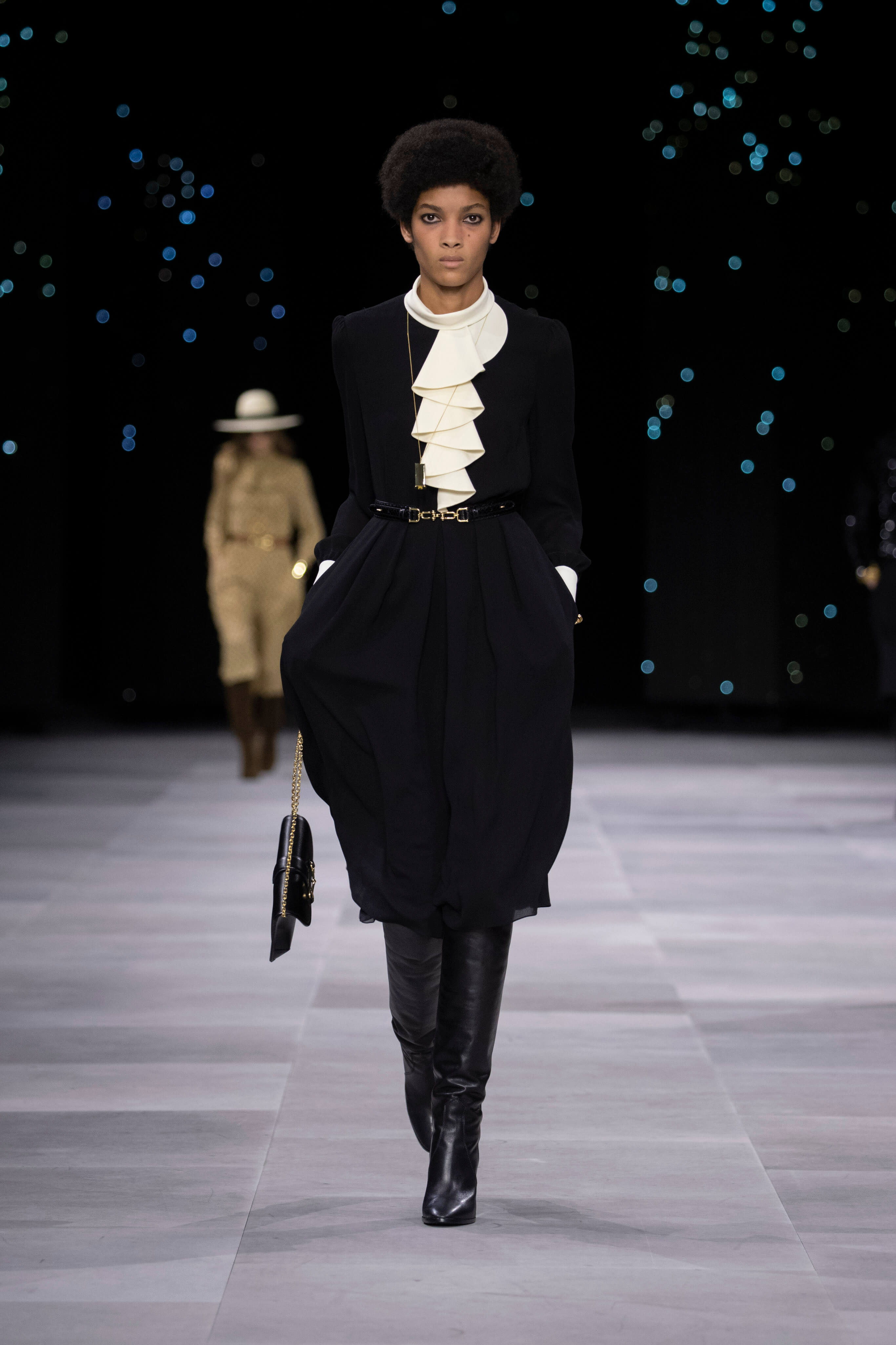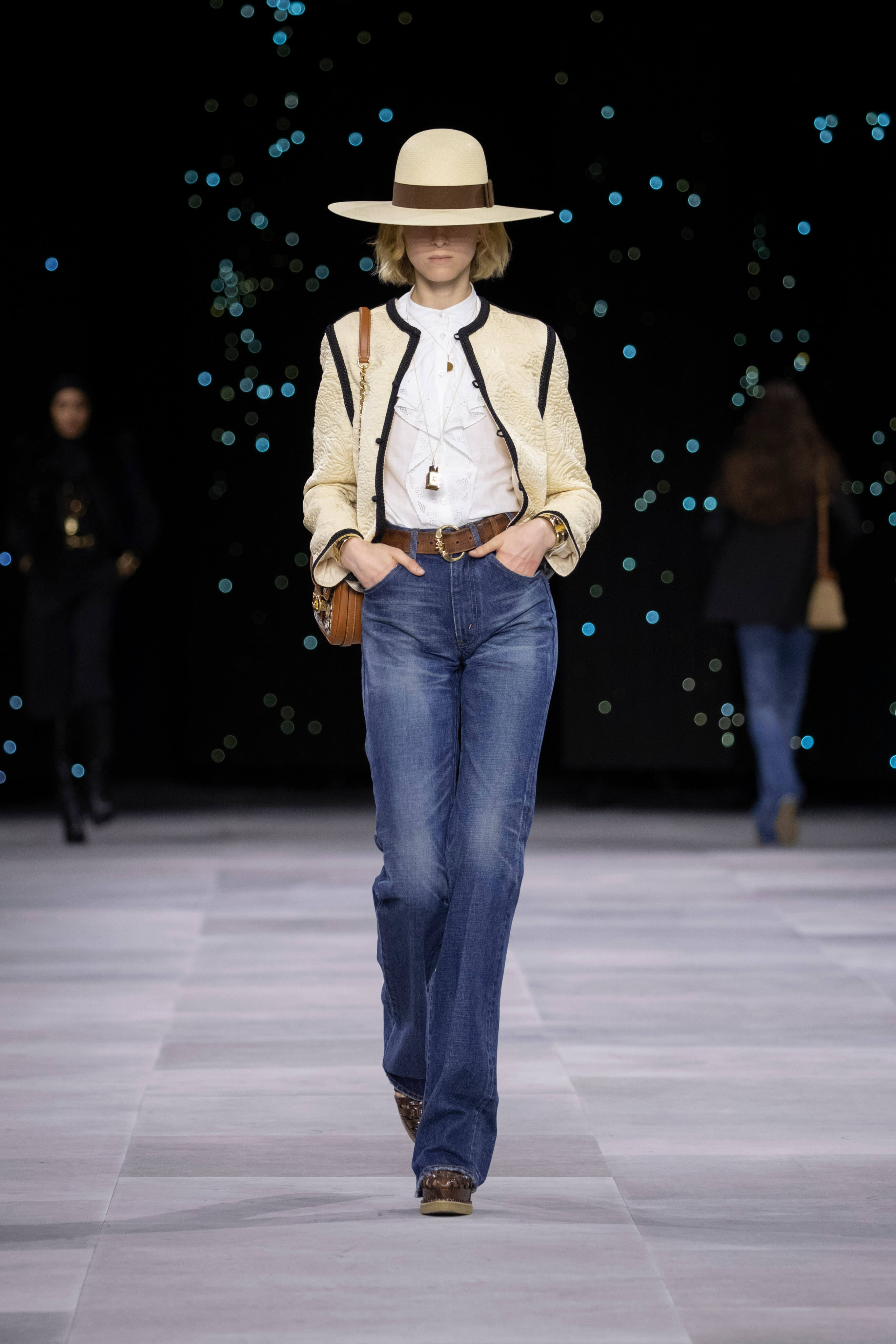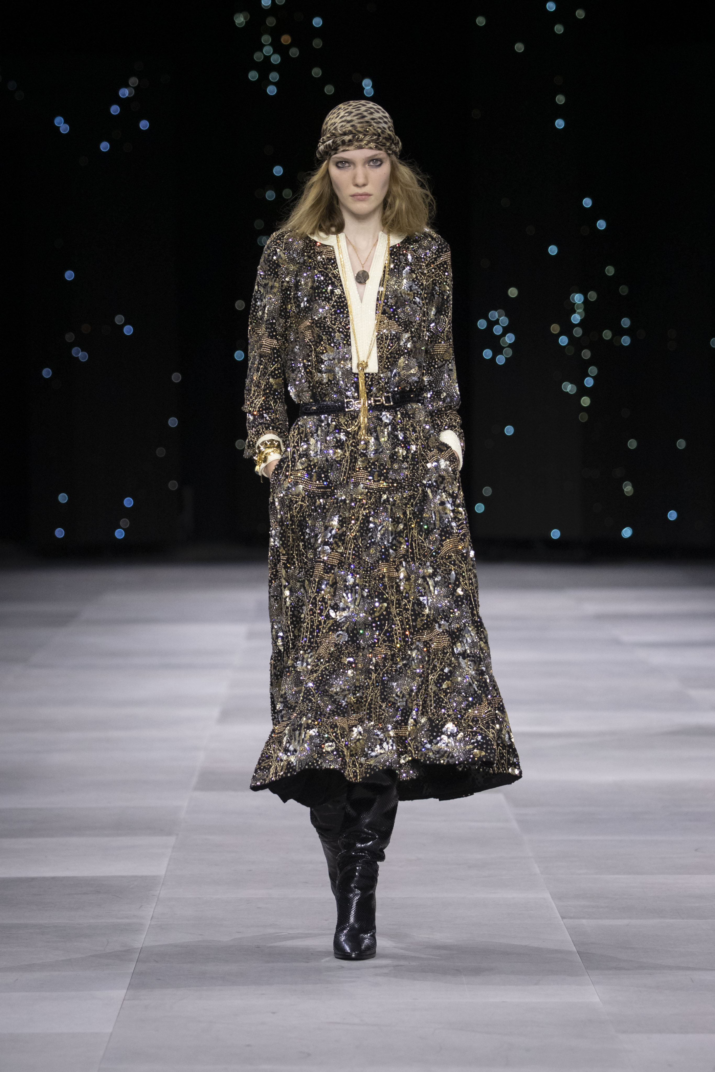 Назначение Слимана на пост креативного директора Celinе наделало немало шума, так что гостей на его показах собирается рекордное количество. Сам Эди не изменяет себе и с чувством и толком разбирает архивы бренда. Модели выходили в укороченных шубах и дублёнках, надетых поверх платьев, расшитых мерцающими нитями и вместе с песочными рубашками и узкими расклешенными джинсами, юбках миди, пёстрых блузах с бантами.