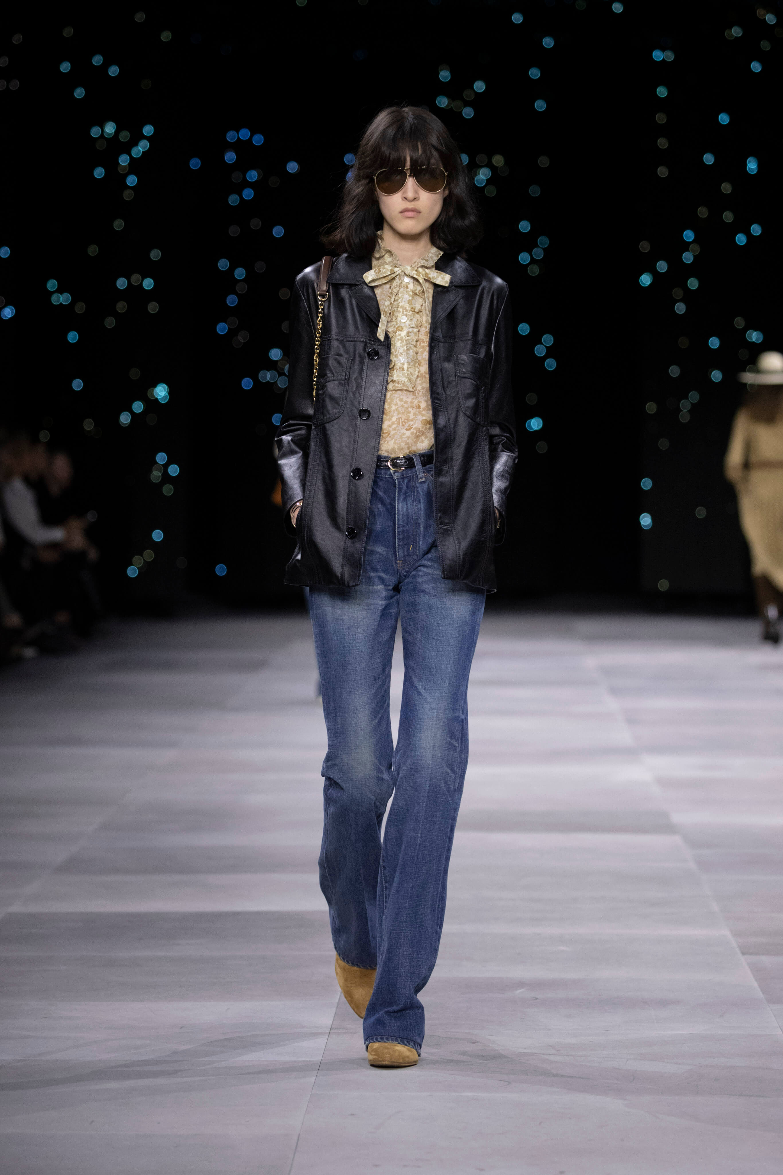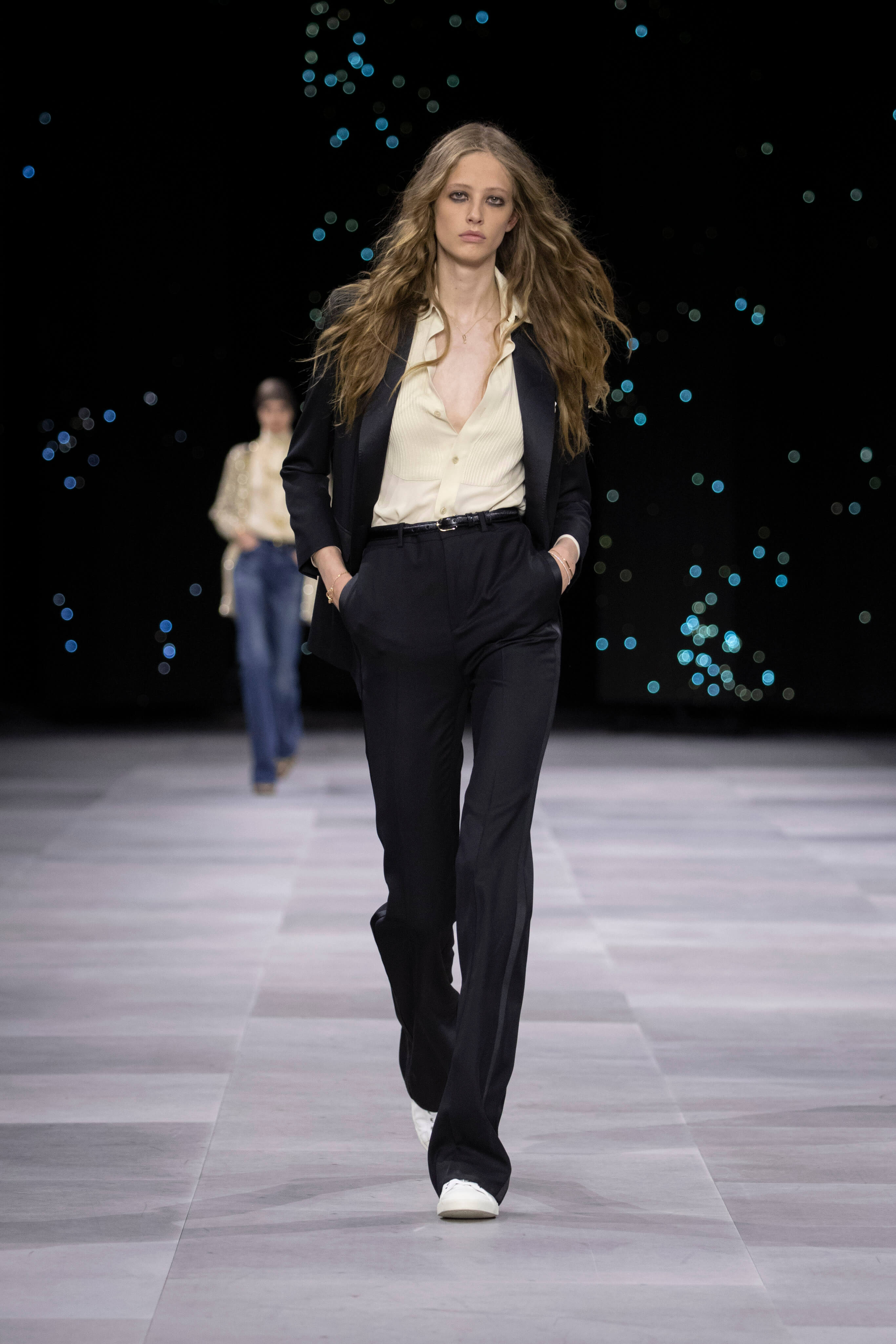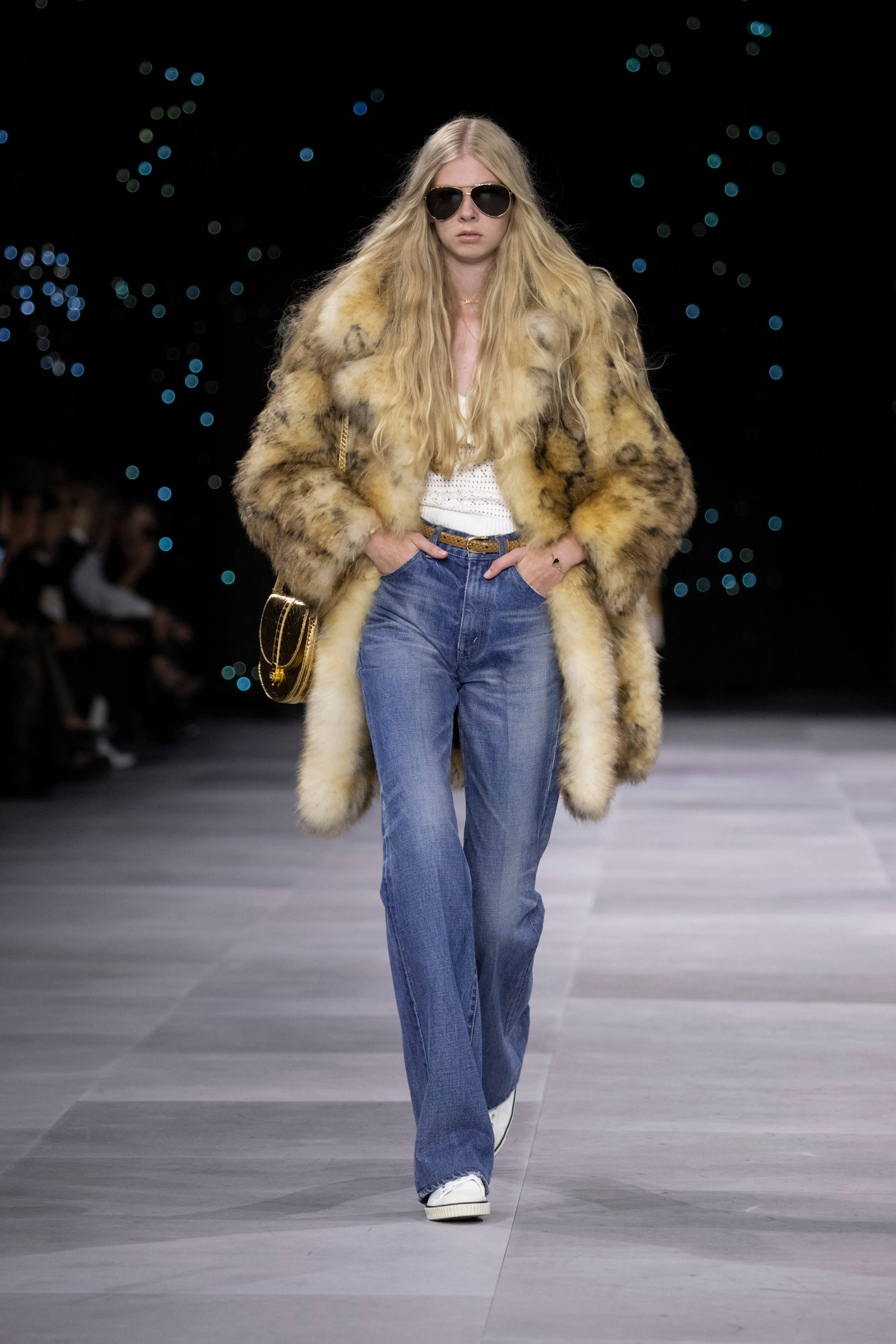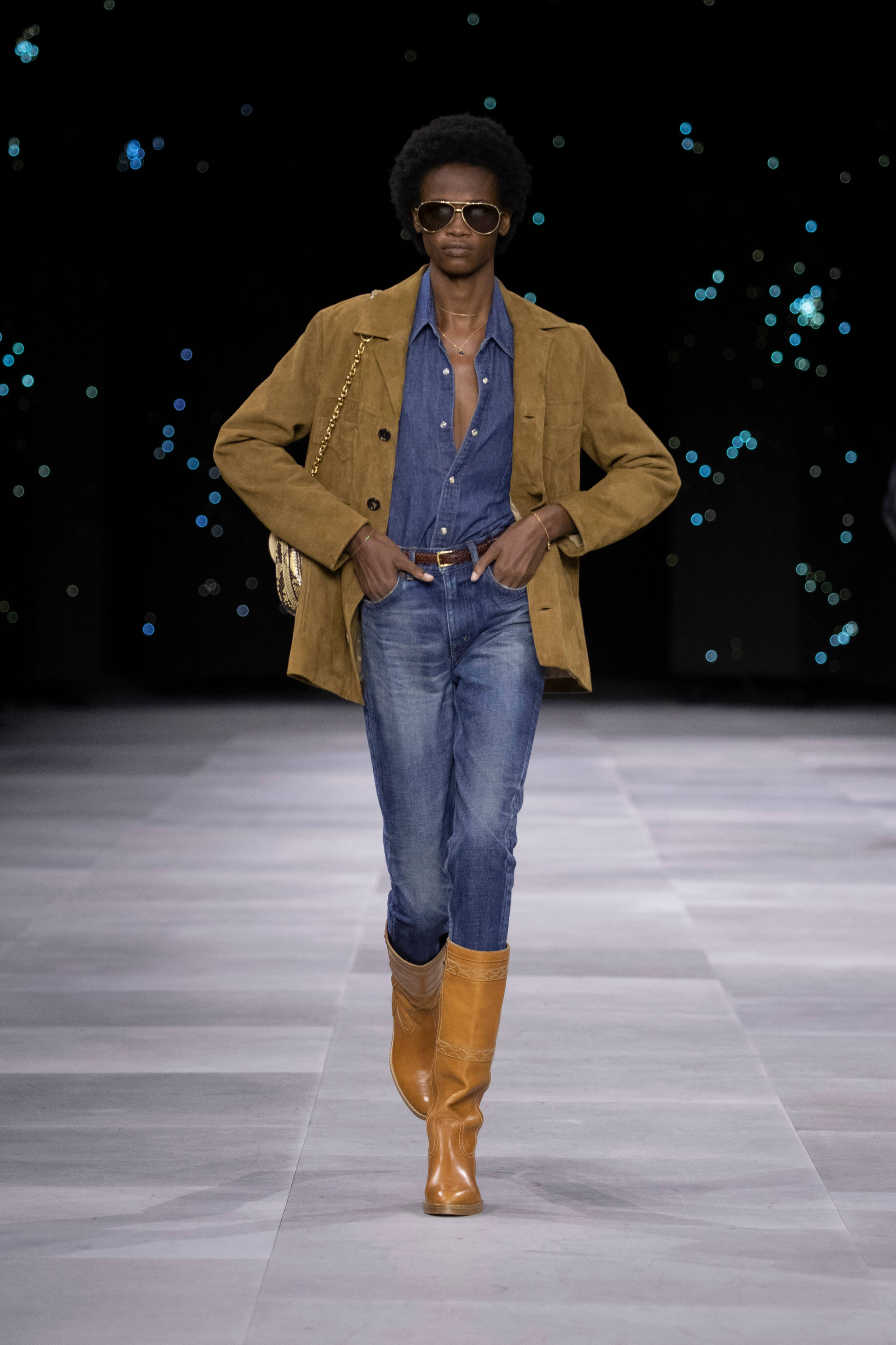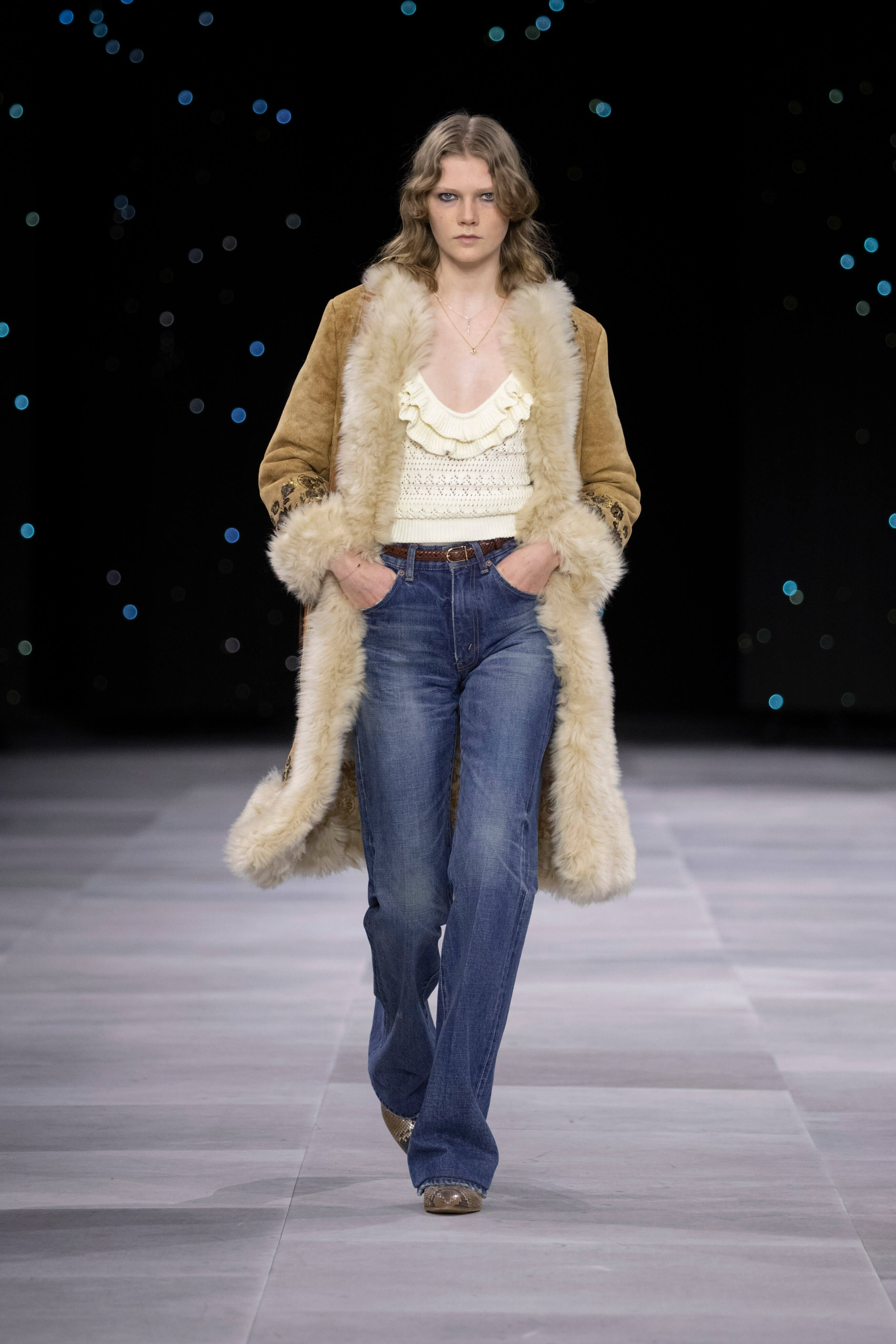 Дублёнка, очки-авиаторы и узкие джинсы - узнаваемый образ Celine от Эди Слимана. На фоне декораций, имитирующих звёздное небо прошел показ второй коллекции известного хулигана и реформатора для парижского дома.