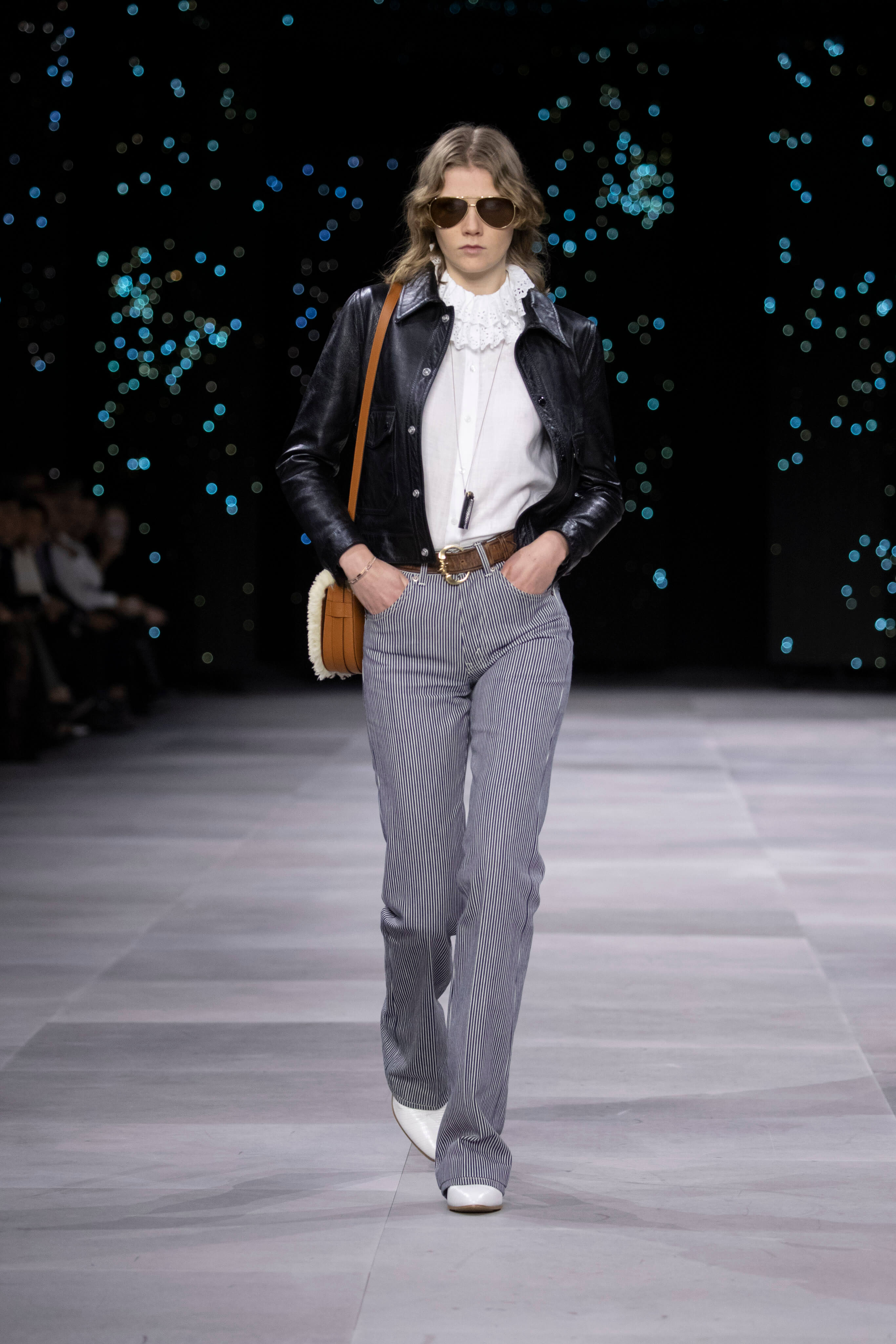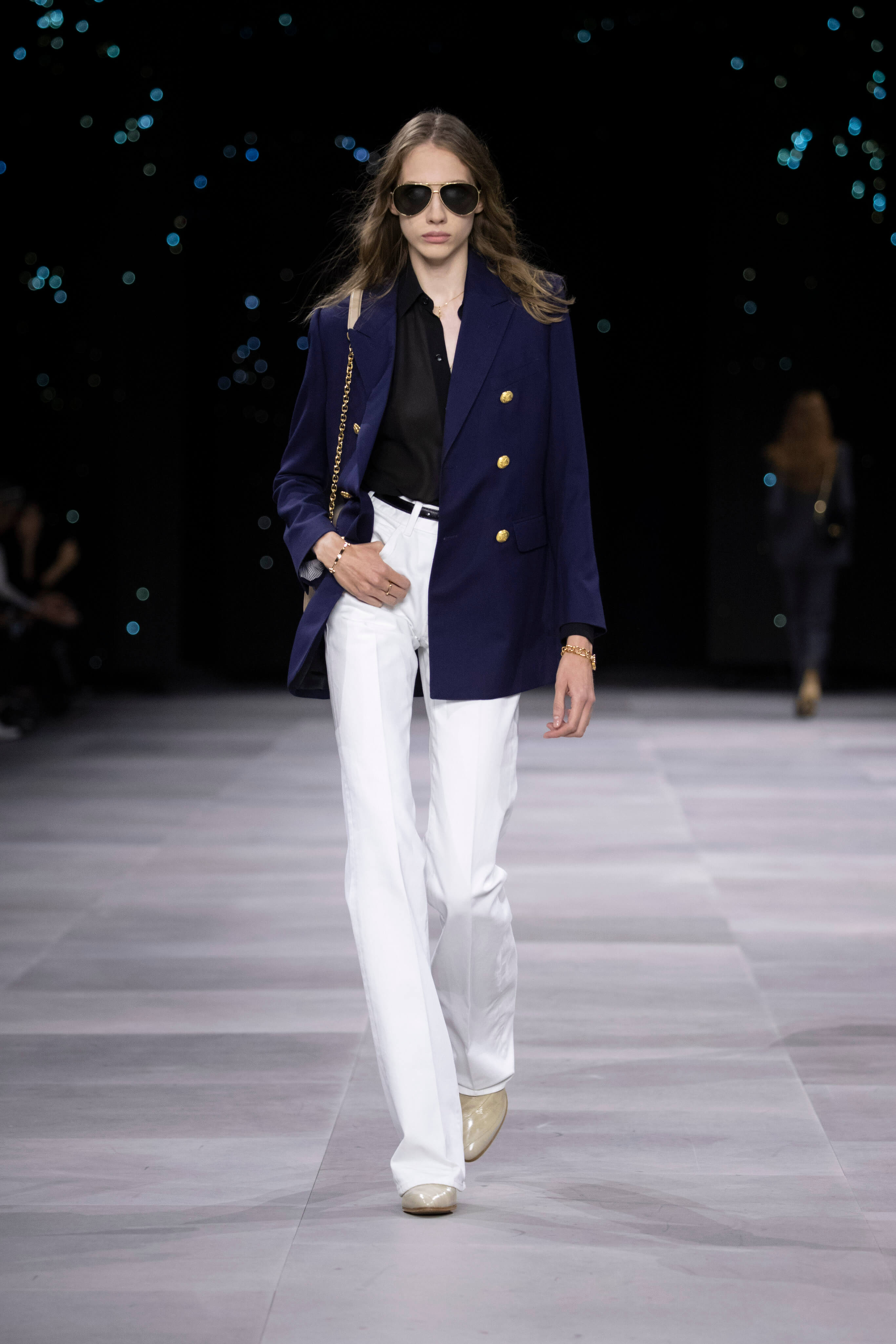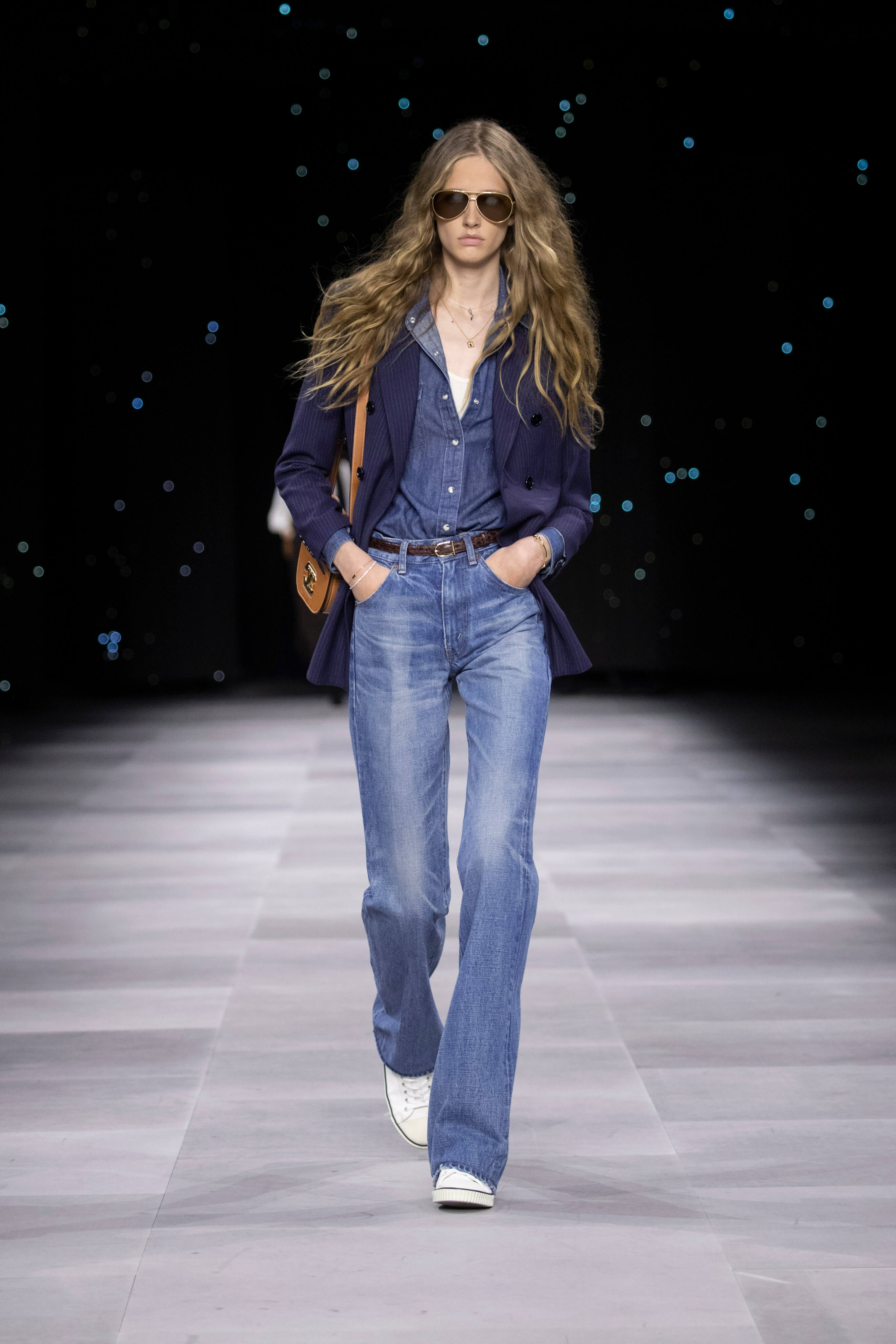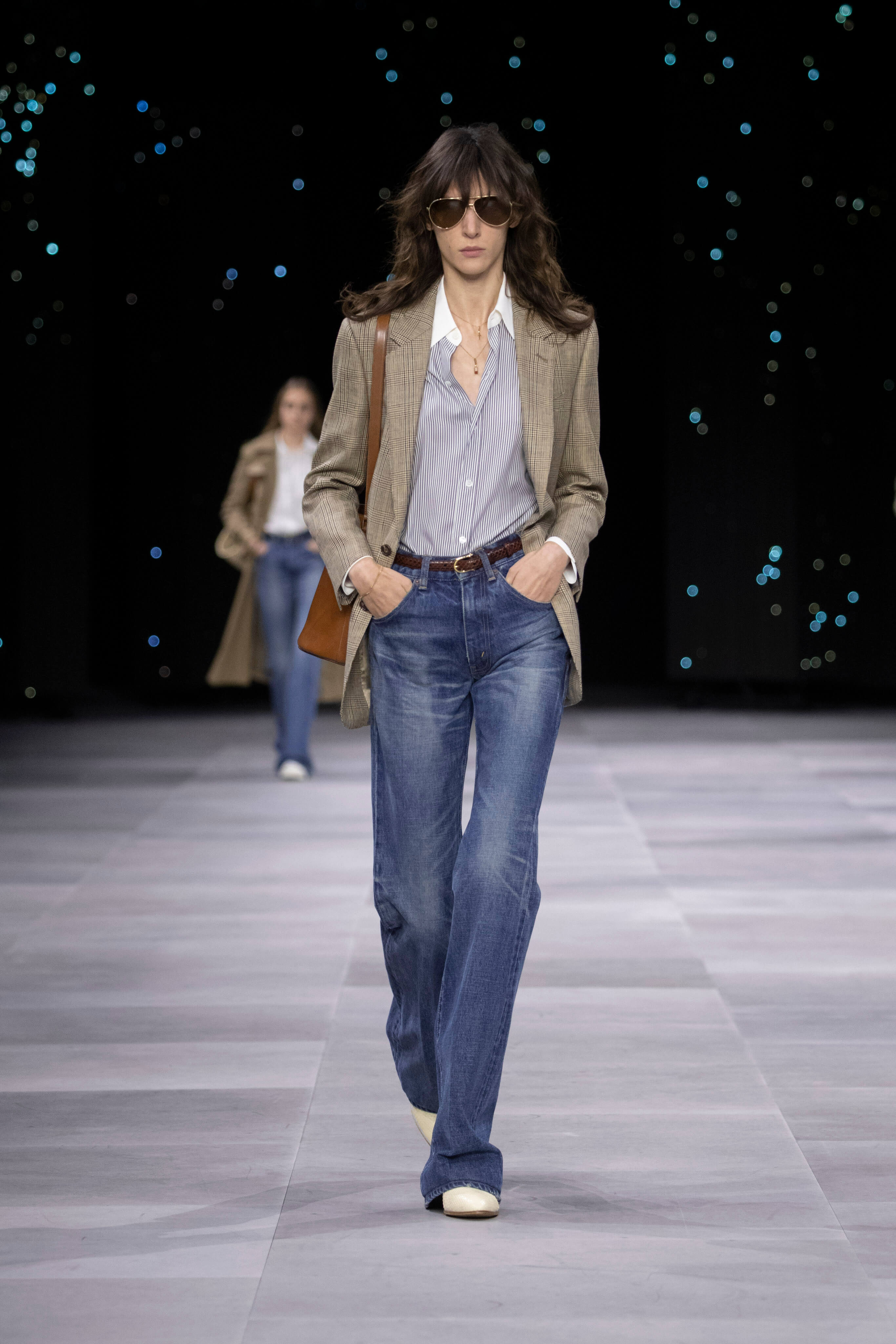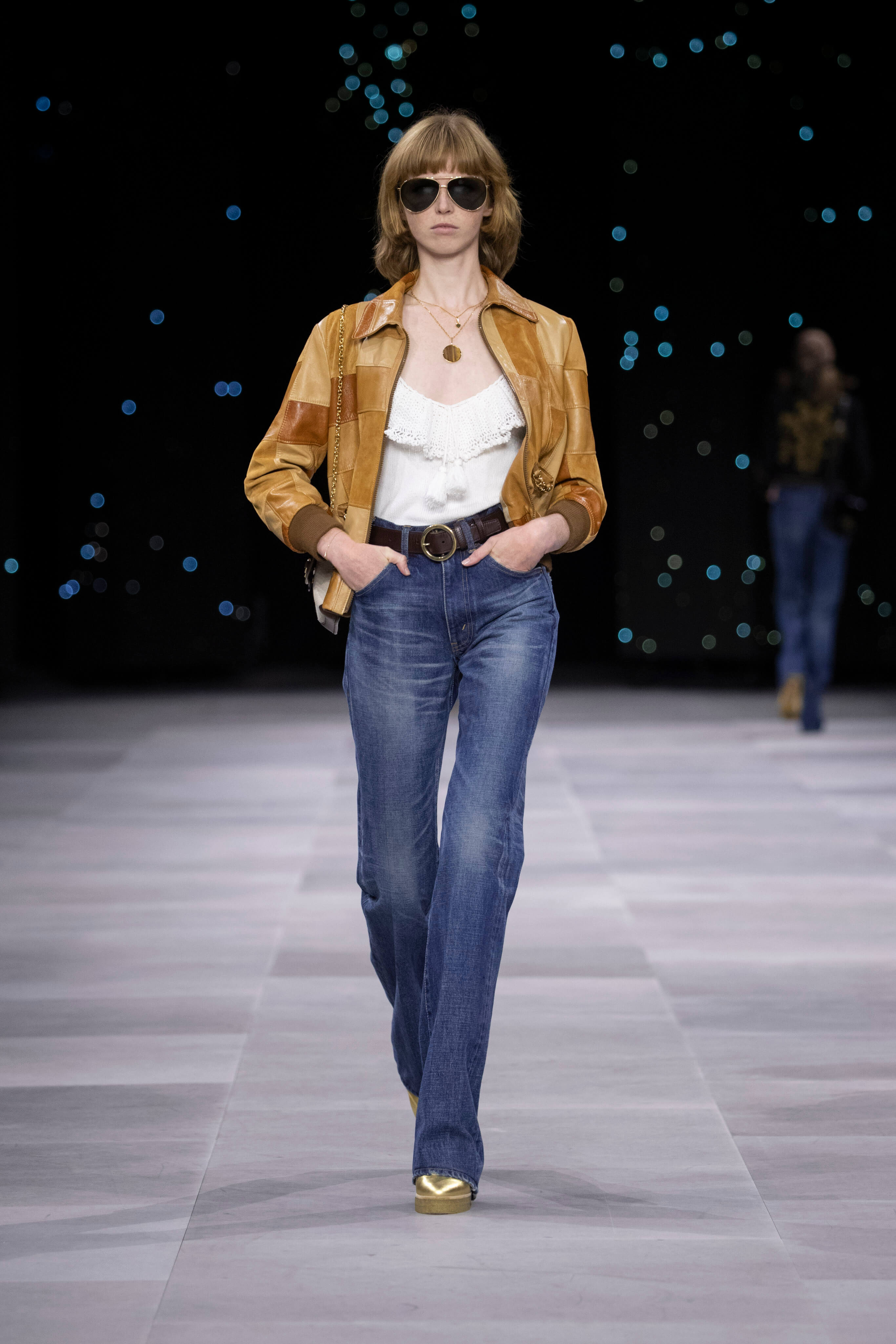 Дублёнка, очки-авиаторы и узкие джинсы - узнаваемый образ Celine от Эди Слимана. На фоне декораций, имитирующих звёздное небо прошел показ второй коллекции известного хулигана и реформатора для парижского дома.