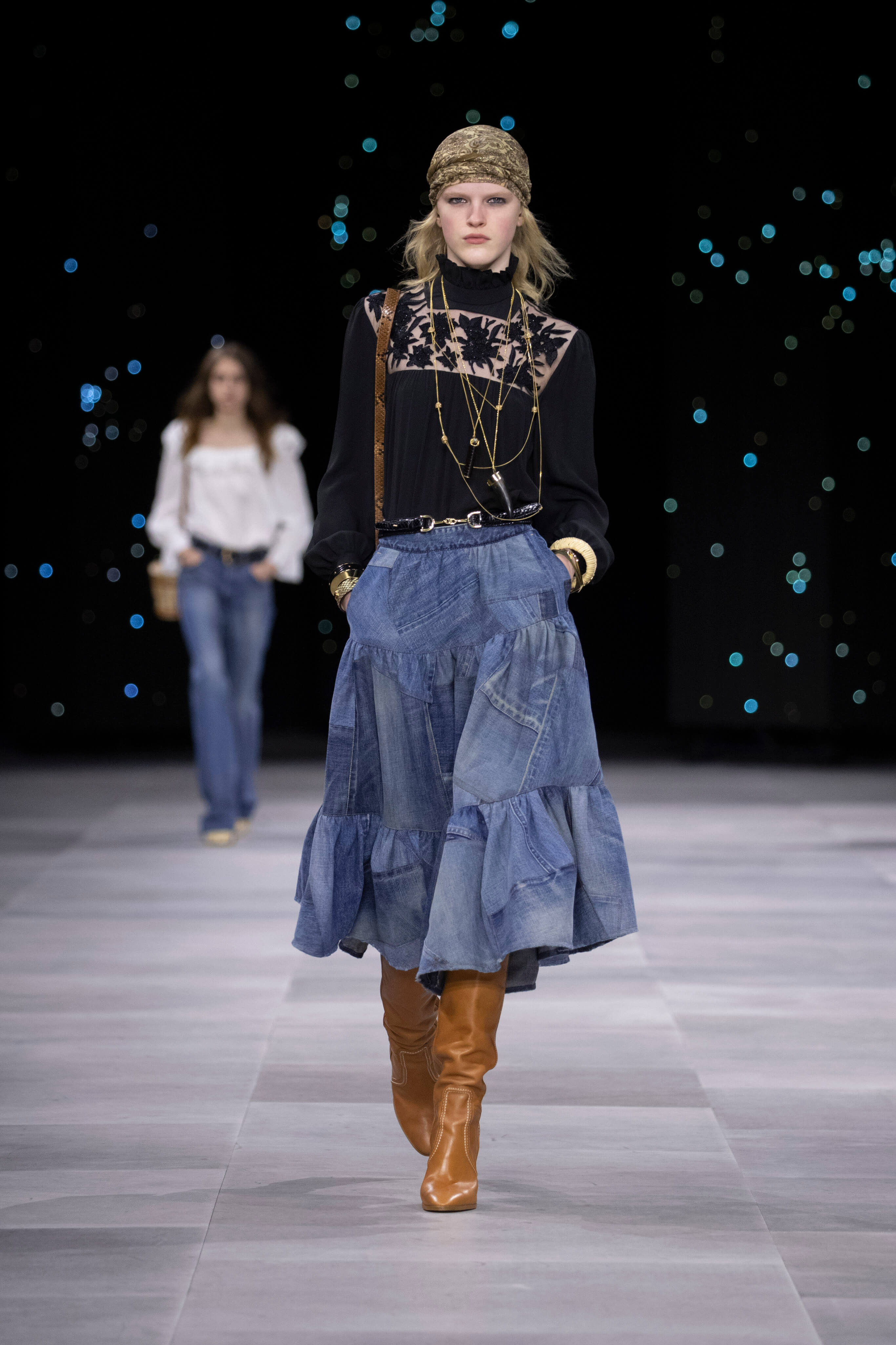 Поверх джинсовой рубашки Слиман предлагает носить кремовый жакет, а удлиненные джинсовые и кожаные куртки с блузами в стиле бохо, а многоярусные юбки, будто собранные из кусочков разных пар джинс с высокими сапогами и лёгкими блузами.