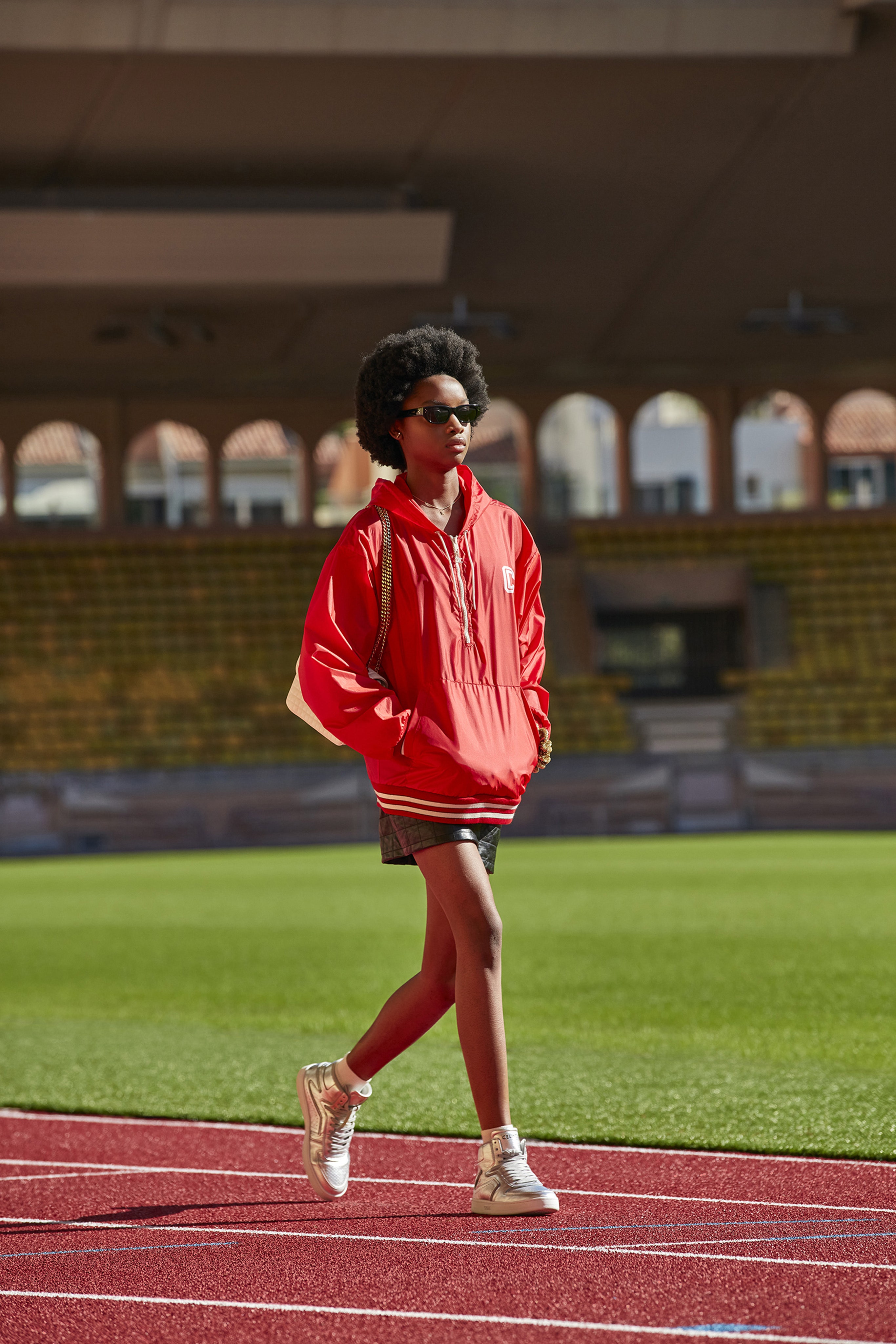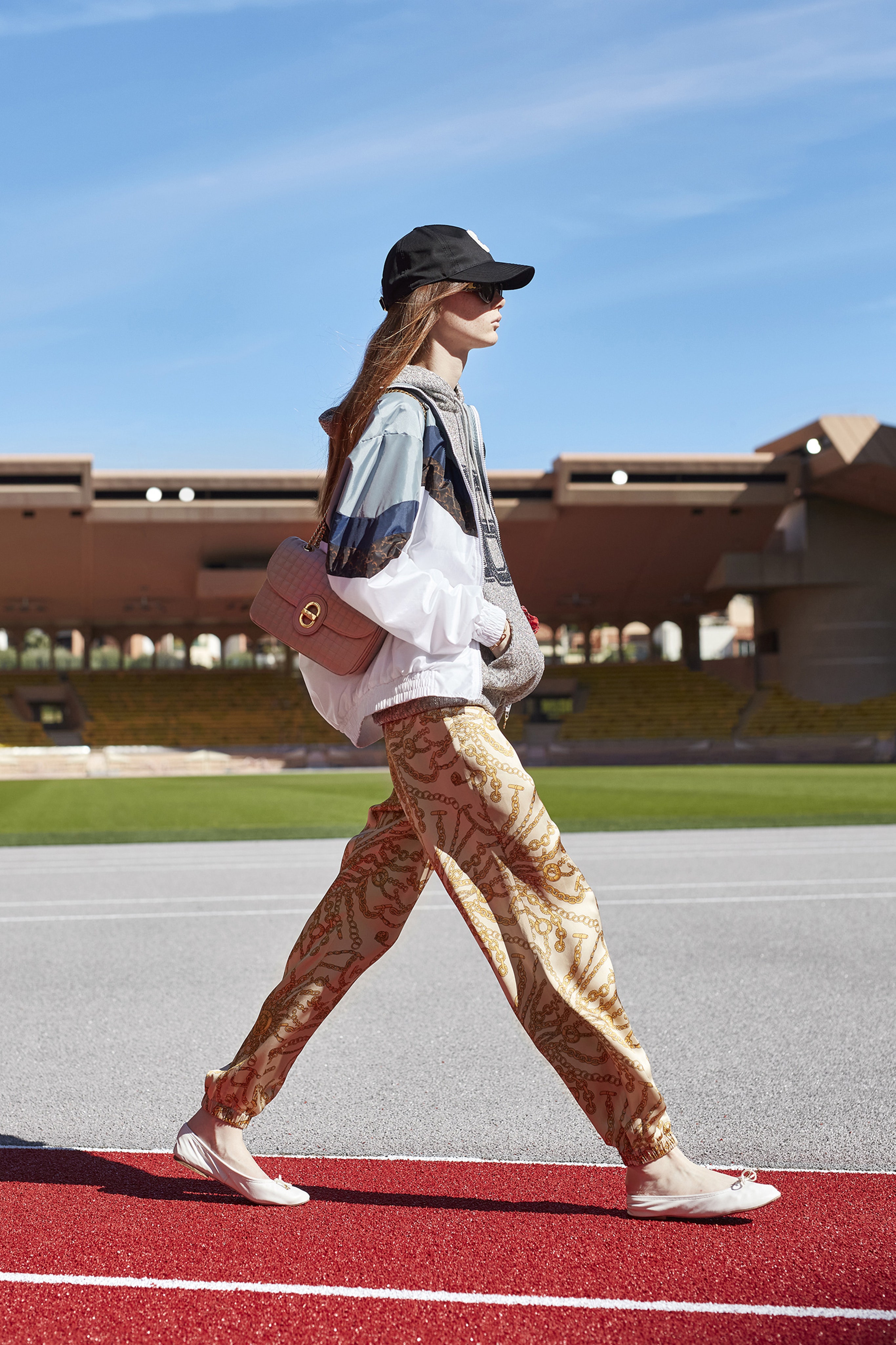 Модели ходили среди пустых зрительских трибун в джинсовых шортах, топах с надписями, шелковых бомберах и панамах, а поверх струящихся платьев с бантами у ворота носили мягкие худи. Кепки из денима, высокие сапоги и ботинки на шнуровке разбавили нежные цветочные  платья, пудровые кардиганы, кремовые парки и девичьи платья мини в рюшах.