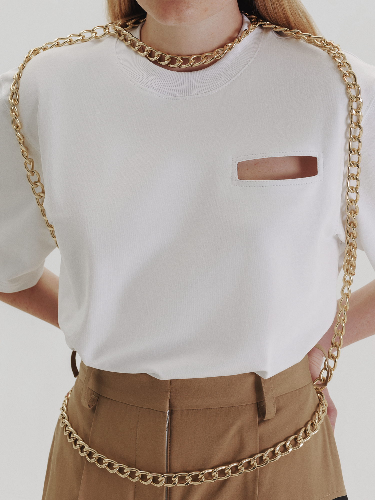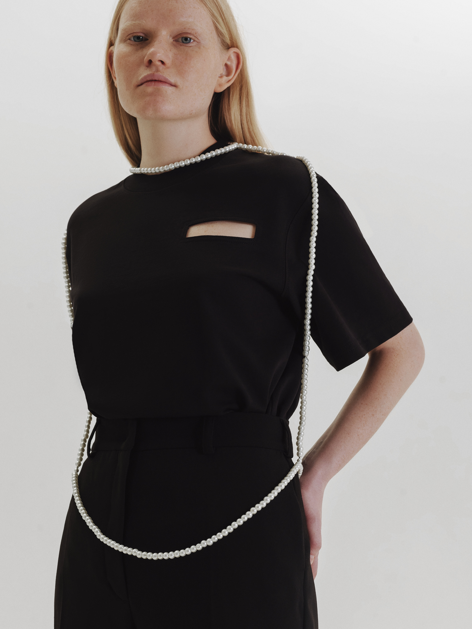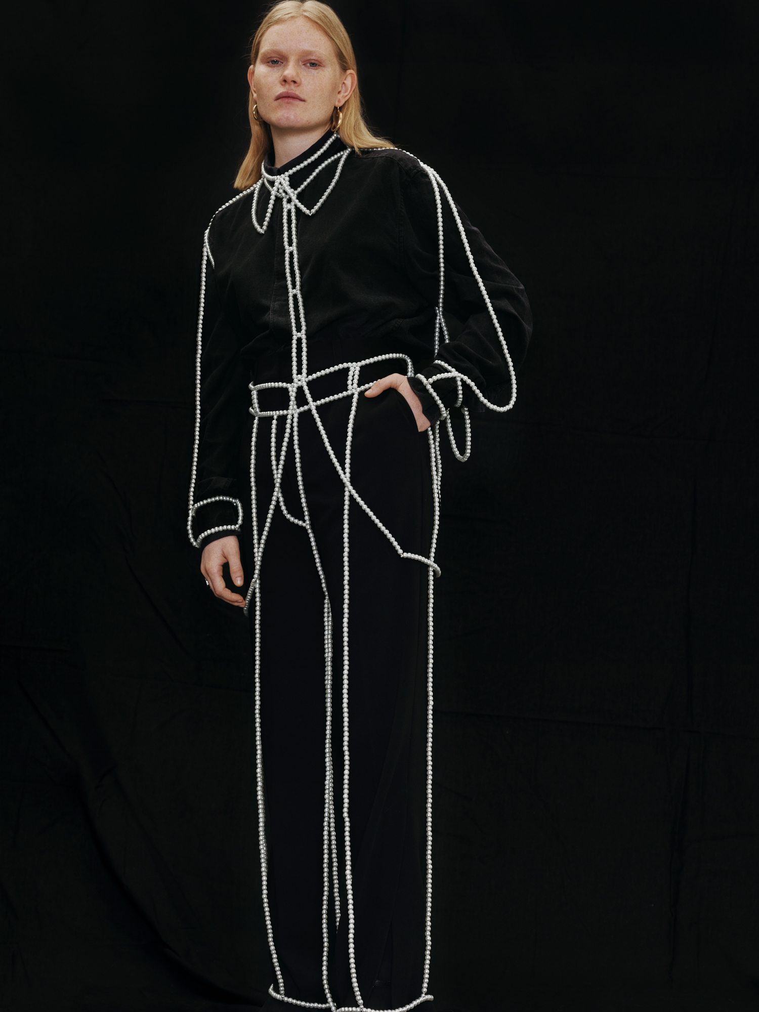 Chakshyn продолжают развивать линию украшений. Вместе с дизайнером Леной Ястреб Дима и Антон продолжают вдохновляться утилитарностью: образы дополняют серьги в виде карабинов с необработанным жемчугом и кристаллами. Также в коллекцию вошли модели с деконструированной клипсой и кольца с будто сломанными застежками, отсылающие к фальшивой реальности, транслируемой в соцсетях.