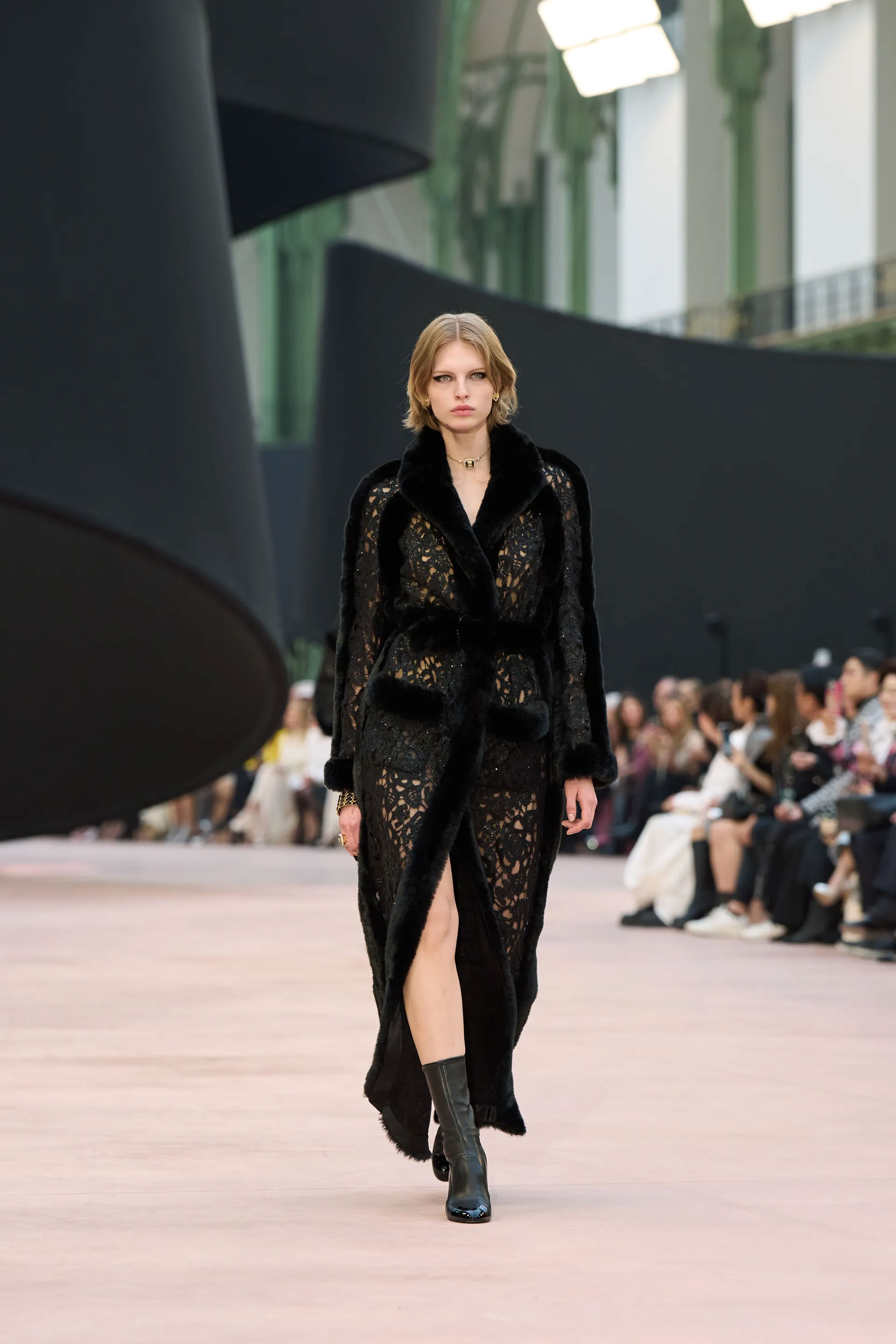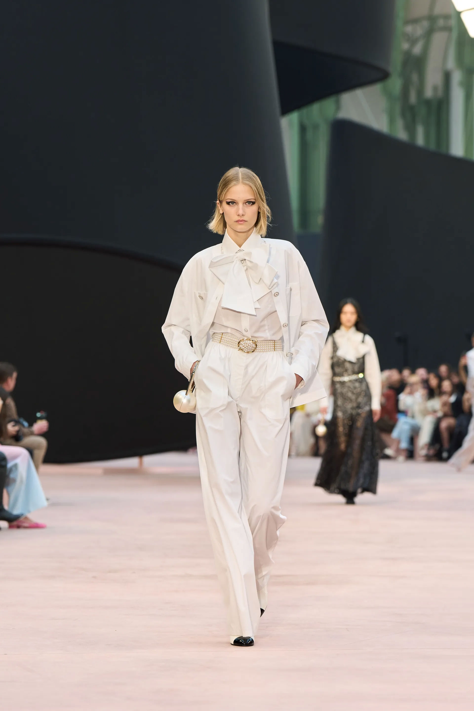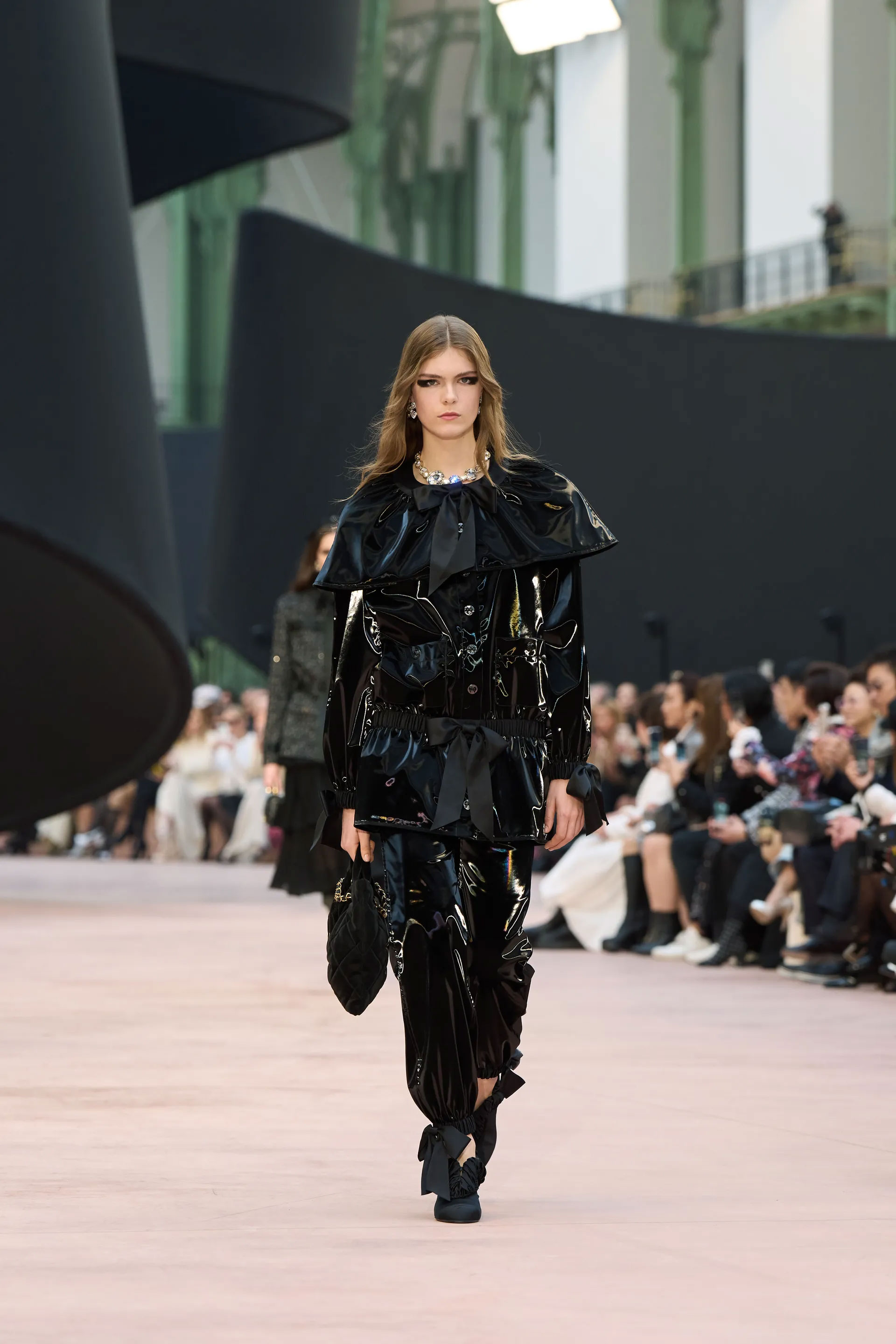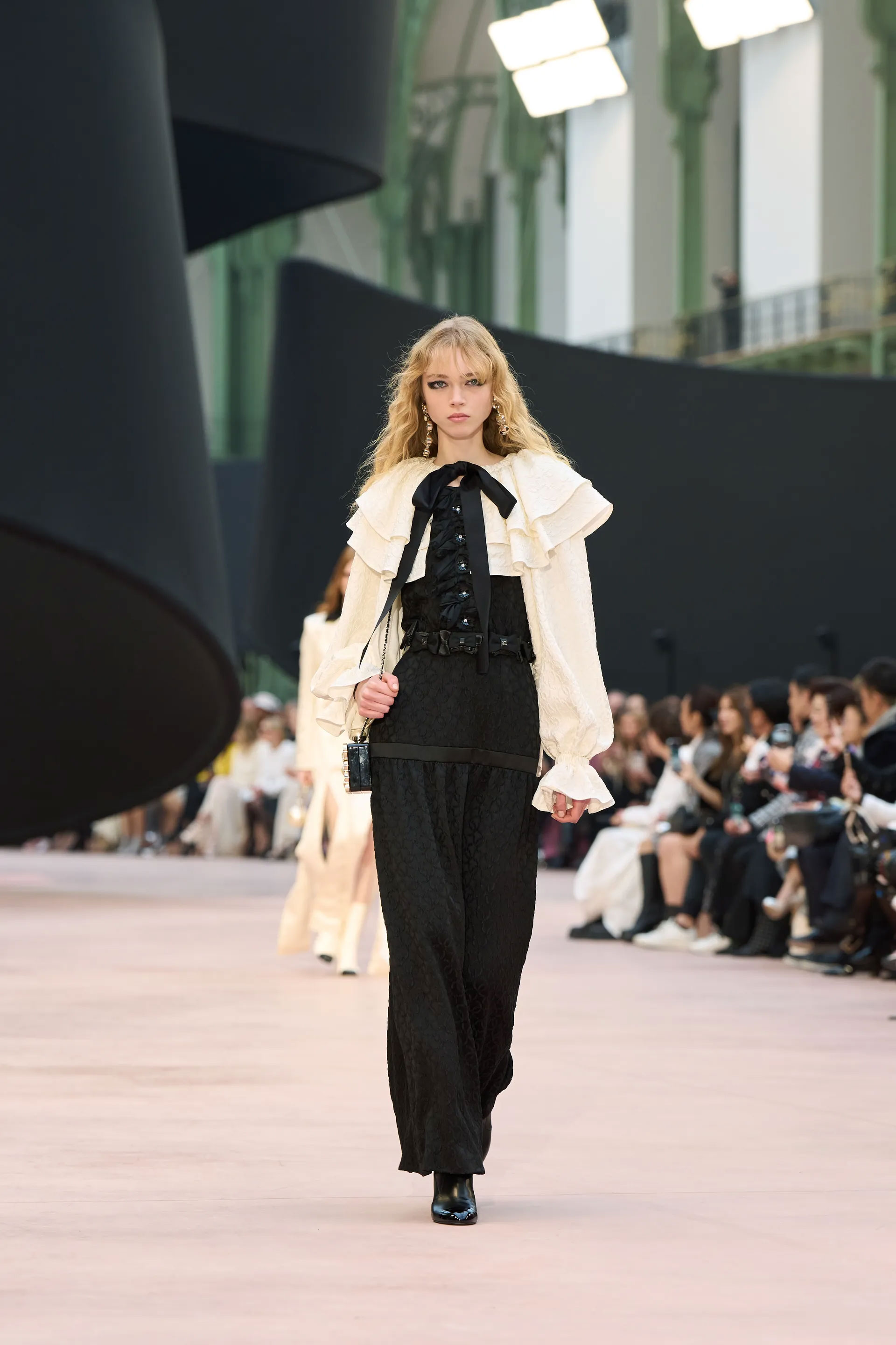 Показ проходив в паризькому Гран-Пале — культовому місці для дому, де крізь роки відбувалися його численні шоу. Під скляним дахом споруди була розміщена величезна чорна стрічка, інсталяція, створена сценографом Вілло Перроном. Вона розкинулася на підлозі й злітала в повітря, а повз її контури проходили моделі в одязі, що був створений на основі ідеї гри з розмірами, довжиною й пропорціями. Ця грайливість була виражена монументально та витончено, переосмислюючи коди будинку.