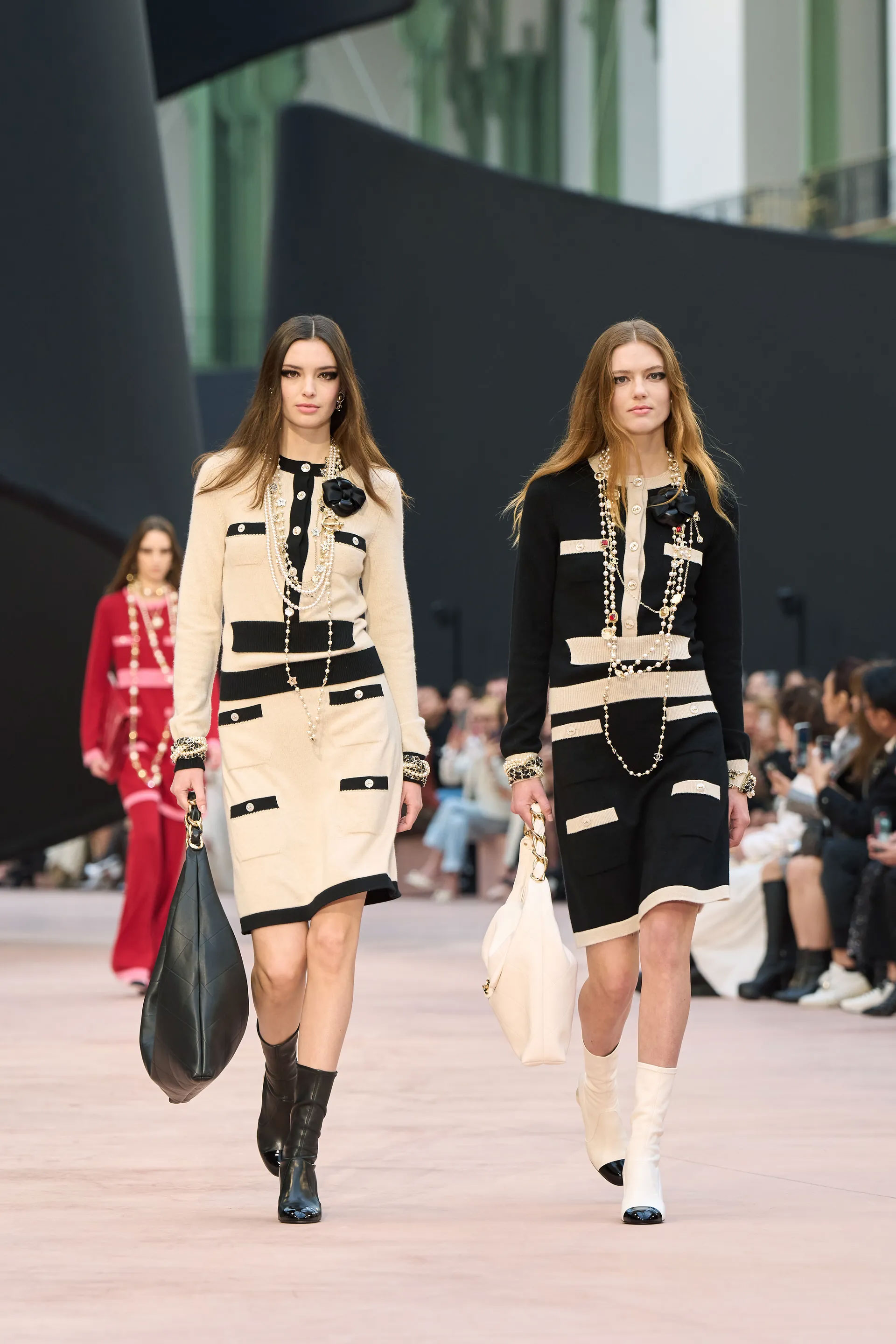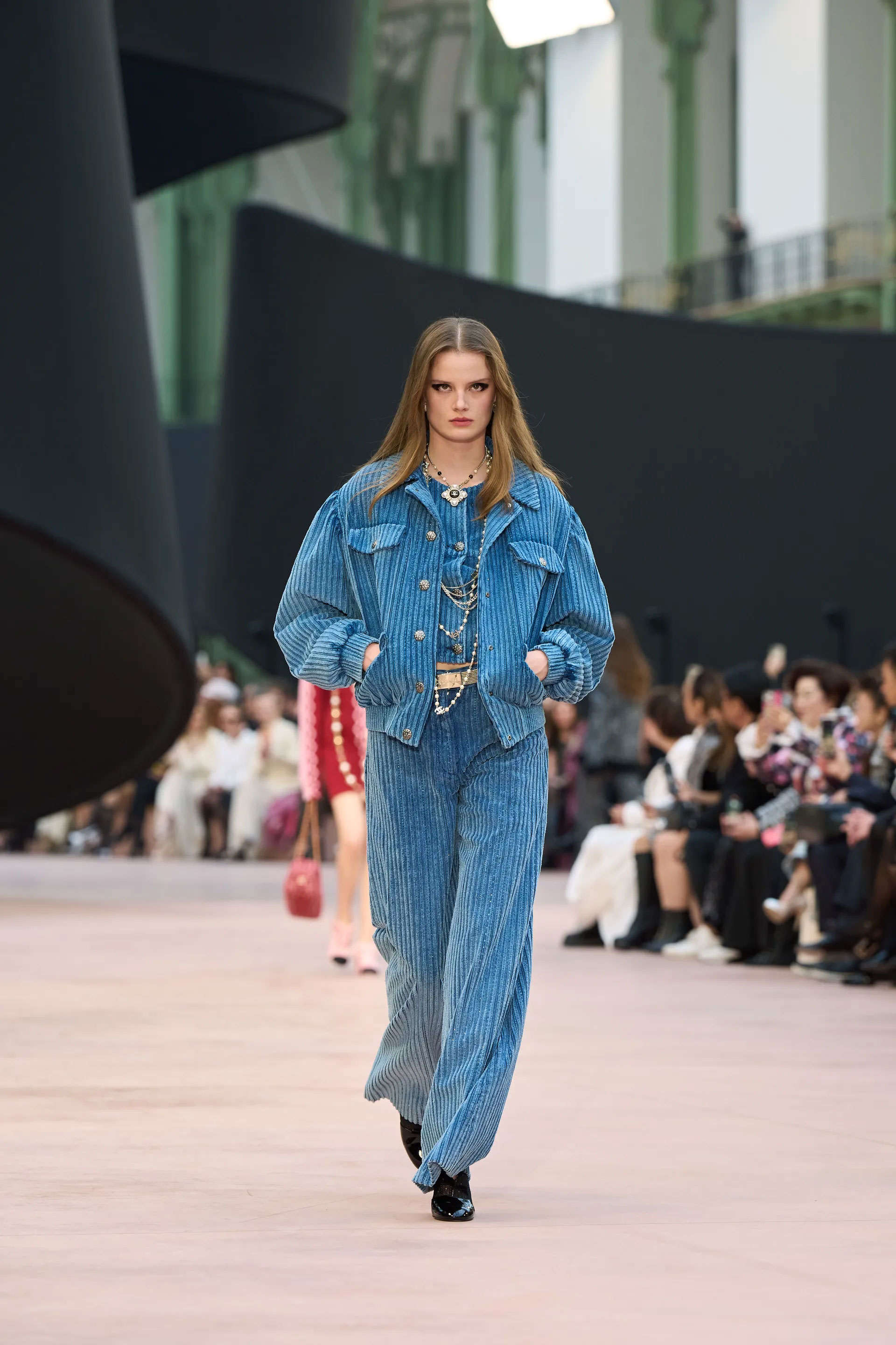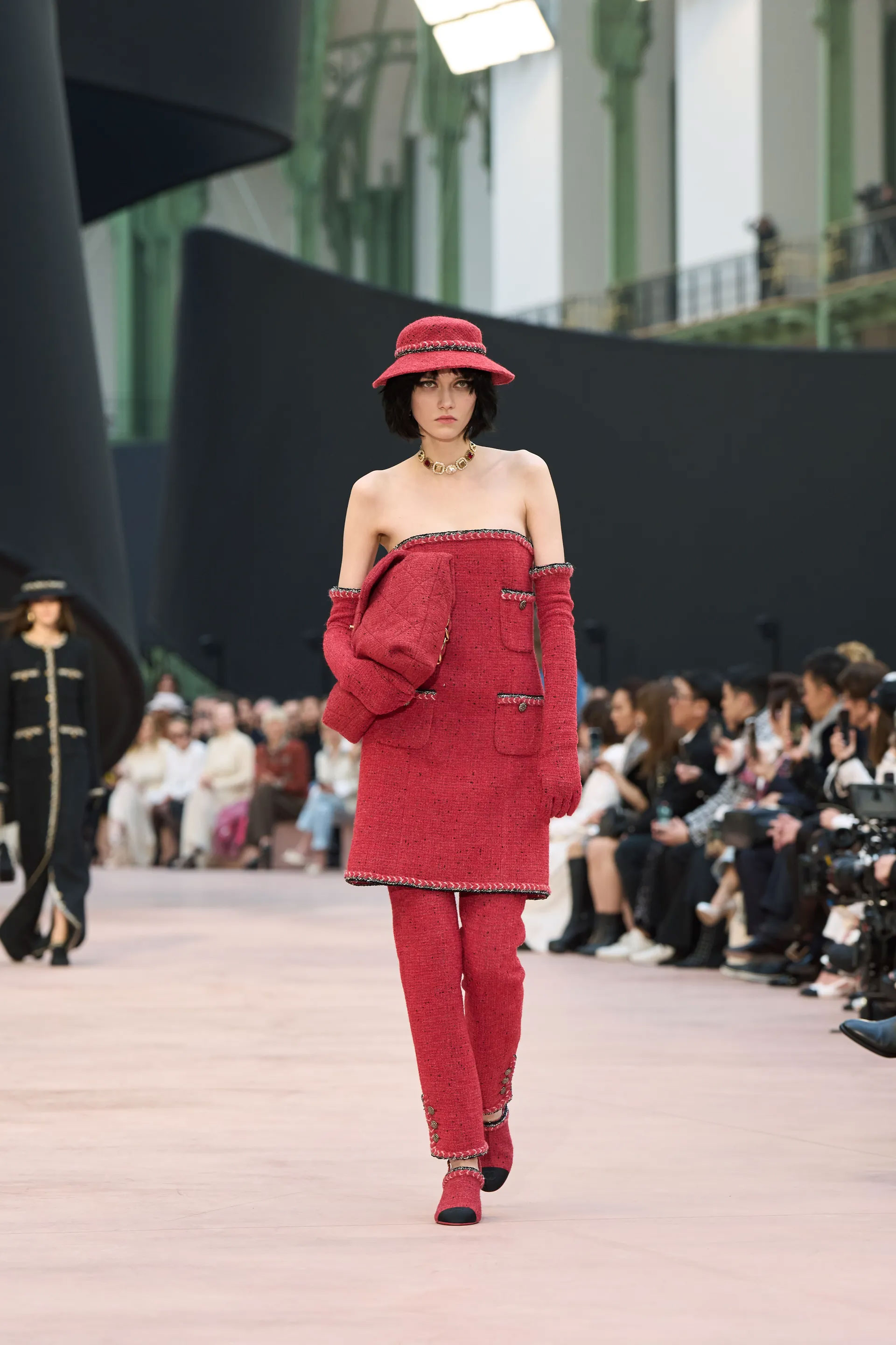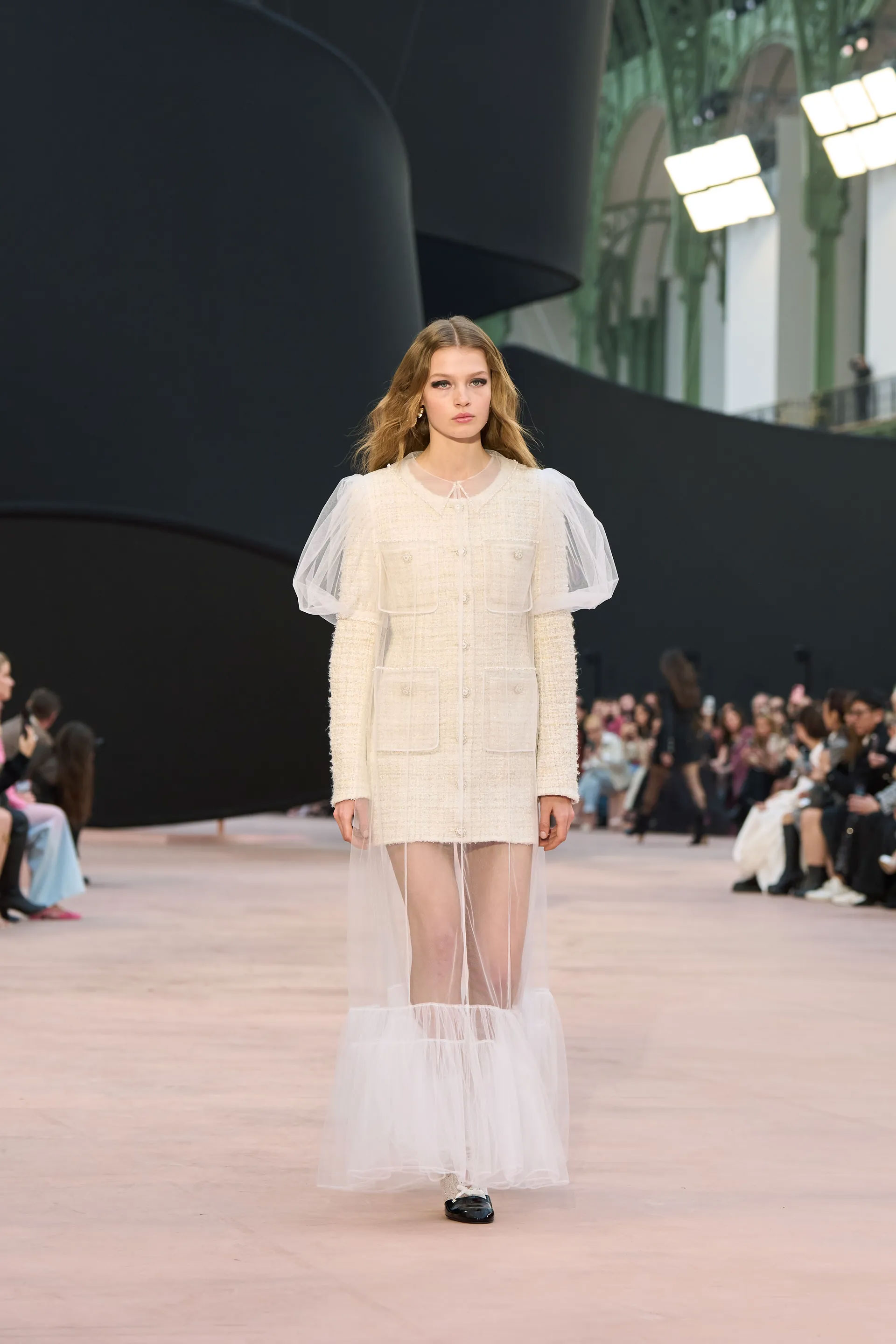 Доповнювали казку Chanel у Гран-Пале багатошарові костюми-трійки, твідові ансамблі, поверх яких одягнули тюлеві накидки, шифонові джинси, твід, котрий нагадує шовк. А також — знімні коміри з рюшами, чорний верхній одяг зі штучним хутром, в’язані светри-сукні, лискучі шкіряні образи та жакети, вспинані в зоні грудей об'ємними лелітками.