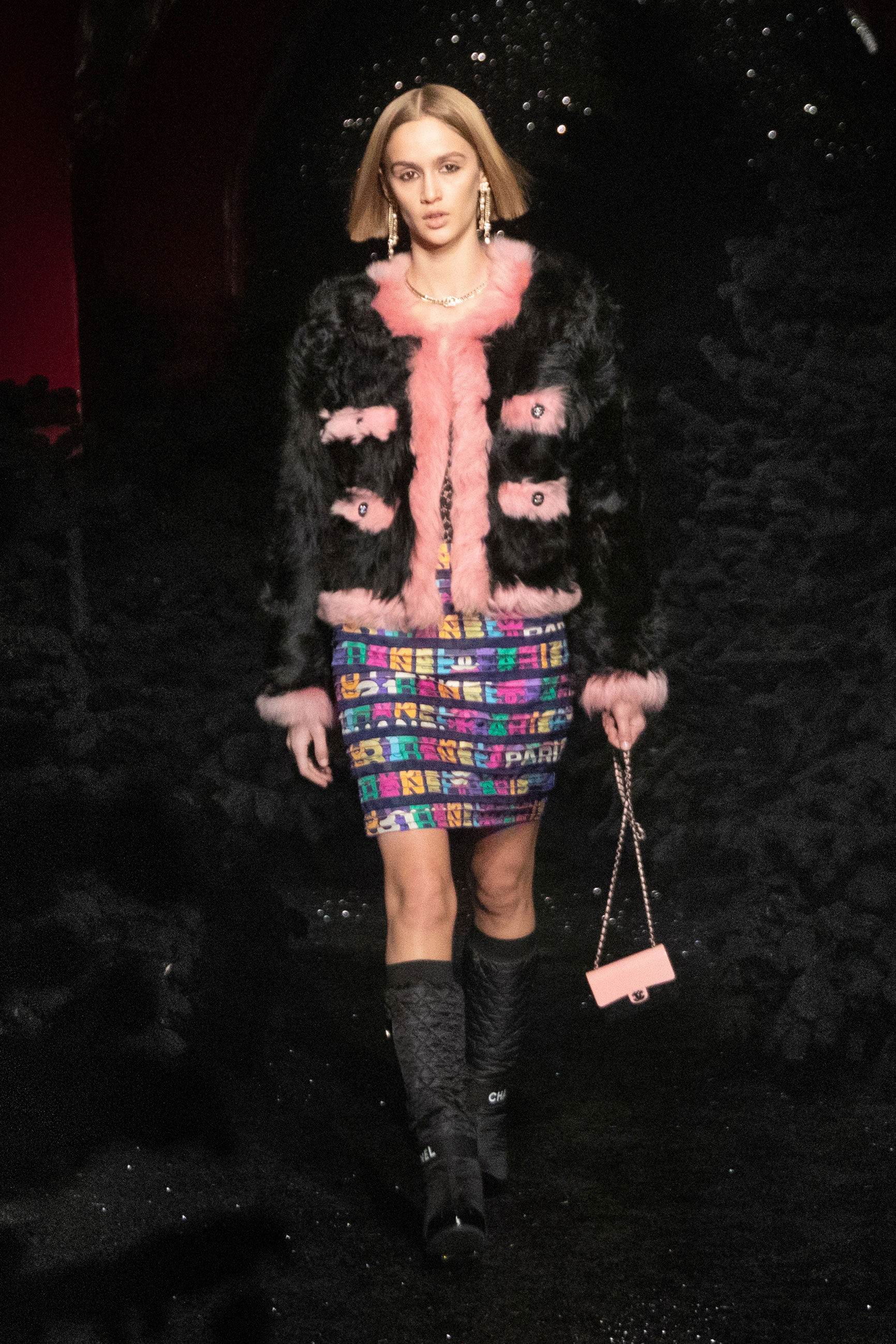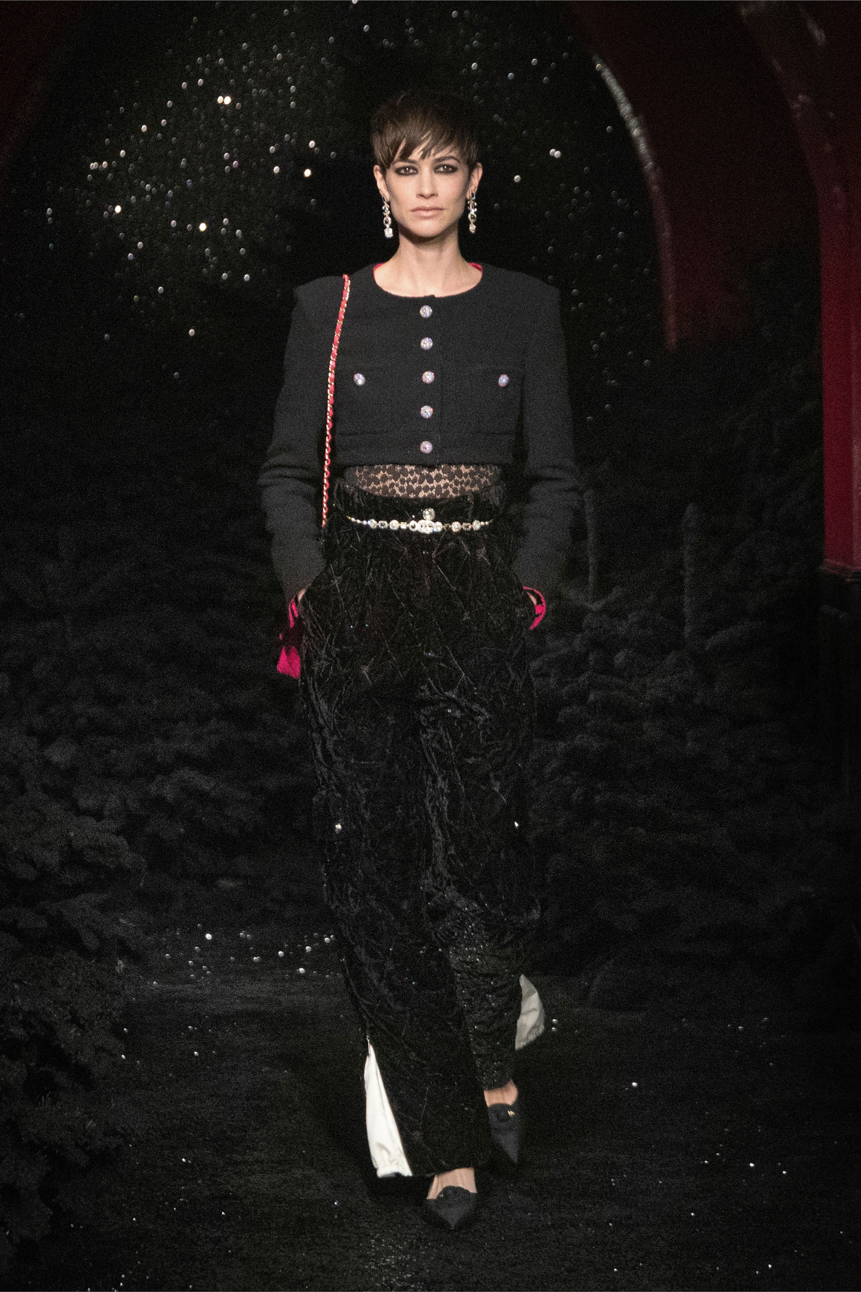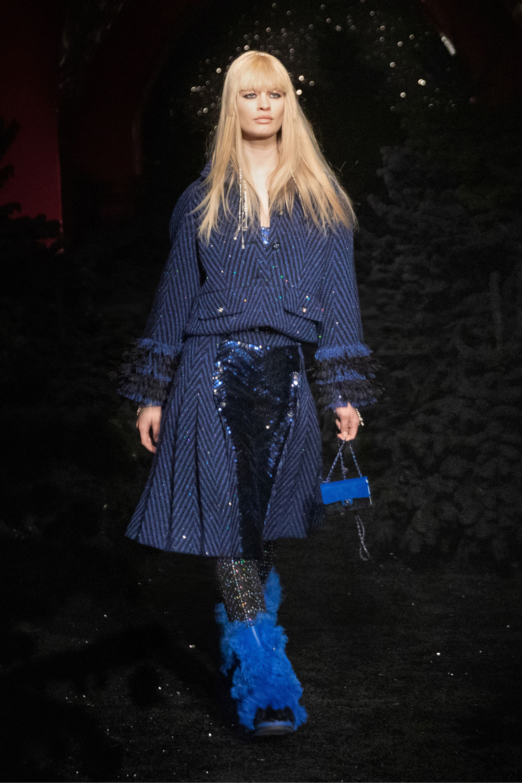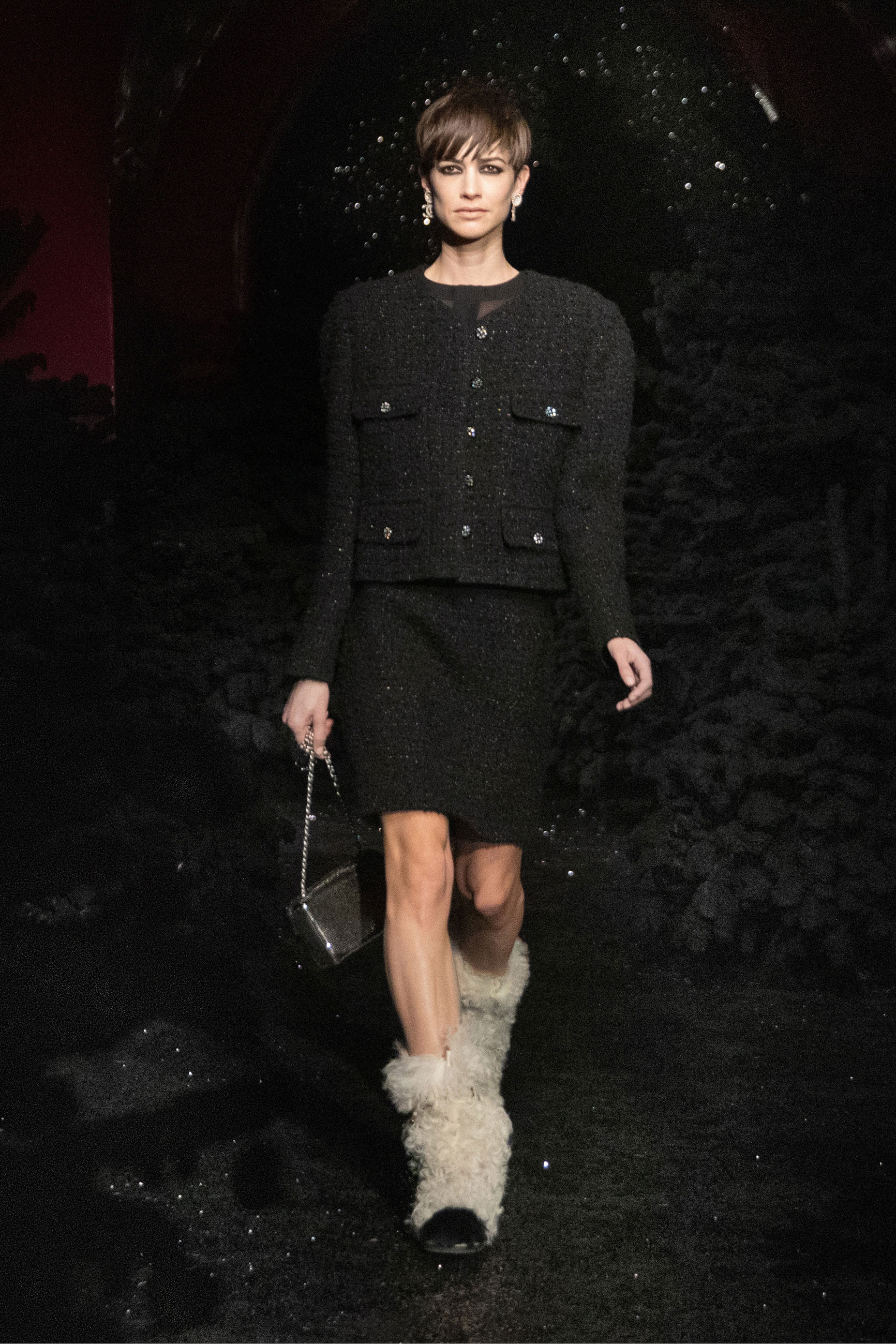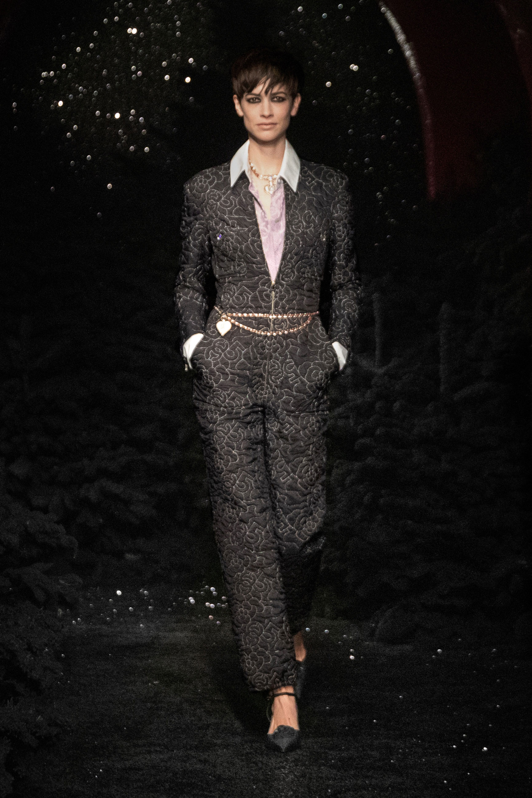 Виар выразила оммаж Карлу, представив велюровые и стеганые версии знаменитого комбинезона, в котором Тайра Бэнкс появилась на показе Chanel сезона весна-лето 1994. Классический костюм с укороченным жакетом и контрастной обтачкой получил новое прочтение в неожиданных фактурах меха и стриженой шерсти, а мерцающий серебряными нитями твид перекочевал на платья с контрастными рукавами, расшитыми пайетками. Дух вечеринки выражен и в свободных костюмах, напоминающих о хип-хоп-культуре 80-х и 2000-х, и маленьких черных мини. Триумфальным аккордом к празднику стал финальный образ с золотым тренчем и головным убором, которые оттенял угольно-черный макияж глаз модели, совсем как в 60-х.