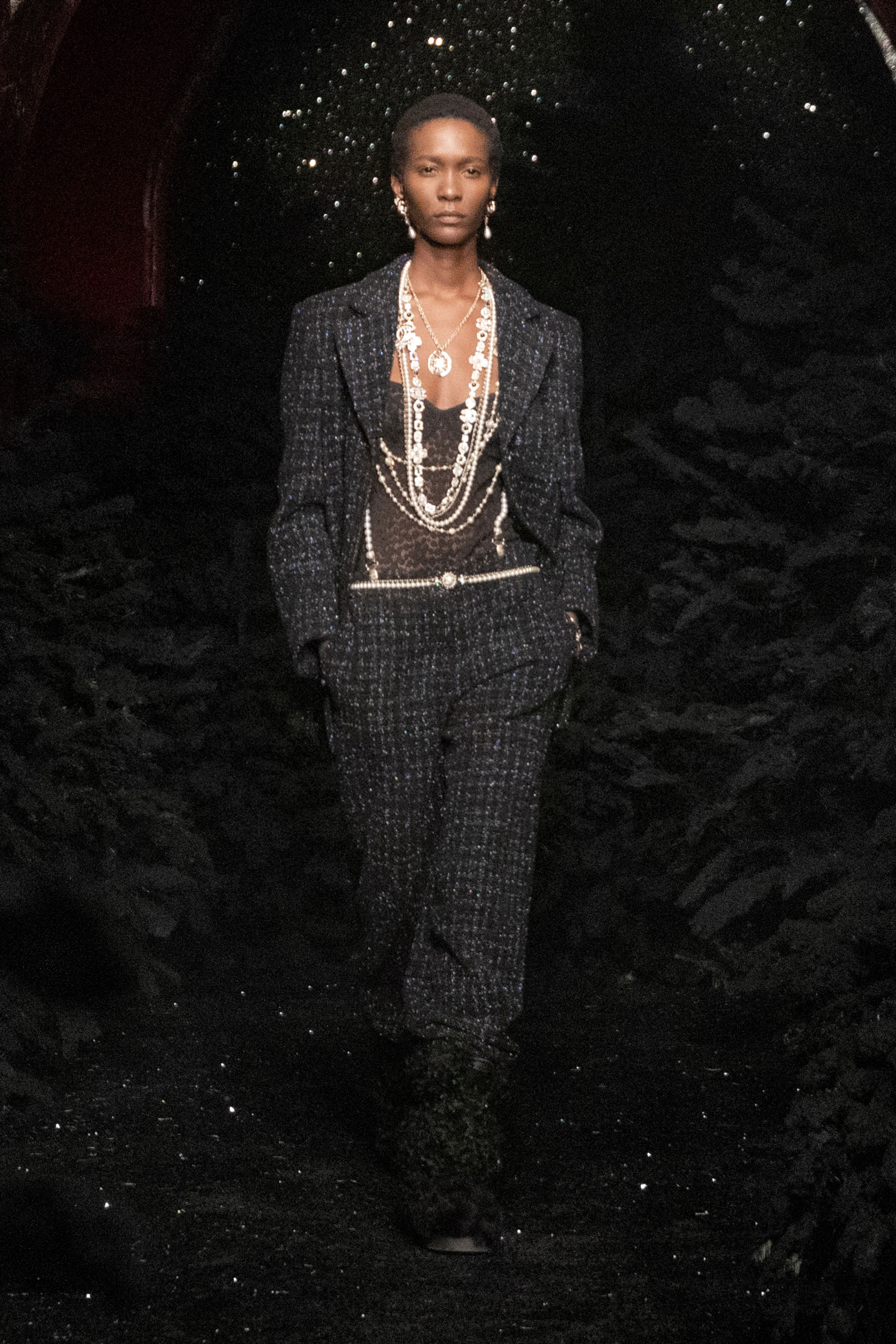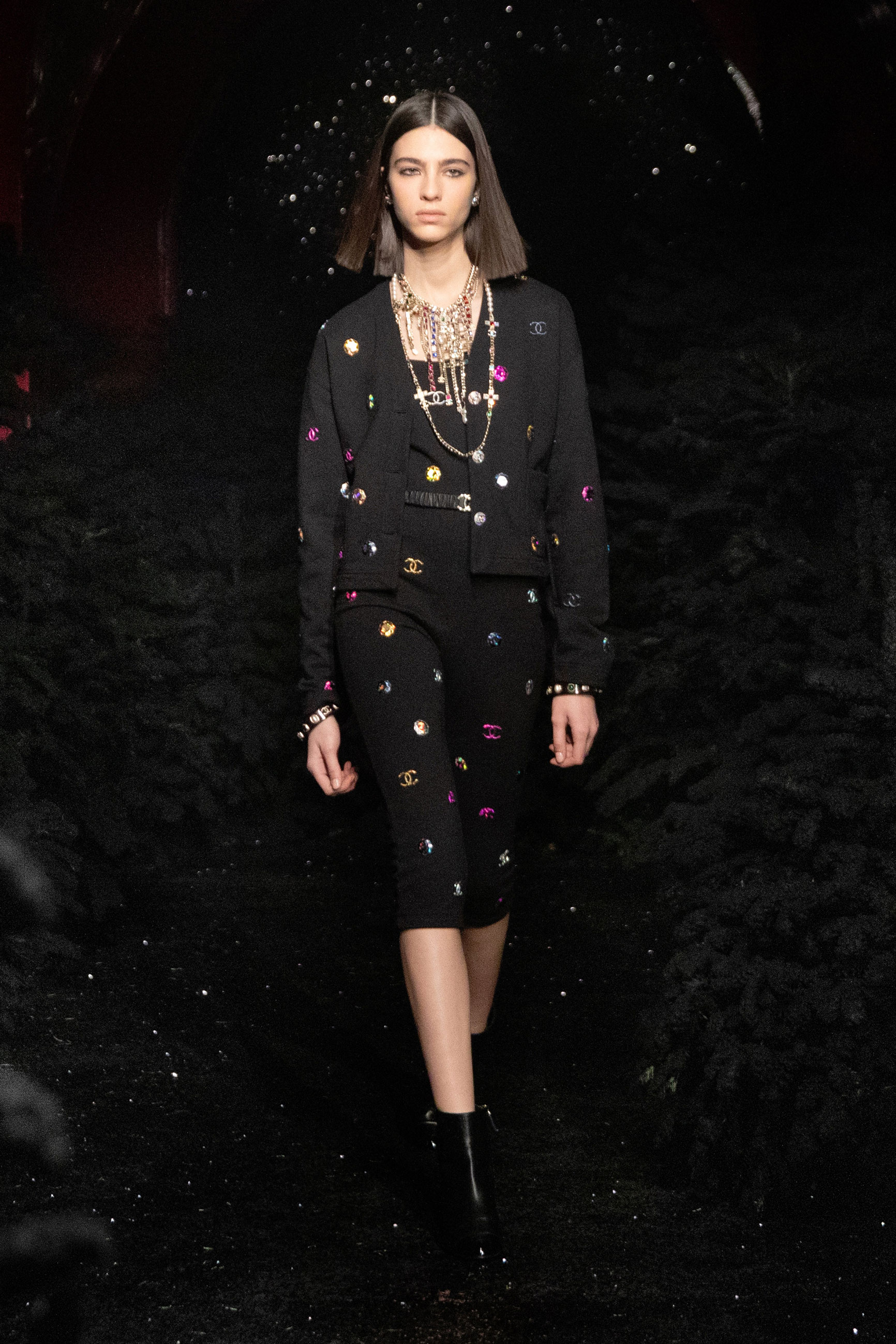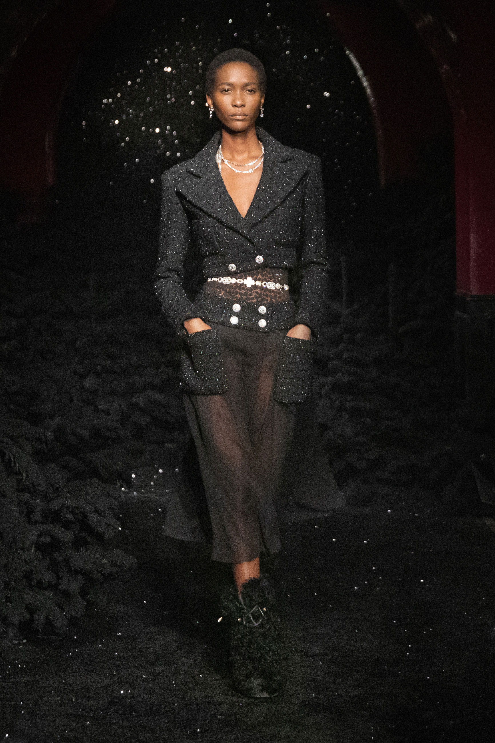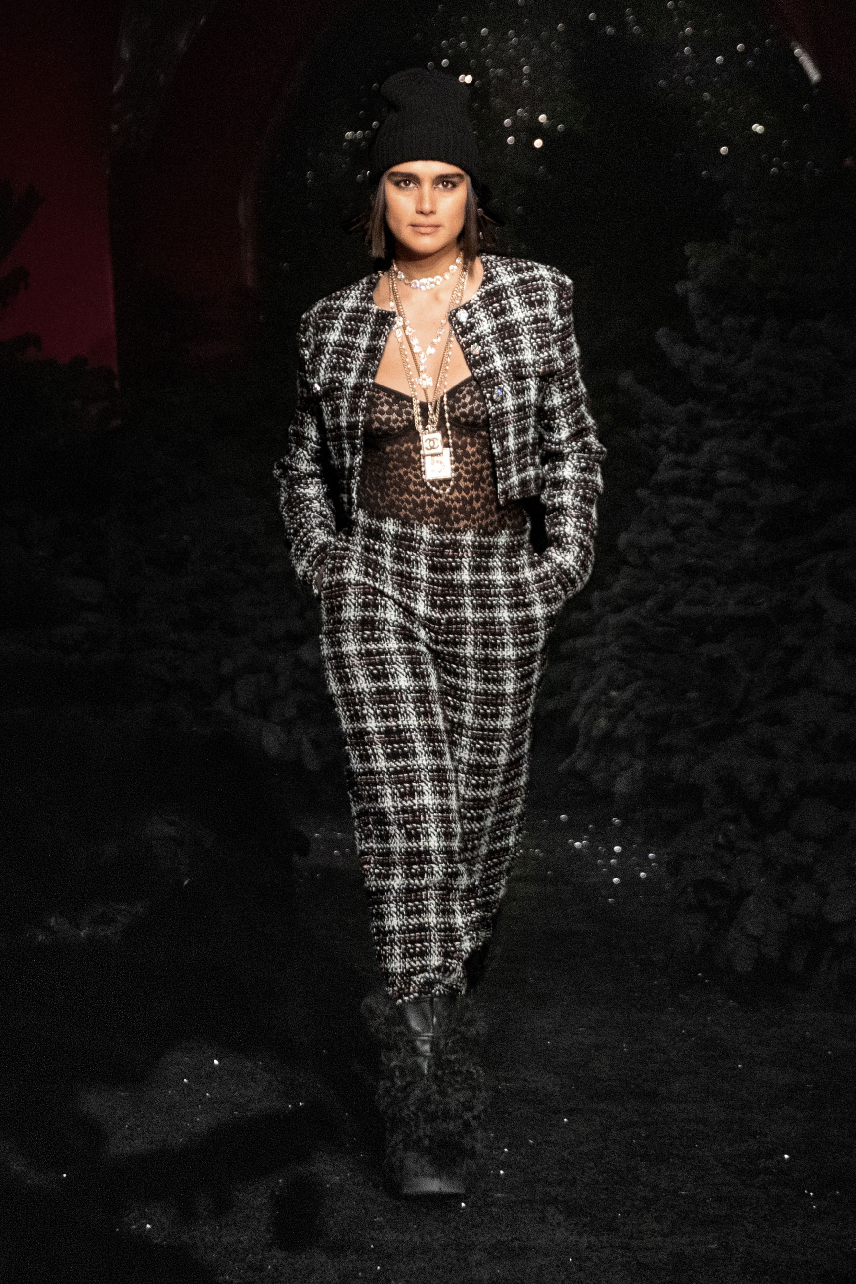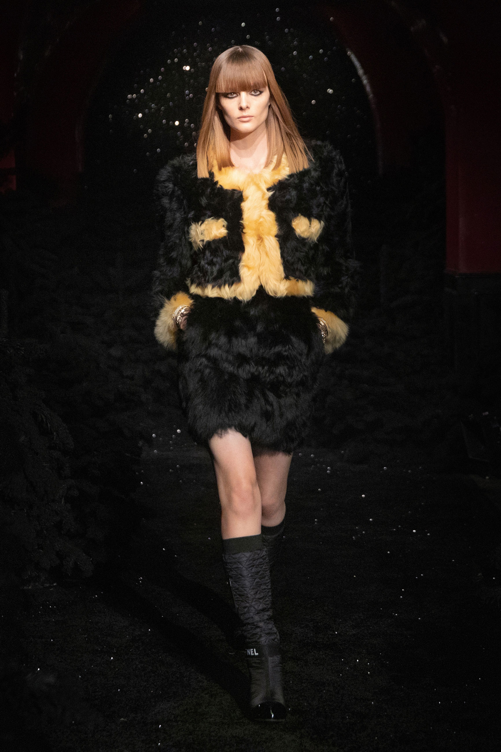 Виар выразила оммаж Карлу, представив велюровые и стеганые версии знаменитого комбинезона, в котором Тайра Бэнкс появилась на показе Chanel сезона весна-лето 1994. Классический костюм с укороченным жакетом и контрастной обтачкой получил новое прочтение в неожиданных фактурах меха и стриженой шерсти, а мерцающий серебряными нитями твид перекочевал на платья с контрастными рукавами, расшитыми пайетками. Дух вечеринки выражен и в свободных костюмах, напоминающих о хип-хоп-культуре 80-х и 2000-х, и маленьких черных мини. Триумфальным аккордом к празднику стал финальный образ с золотым тренчем и головным убором, которые оттенял угольно-черный макияж глаз модели, совсем как в 60-х.