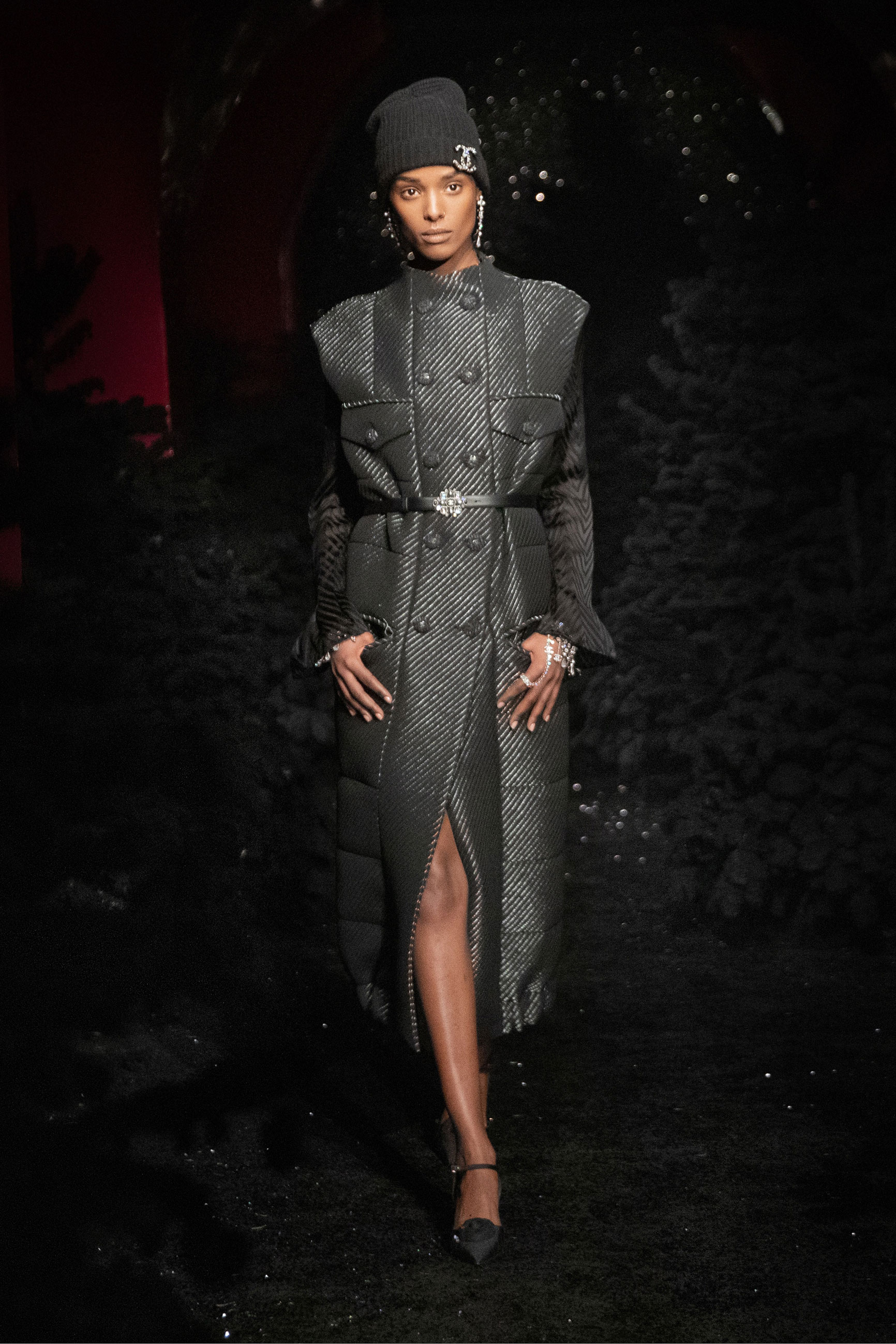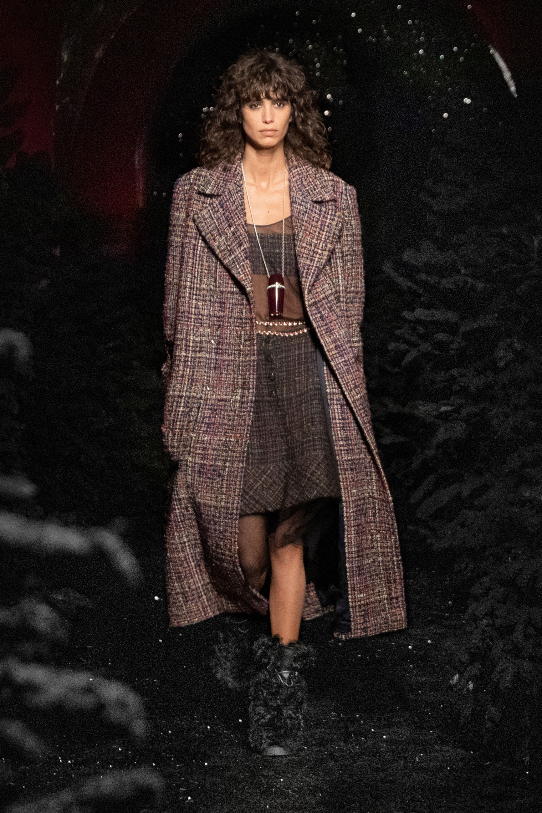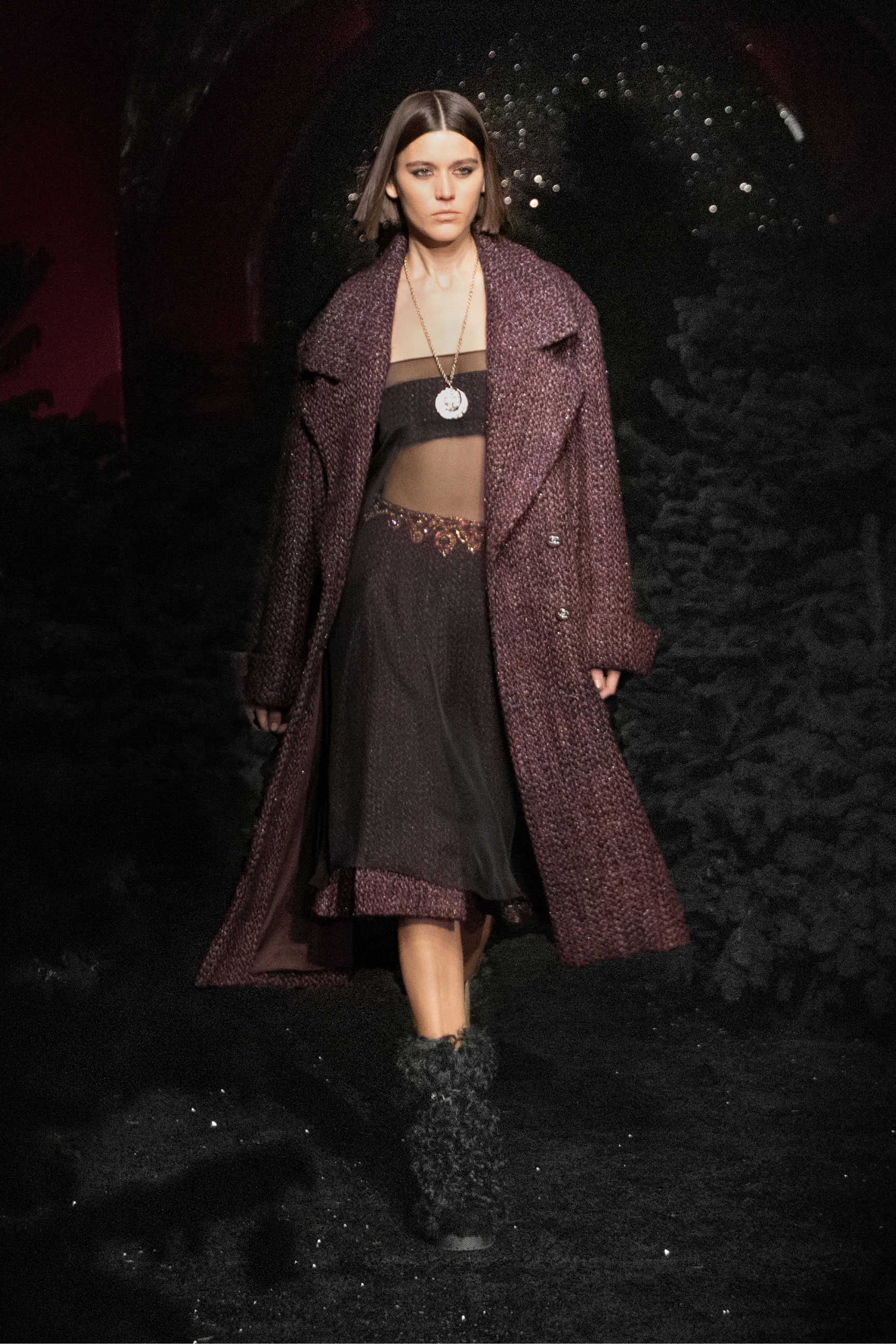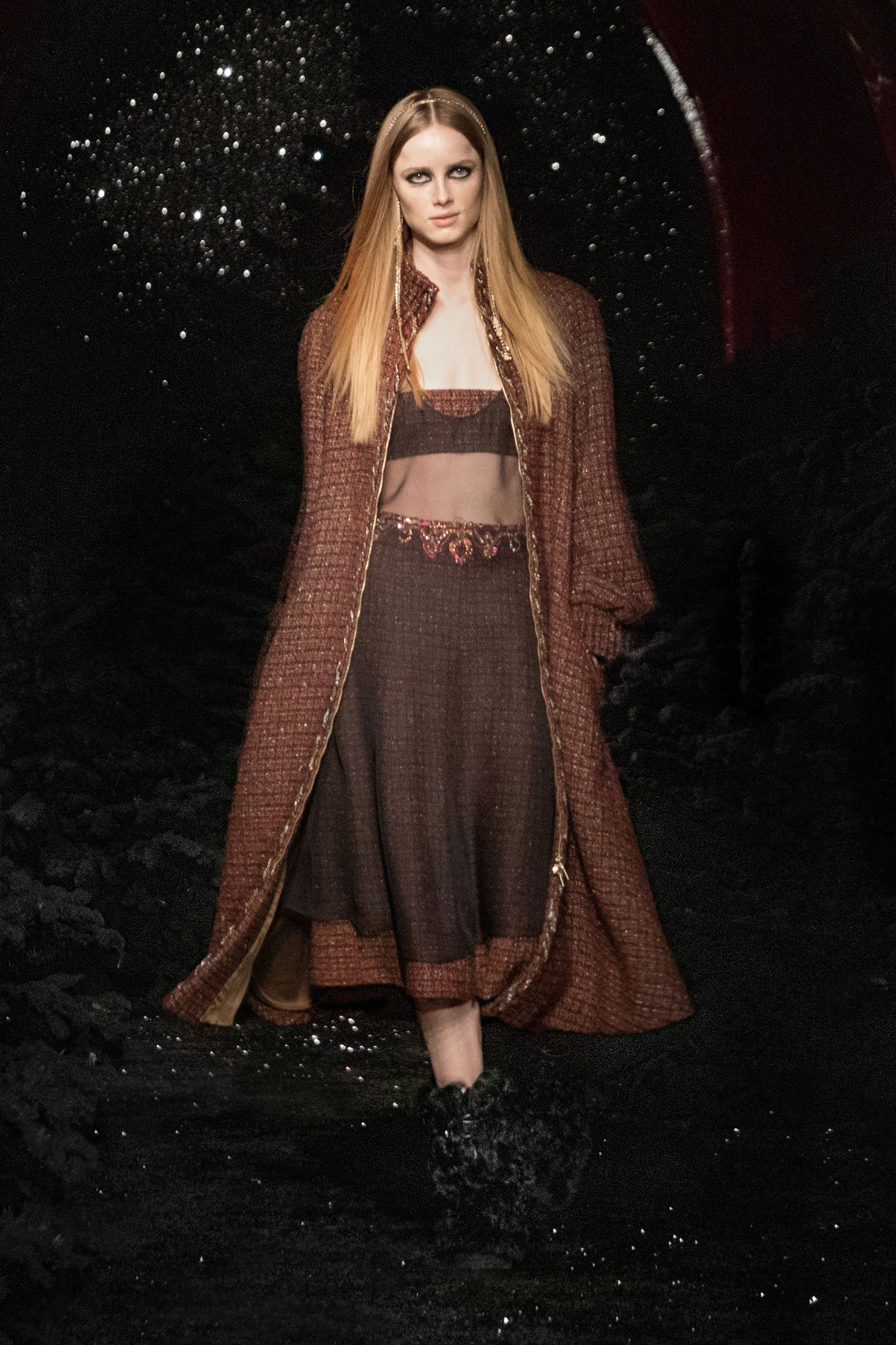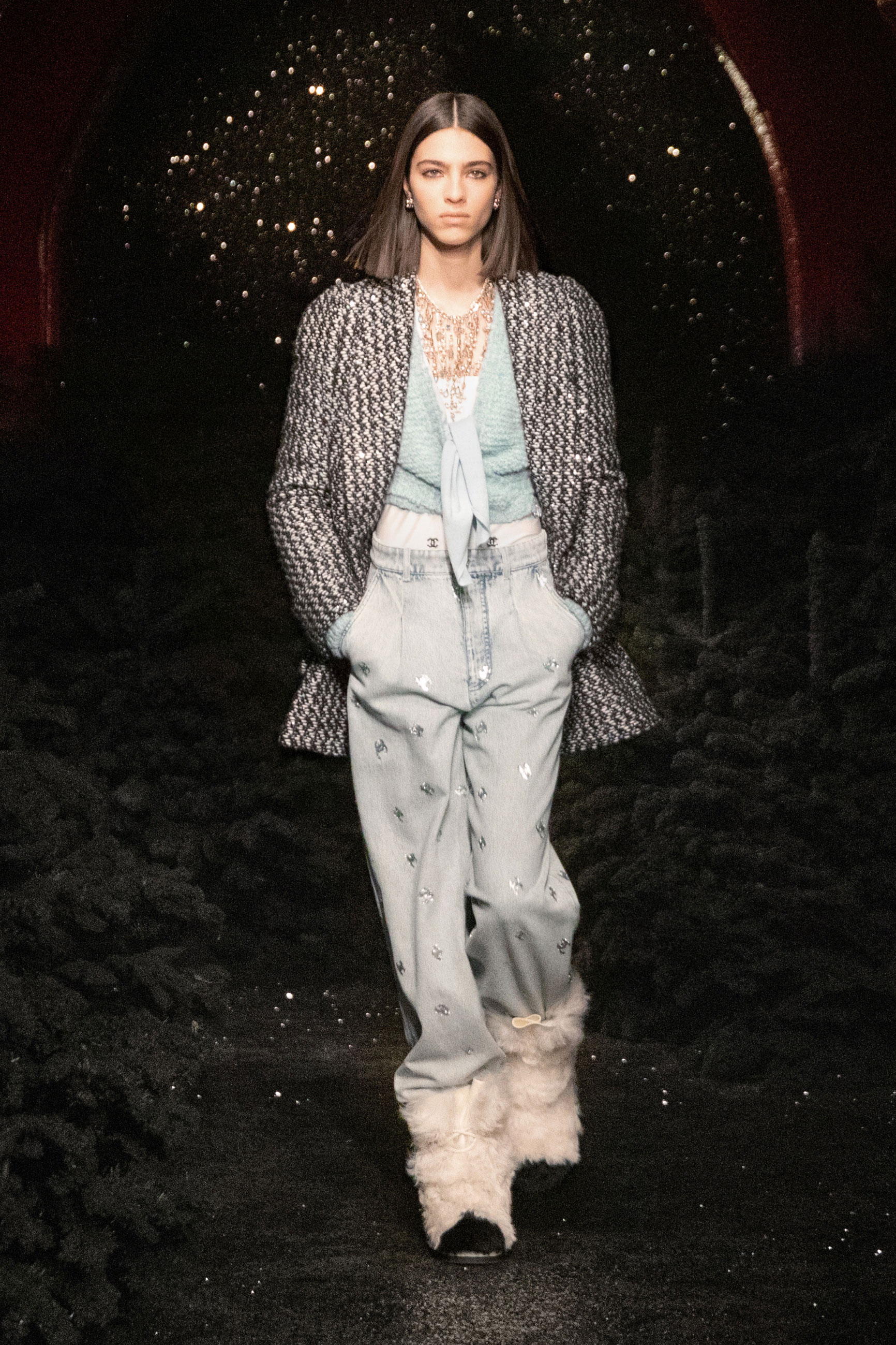 Виар выразила оммаж Карлу, представив велюровые и стеганые версии знаменитого комбинезона, в котором Тайра Бэнкс появилась на показе Chanel сезона весна-лето 1994. Классический костюм с укороченным жакетом и контрастной обтачкой получил новое прочтение в неожиданных фактурах меха и стриженой шерсти, а мерцающий серебряными нитями твид перекочевал на платья с контрастными рукавами, расшитыми пайетками. Дух вечеринки выражен и в свободных костюмах, напоминающих о хип-хоп-культуре 80-х и 2000-х, и маленьких черных мини. Триумфальным аккордом к празднику стал финальный образ с золотым тренчем и головным убором, которые оттенял угольно-черный макияж глаз модели, совсем как в 60-х.